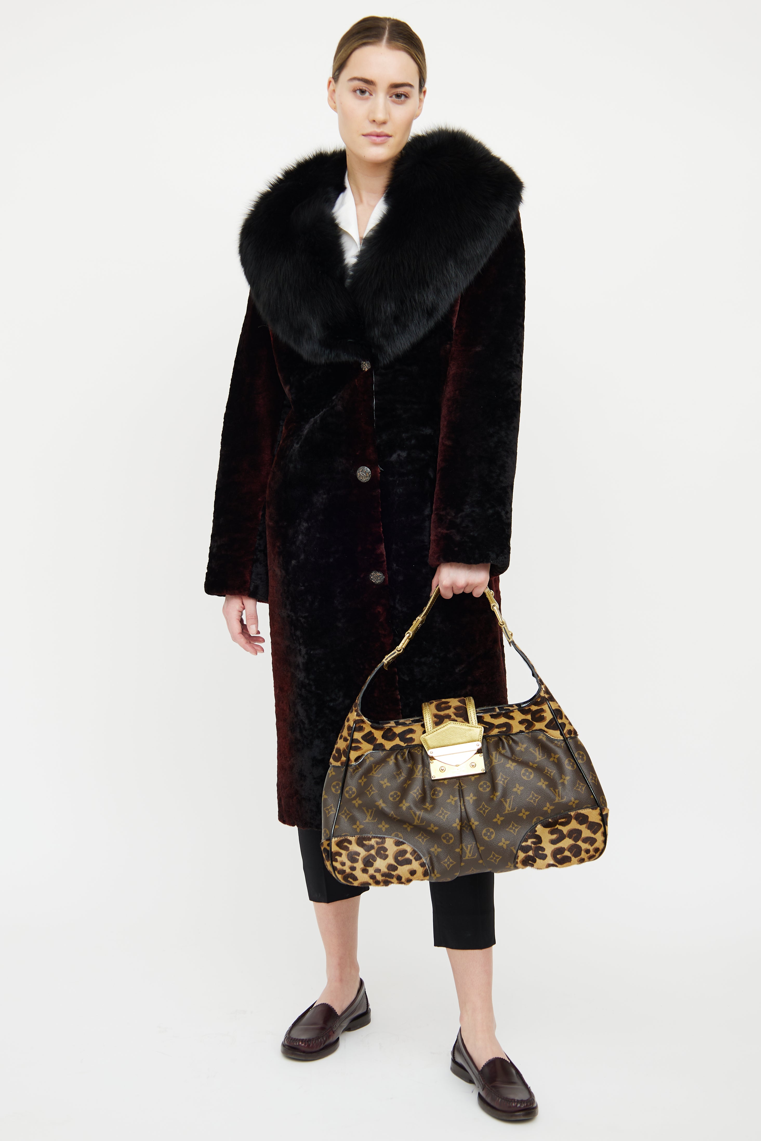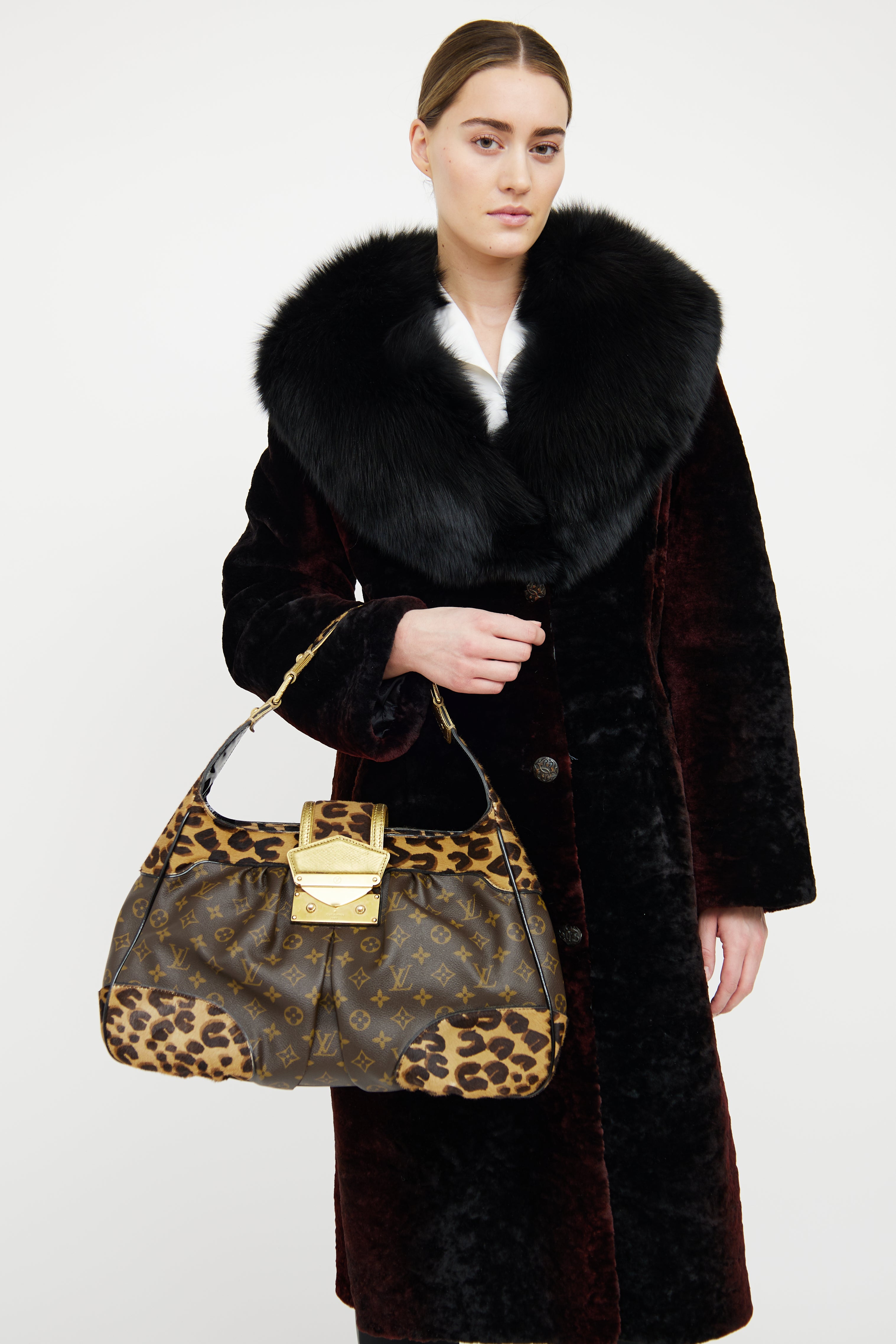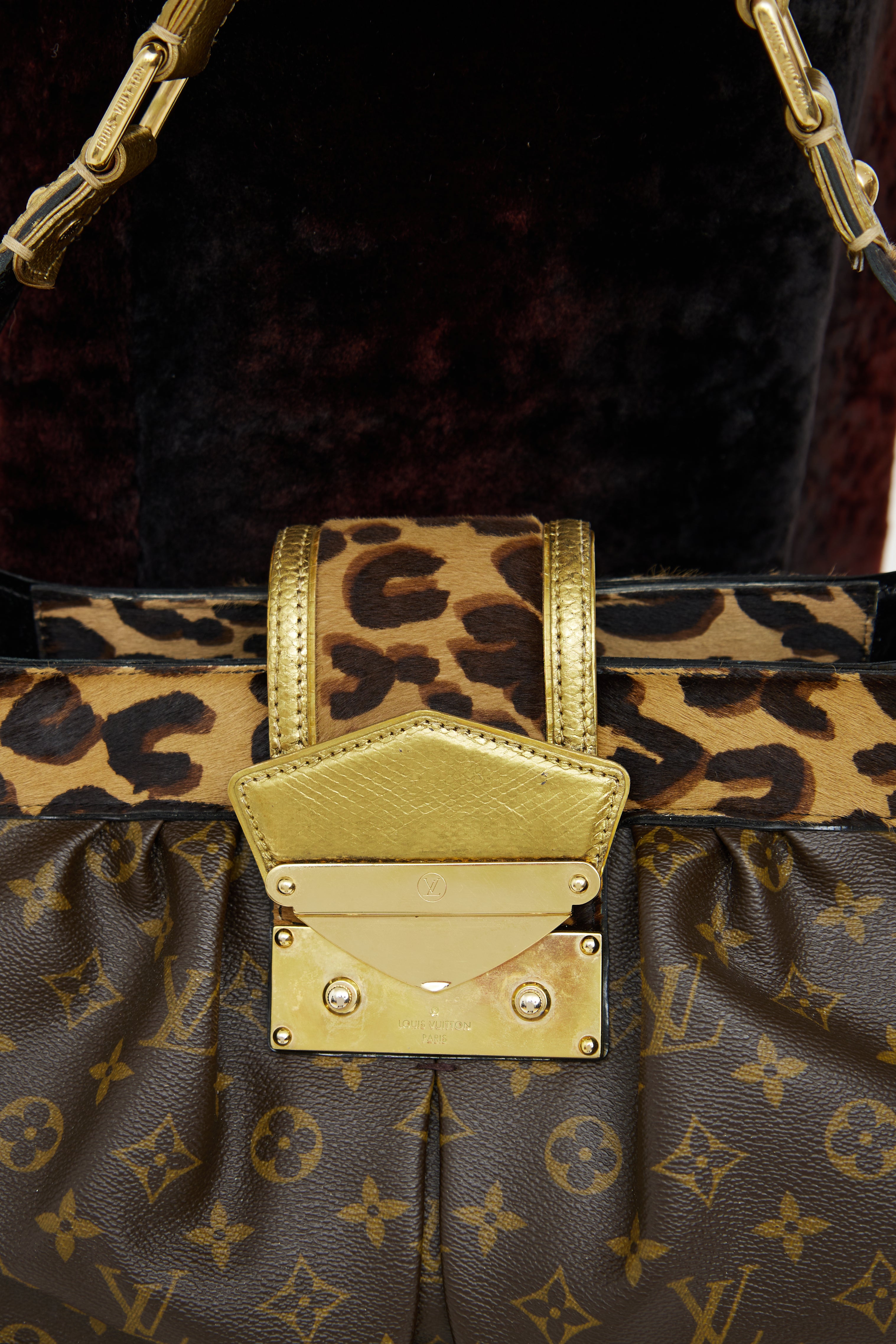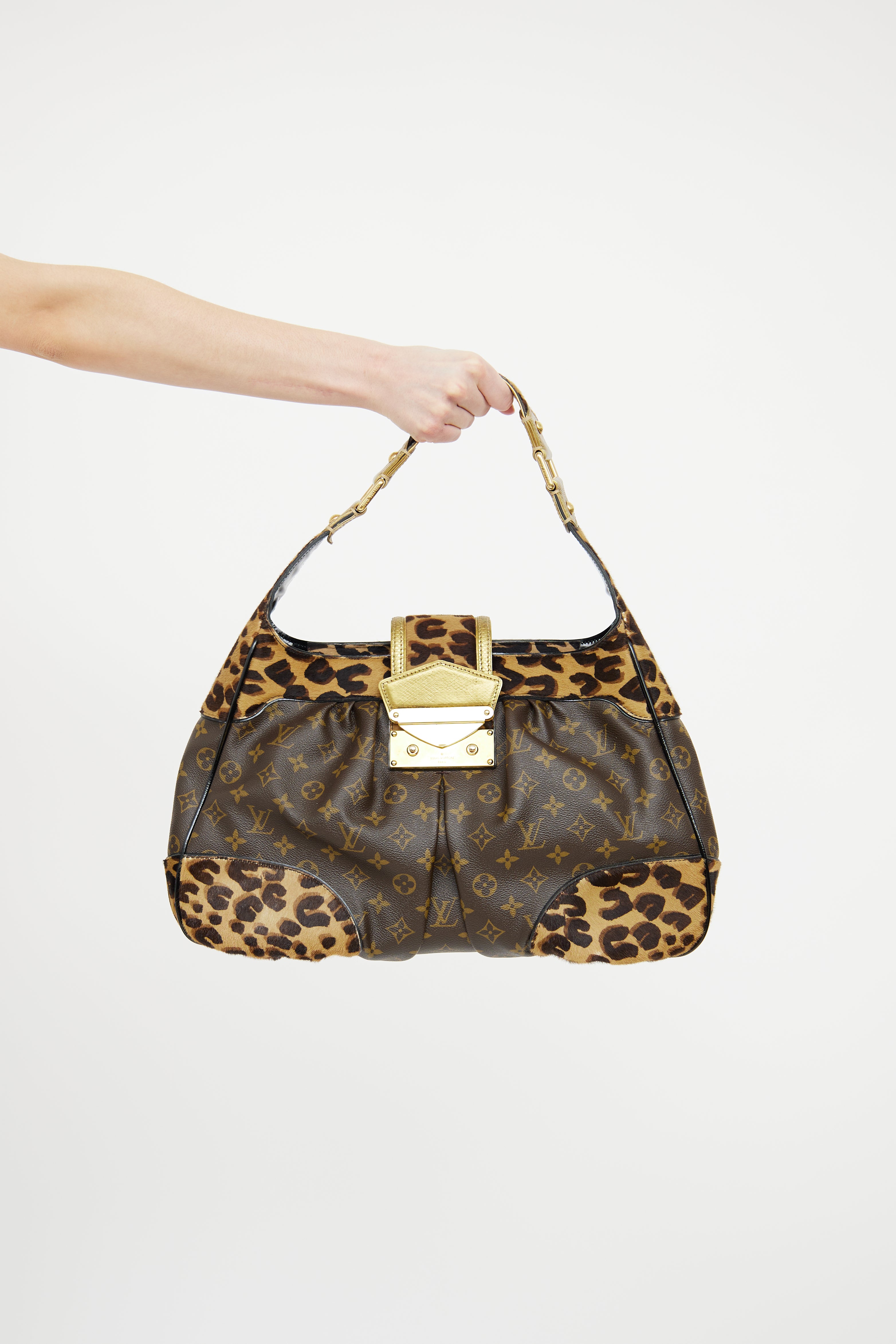 Pre-owned Louis Vuitton monogram leopard Polly bag featuring broad looping shoulder strap, gold tone hardware, oversized belt buckle lock closure, pony hair leopard trim with black piping, signature monogram print throughout, and protective feet at base. One main canvas lined compartment with one zip pocket.