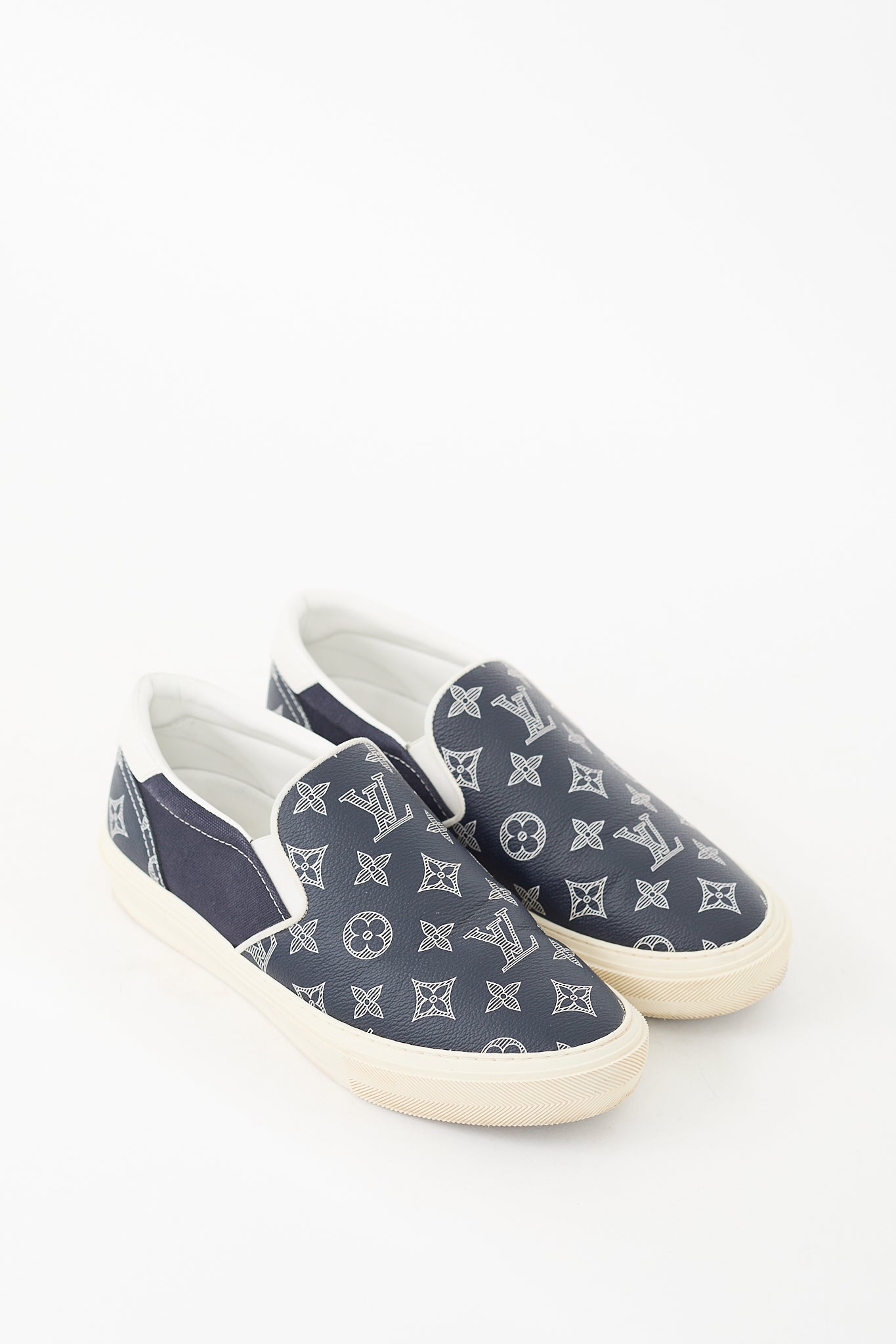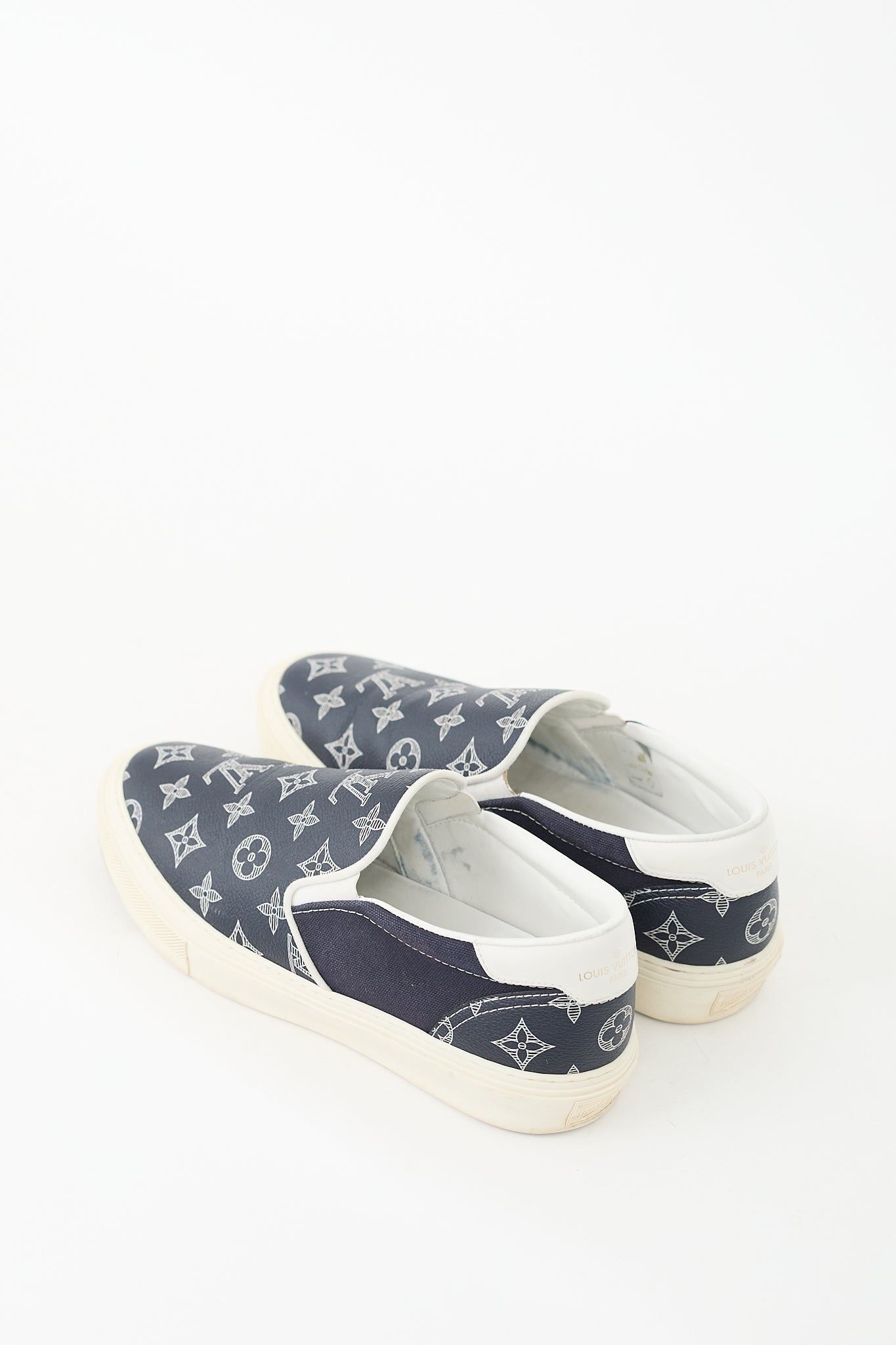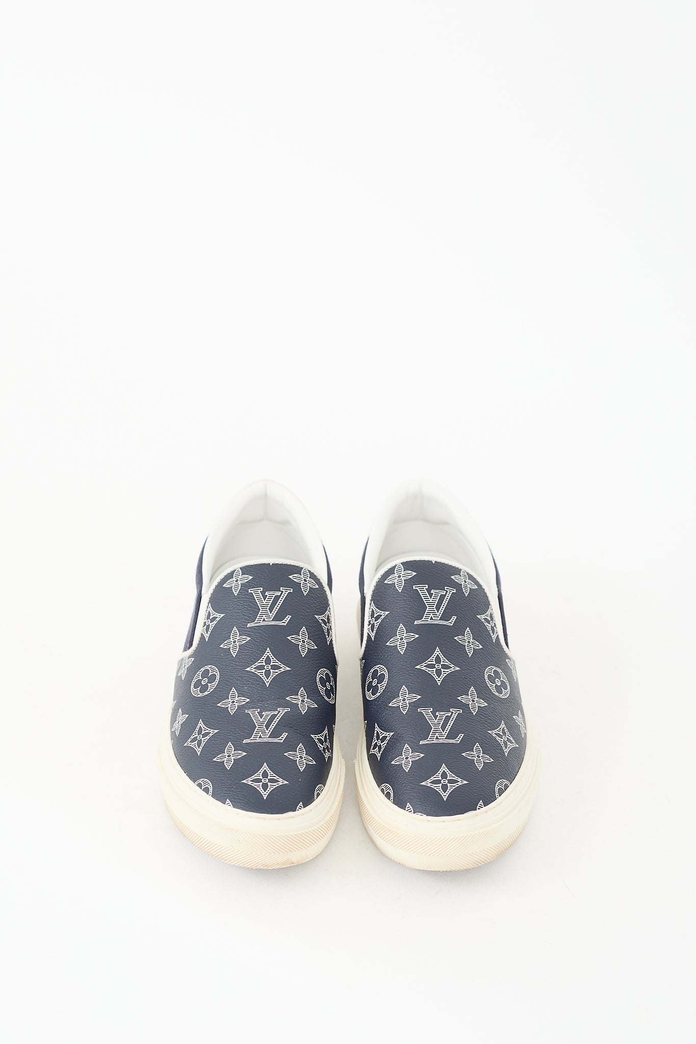 Pre-owned Louis Vuitton navy Trocadero slip on sneakers featuring a rounded toe, leather and canvas upper, white signature monogram throughout vamp and heel panels, notched topline with elastic side inserts, white leather counter panel with gold tone foil logo, and white rubber sole with embossed logo at heel.