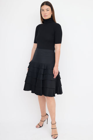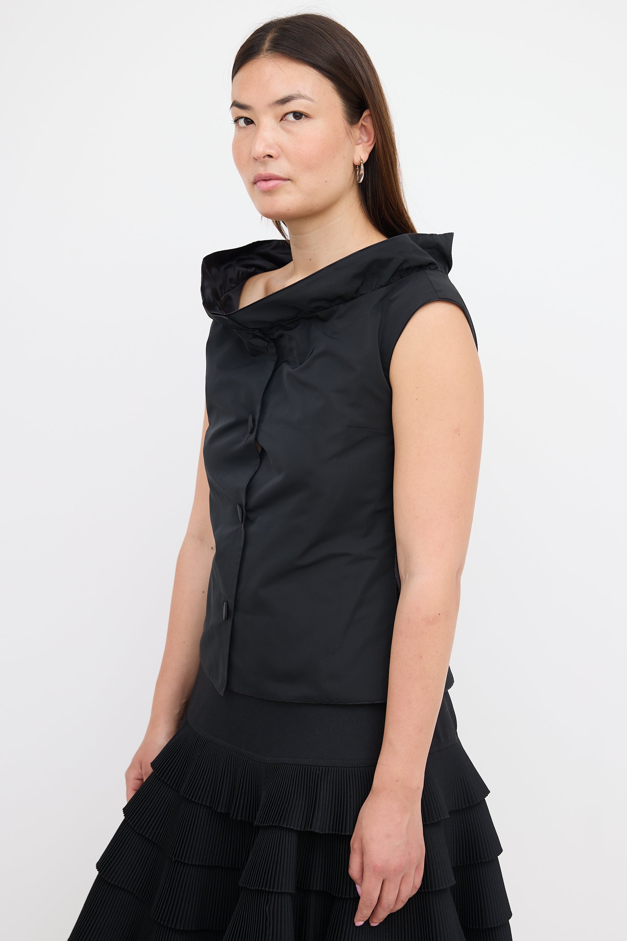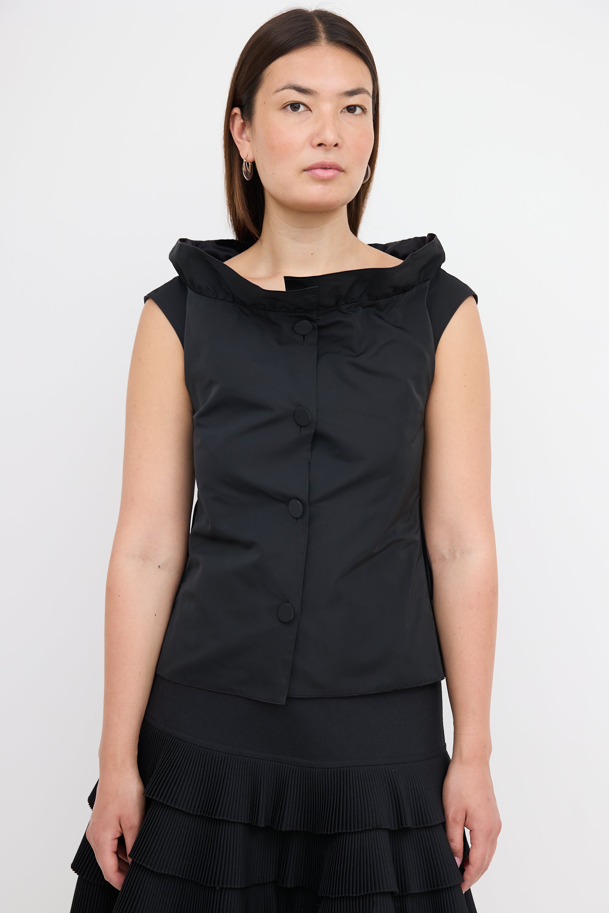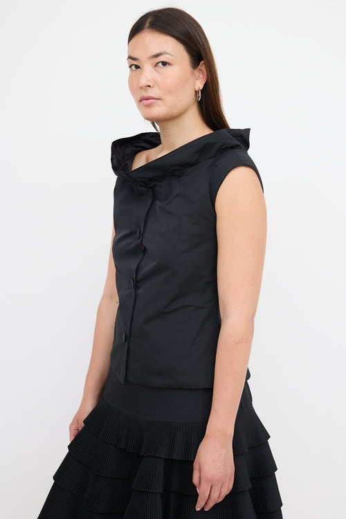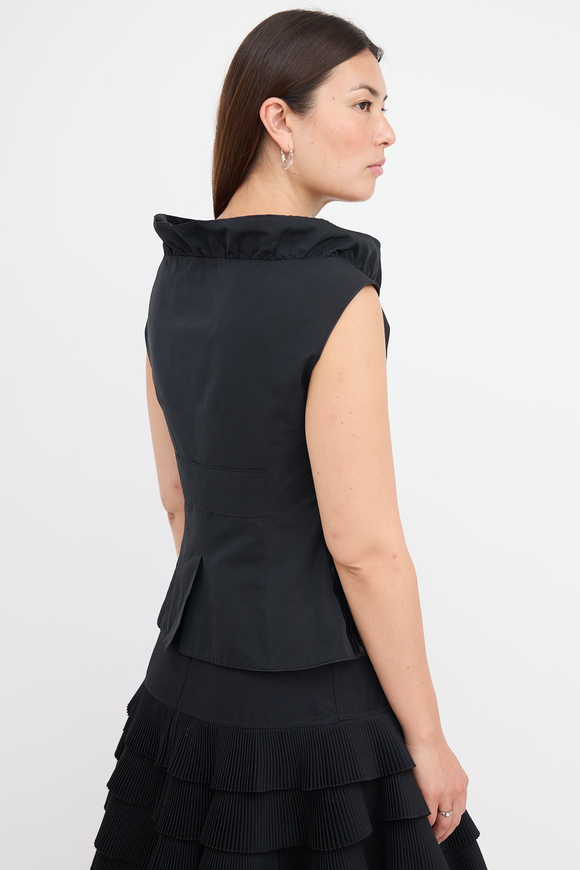 Pre-owned Louis Vuitton black sleeveless top featuring ruffle boat neckline, button front, raw edge side seams, and back half belt and vent. Lined.