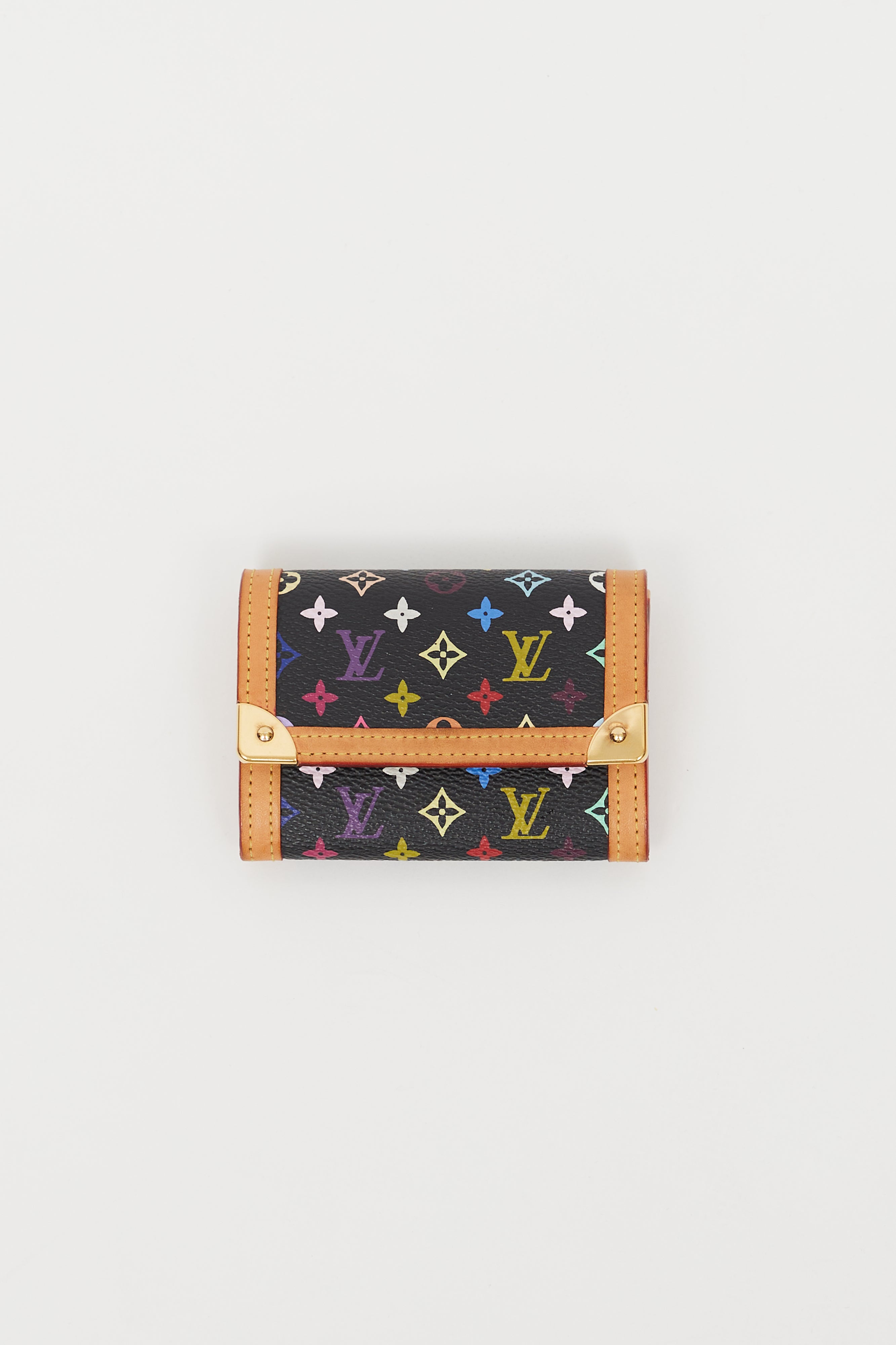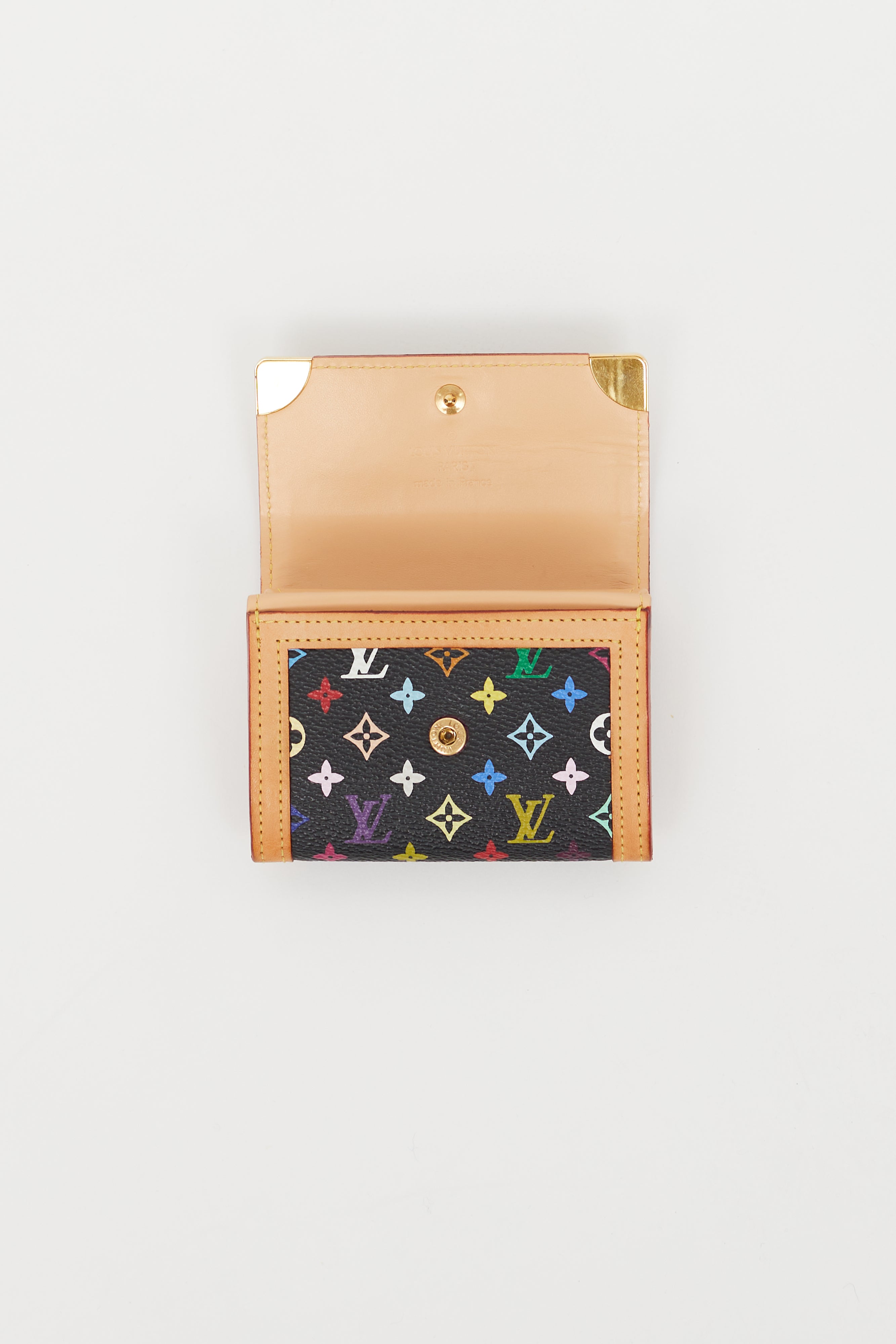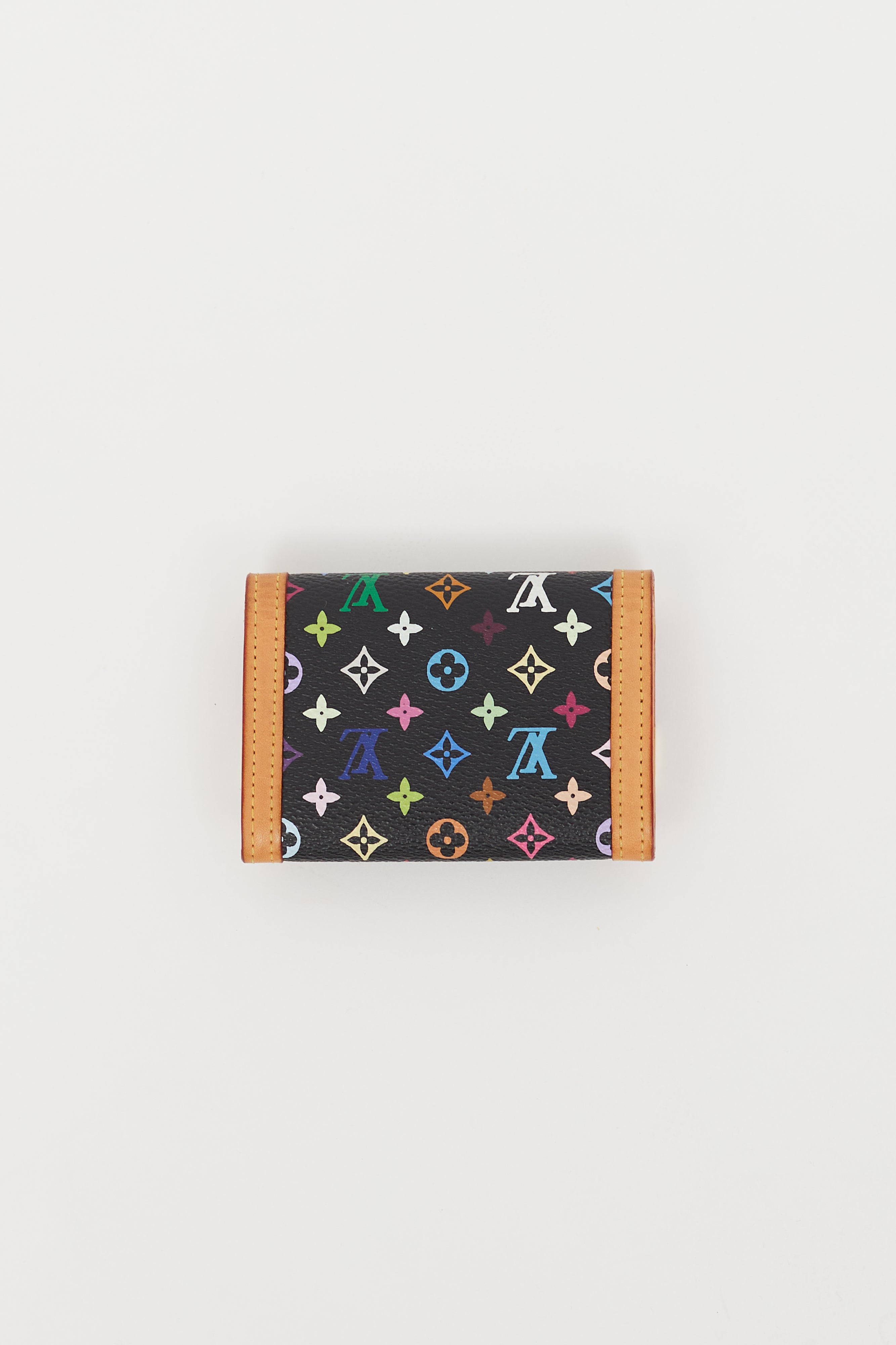 Pre-owned 2004 Louis Vuitton x Takashi Murakami black coin pouch featuring multicolour monogram coated canvas, beige leather trim, gold tone hardware tips at face, snap button closure, and three slot pockets.