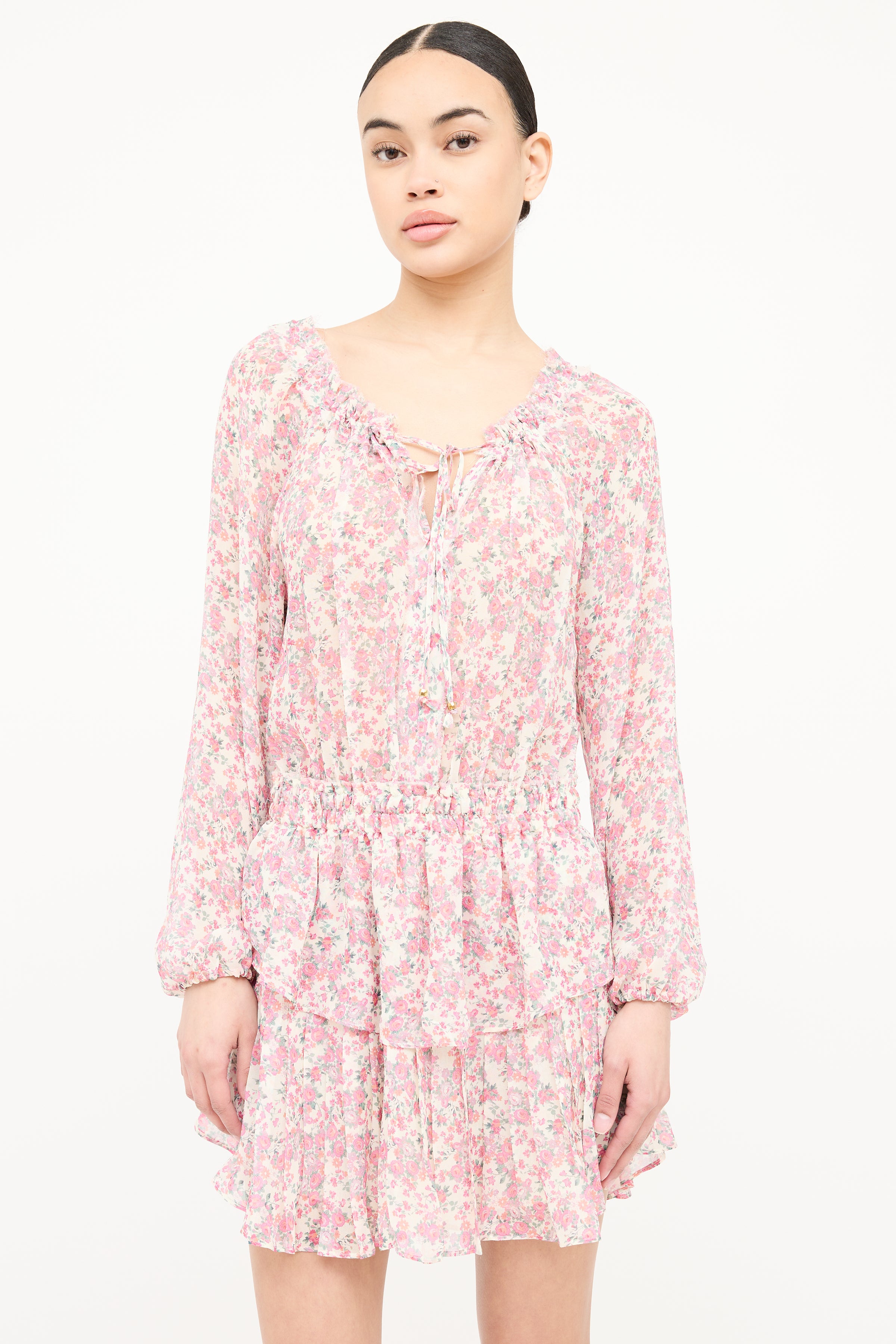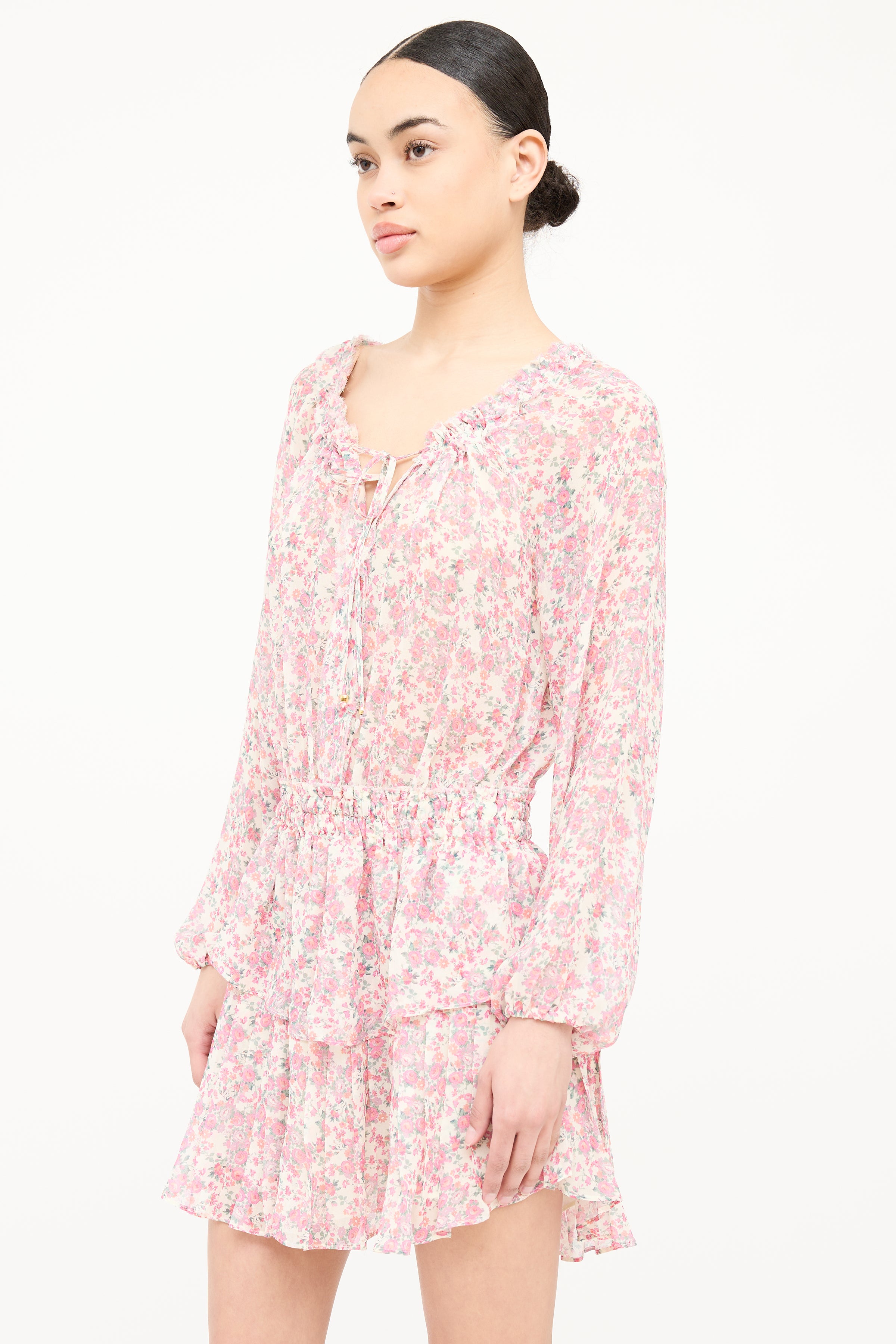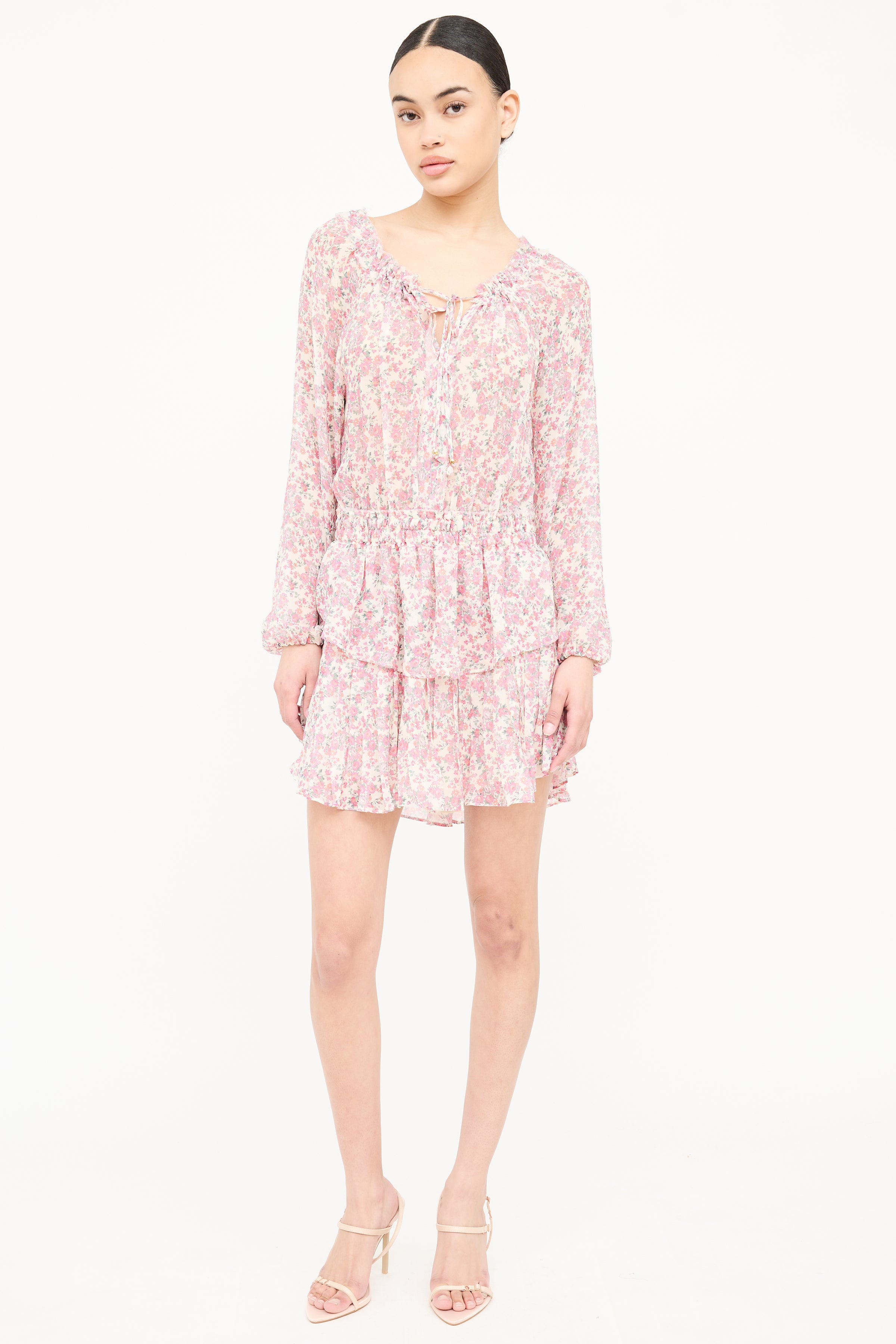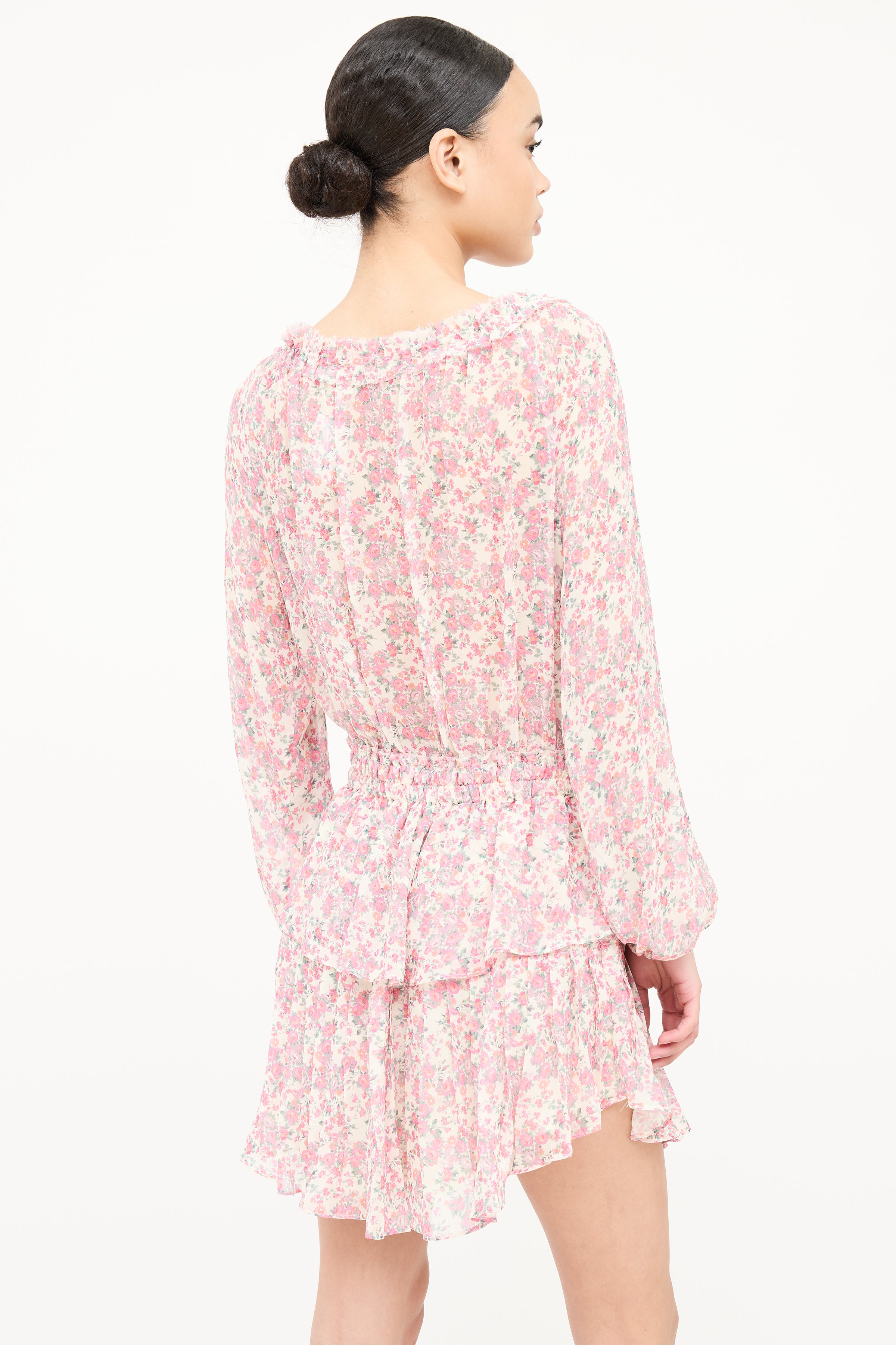 Pre-owned LoveShackFancy long sleeve dress featuring round neck ruffle and tie and keyhole, floral print, elastic cuffs and waist and ruffle skirt.