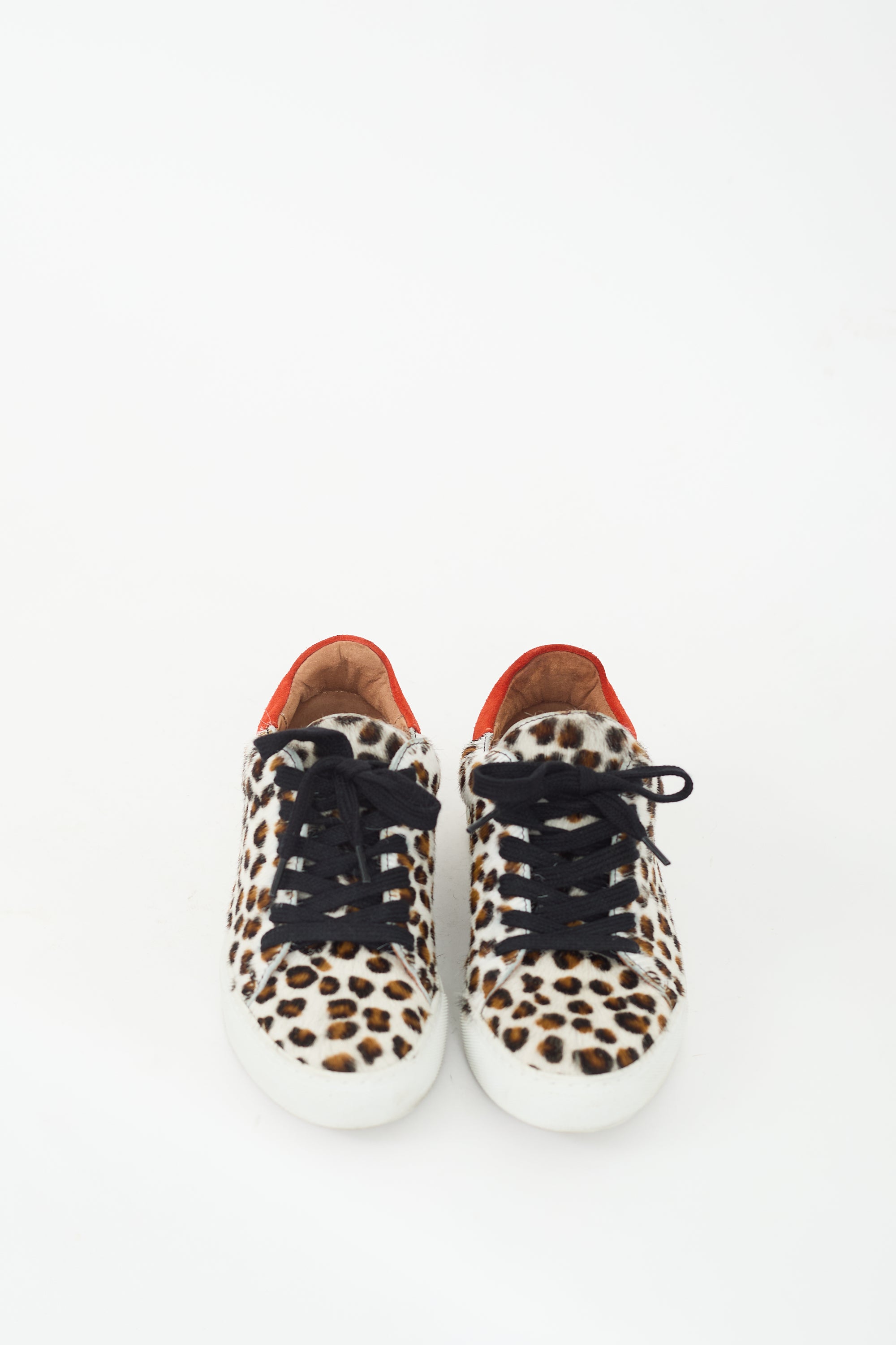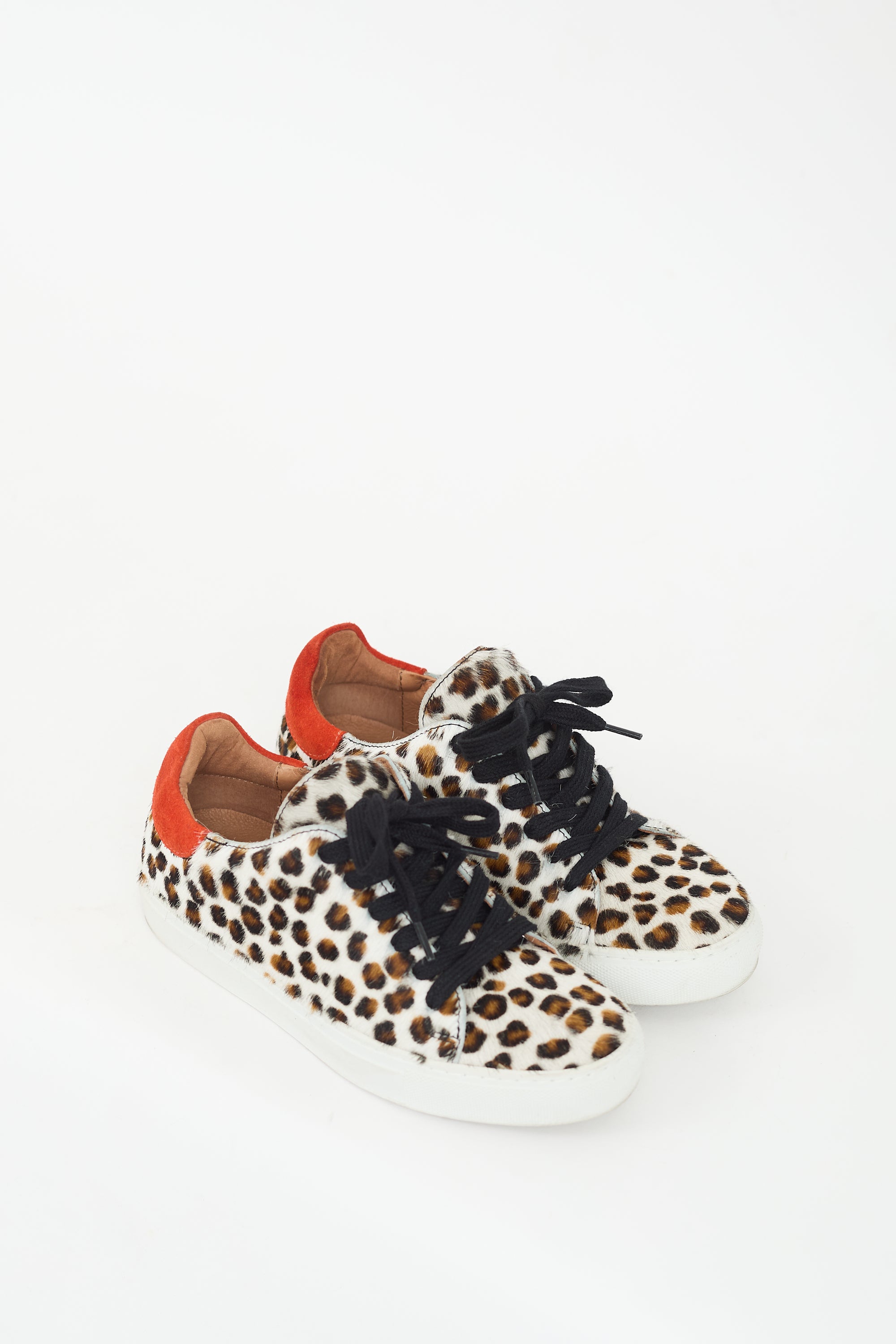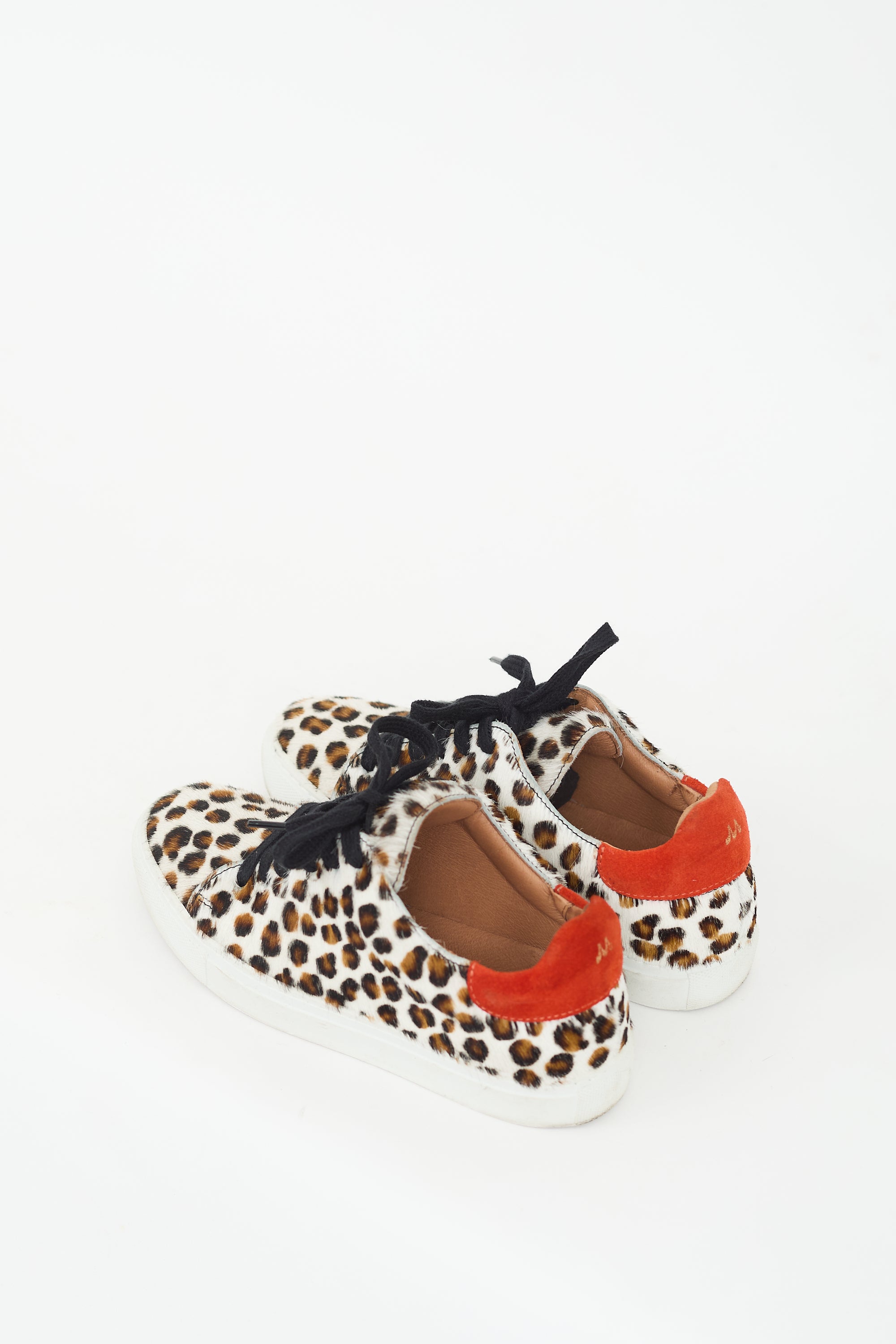 Pre-owned Maguire brown, white, and multicolour ponyhair sneakers featuring a round toe, leopard print throughout, lace up vamp, orange suede counter panel with printed logo, and rubber sole.