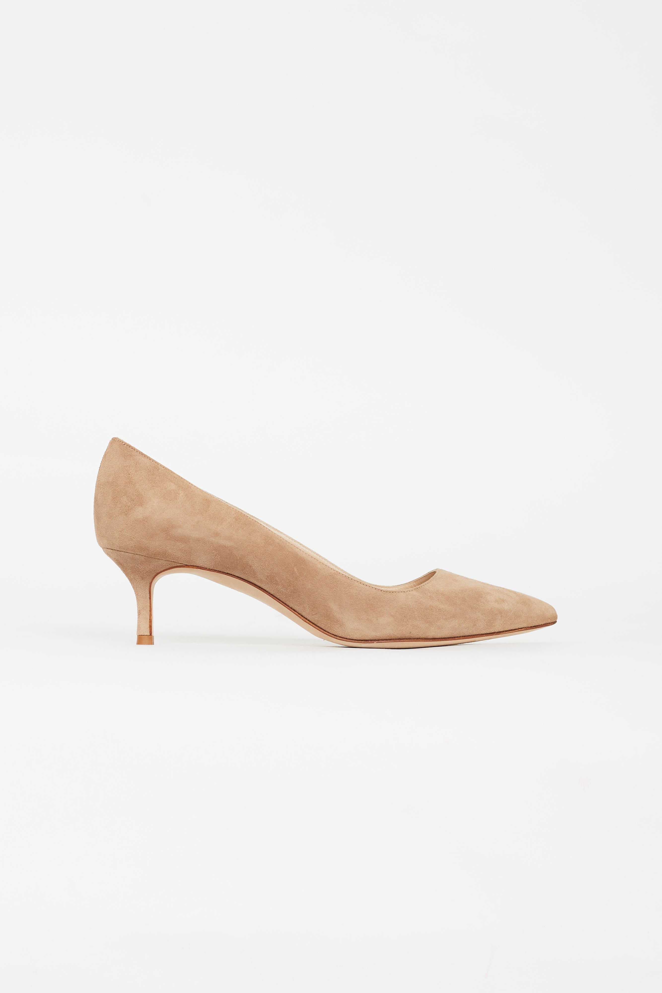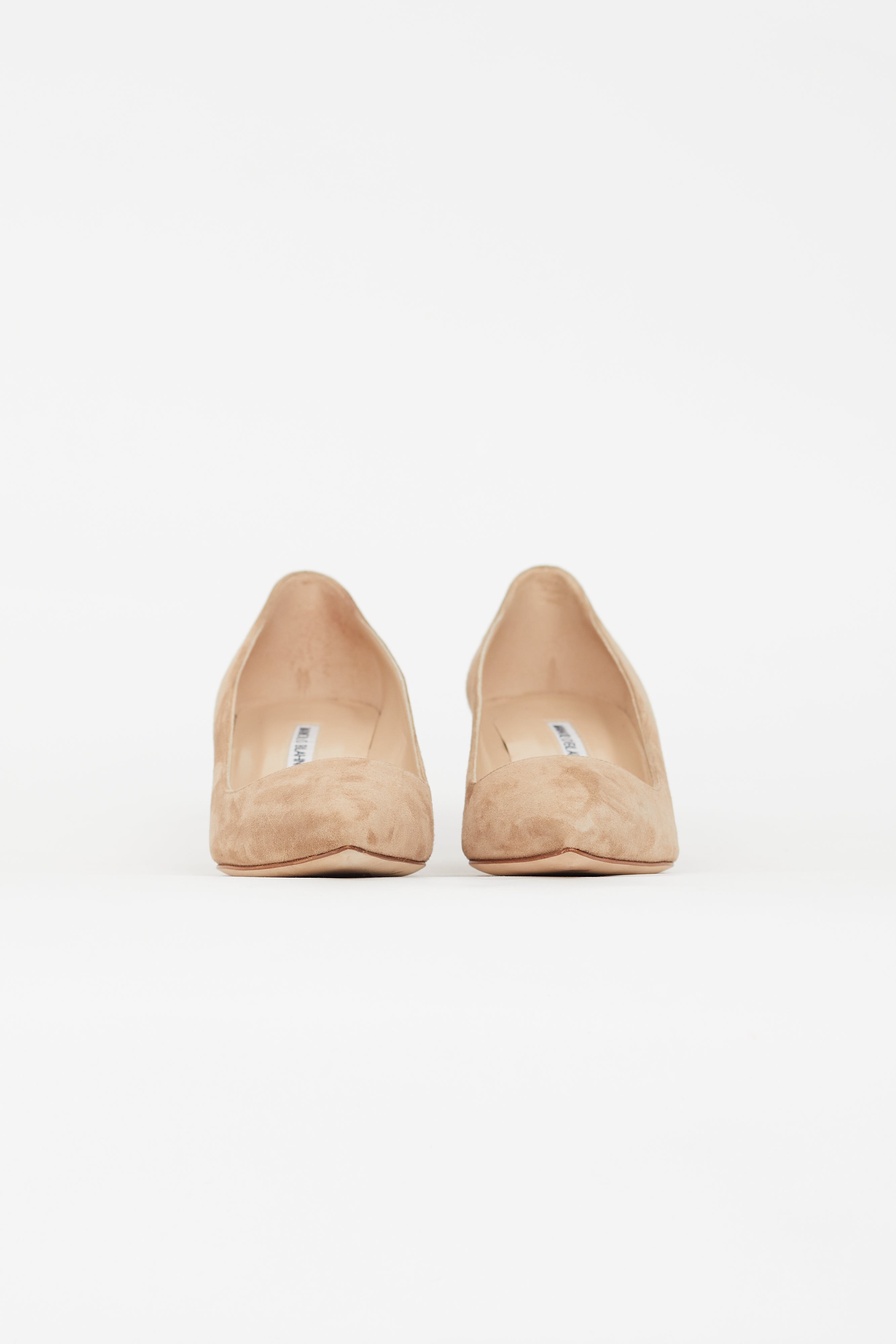Pre-owned Manolo Blahnik beige suede pointed toe pump featuring kitten heel, suede upper and leather insole with woven logo.