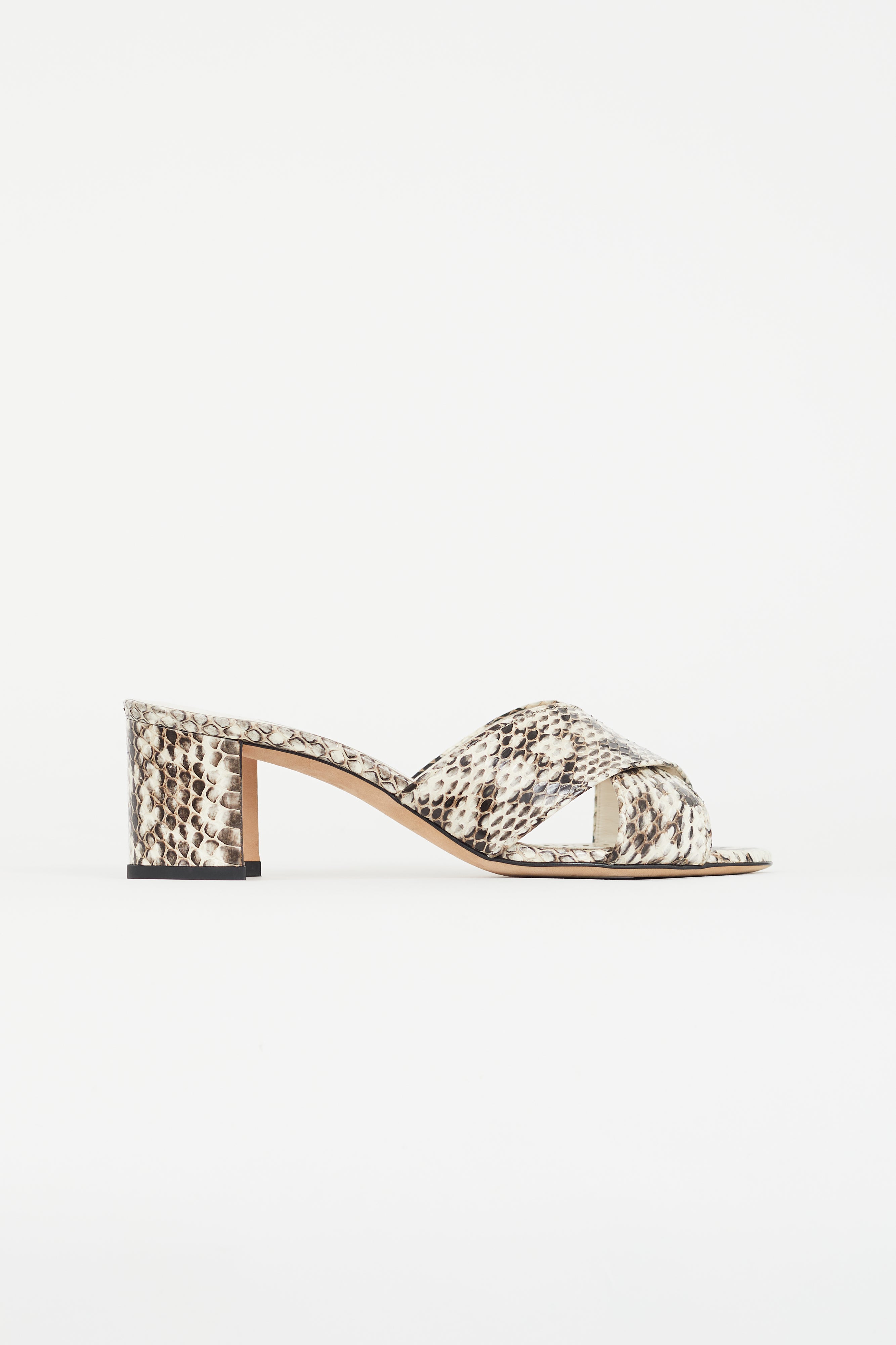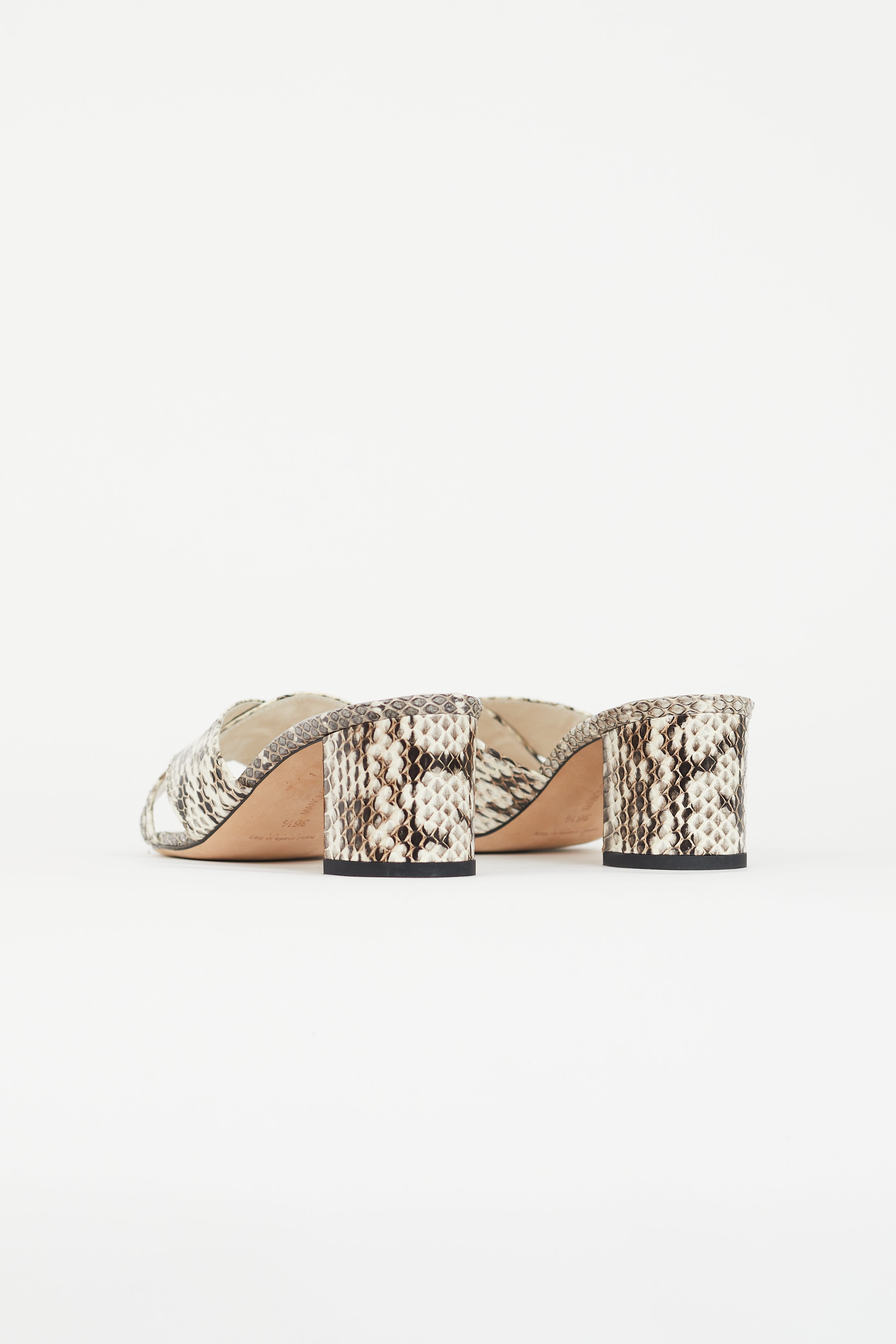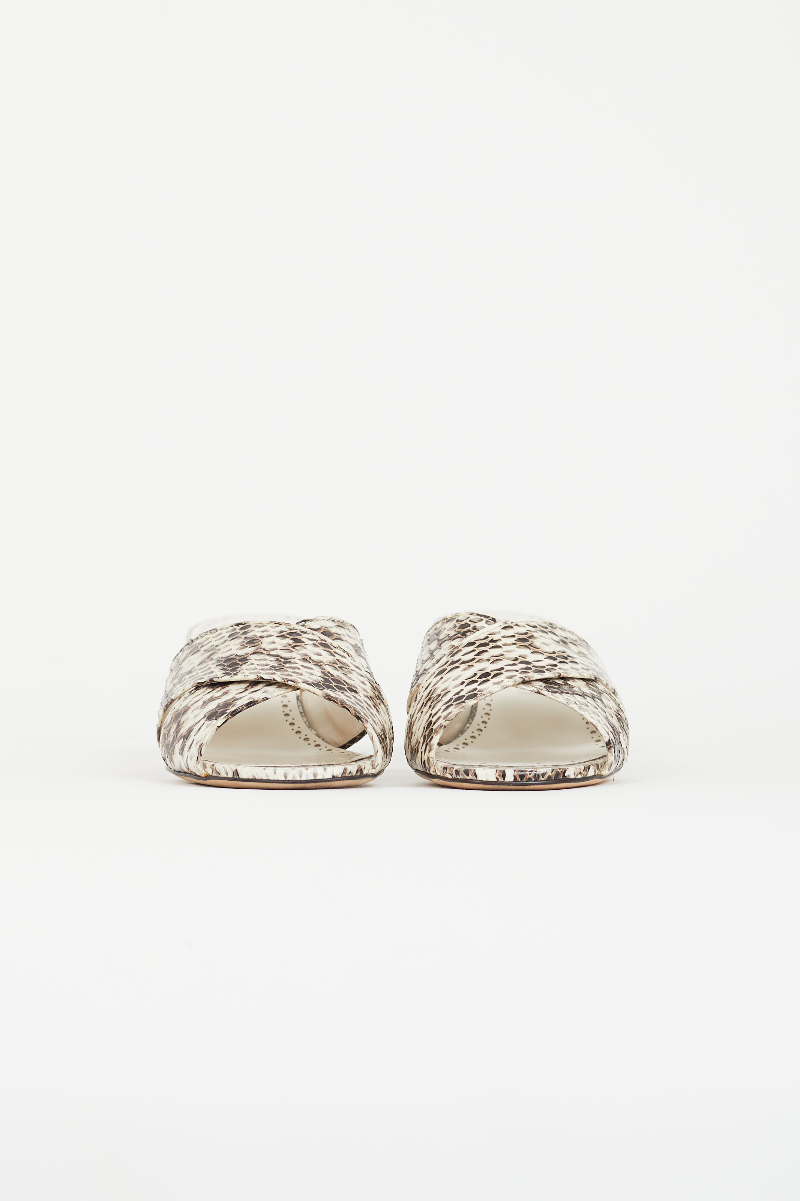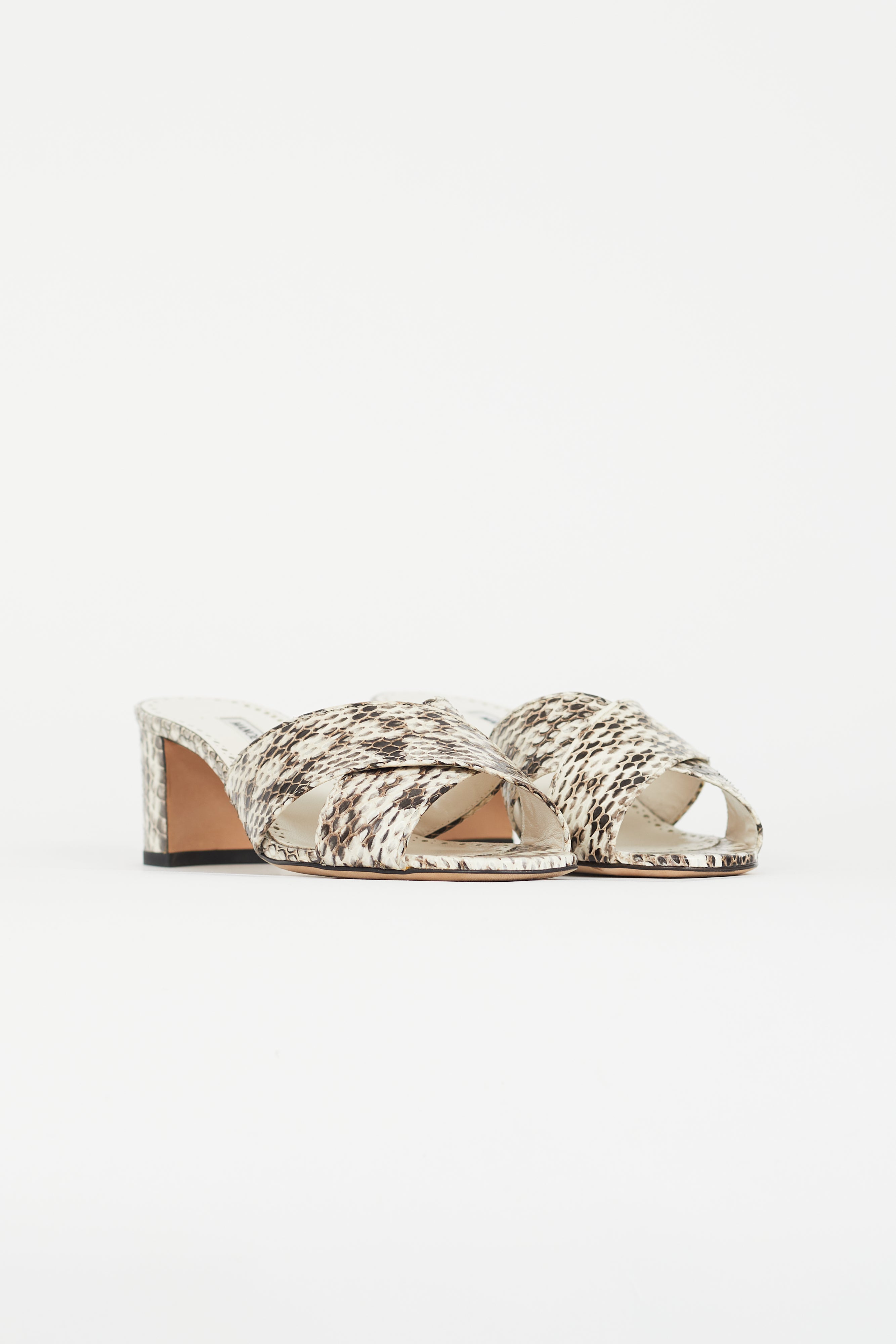 Pre-owned Manolo Blahnik brown and white Otawi mule featuring snakeskin effect, open narrow rounded toe, criss cross strap at vamp, leather insole, and covered block heel.