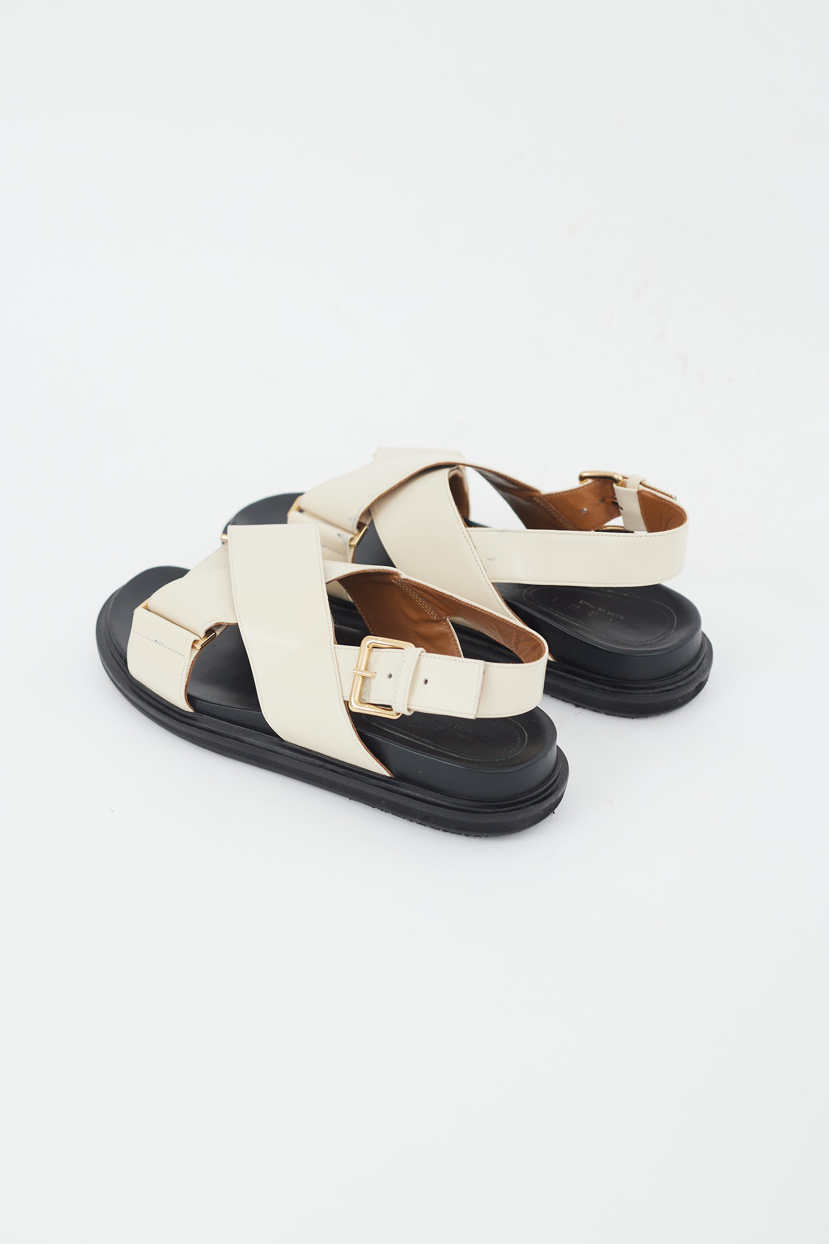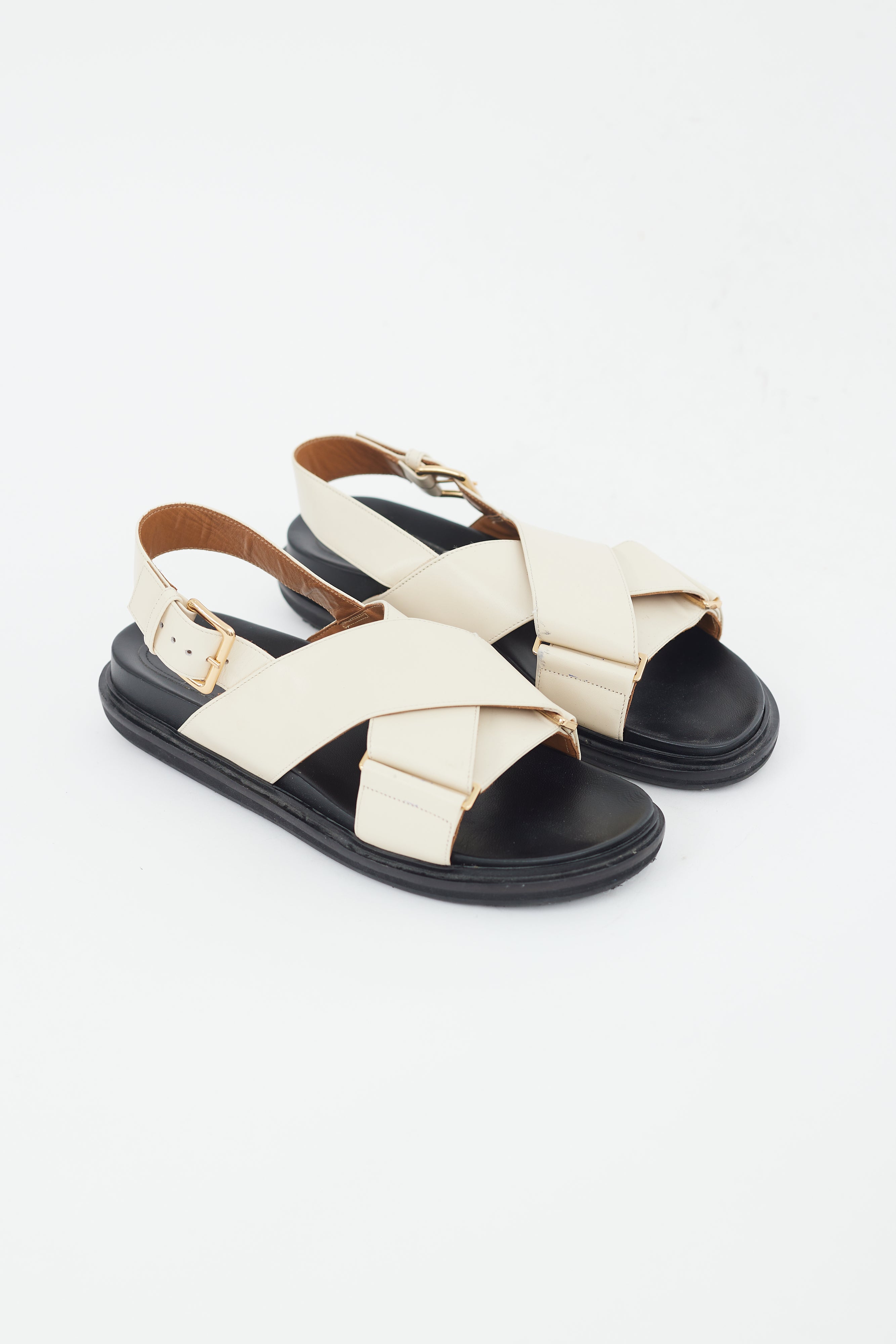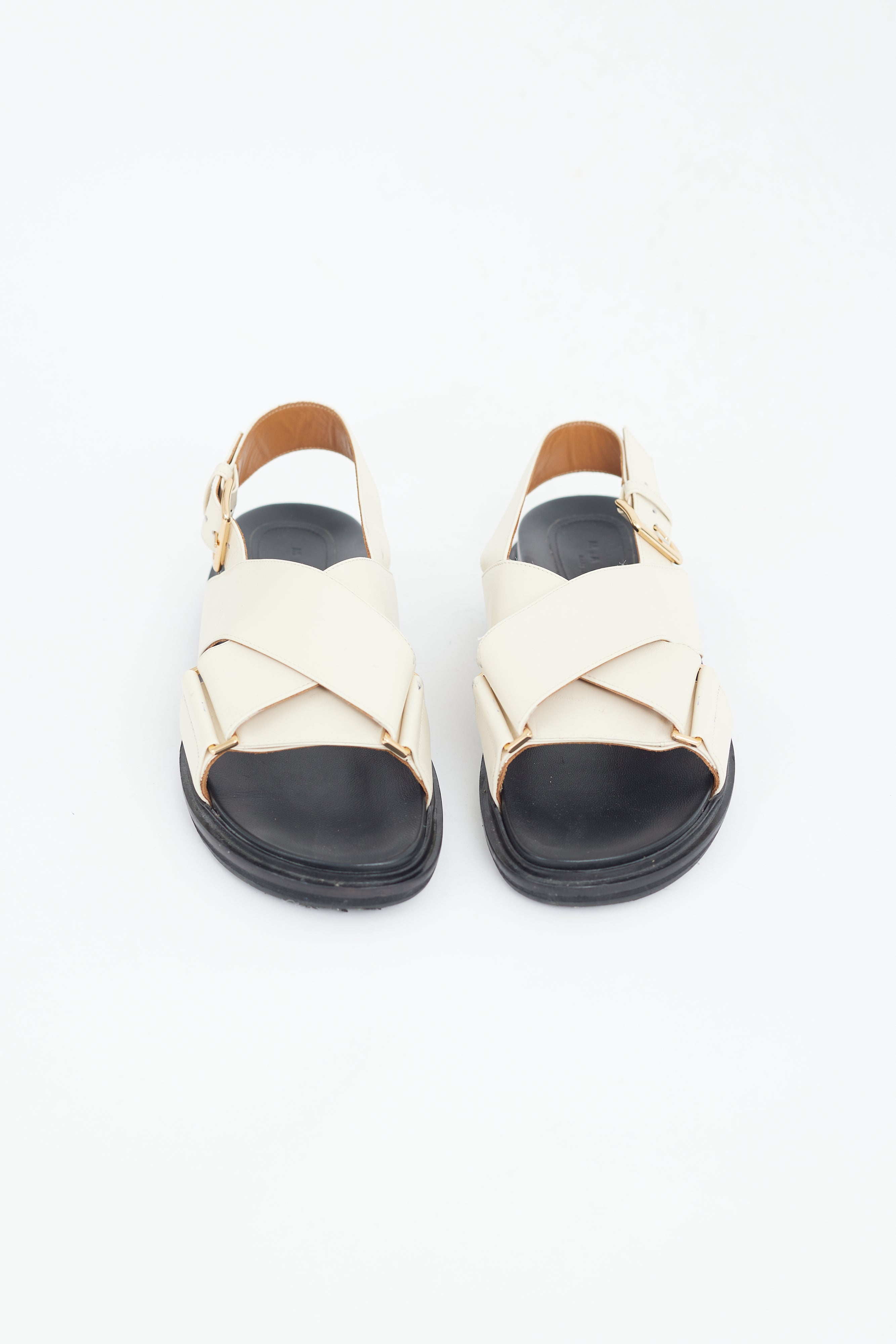 Pre-owned Marni beige sandals featuring an open rounded toe, leather uppers, crossed straps at body, gold tone hardware, adjustable slingback strap, leather insole, and rubber outsole.
