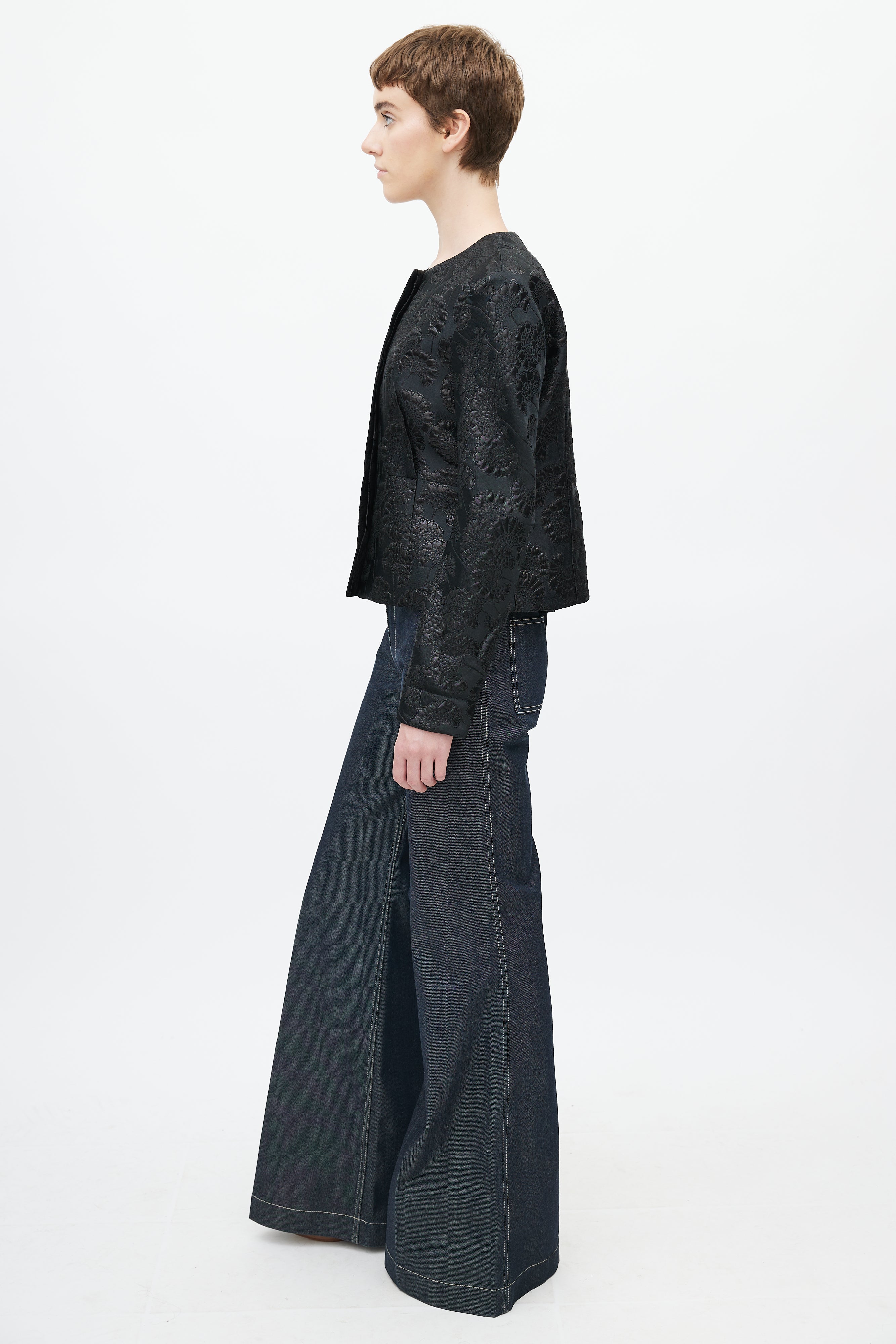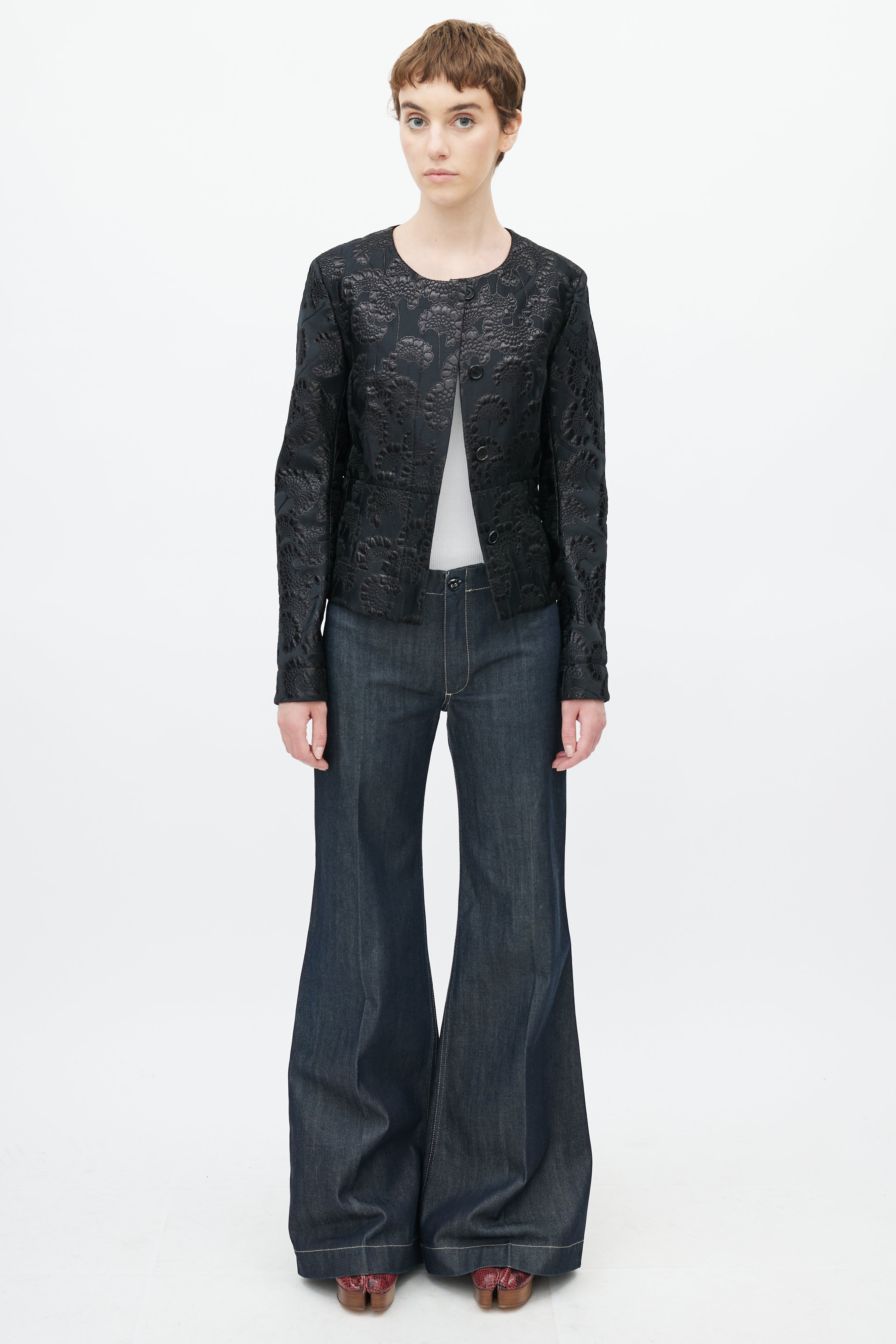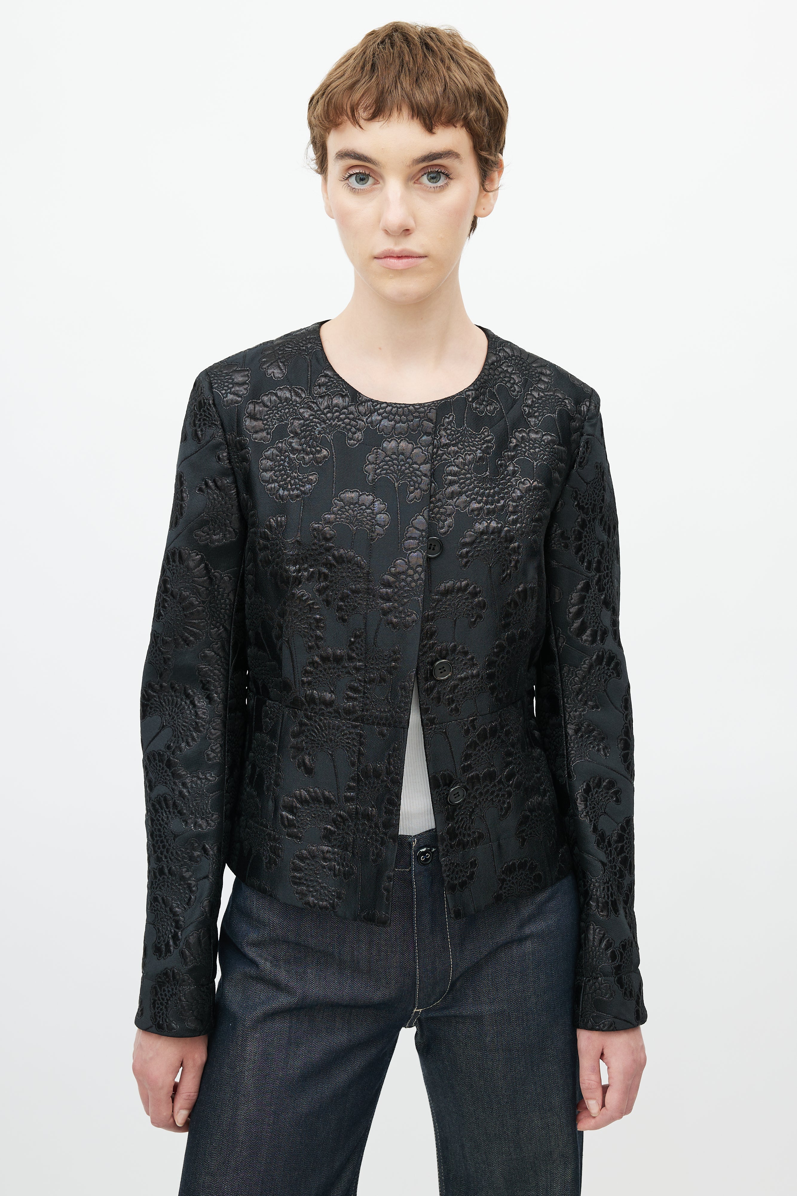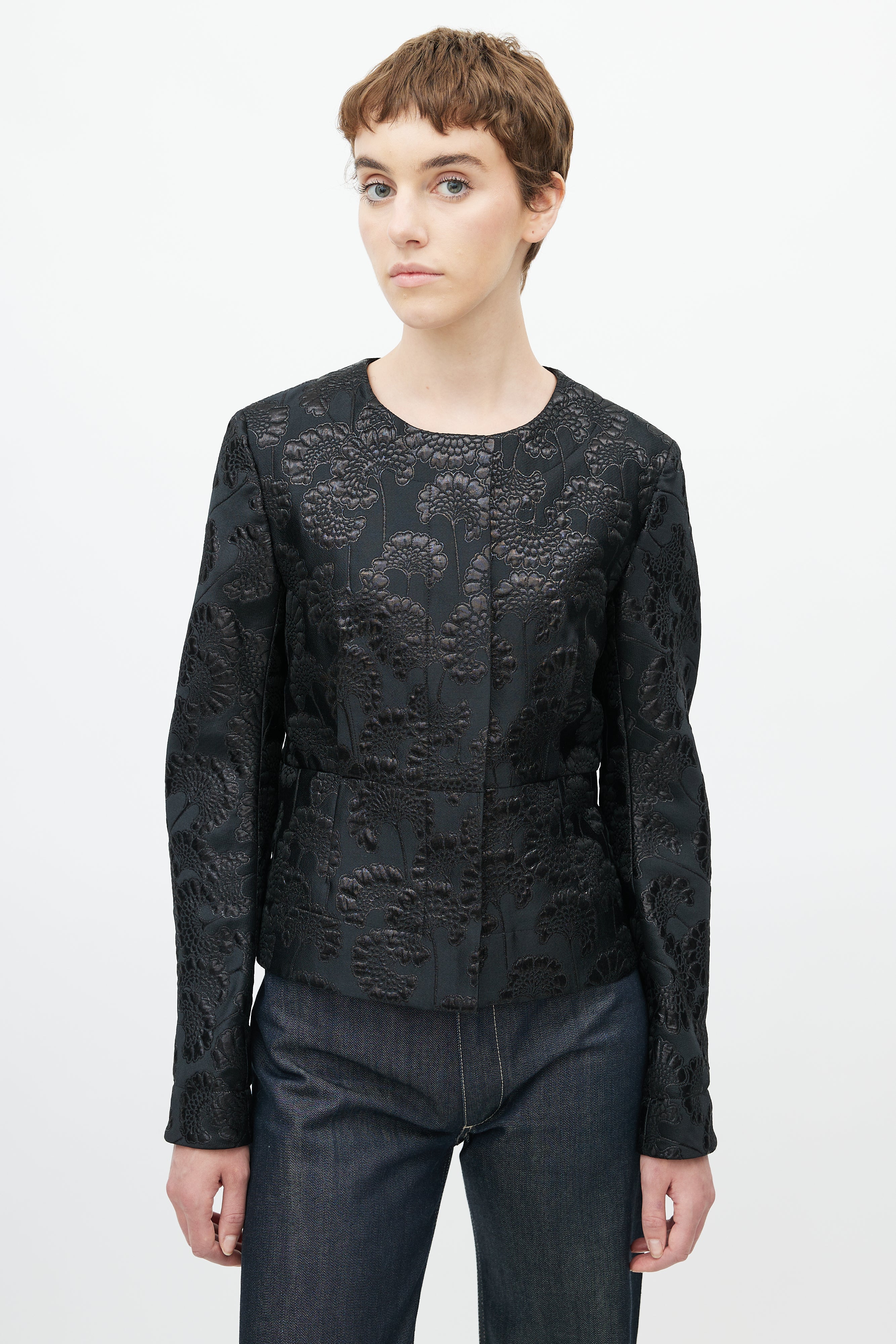 Pre-owned Marni black blazer featuring round neckline, concealed button up front, brocade, peplum hem, and one concealed pocket at right hip. Unlined.