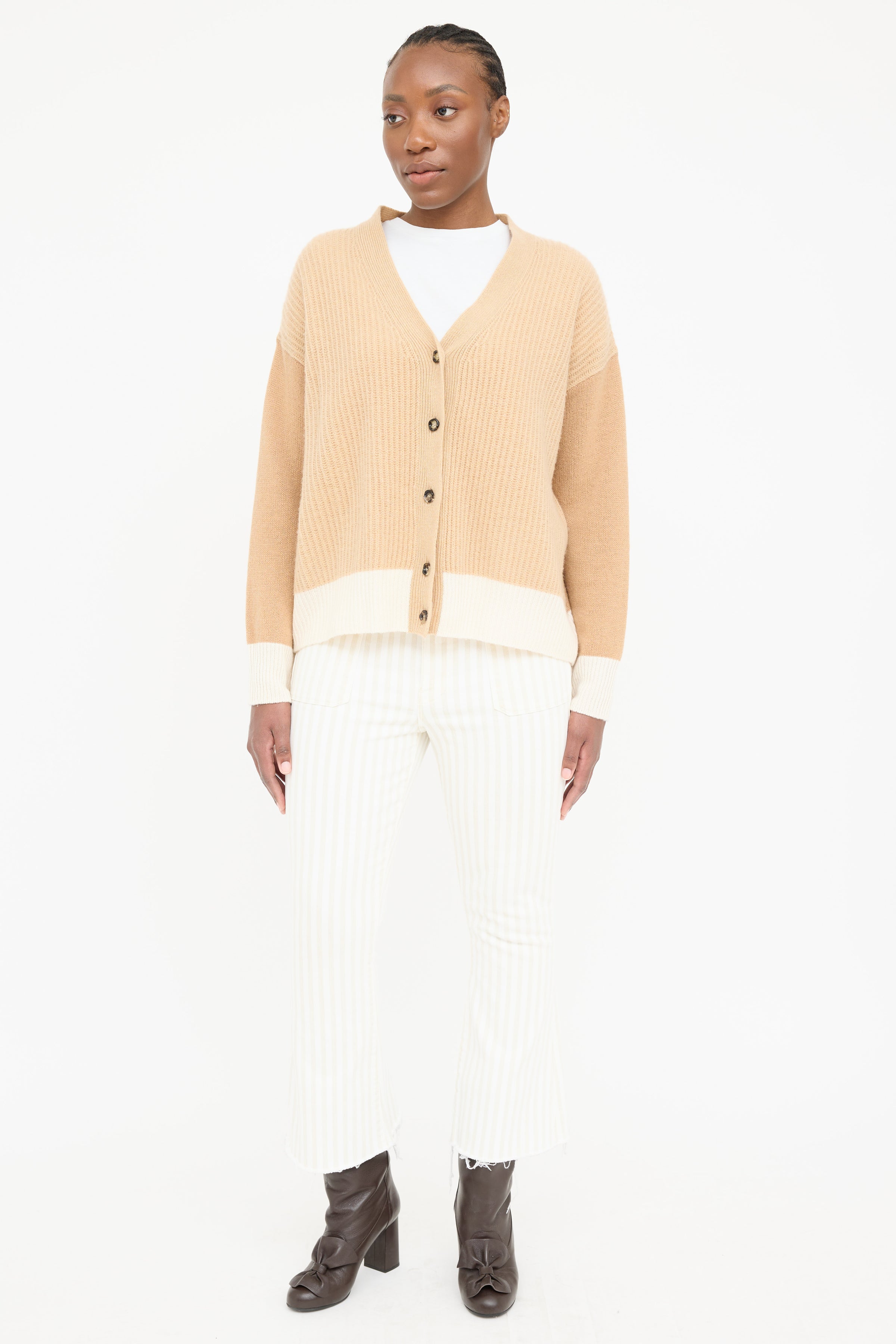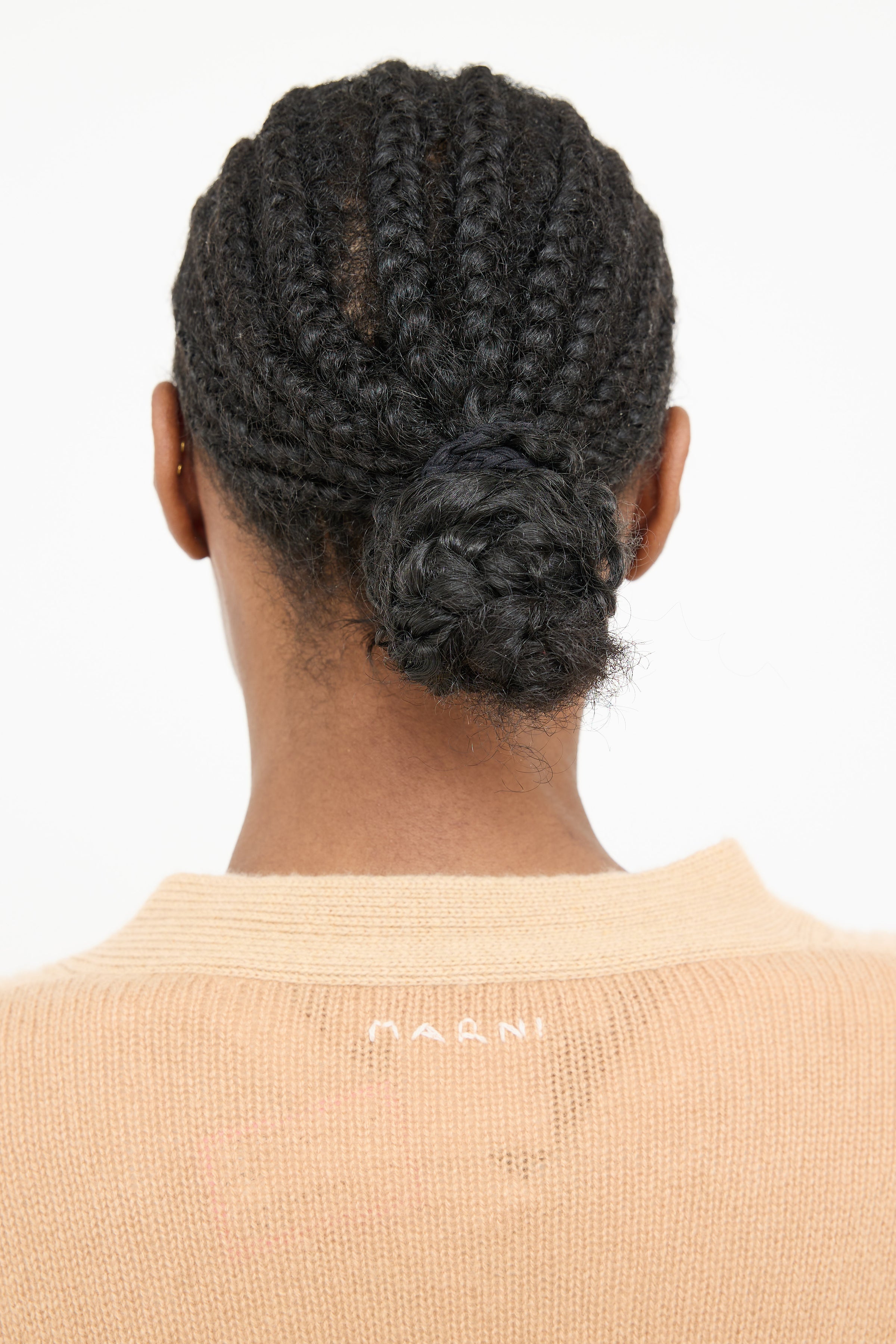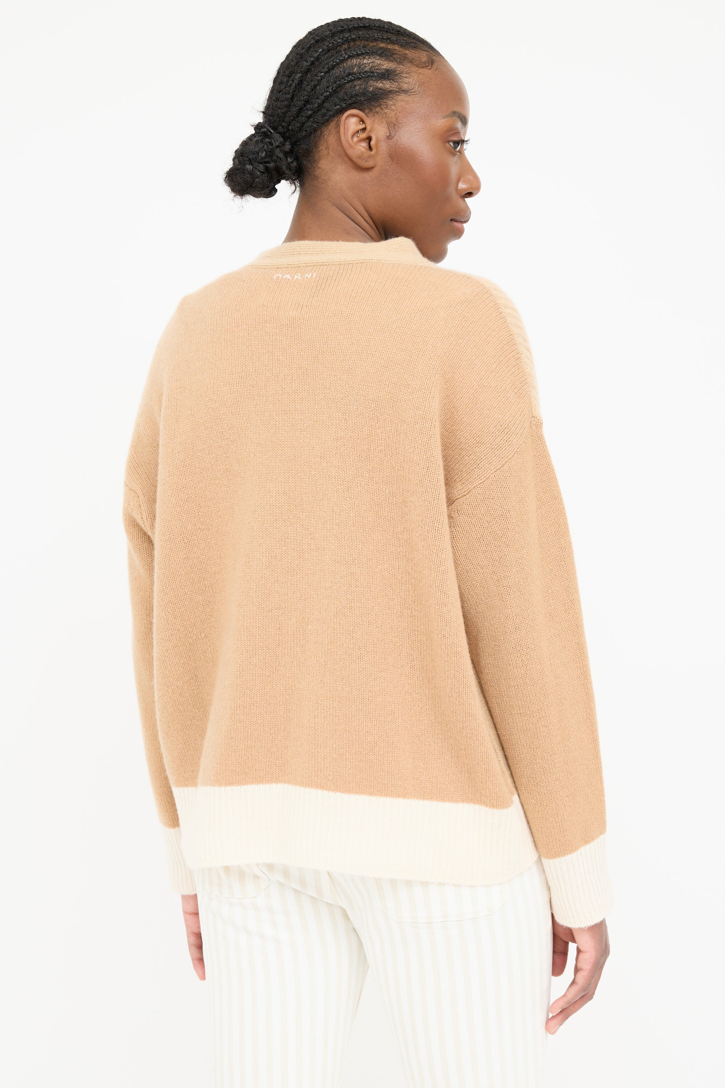 Pre-owned Marni beige cashmere cardigan featuring V neck, button closure, cream hem, long sleeves and embroidered logo at back.
