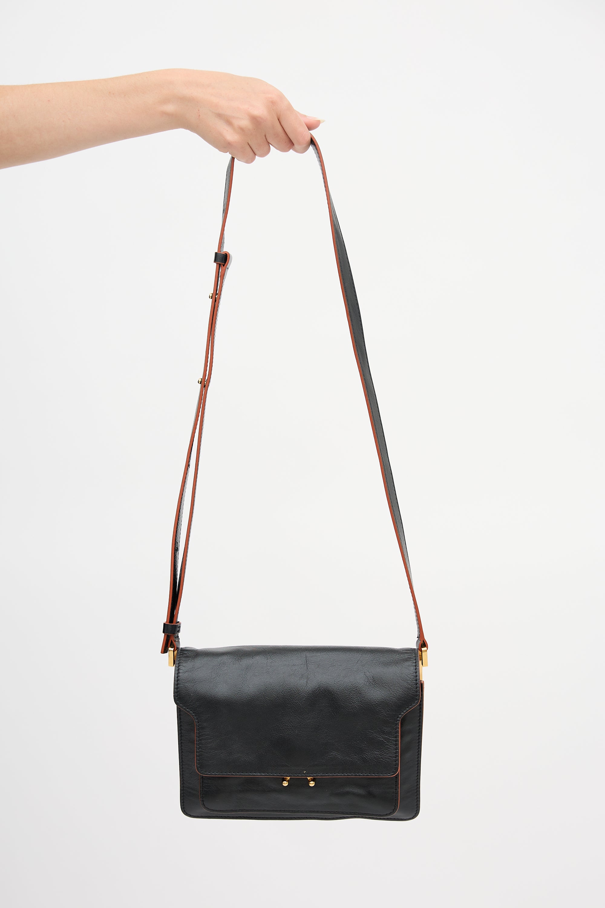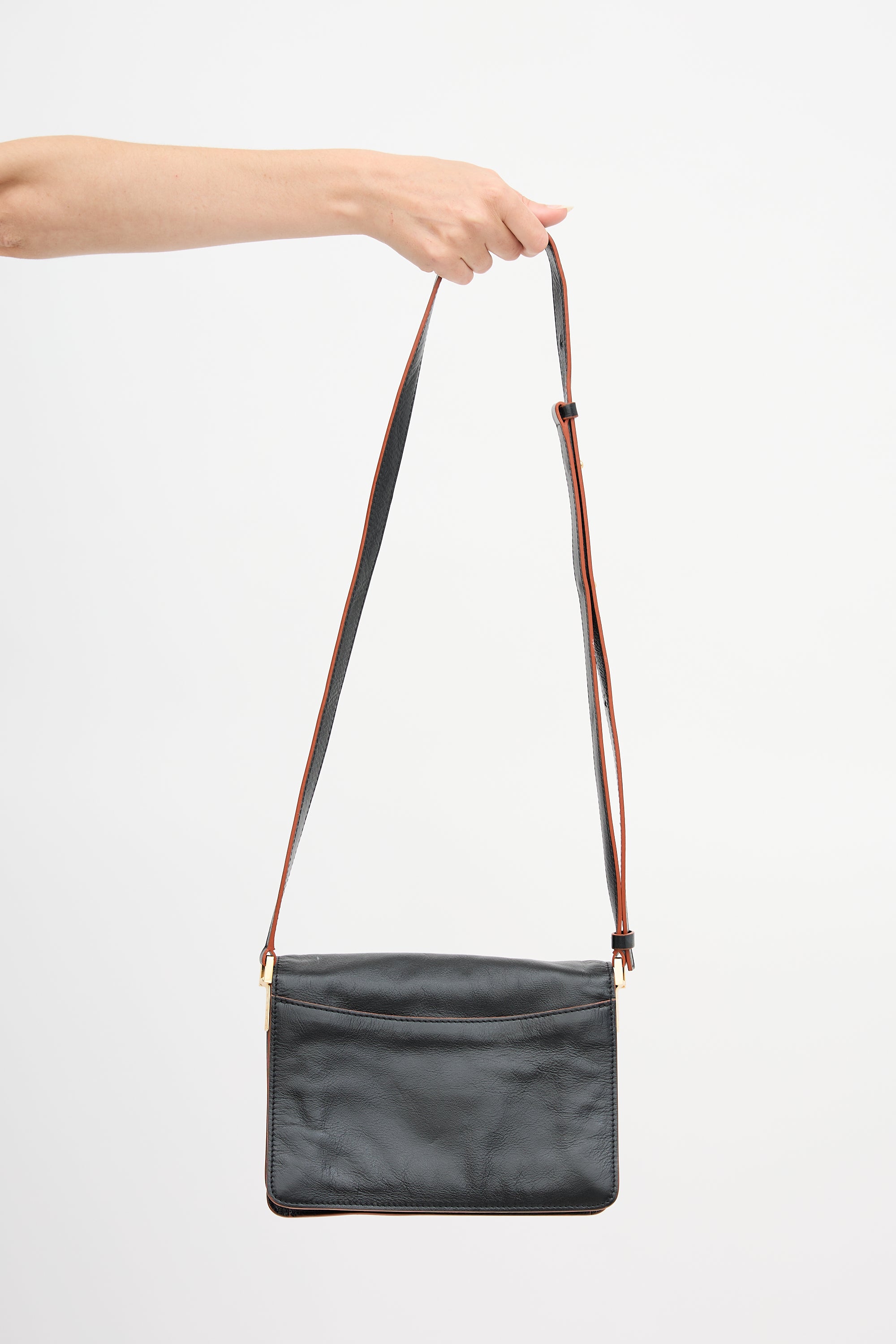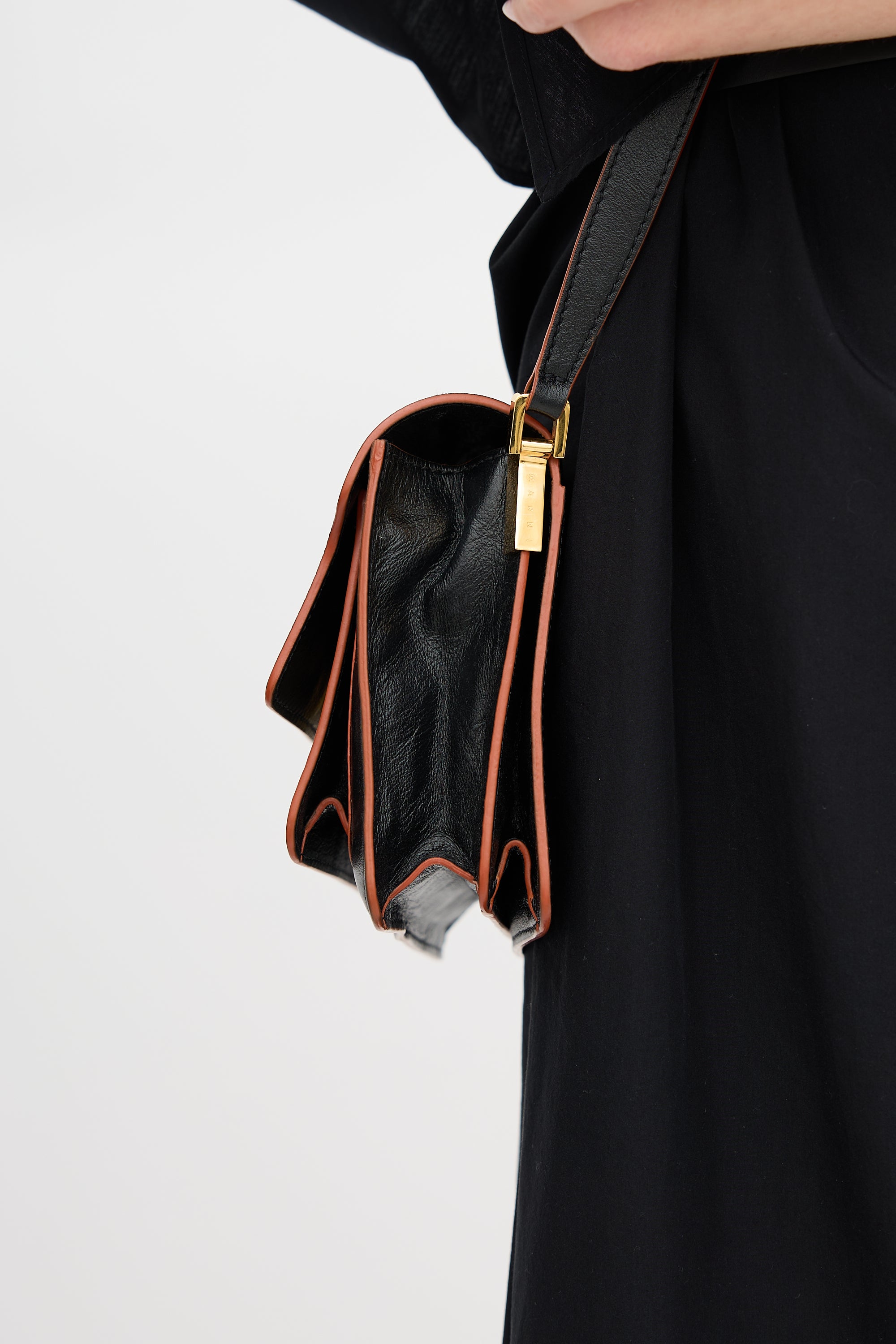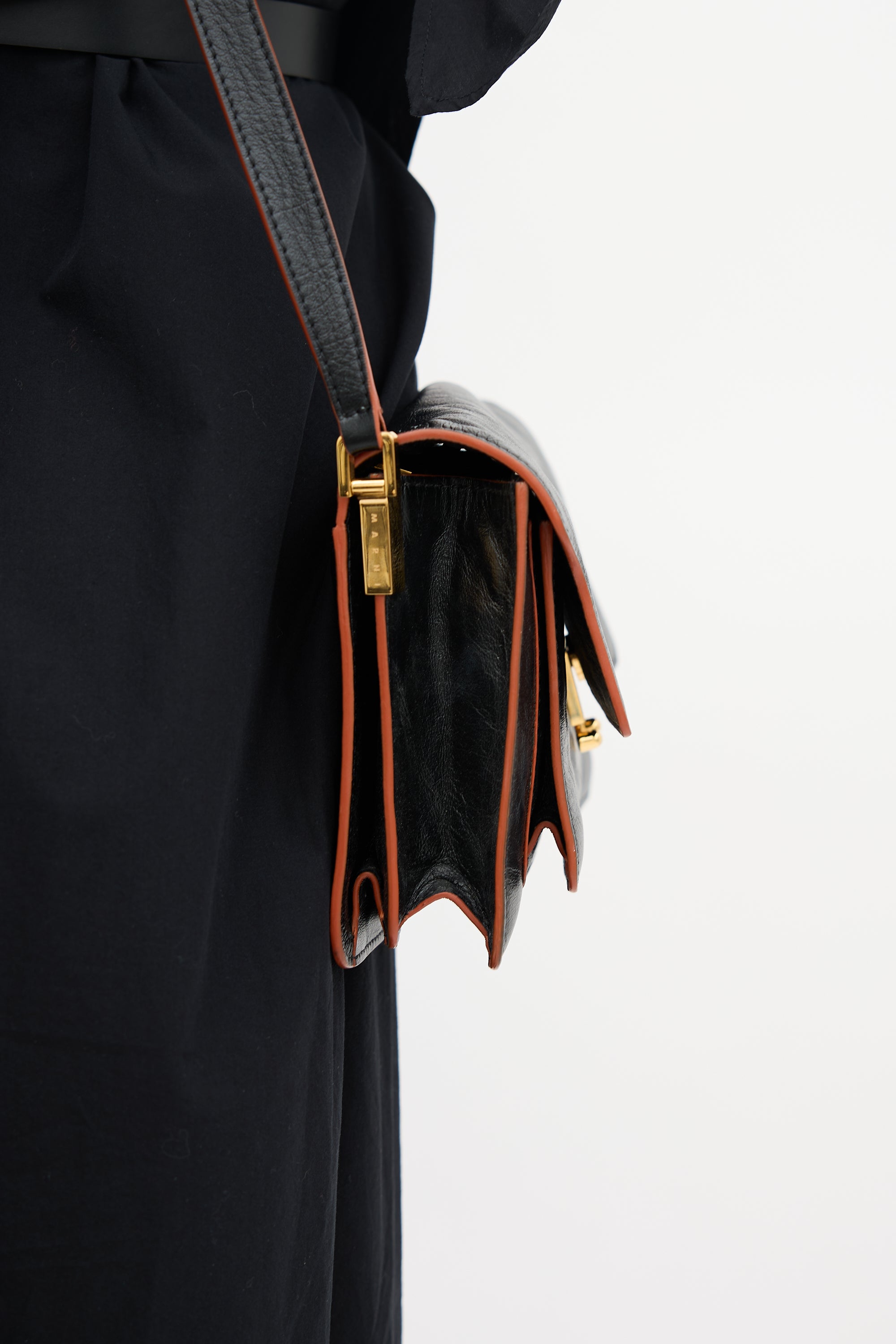 Pre-owned Marni black leather Trunk bag featuring adjustable strap, back slip pocket, front flap, push lock closure, slip pocket with stamped logo under flap, and two lined main compartments with zipper divider and one slip pocket.