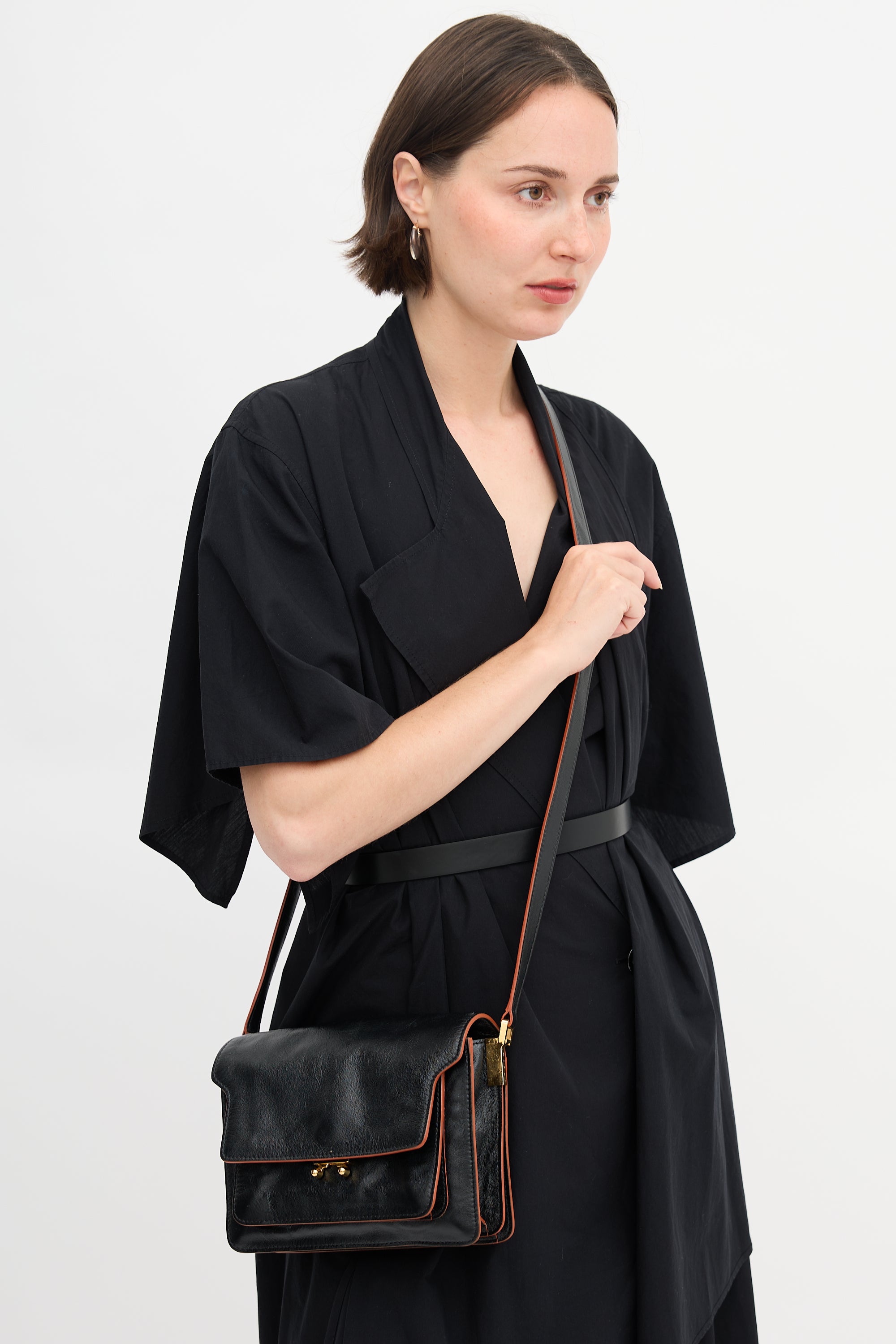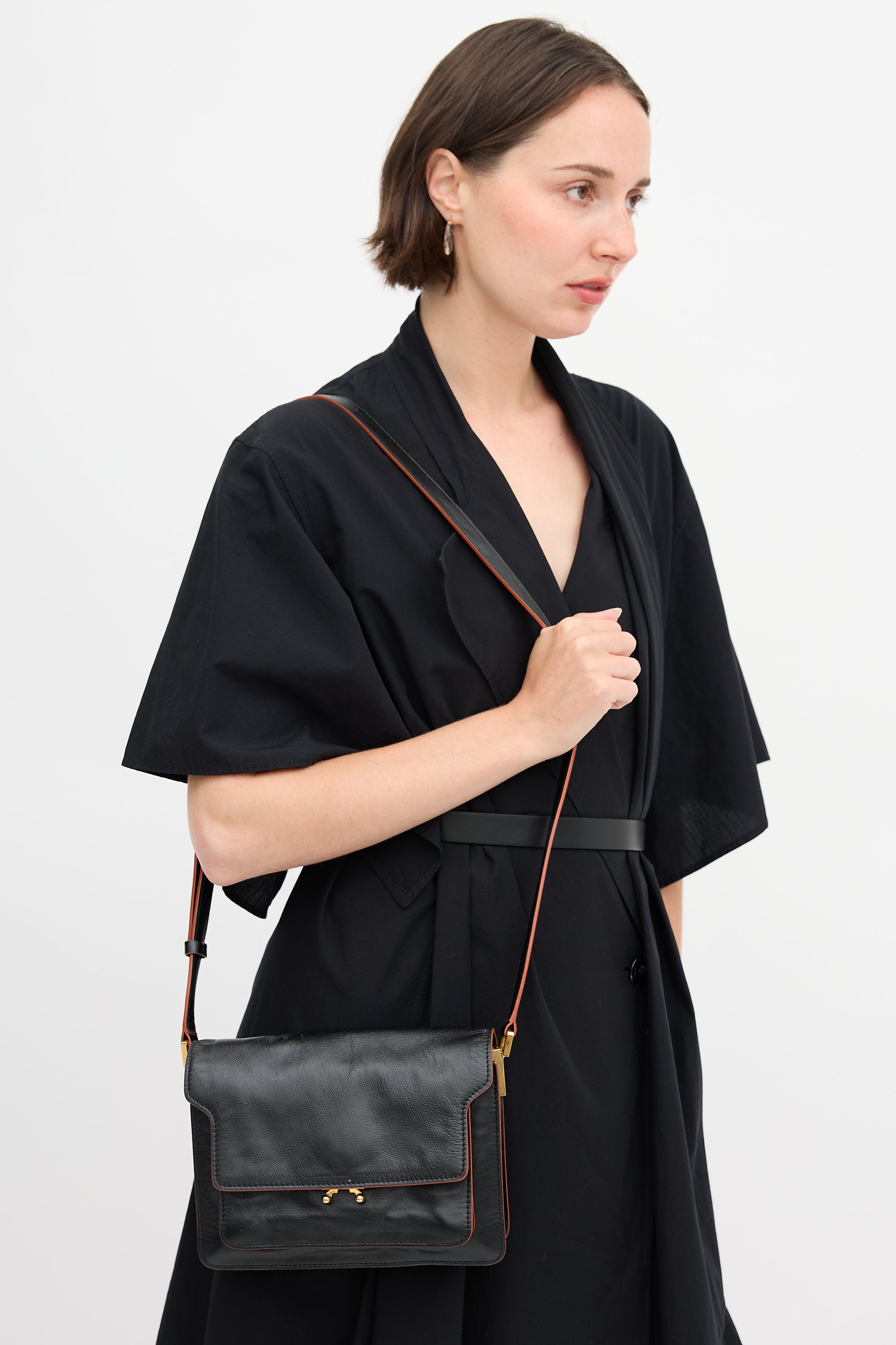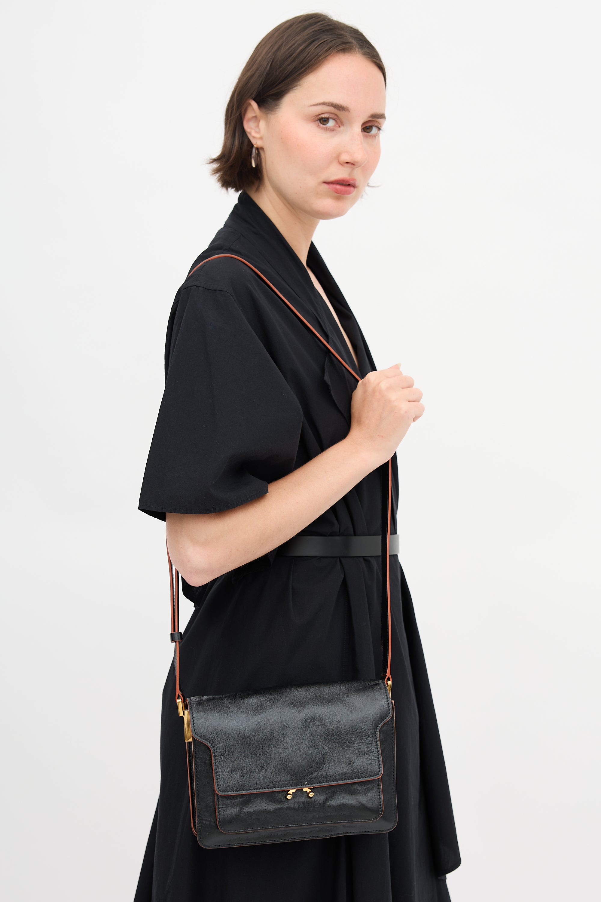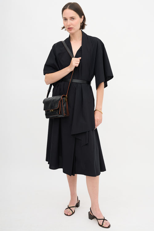 Pre-owned Marni black leather Trunk bag featuring adjustable strap, back slip pocket, front flap, push lock closure, slip pocket with stamped logo under flap, and two lined main compartments with zipper divider and one slip pocket.
