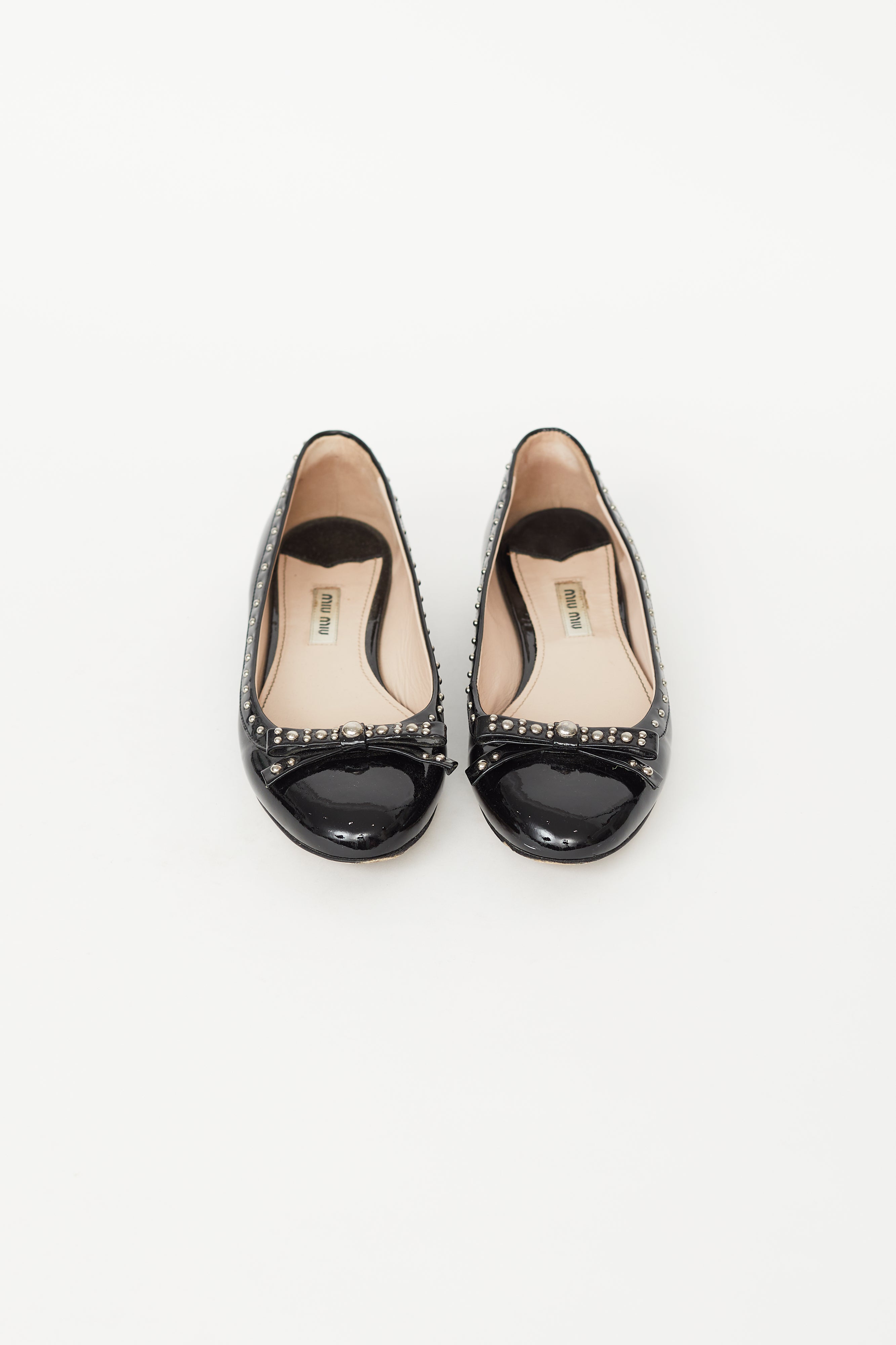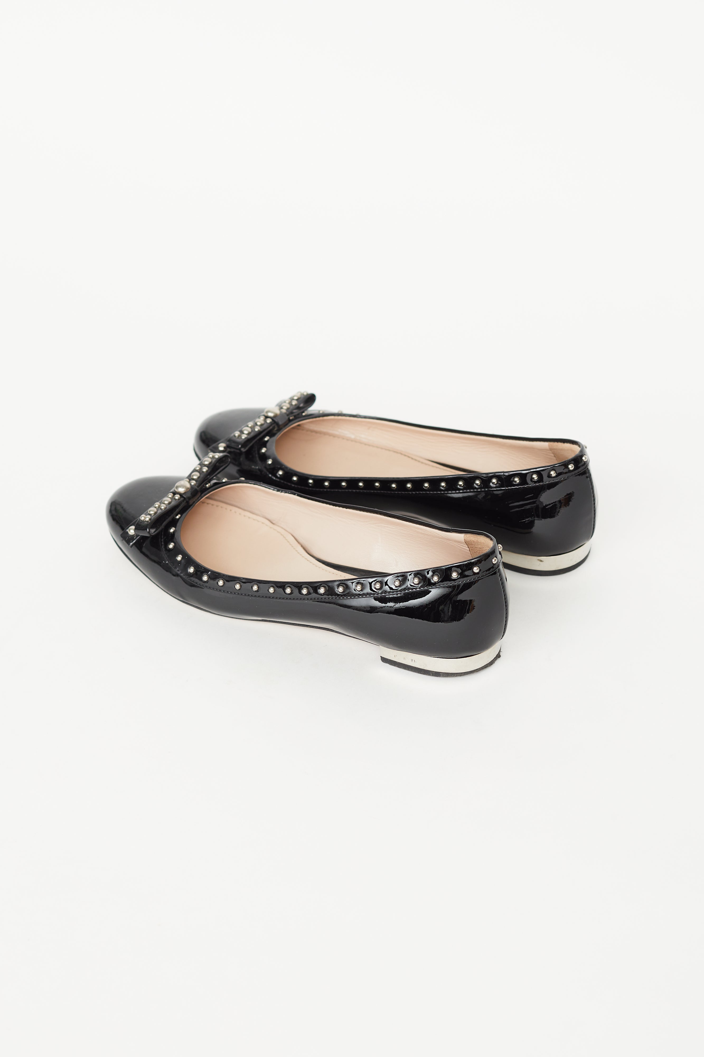 Pre-owned Miu Miu black ballet flats featuring rounded toe, attached bow at vamp, silver tone round stud embellishment at collar, silver tone block heel, and slip on entry.