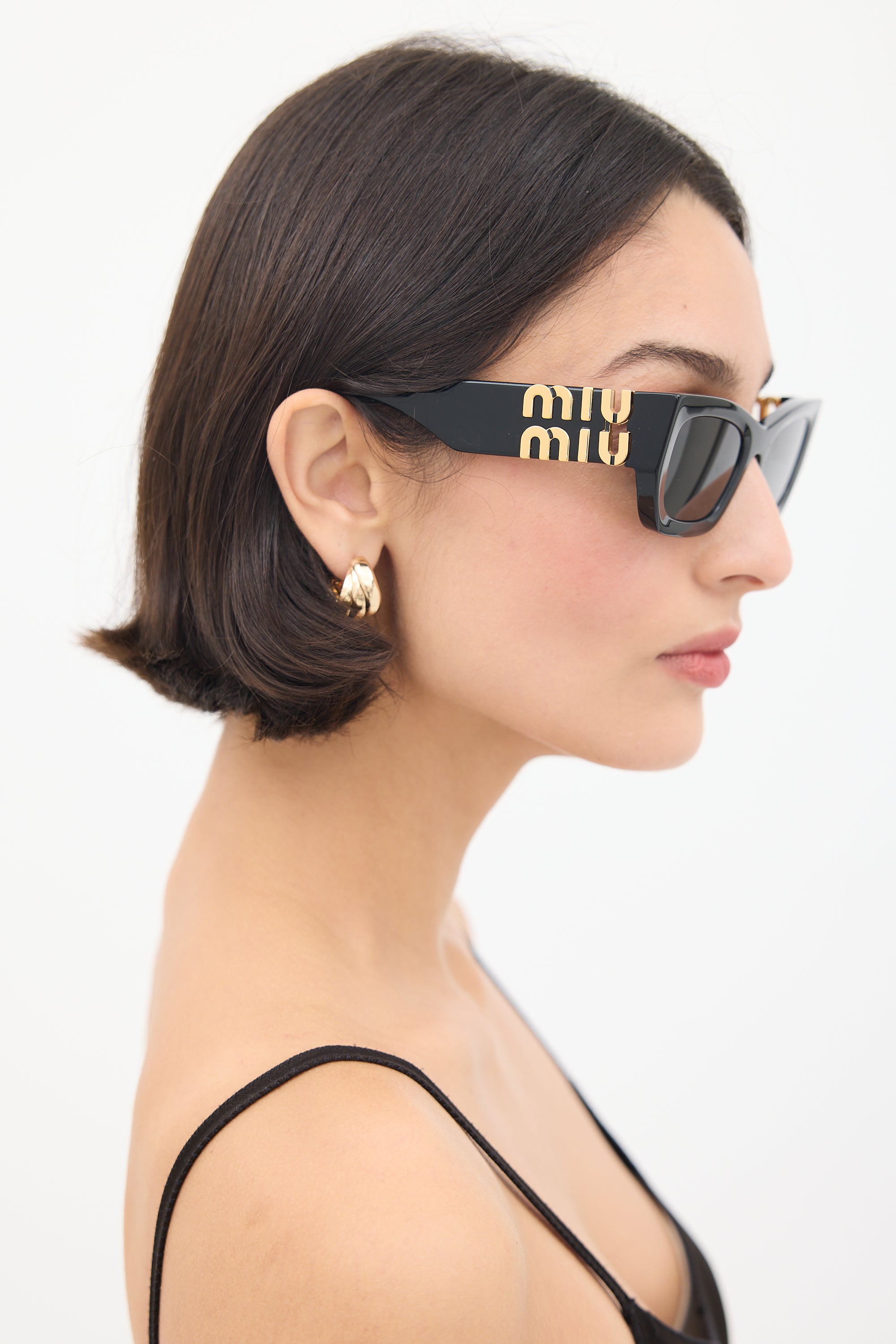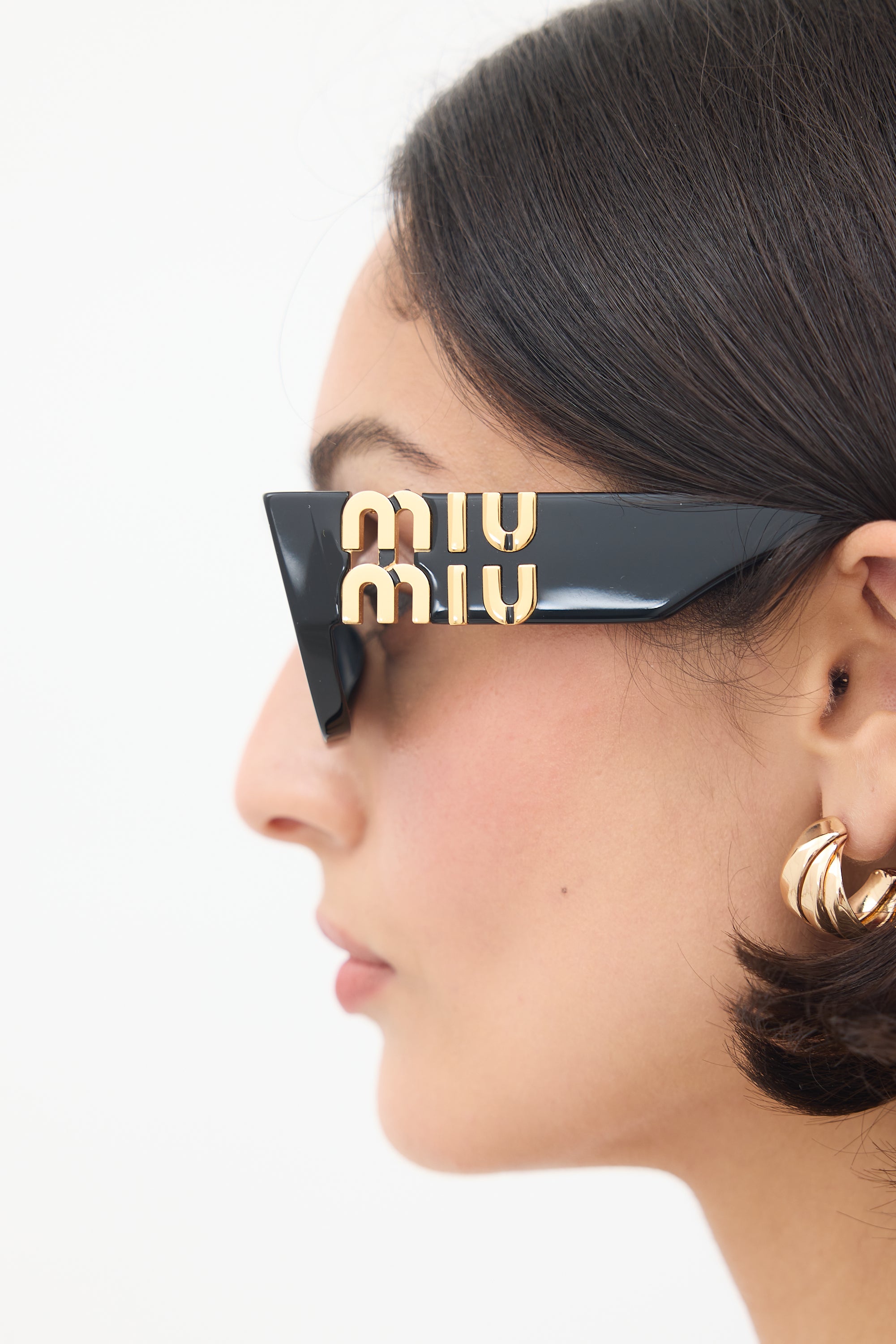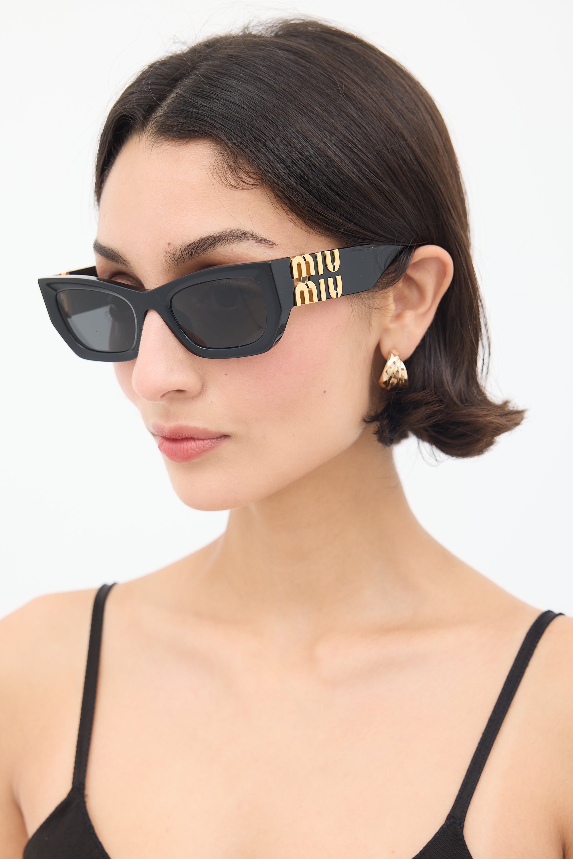 Pre-owned Miu Miu SMU09W sunglasses featuring grey tinted lenses, black geometric cat eye frame, and gold tone logo hardware at temples. Comes with original pouch and case.