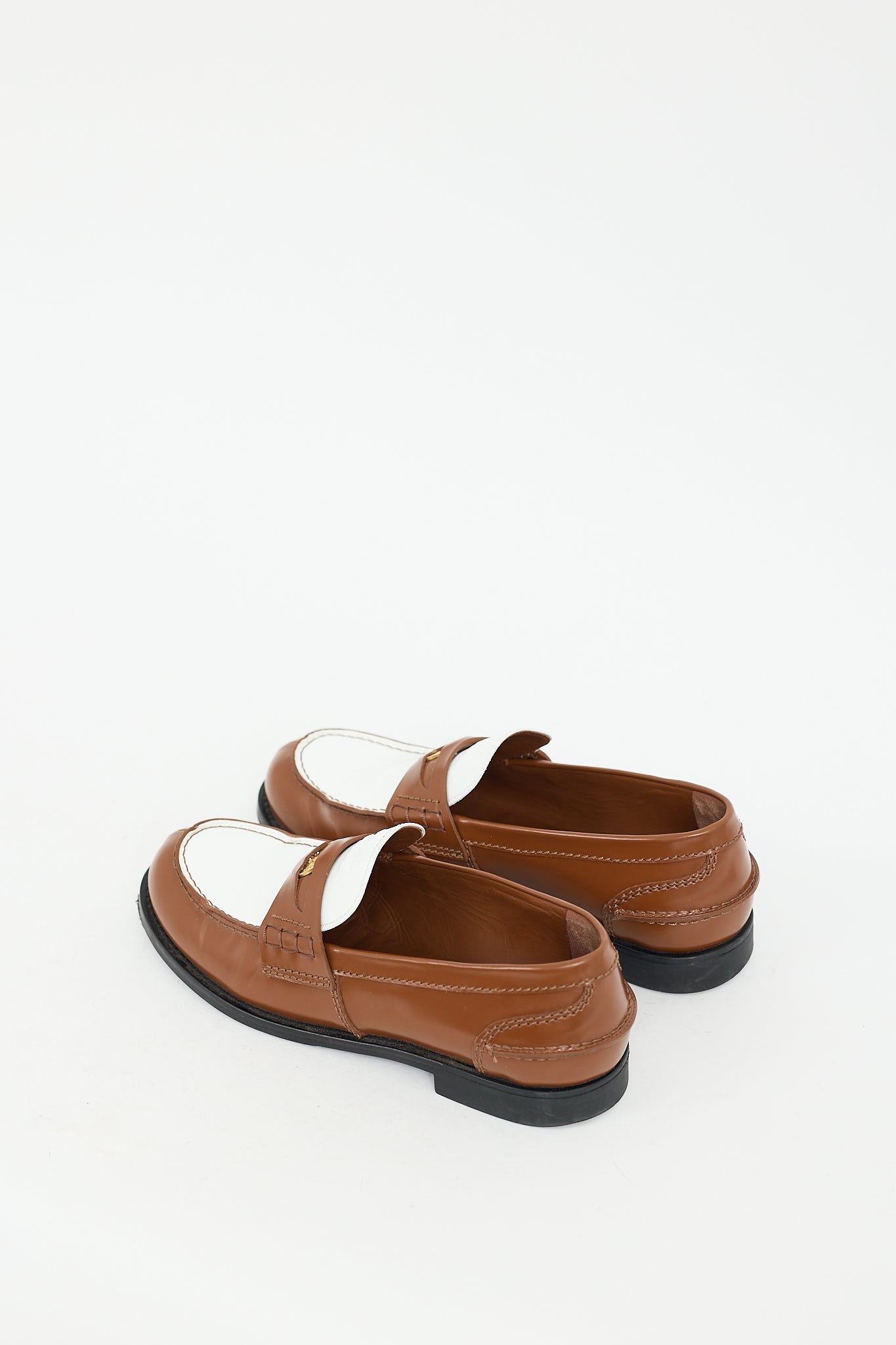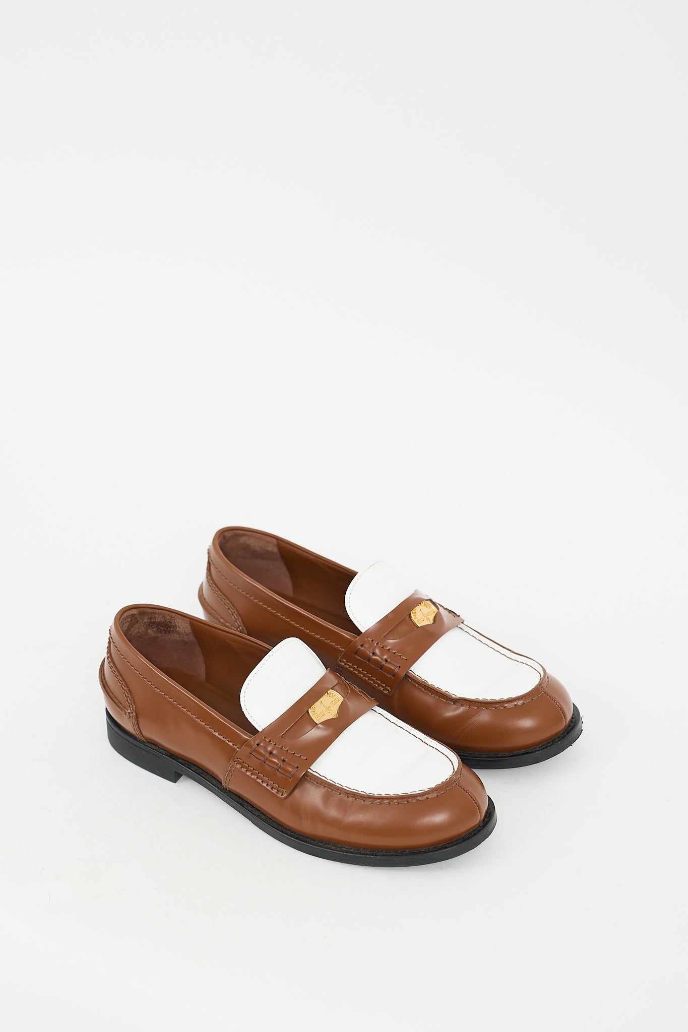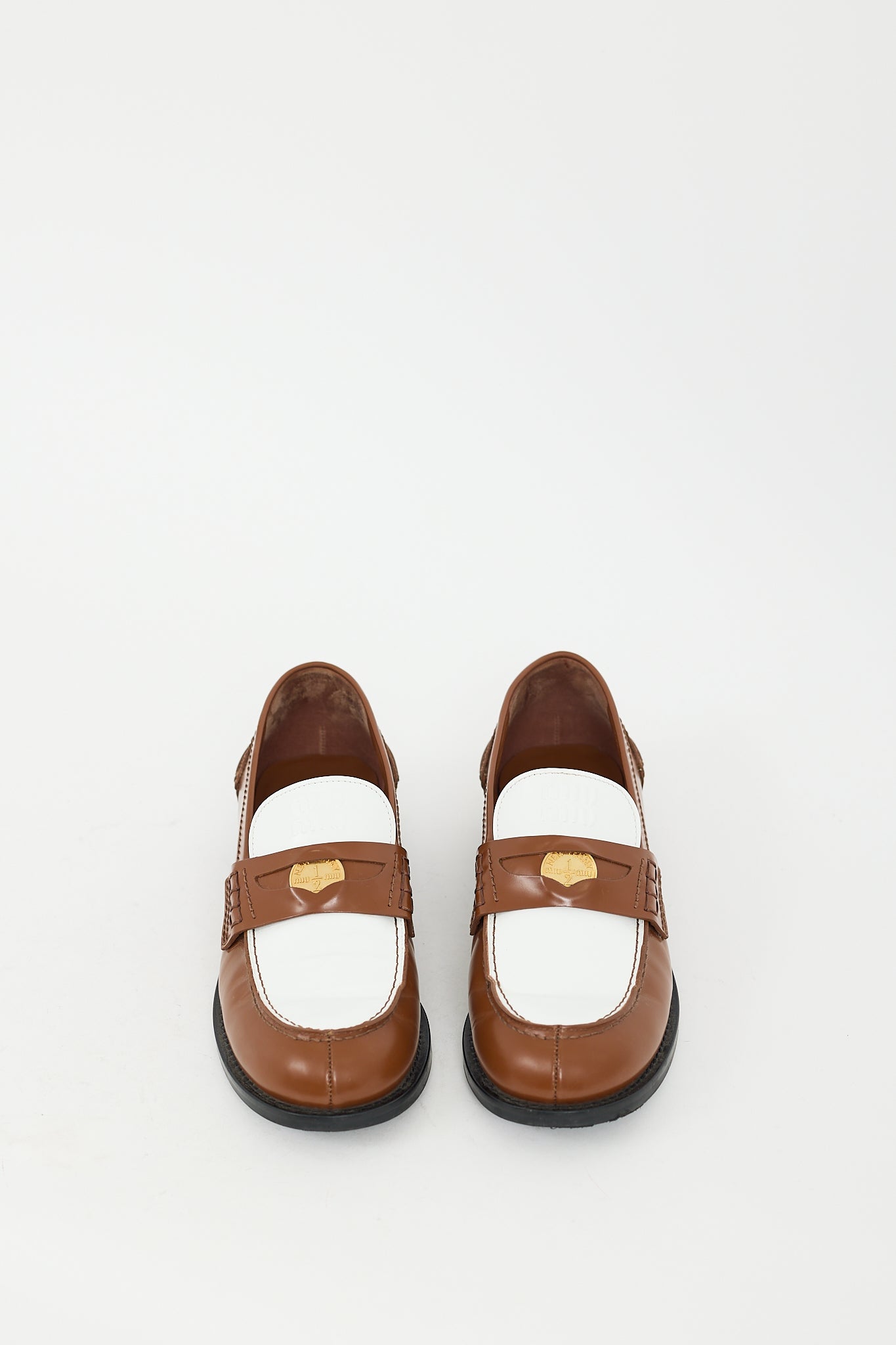 Pre-owned Miu Miu brown and white leather penny loafers featuring a rounded toe, colour blocked design, notched topline, embossed logo at tongue, gold tone coin embellishment at strap across instep, and short stacked rubber heel. Comes with original box and dust bags.