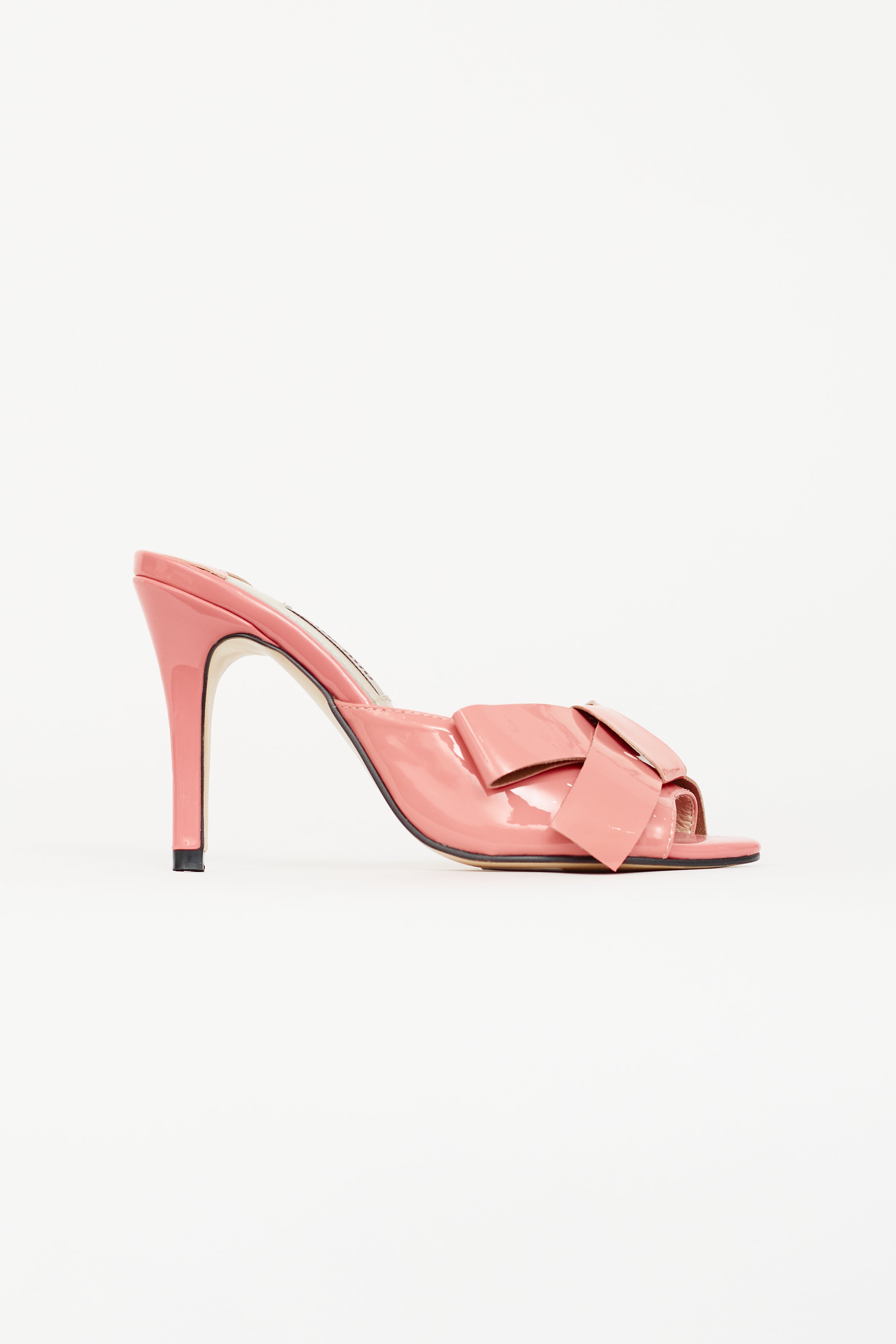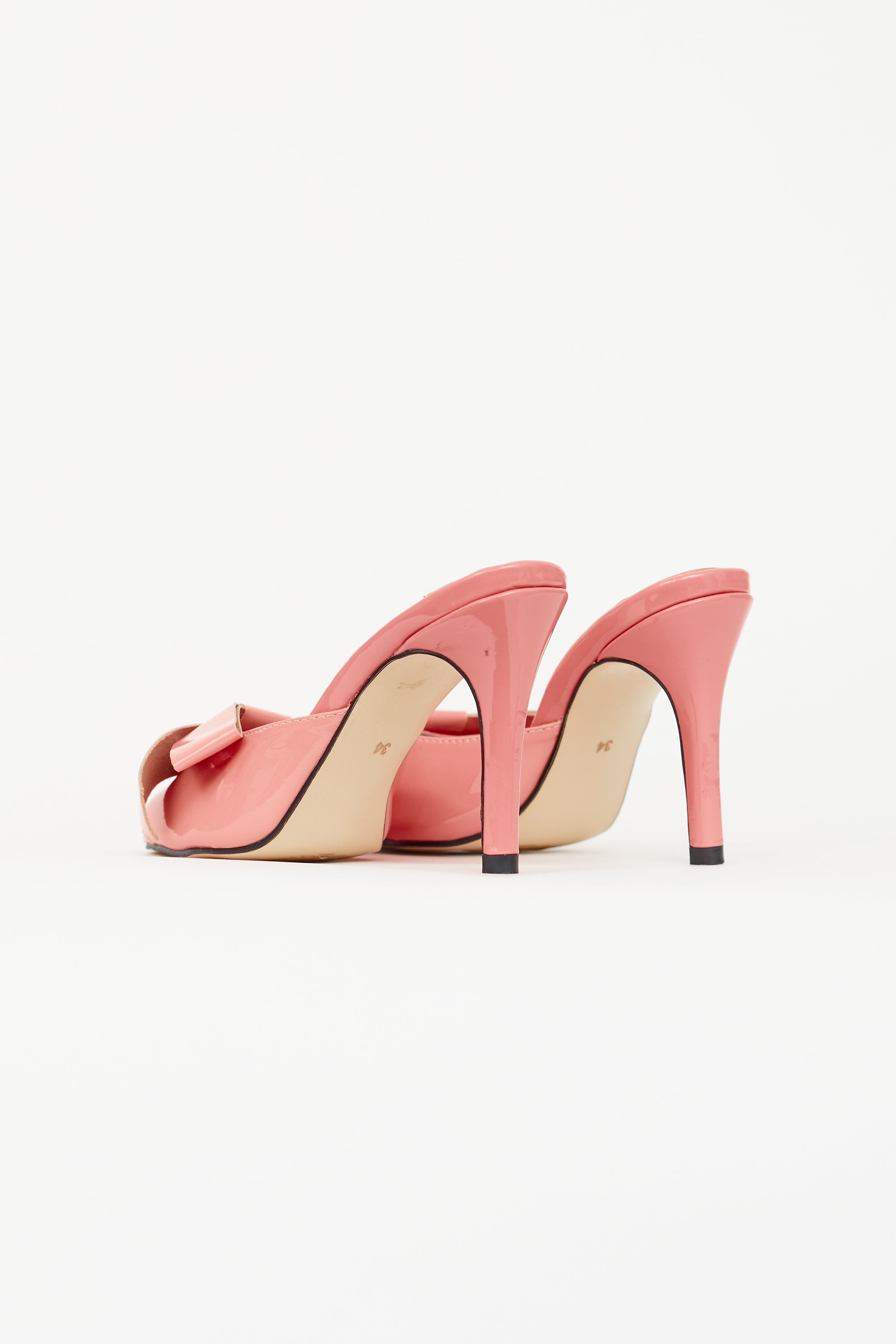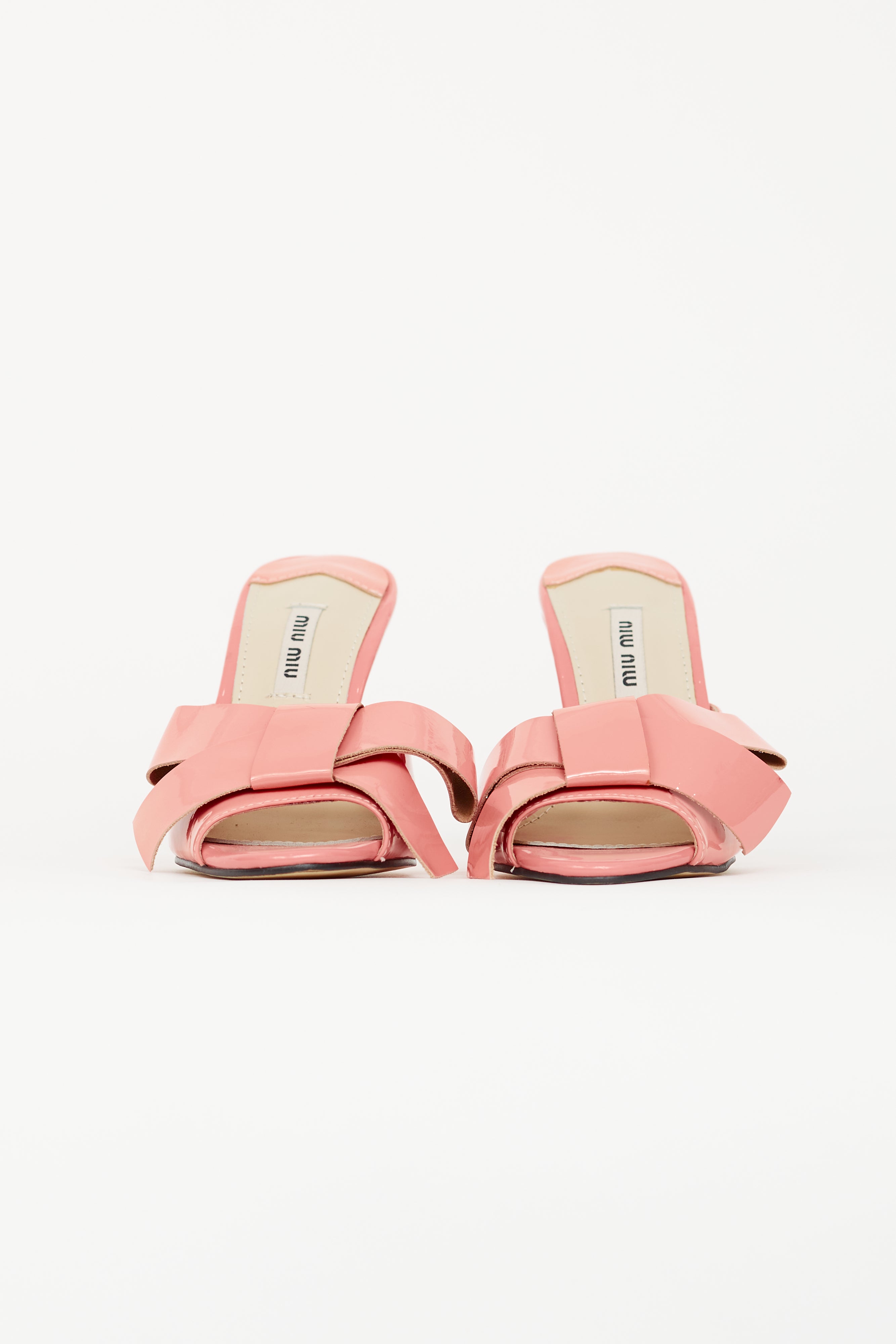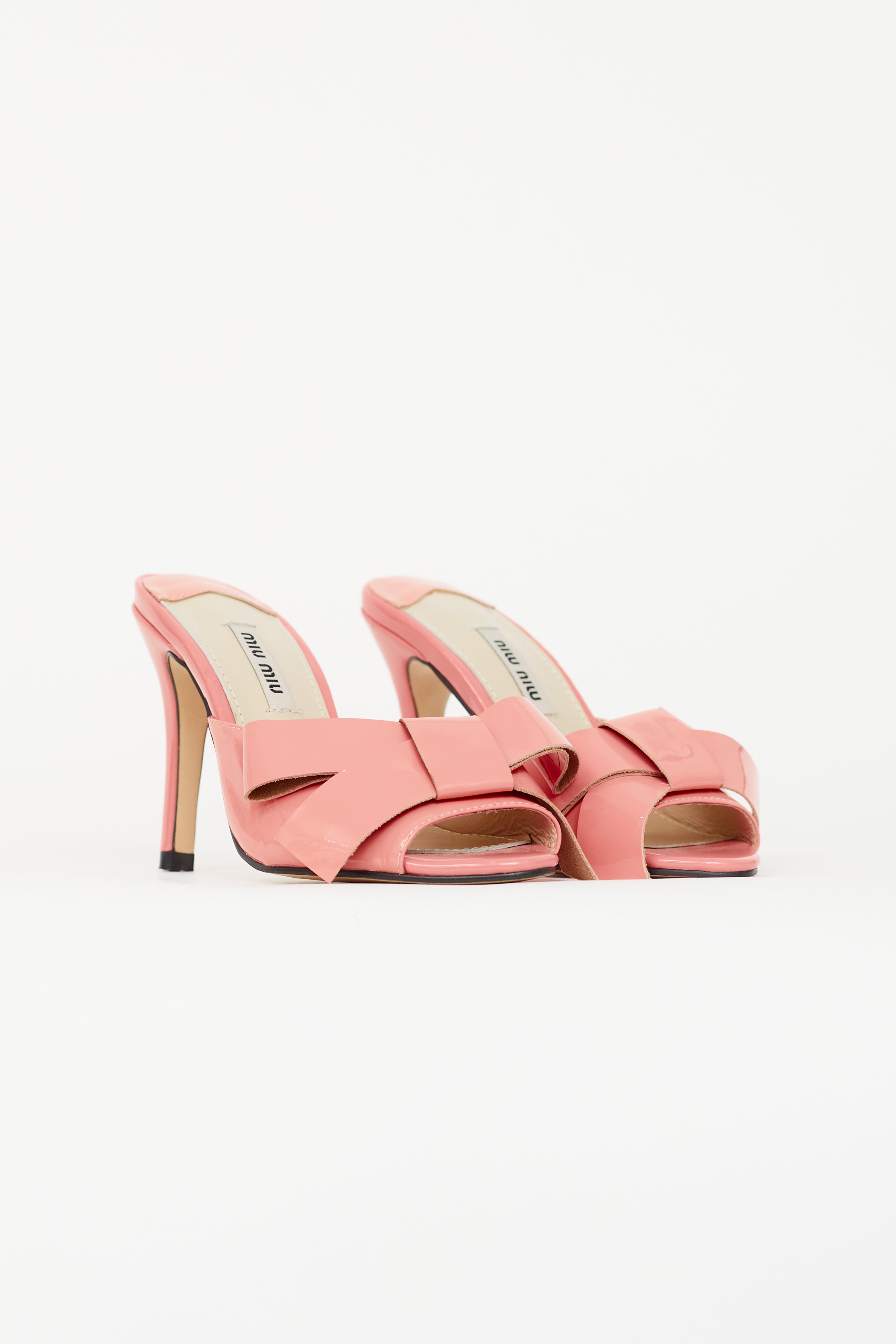 Pre-owned Miu Miu pink patent sandals featuring a pointed peep toe, wrapped stiletto heel, and bow detail at vamp.
