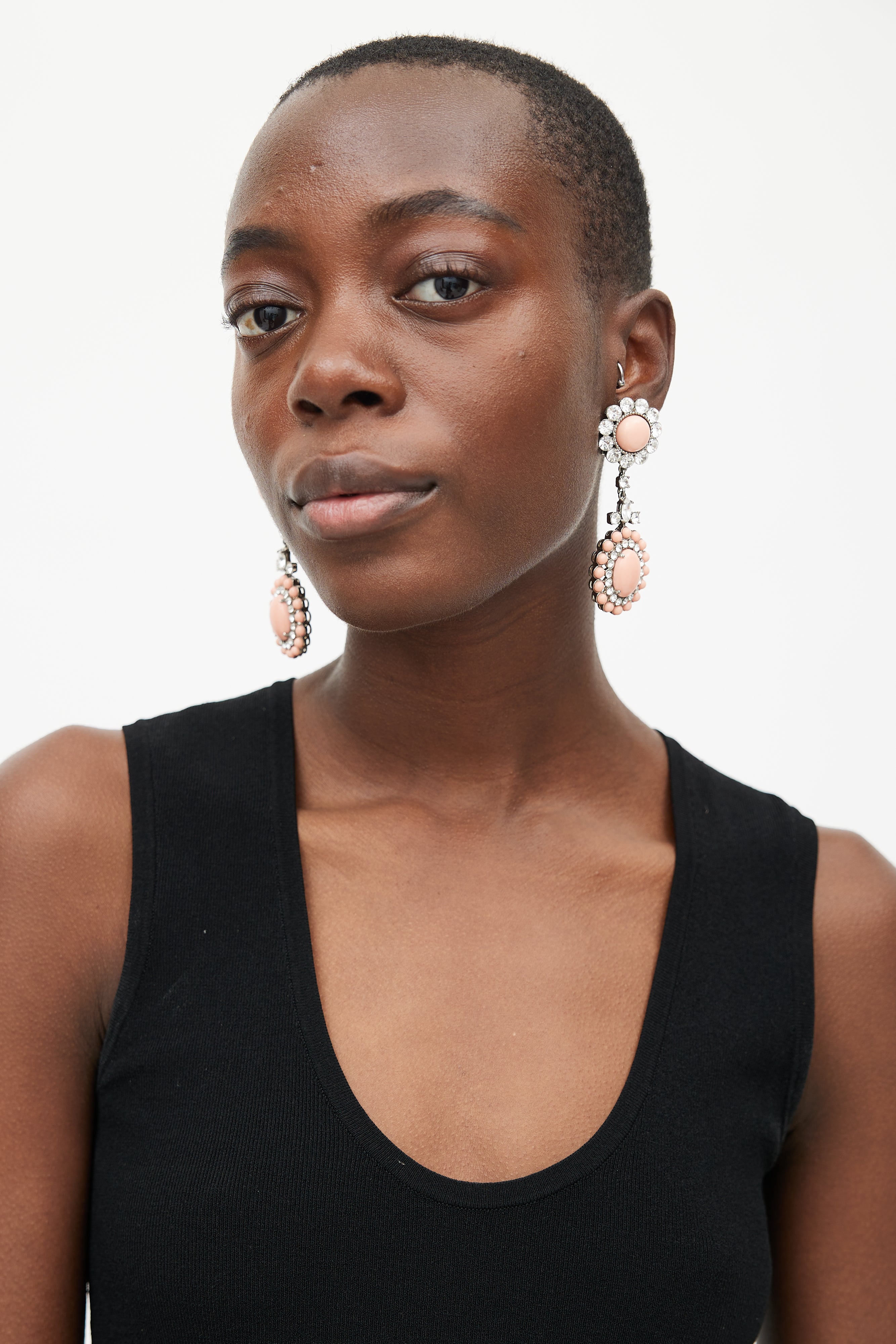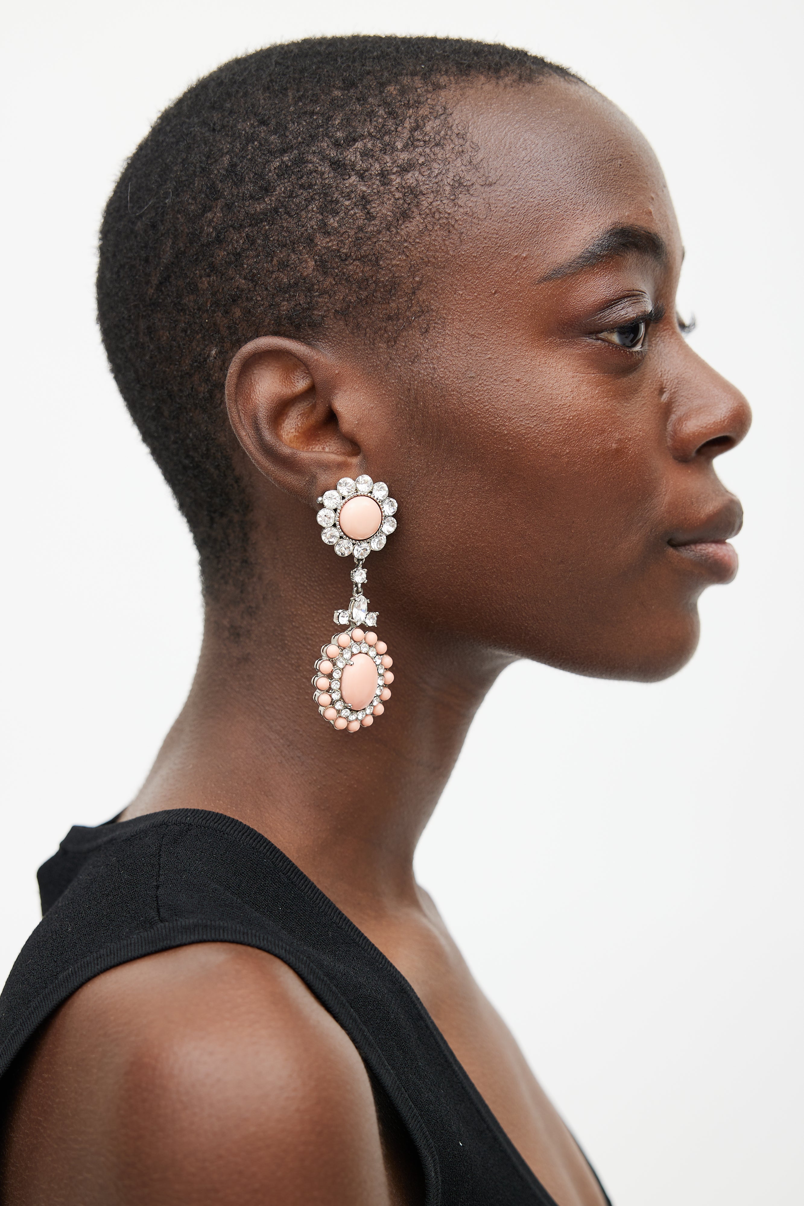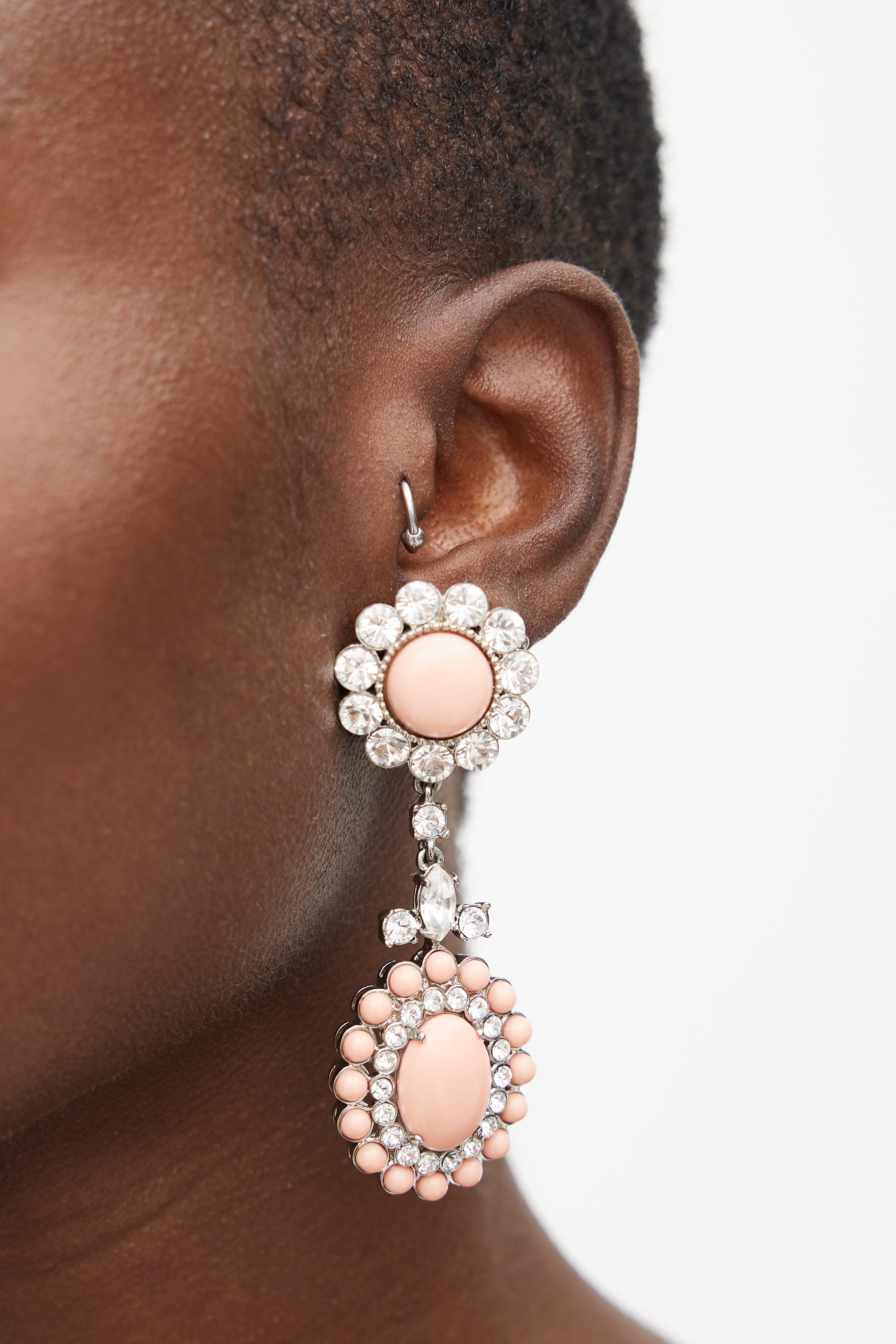 Pre-owned Miu Miu drop earrings featuring round crystal and pink gem embellishment, engraved logo at back, and clip on closure.