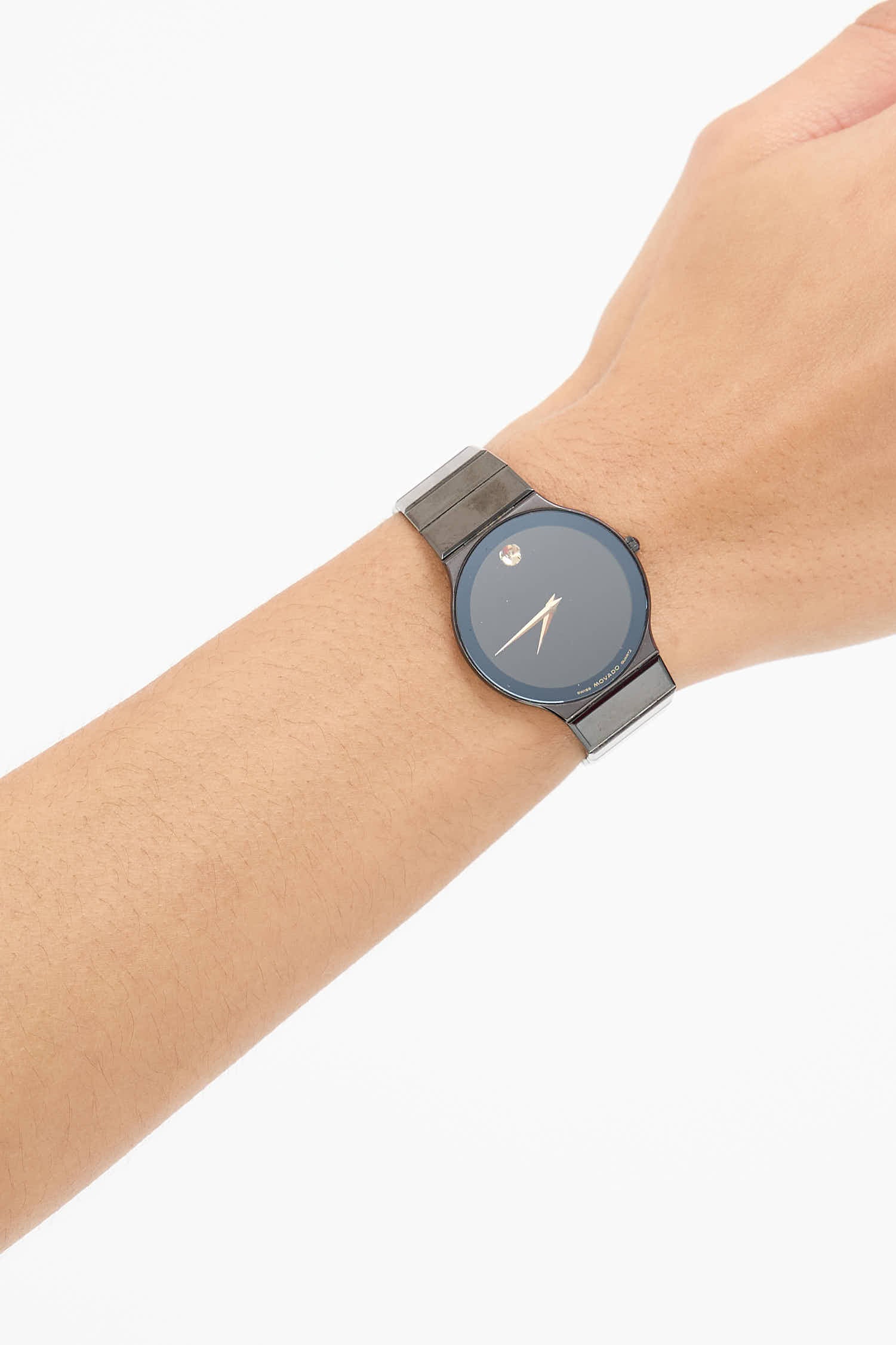 Pre-owned Movado black Museum Classic ultra thin watch featuring a black metal hinged panel band, black ceramic face with gold tone hands in a faceted Dauphine style, borderless sapphire crystal marker, and stainless steel case.