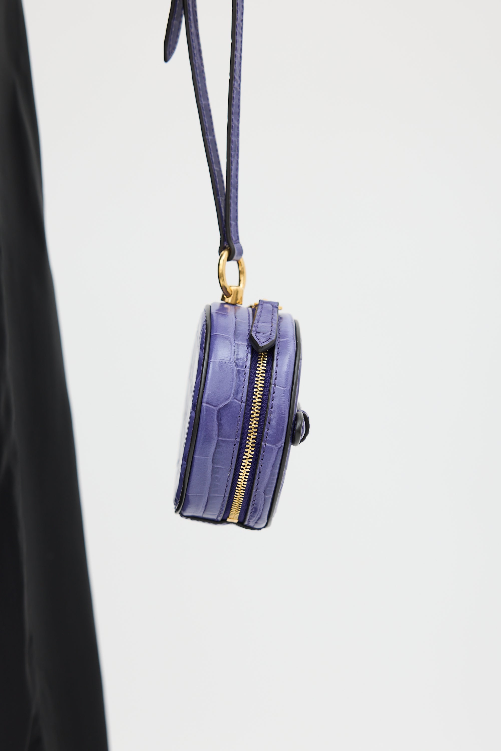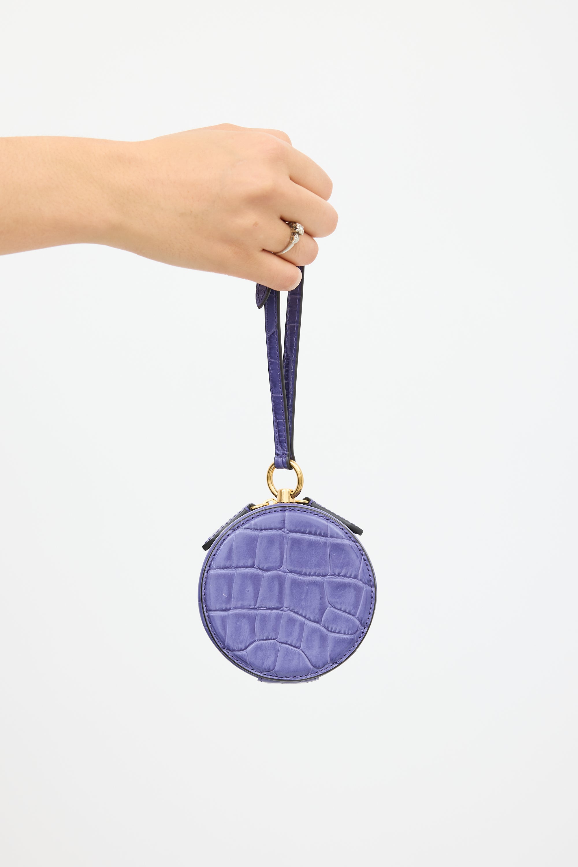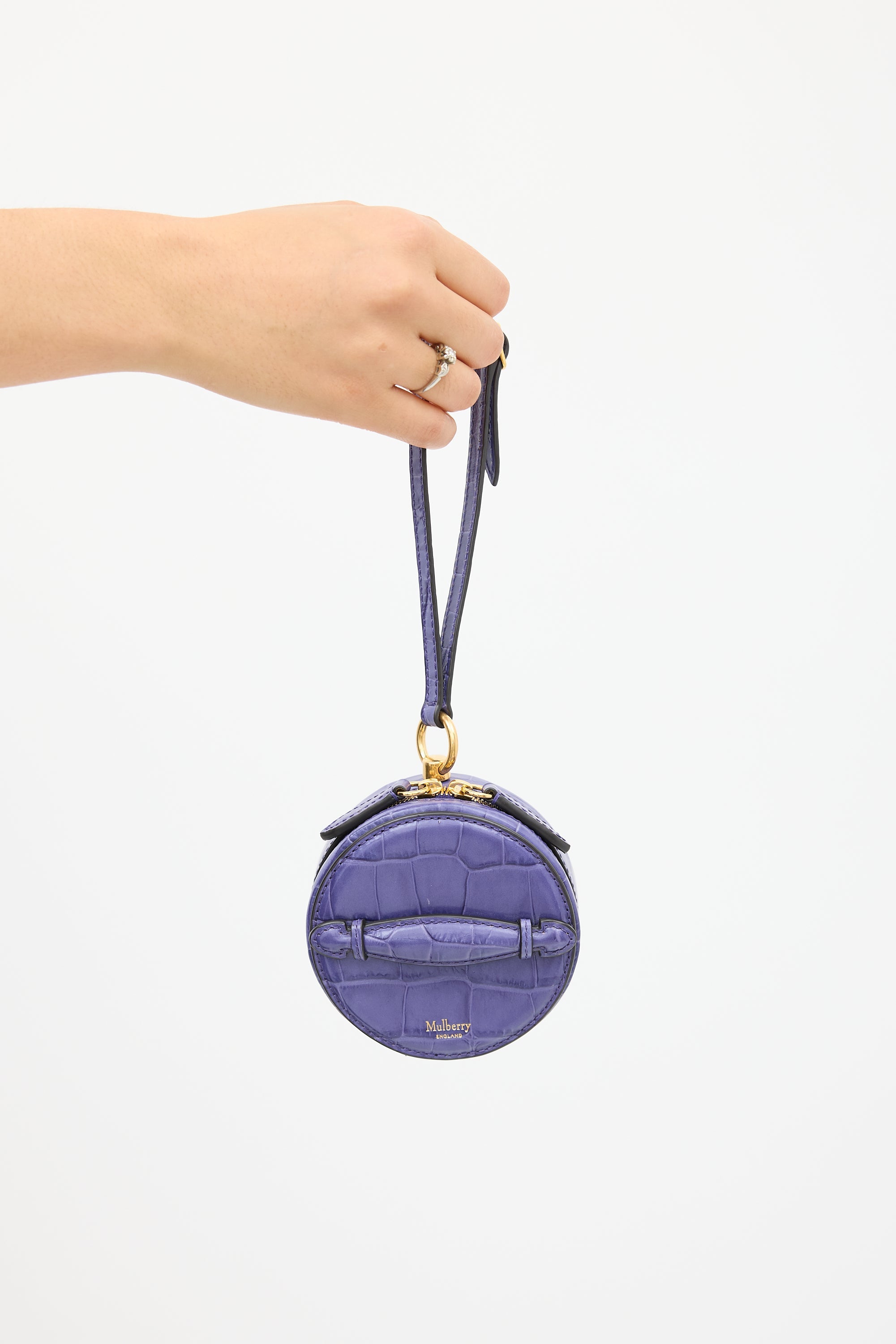 Pre-owned Mulberry purple embossed leather Mini Trunk Wristlet featuring tonal stitching, gold tone hardware, gold tone logo at front bottom edge, front handle design, adjustable wrist strap, dual zip around closure, and one main compartment. Comes with original dust bag.