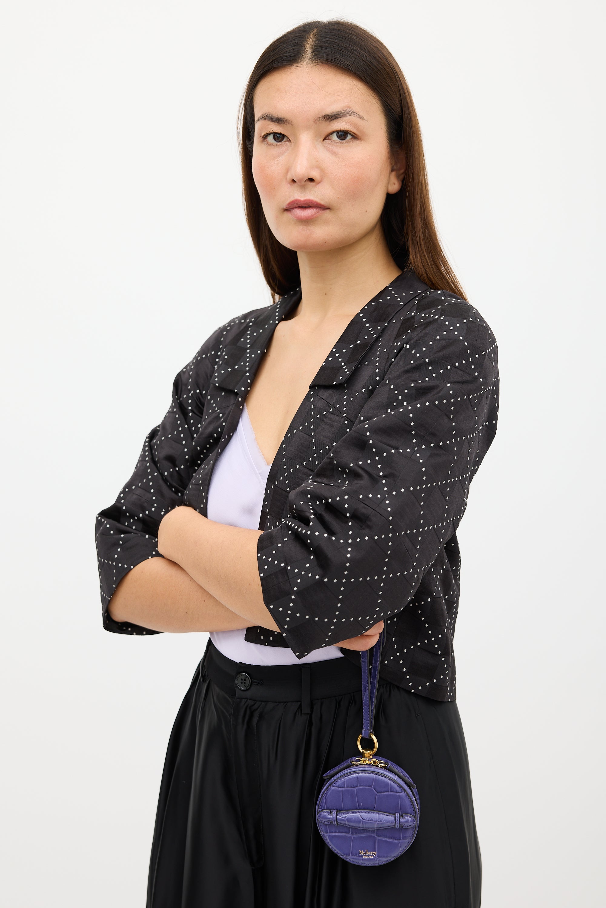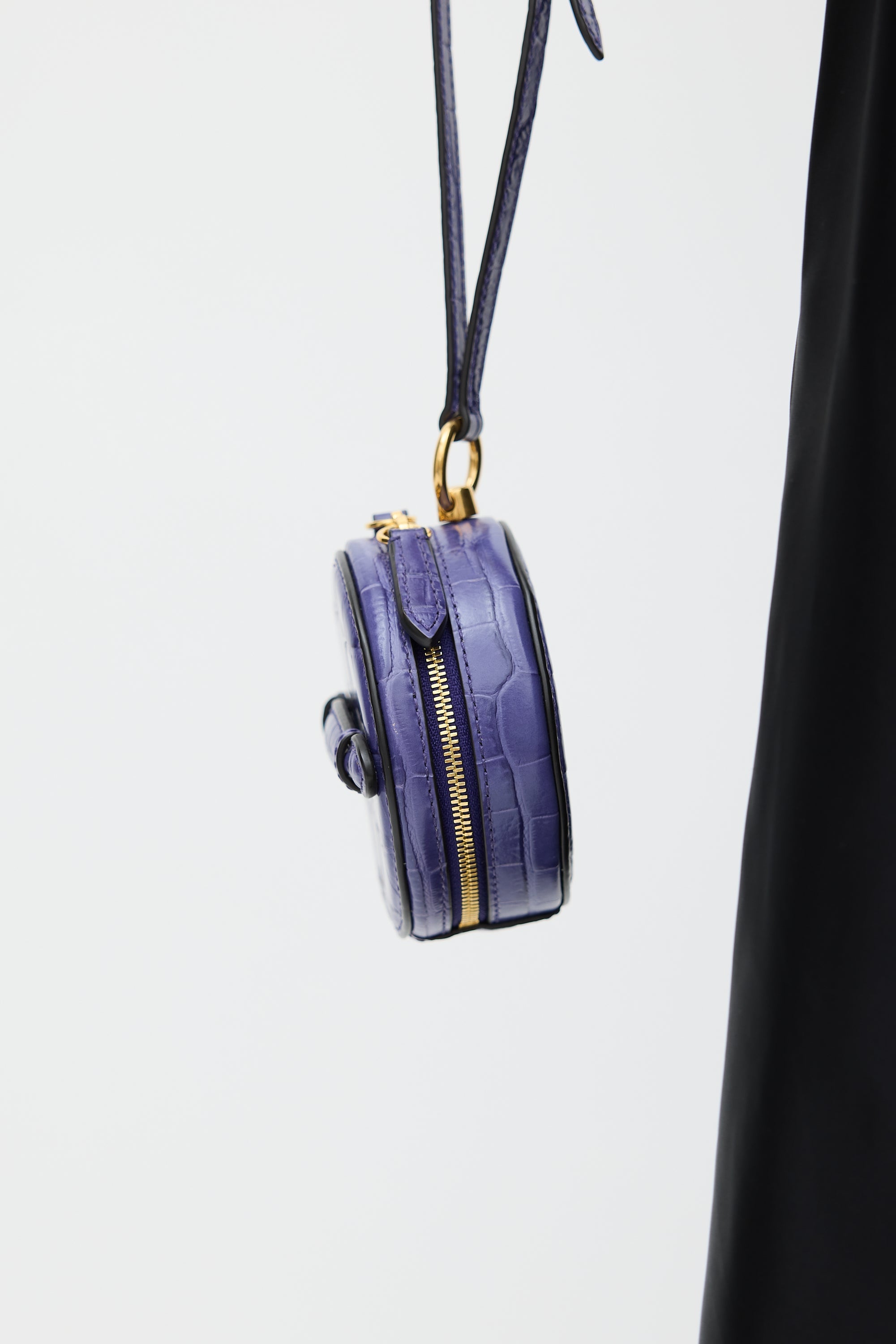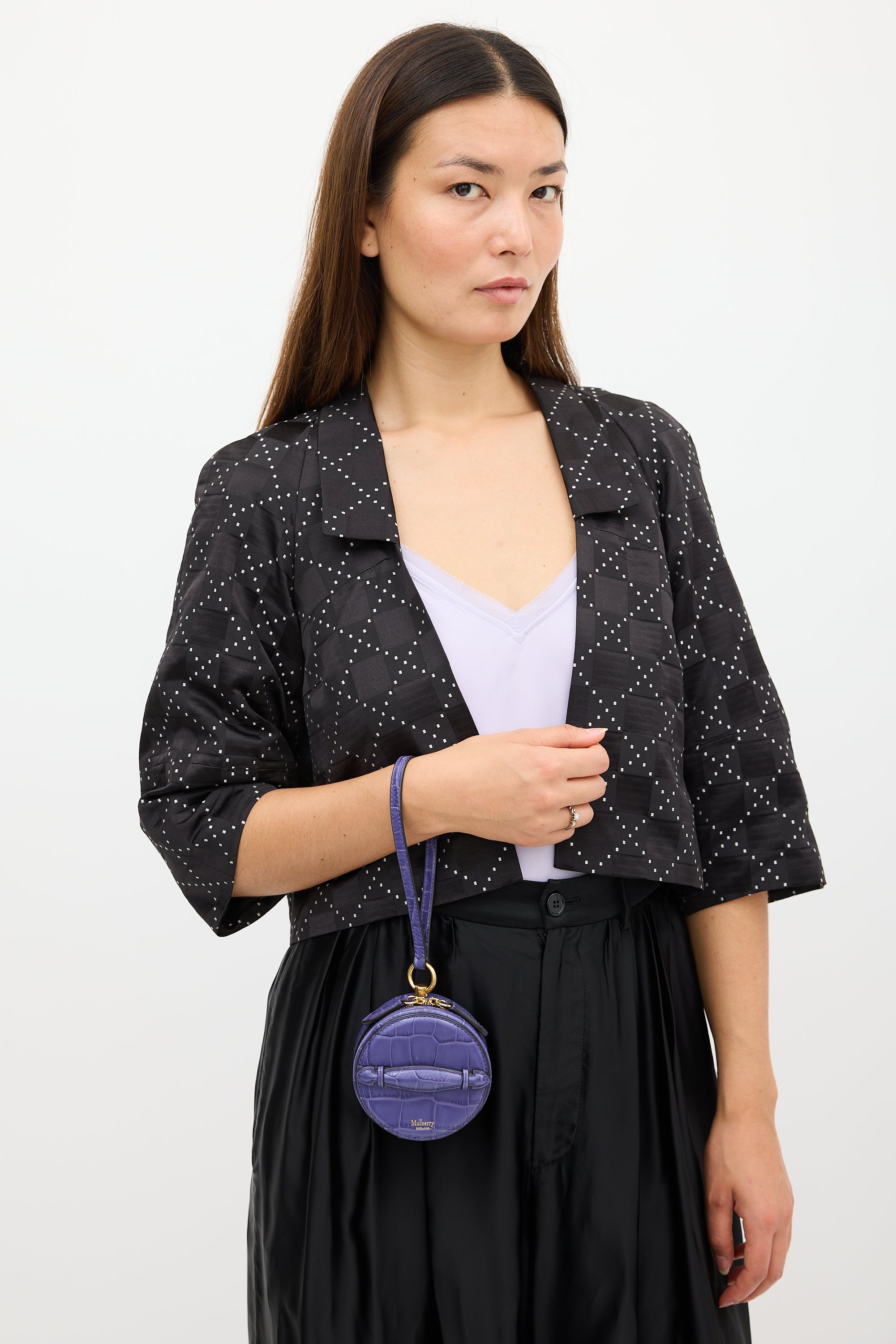 Pre-owned Mulberry purple embossed leather Mini Trunk Wristlet featuring tonal stitching, gold tone hardware, gold tone logo at front bottom edge, front handle design, adjustable wrist strap, dual zip around closure, and one main compartment. Comes with original dust bag.