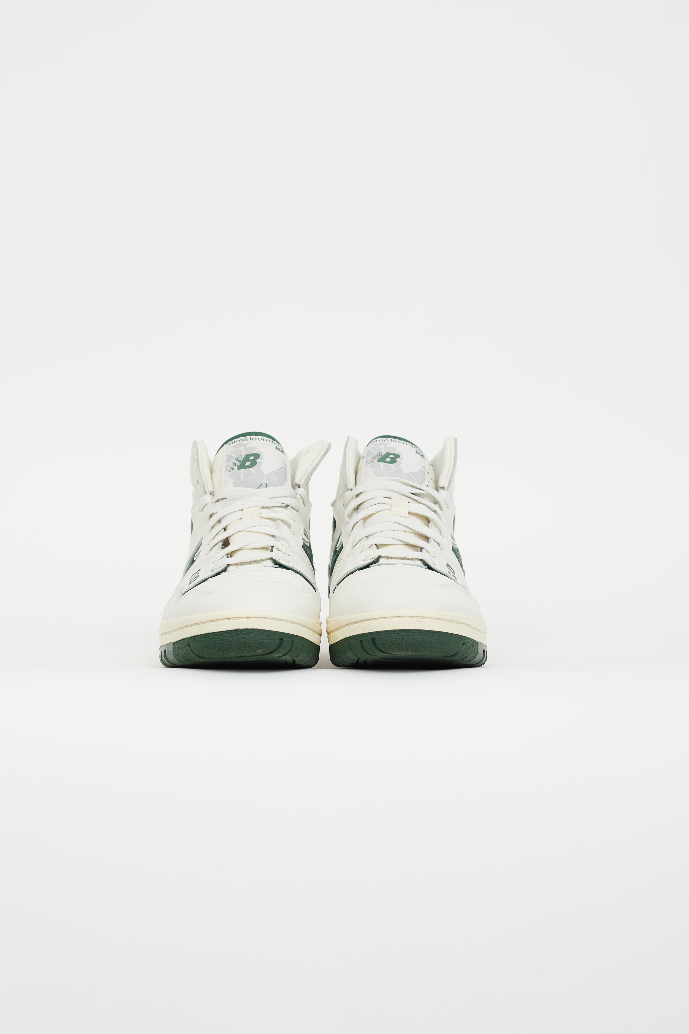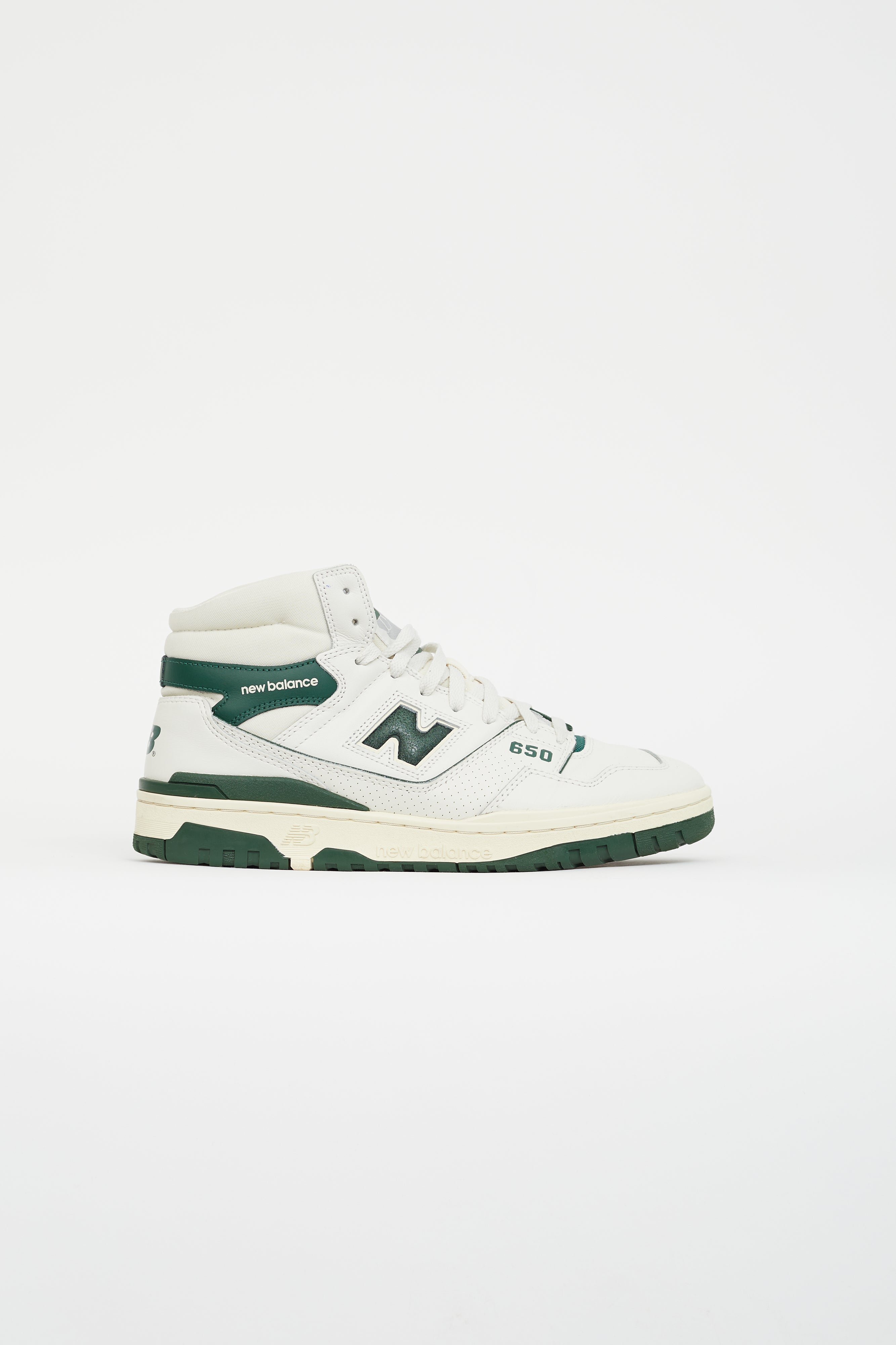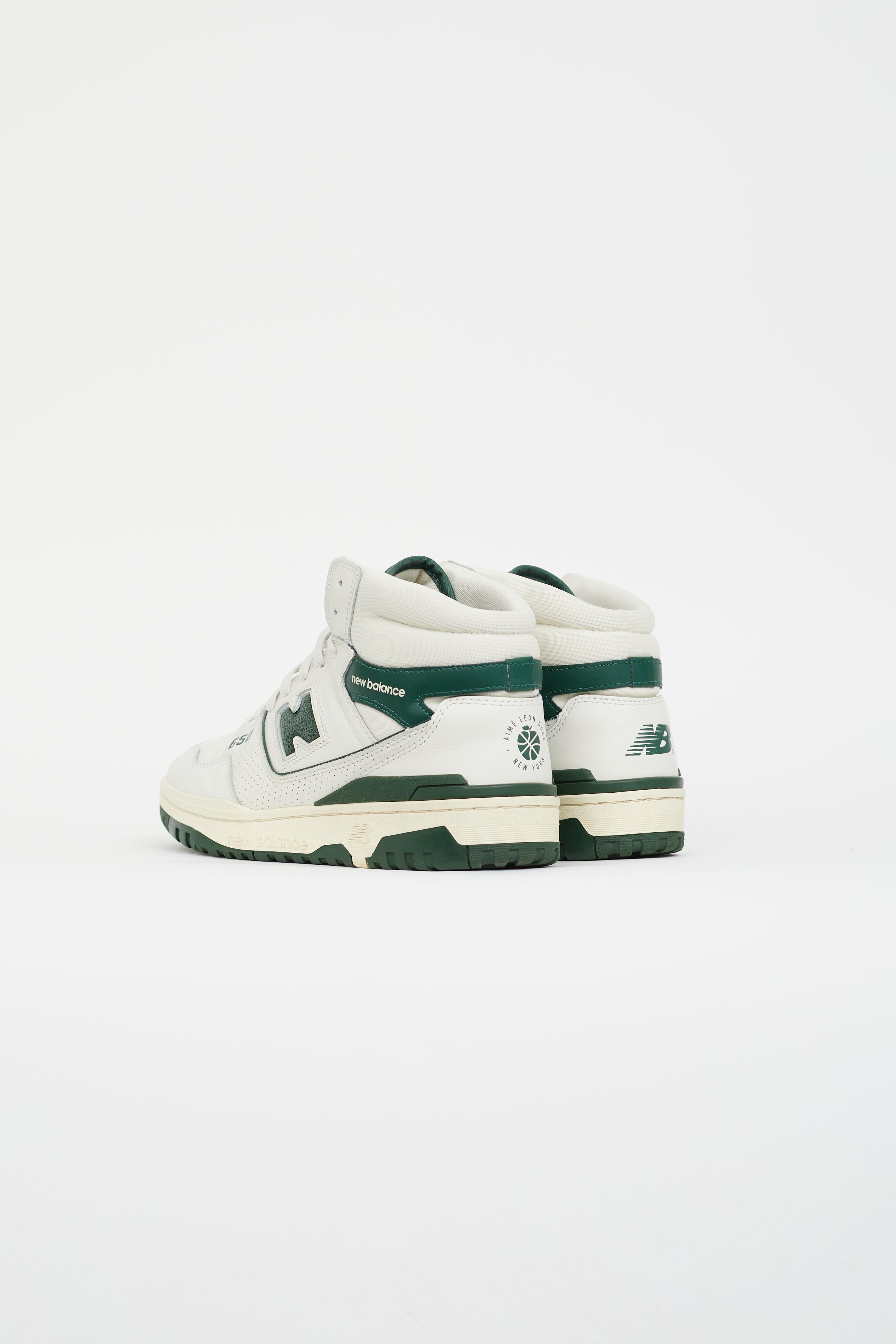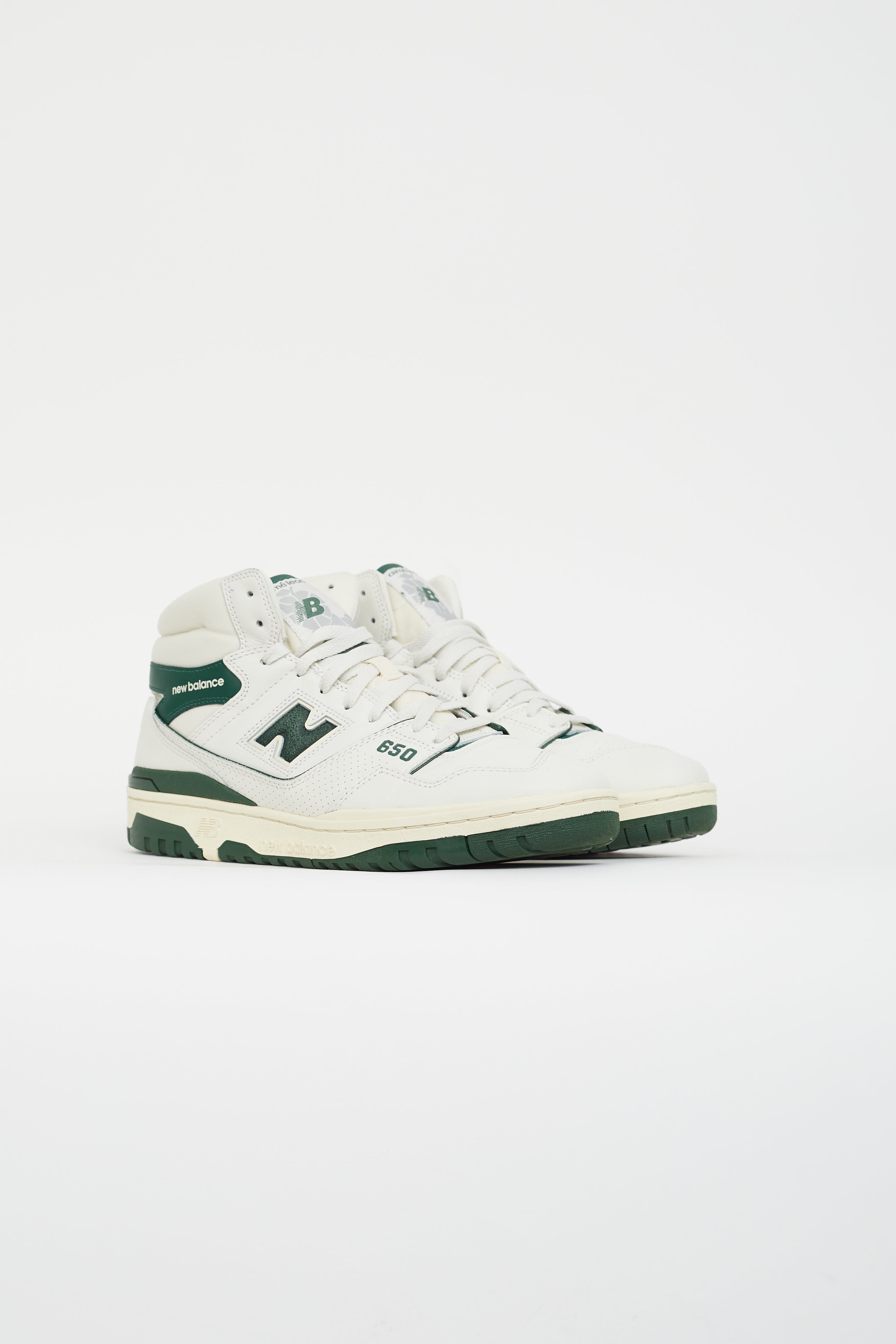 Pre-owned New Balance X Aimé Leon Dore Green & White Leather 650 sneaker featuring a white leather base with dark green details, white lace up vamp, padded ankle, rounded toe and a mid height ankle. Comes with original box and extra set of green laces.
