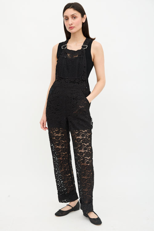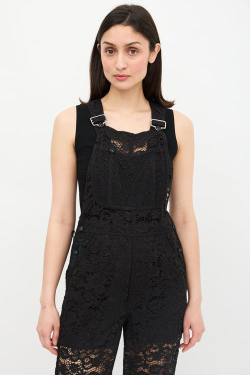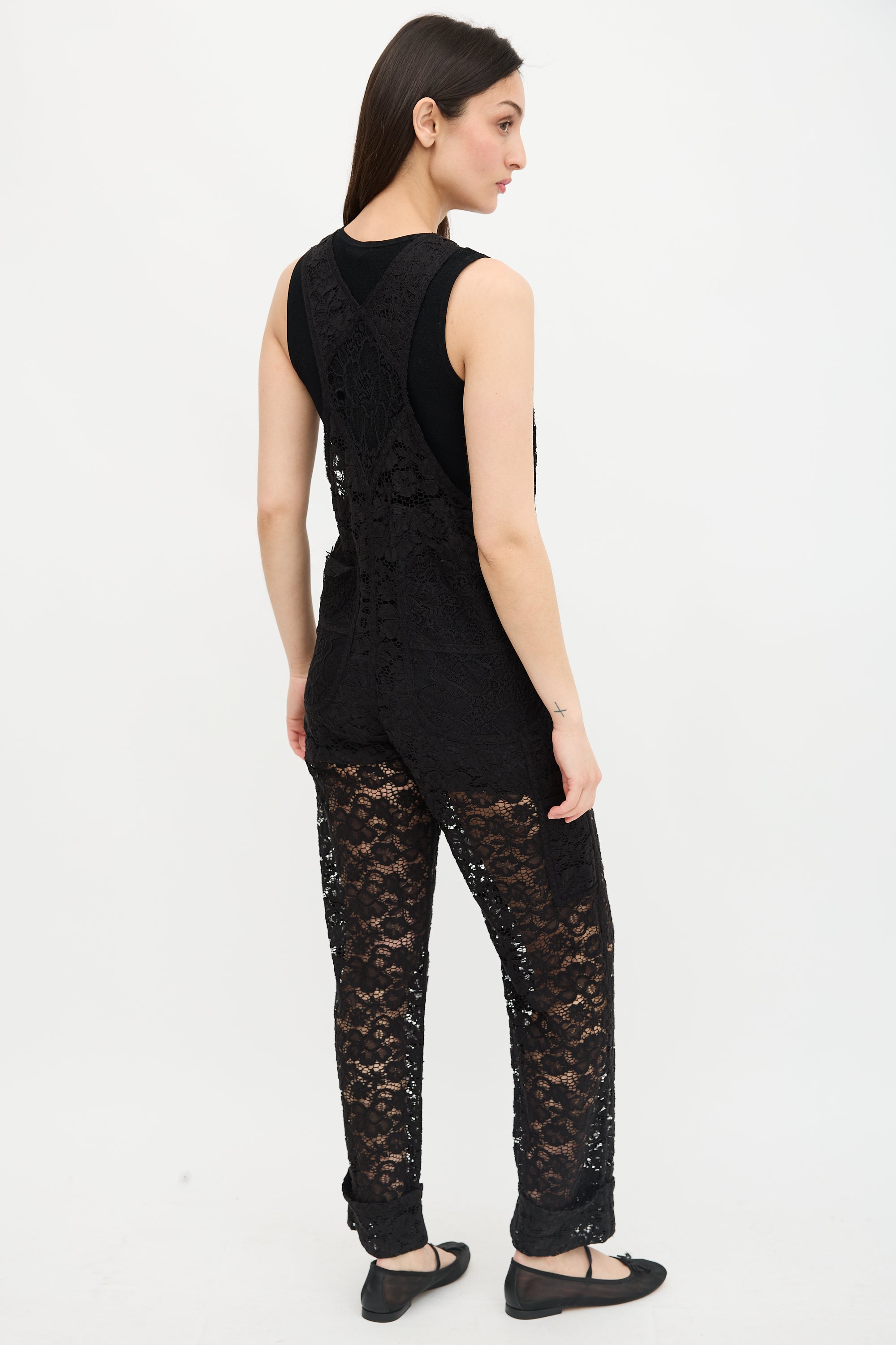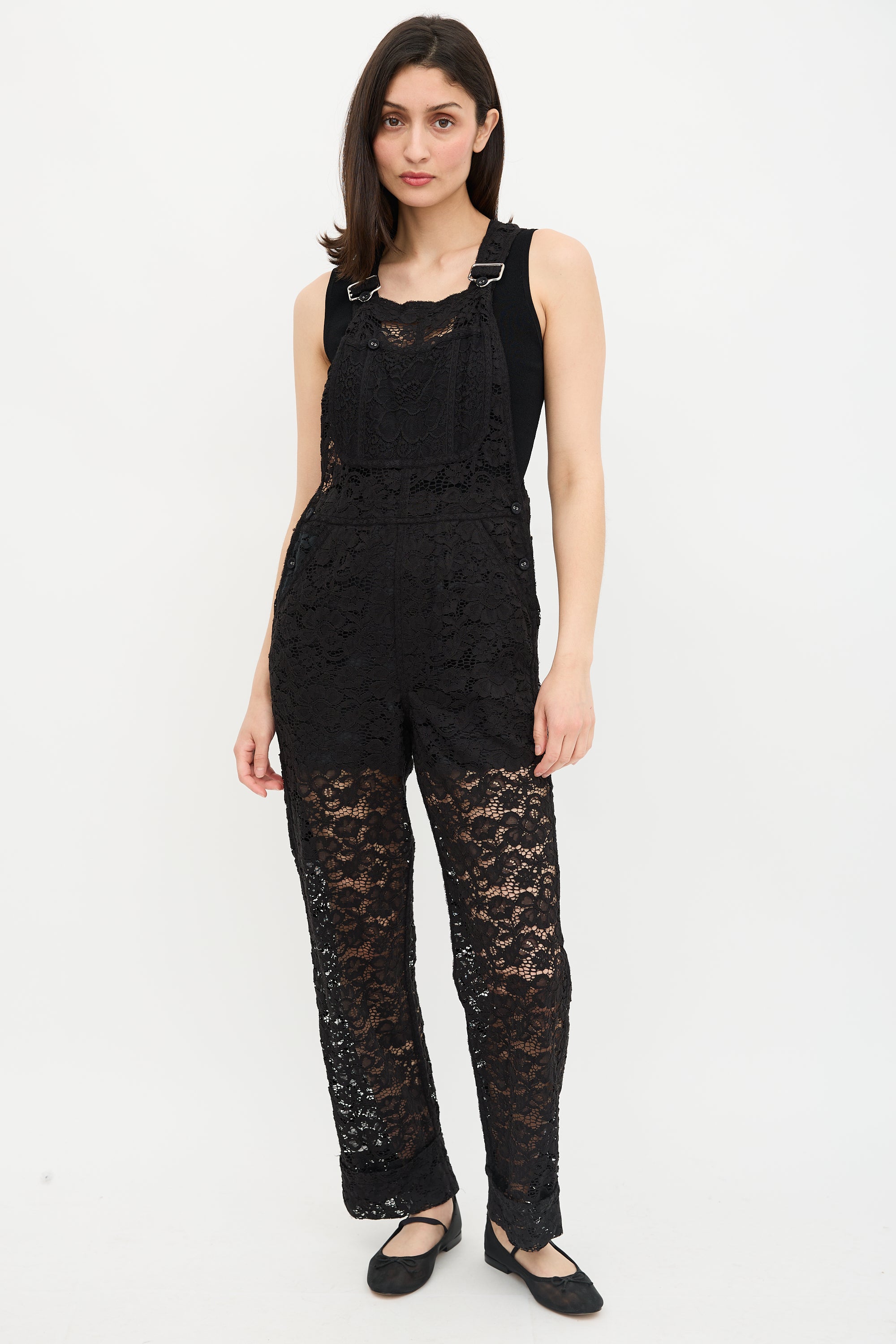 Pre-owned Nina Ricci black lace overalls featuring adjustable shoulder straps, four pocket styling, side button closure, straight leg, and cuffed hem. Partially lined.