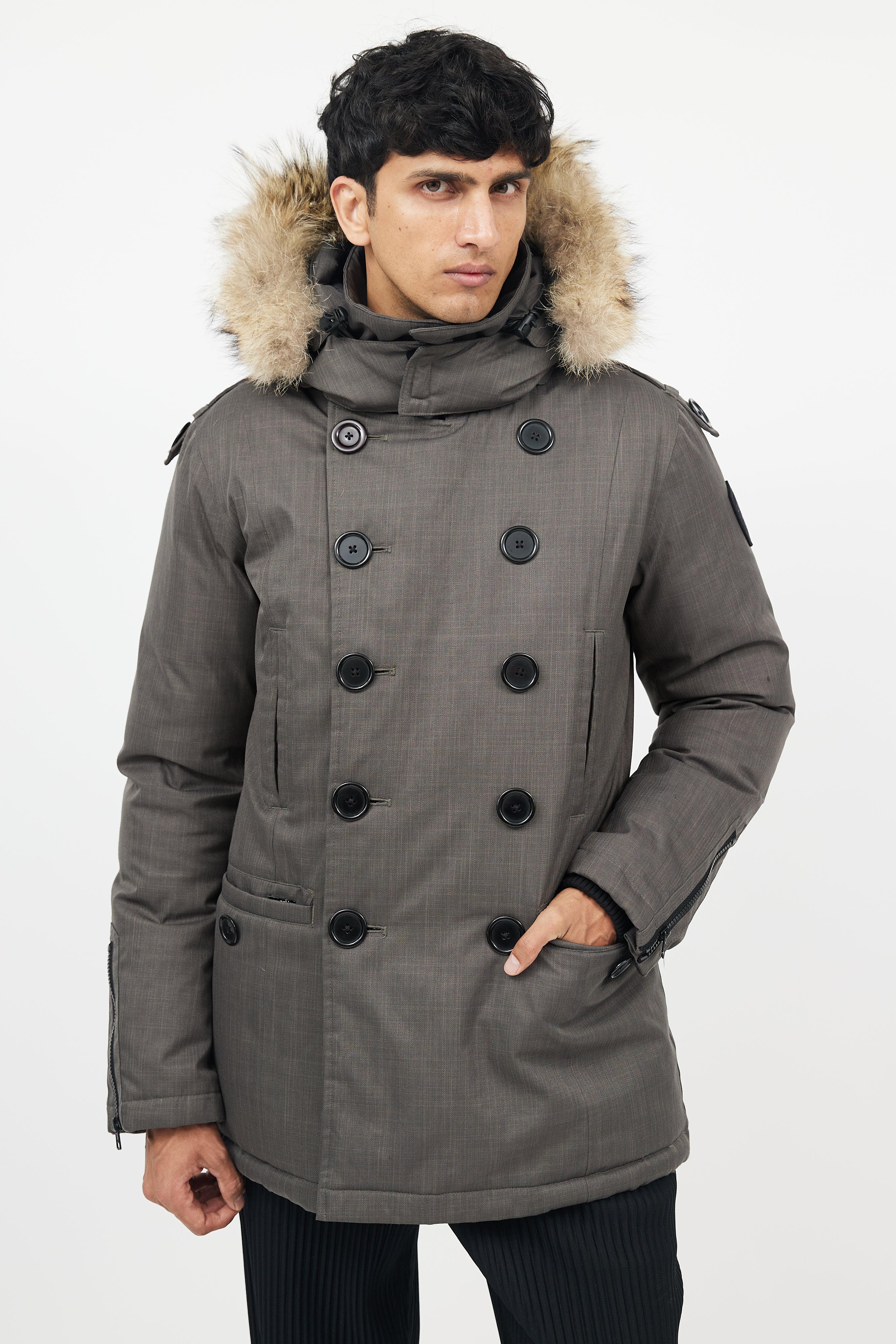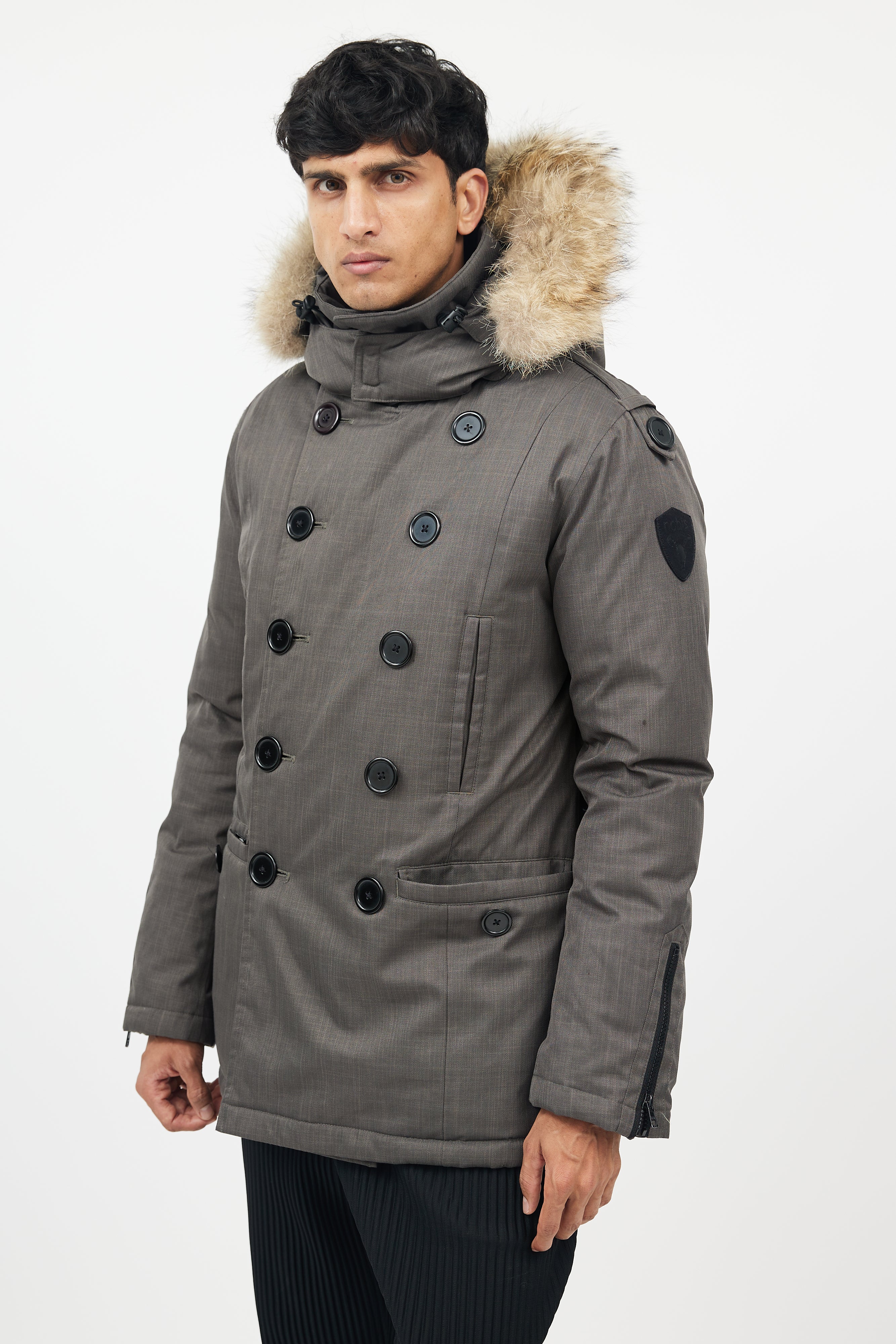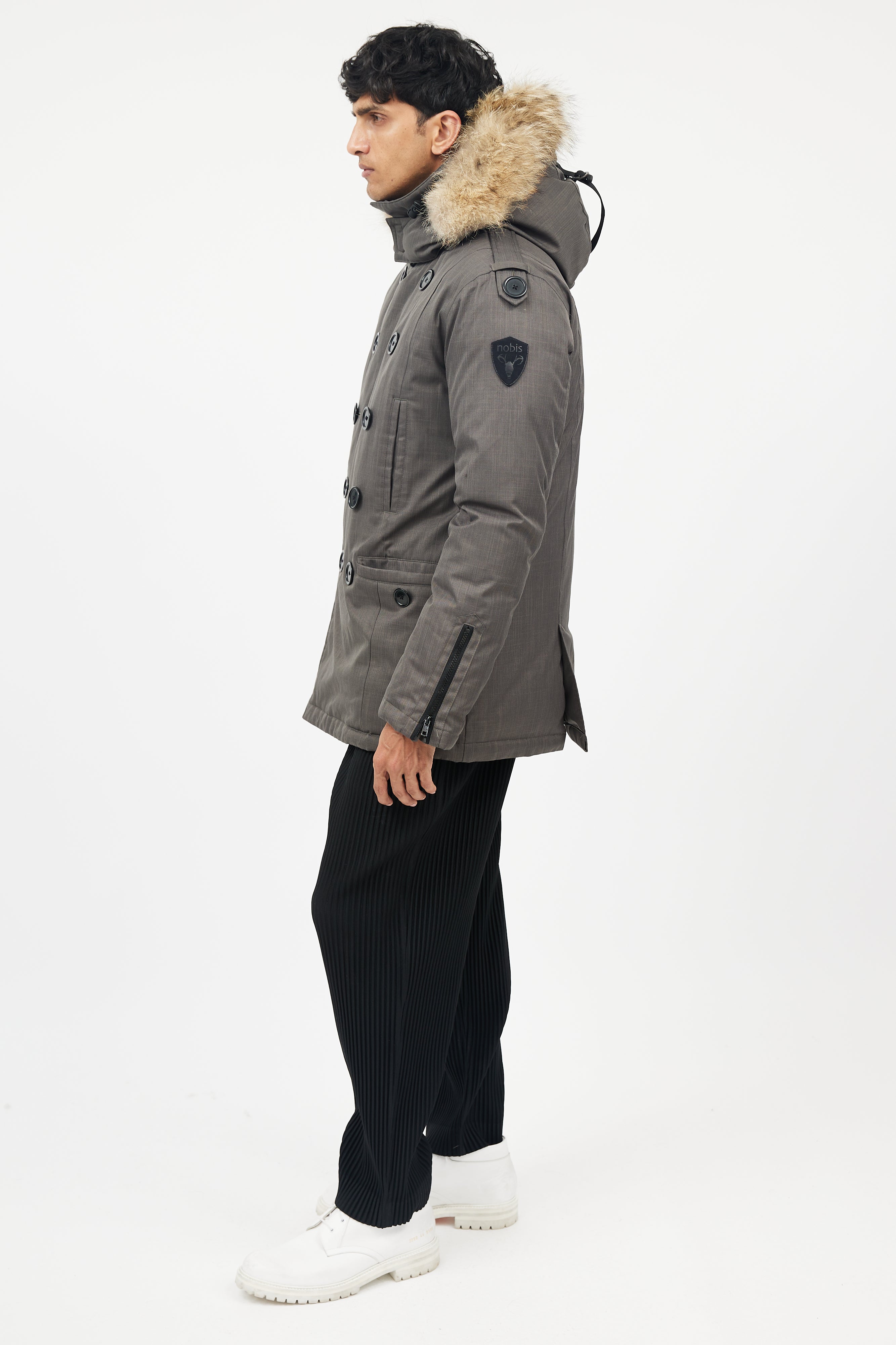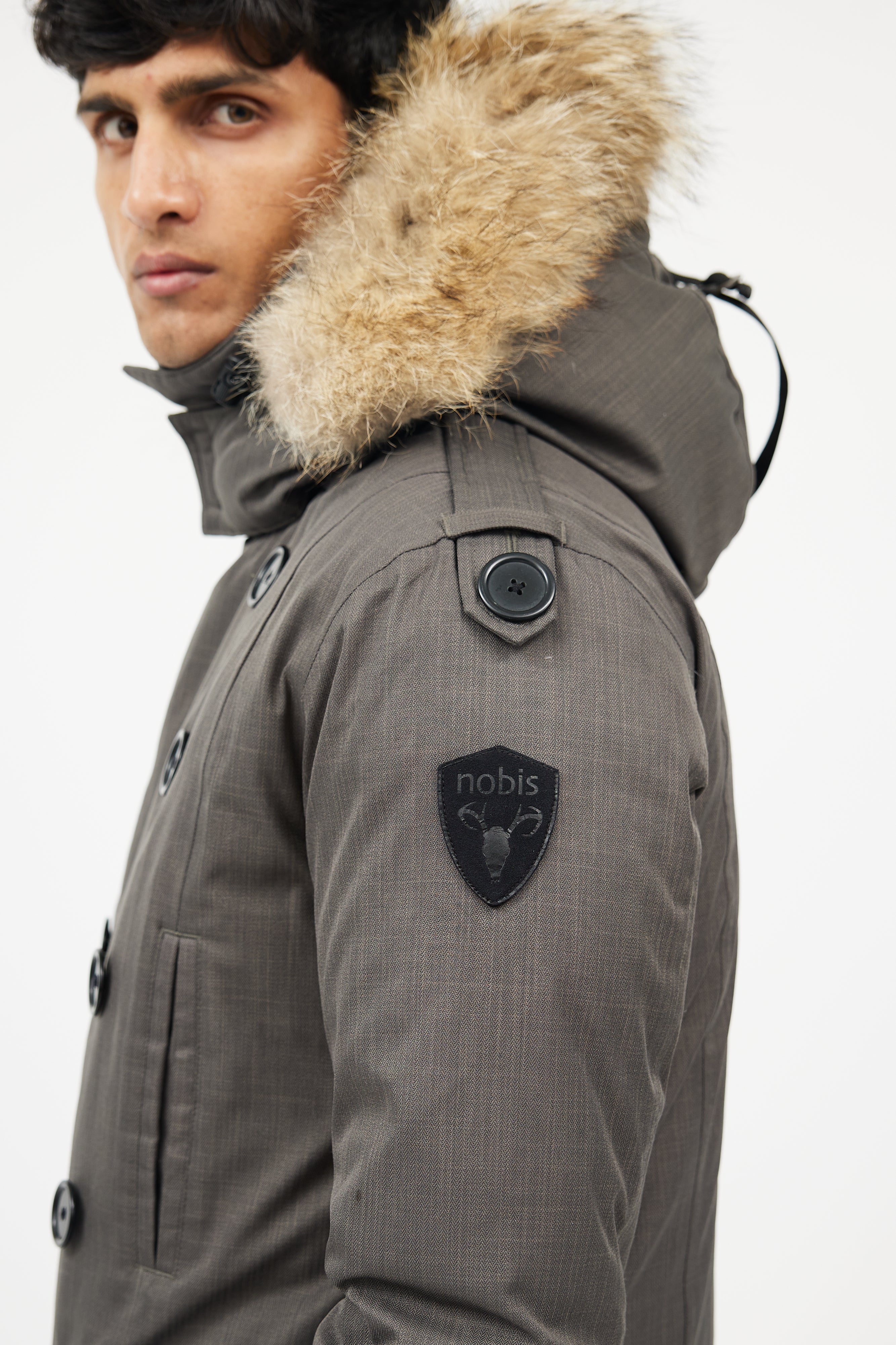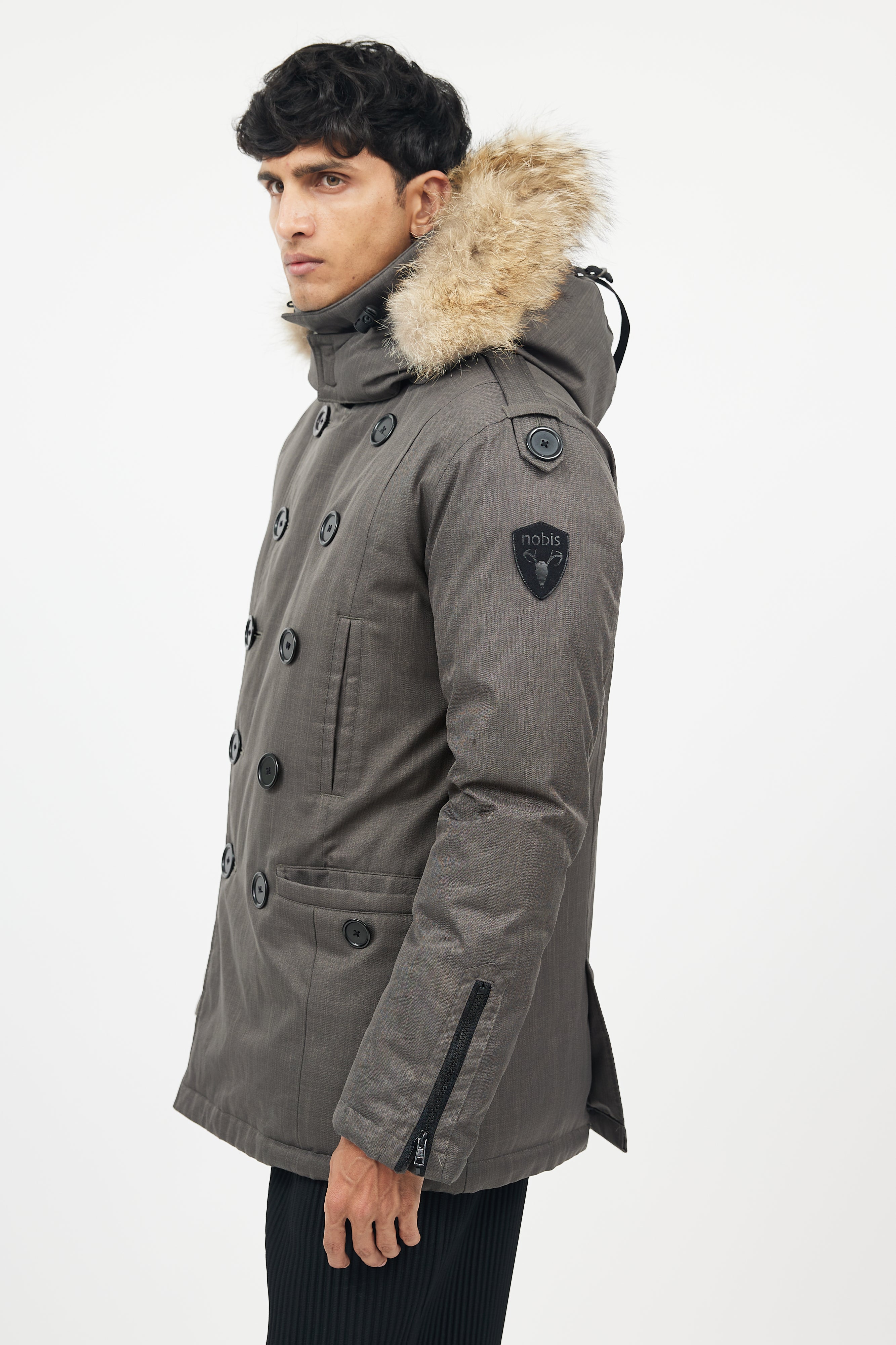 Pre-owned Nobis green down coat featuring detachable fur hood, zip up front with double breasted buttons, four pockets at front, and zipped cuffs.