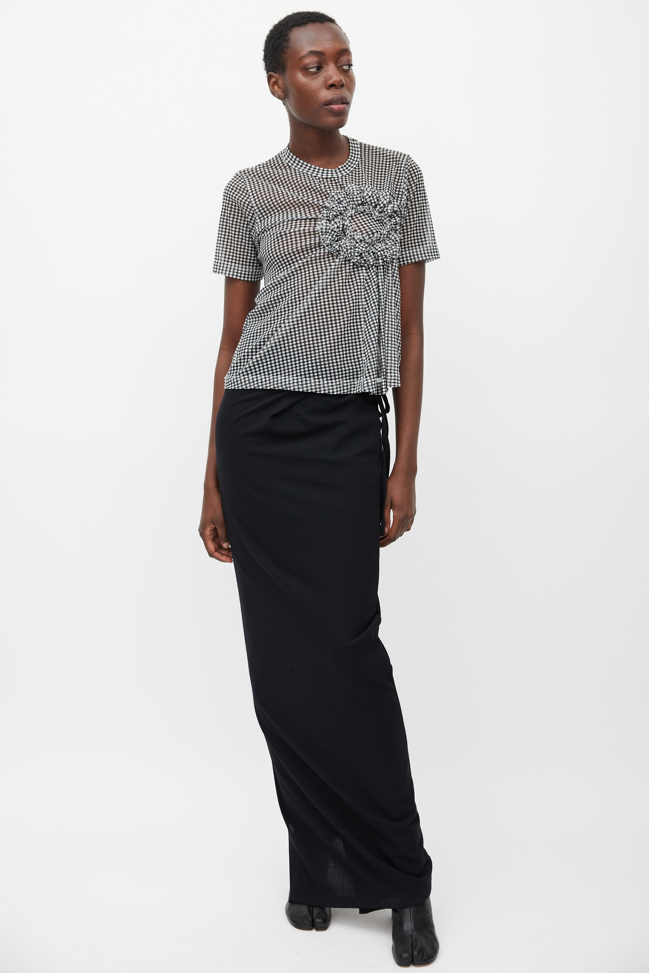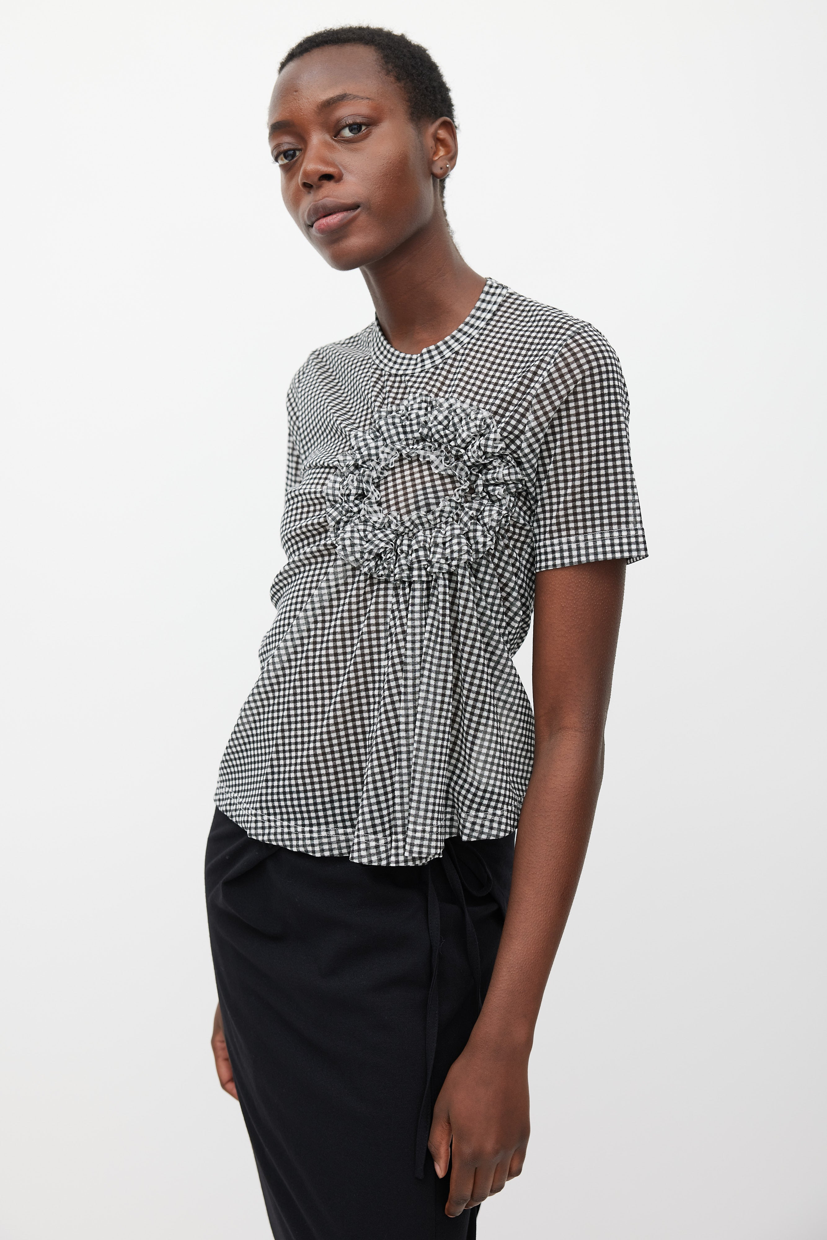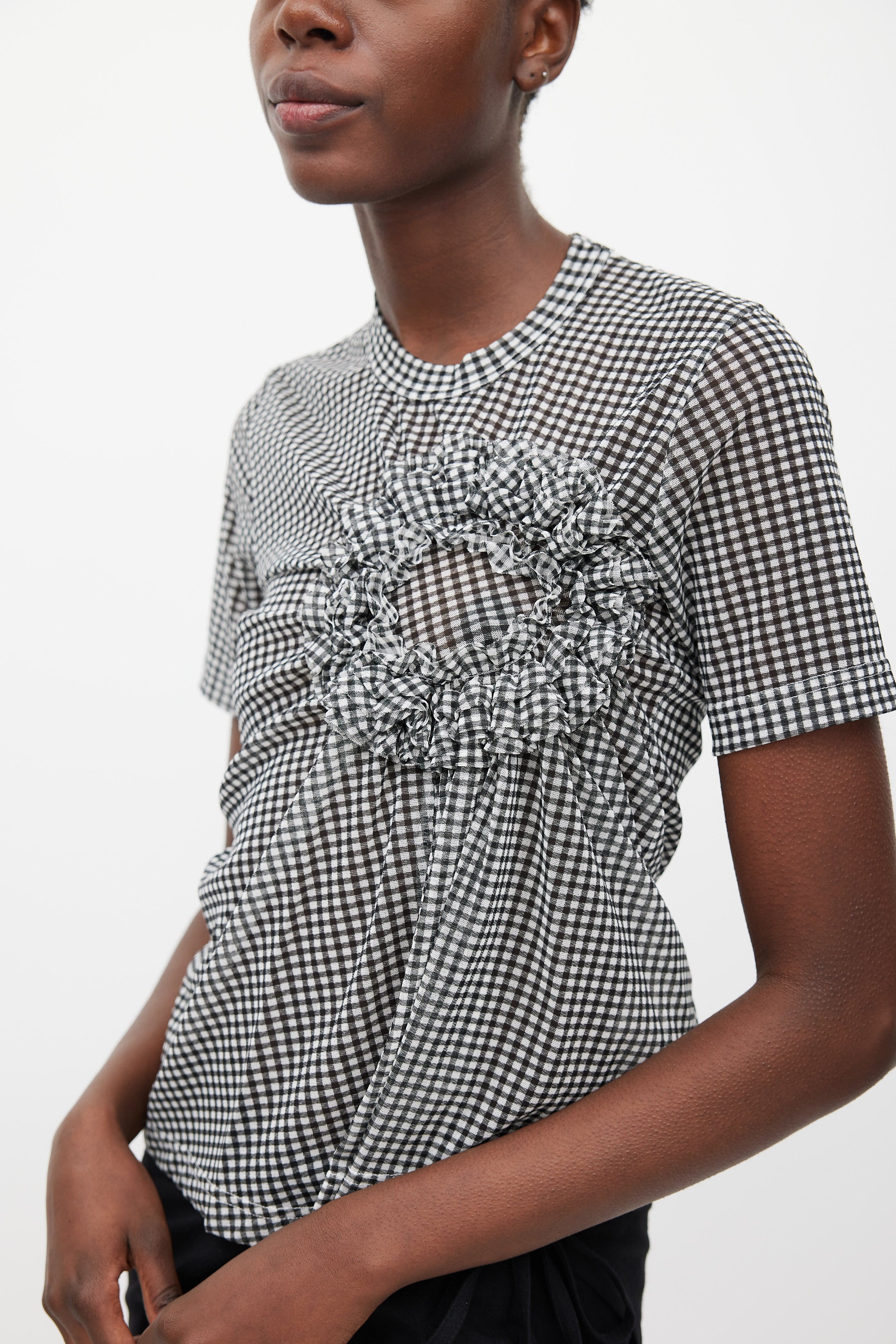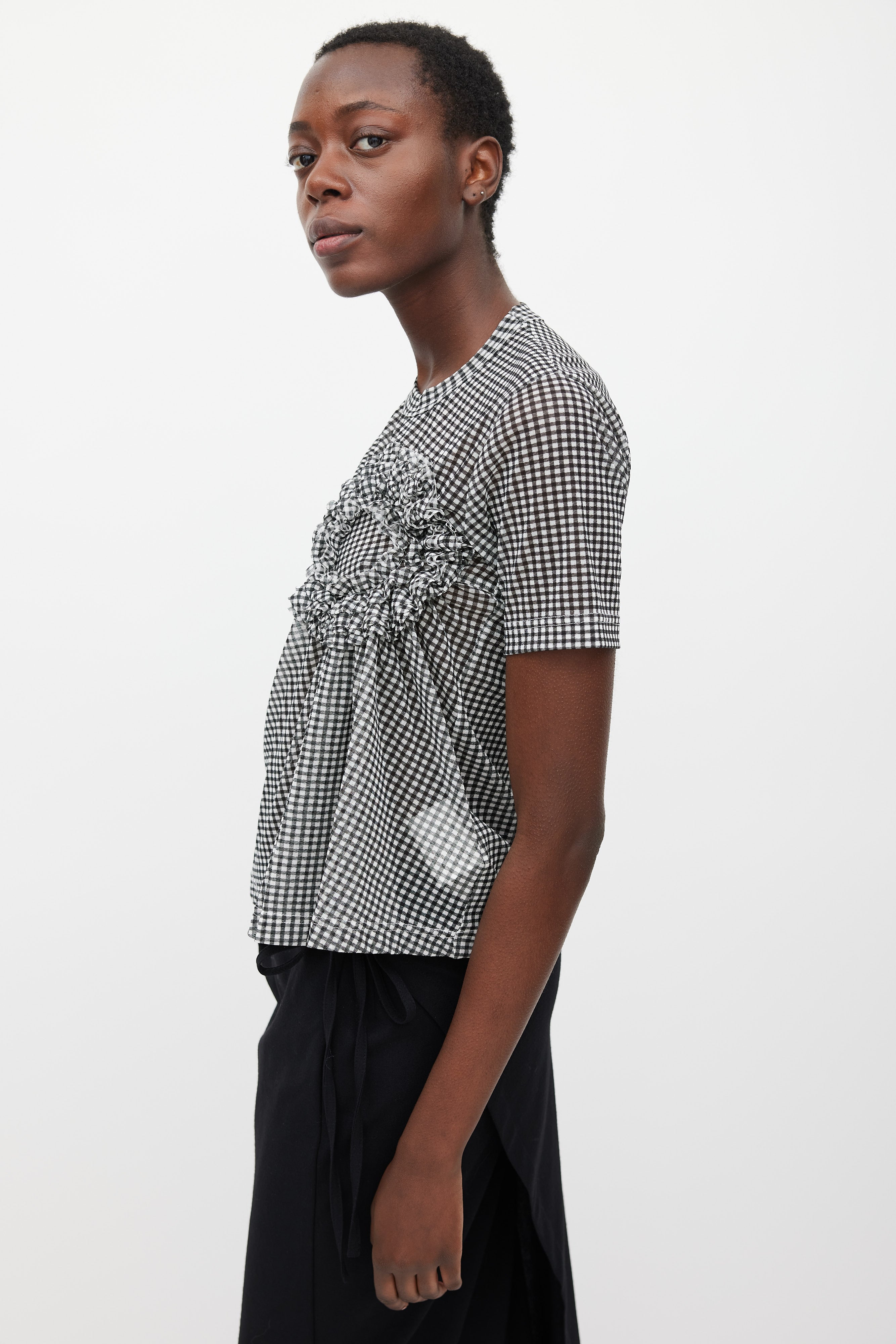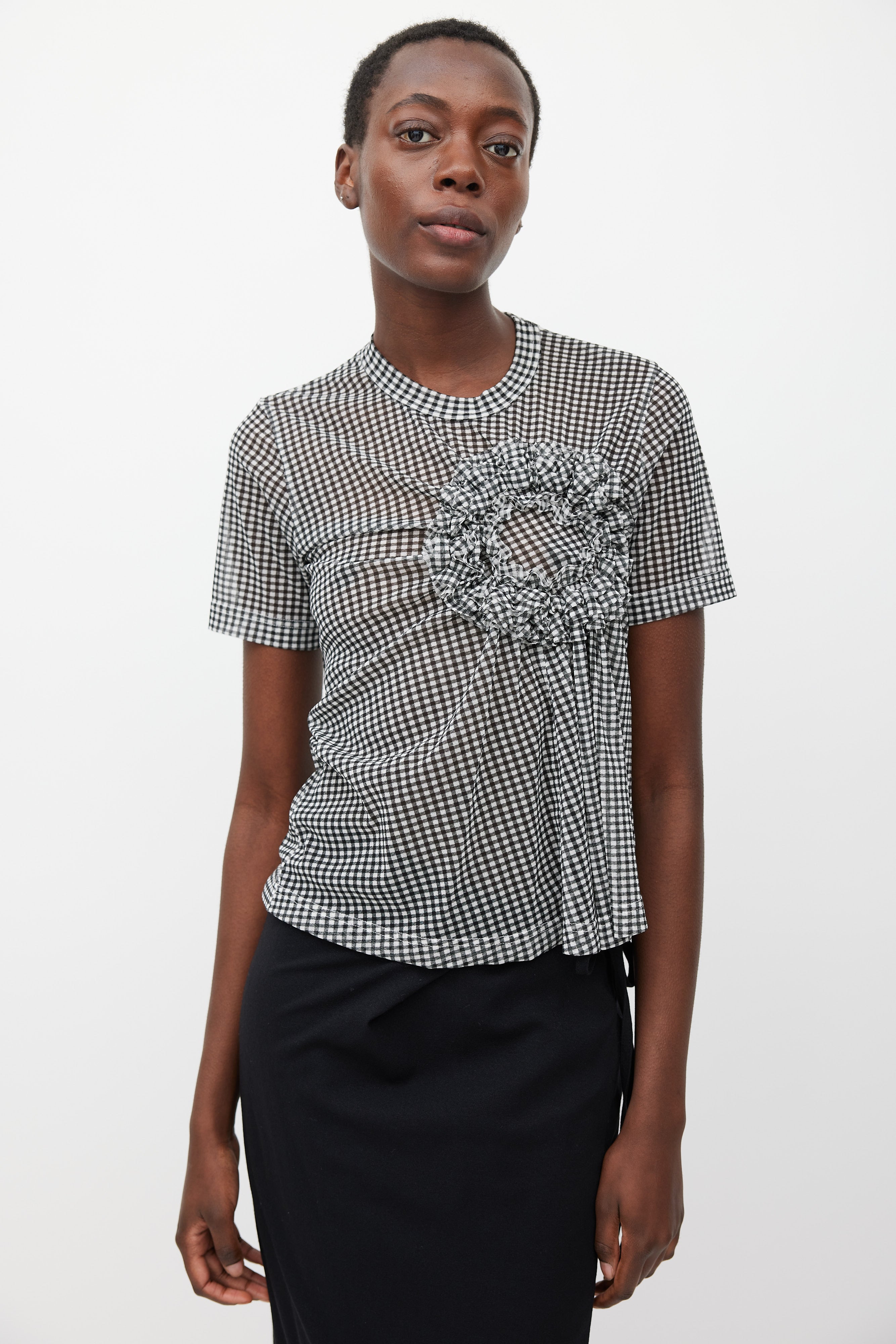 Noir Kei Ninomiya FW 2022 black and white mesh top featuring checked print, crew neckline, and circle ruffle detail at chest.