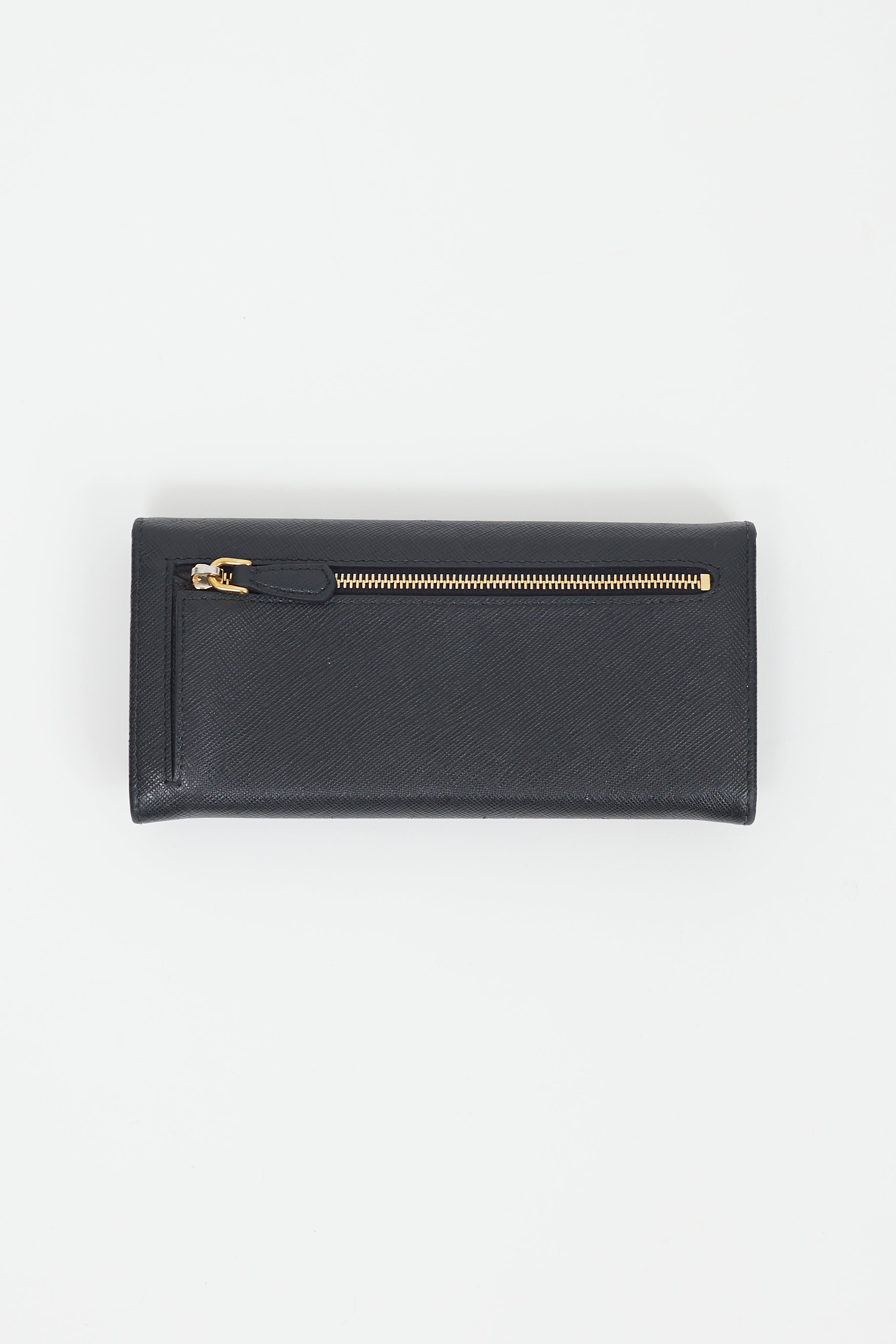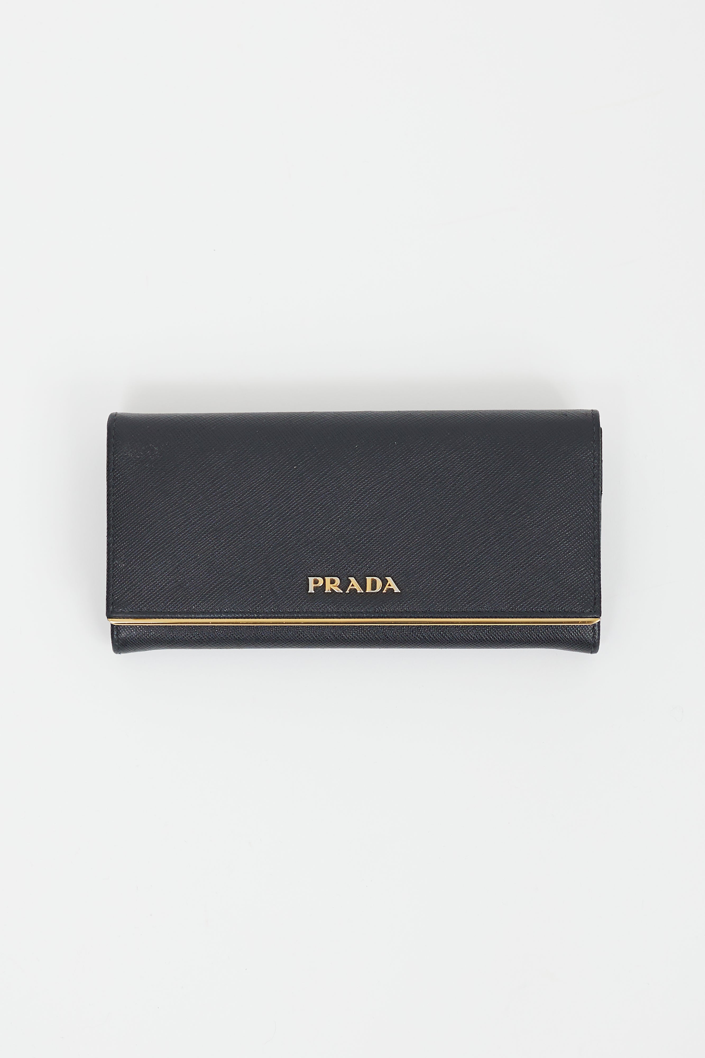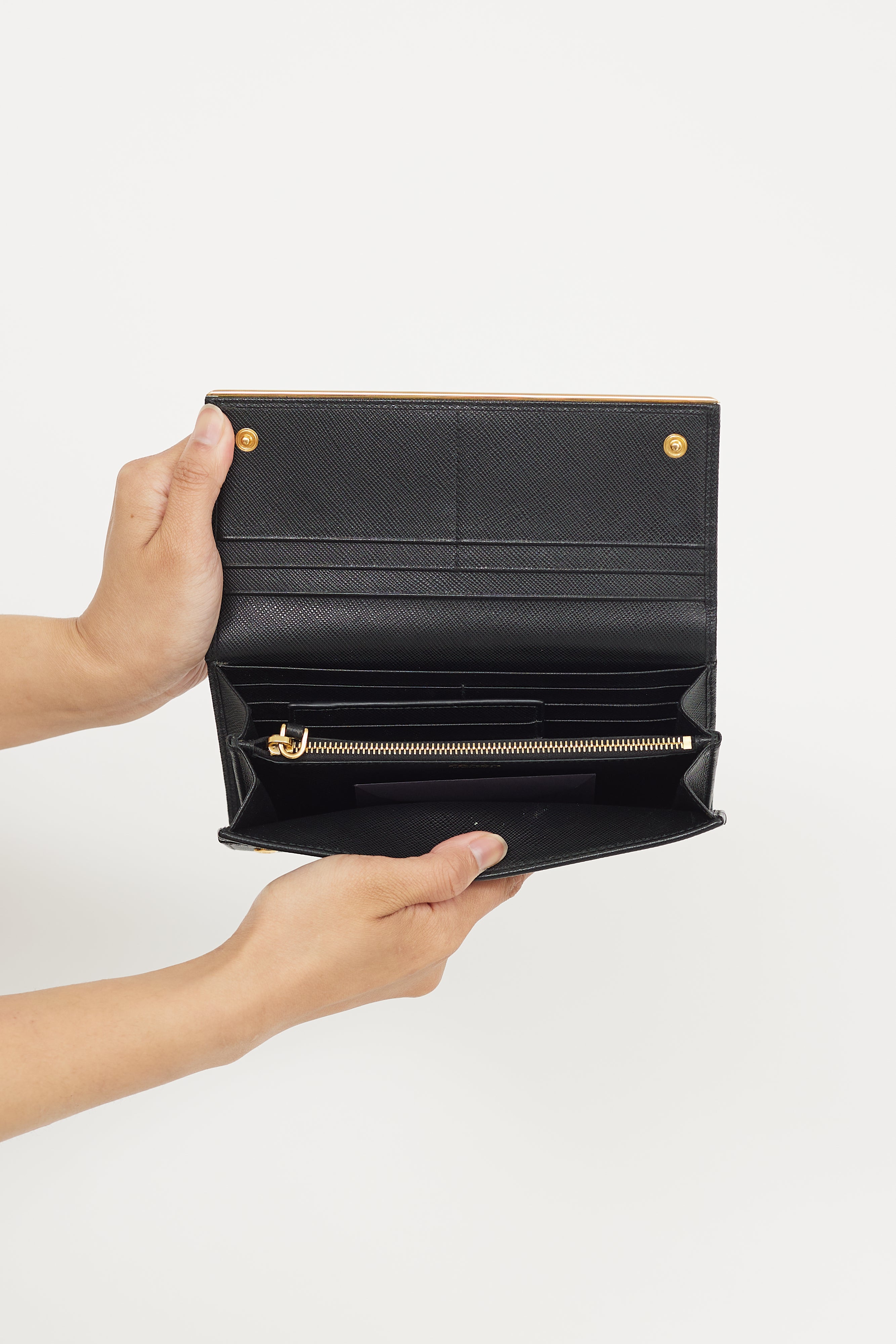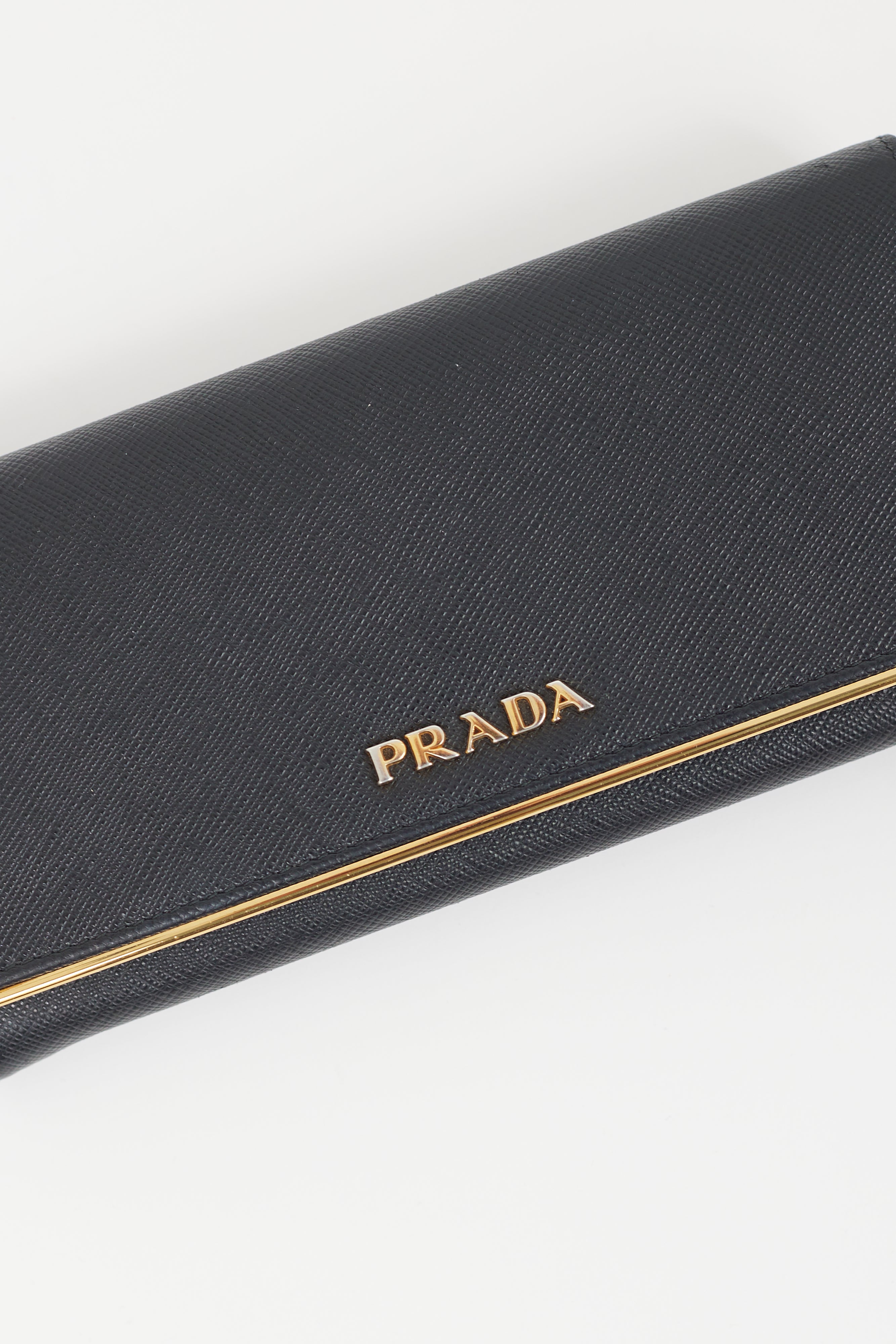Pre-owned Prada black Saffiano leather wallet featuring gold tone hardware, back zip pocket, front flap with hardware logo and metal trim, snap fastenings, one note slot and four card slots at underside of flap, two front slip pockets, two main compartments with zippered divider, single note slot, and six card slots, and leather tab on chain with two slip pockets and single window.