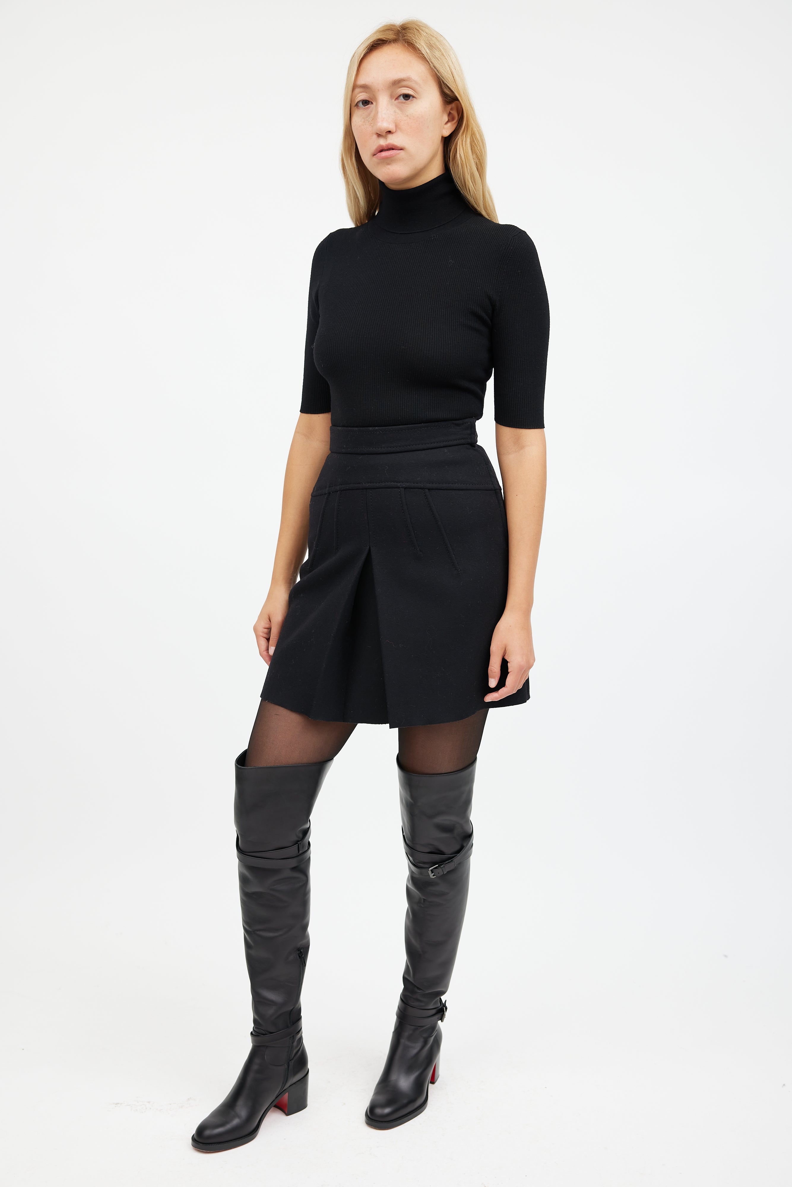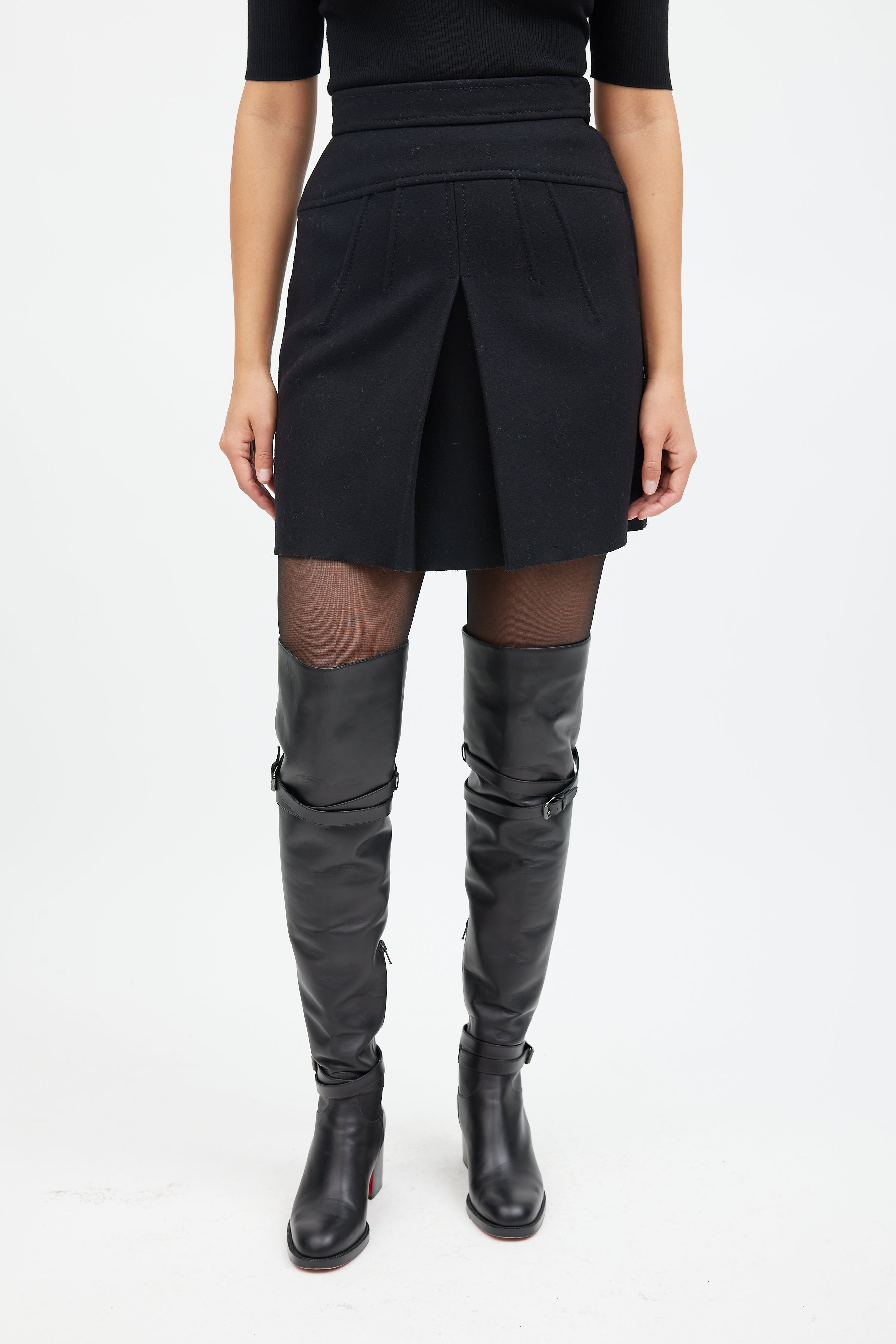 Pre-owned Prada black wool mini skirt featuring pleated detailing, slit at hem, and zip at side with snap closure.
