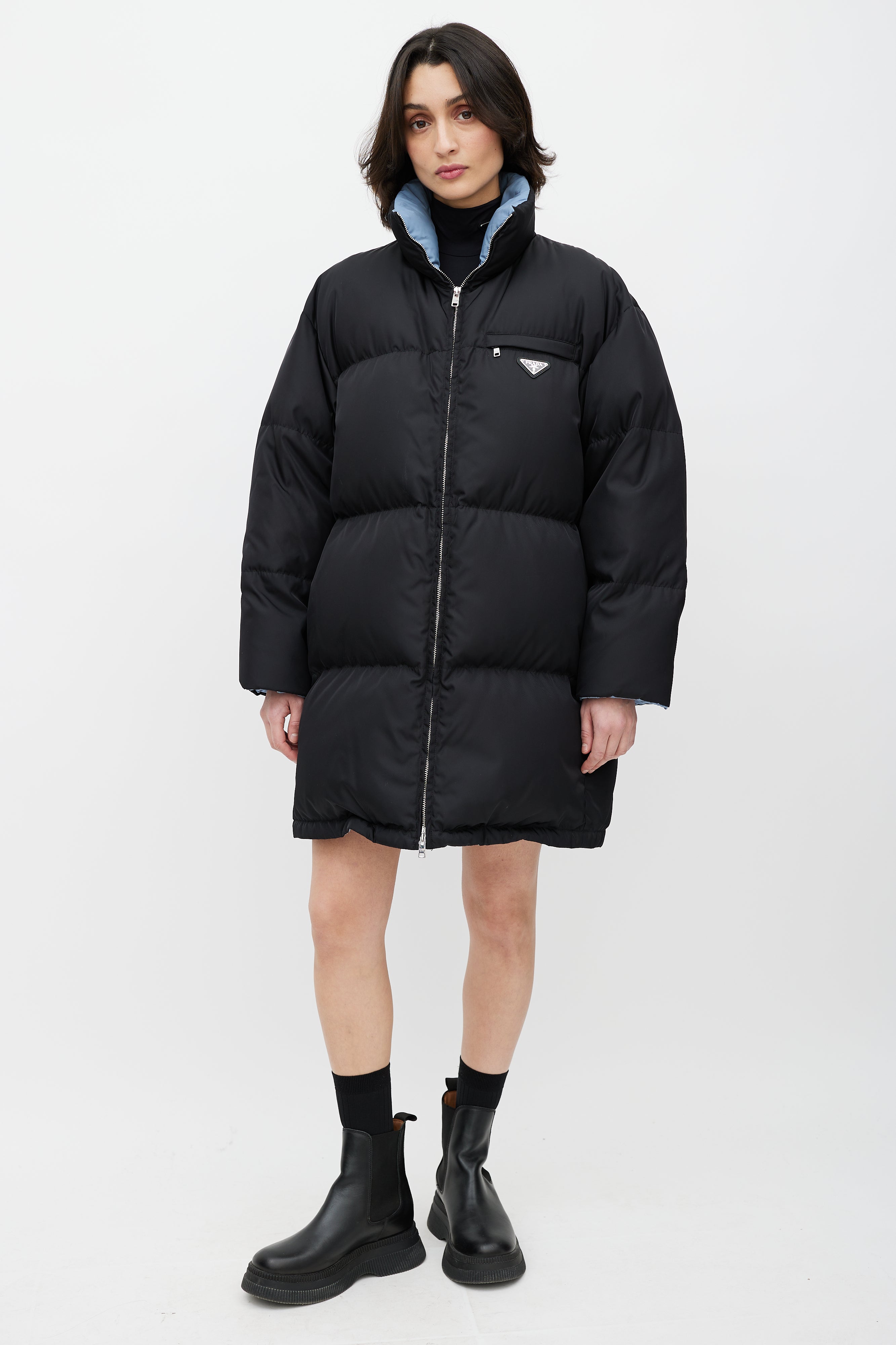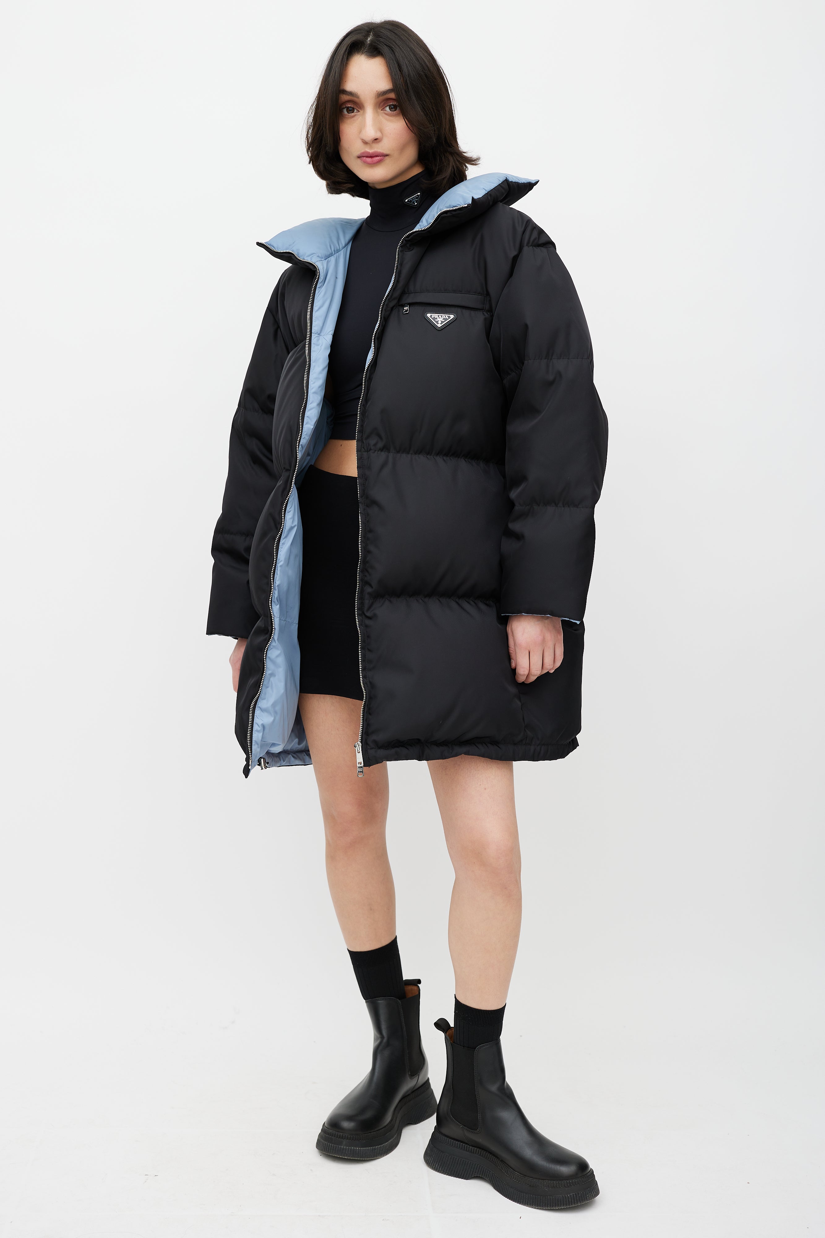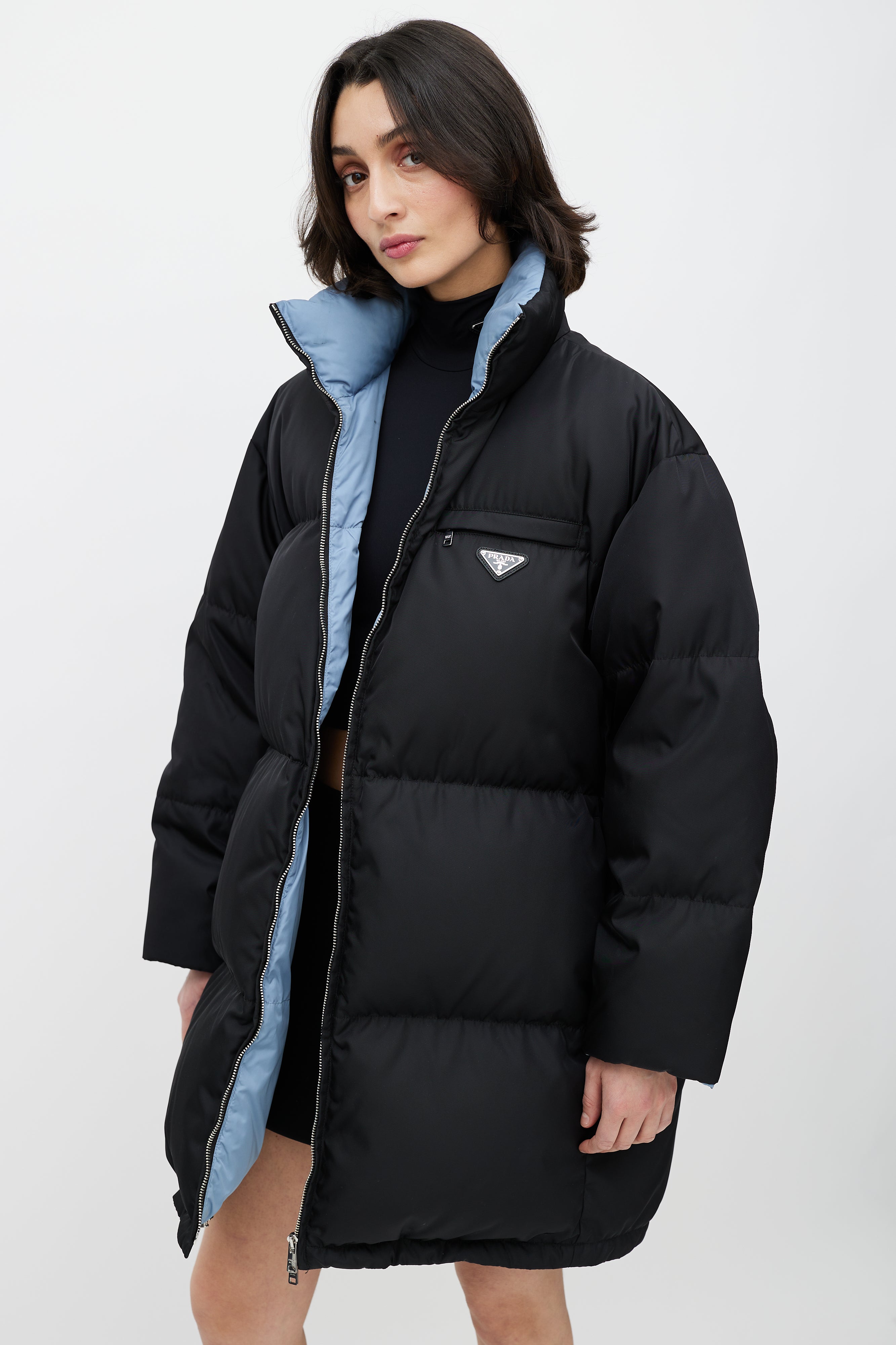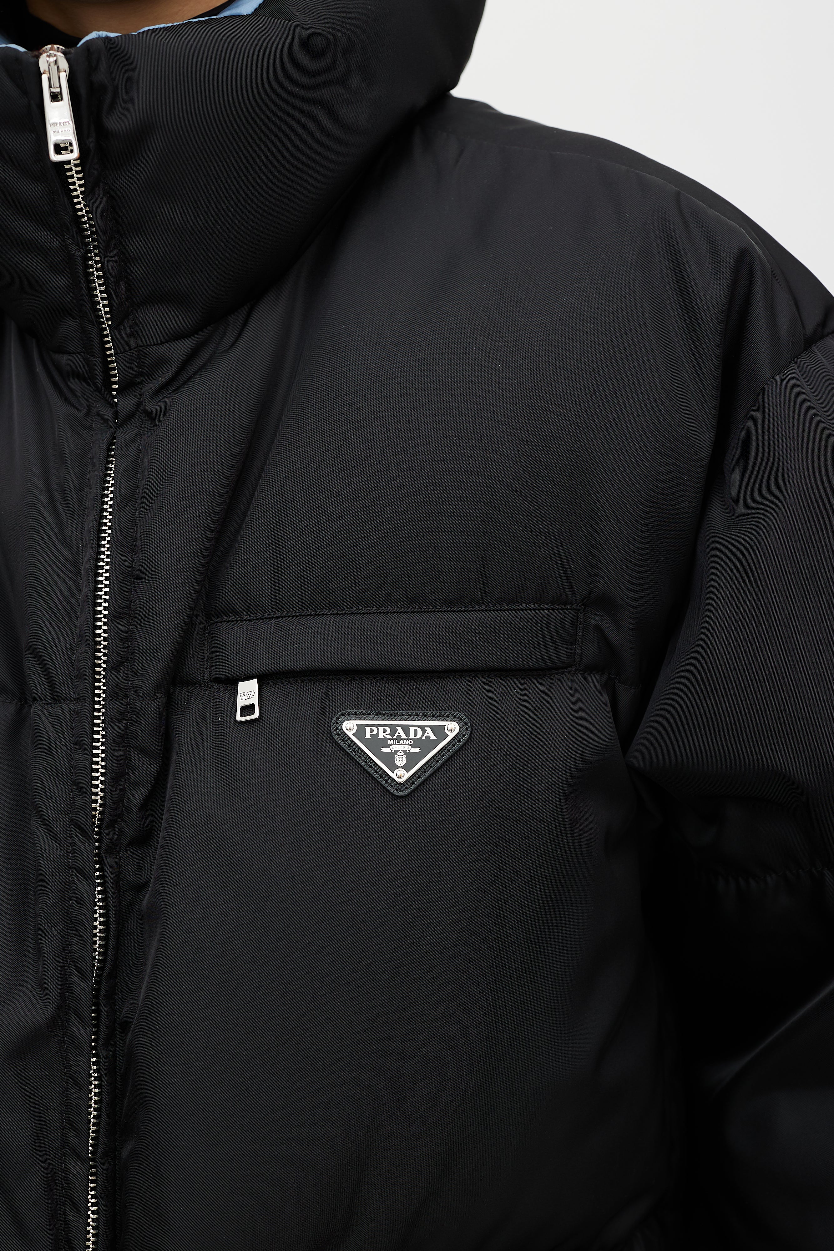 Pre-owned Prada black Re-Nylon down puffer coat featuring a mock neck collar with zip detail at back, long sleeves, one zip pocket at chest with silver tone logo hardware, two zip pockets at hip, and zip closure. Lined.