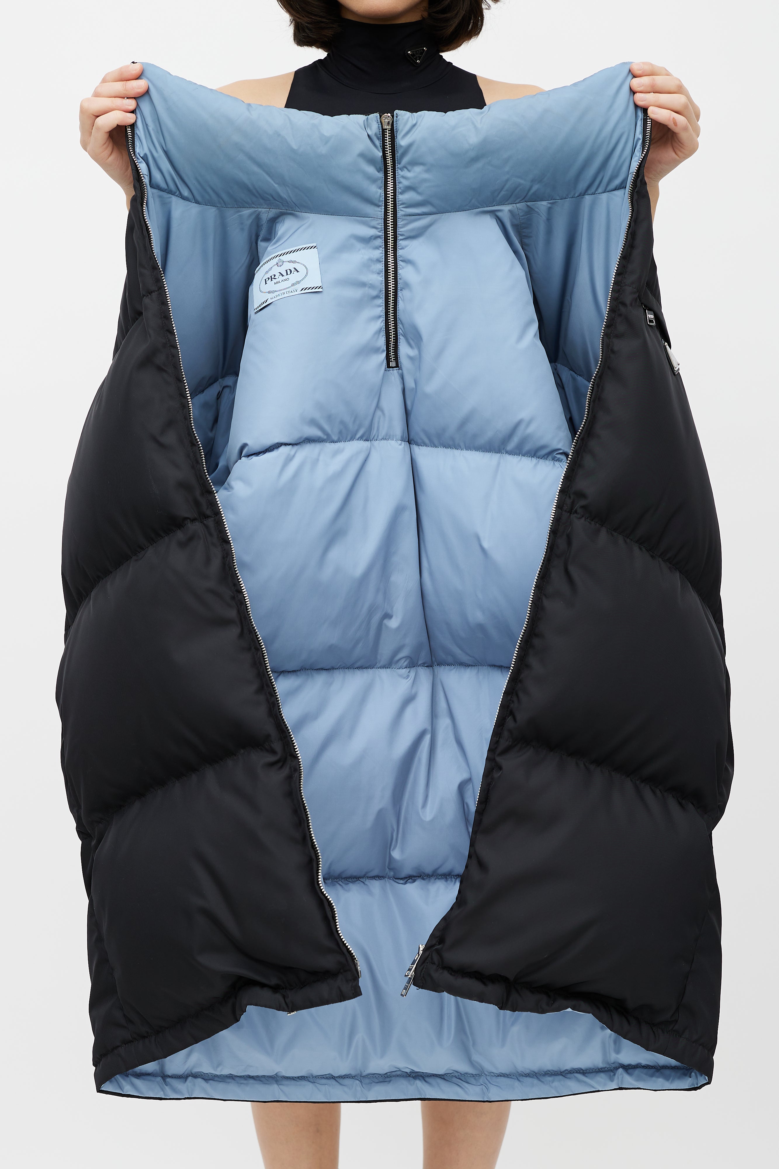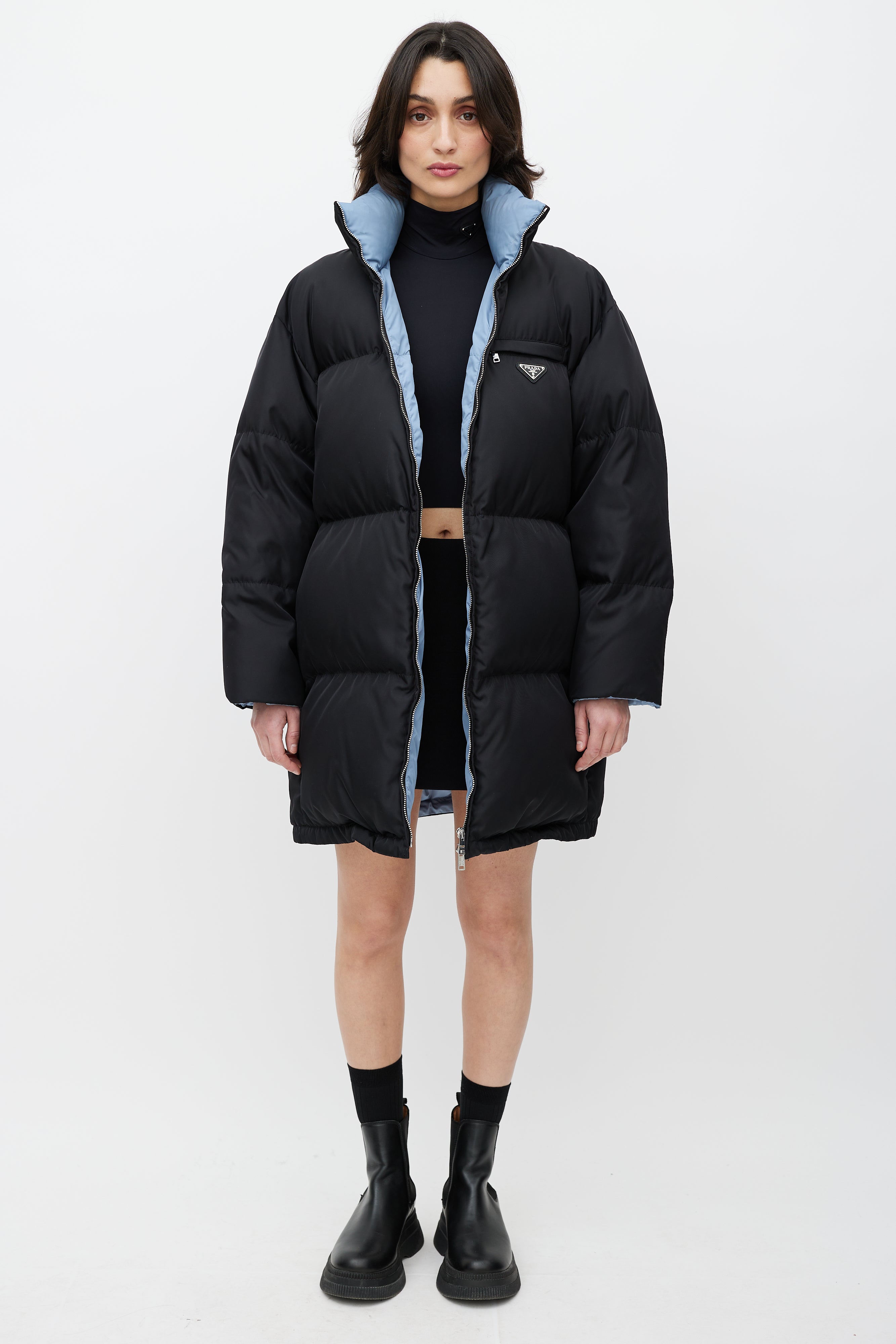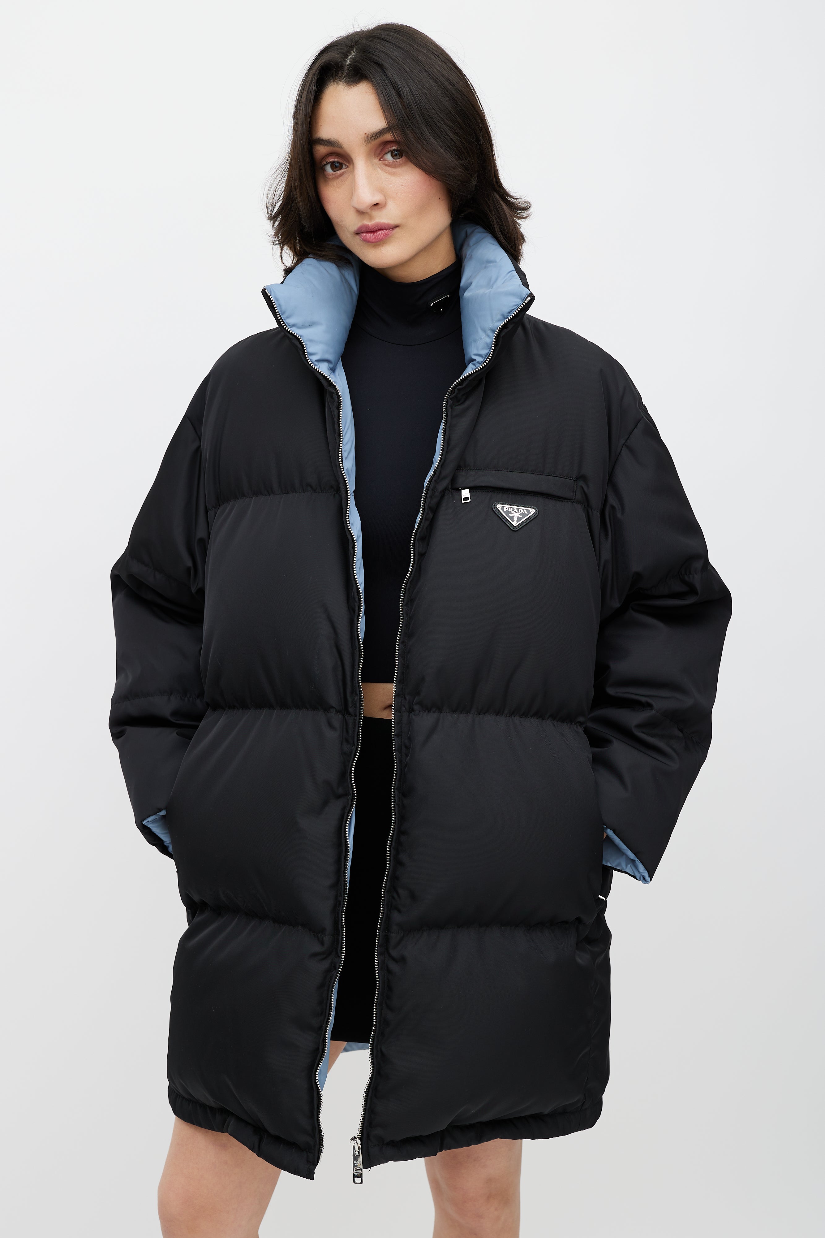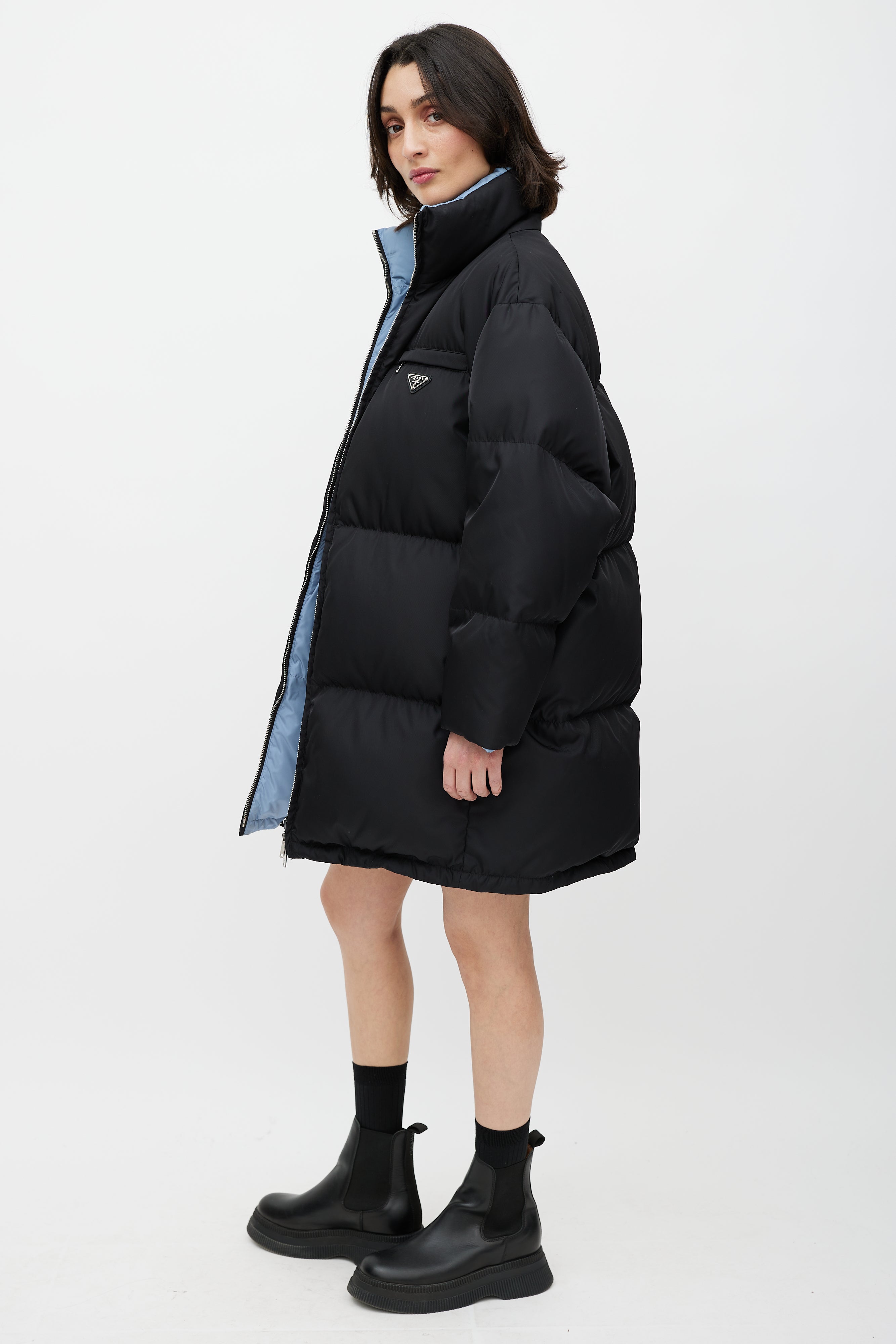 Pre-owned Prada black Re-Nylon down puffer coat featuring a mock neck collar with zip detail at back, long sleeves, one zip pocket at chest with silver tone logo hardware, two zip pockets at hip, and zip closure. Lined.