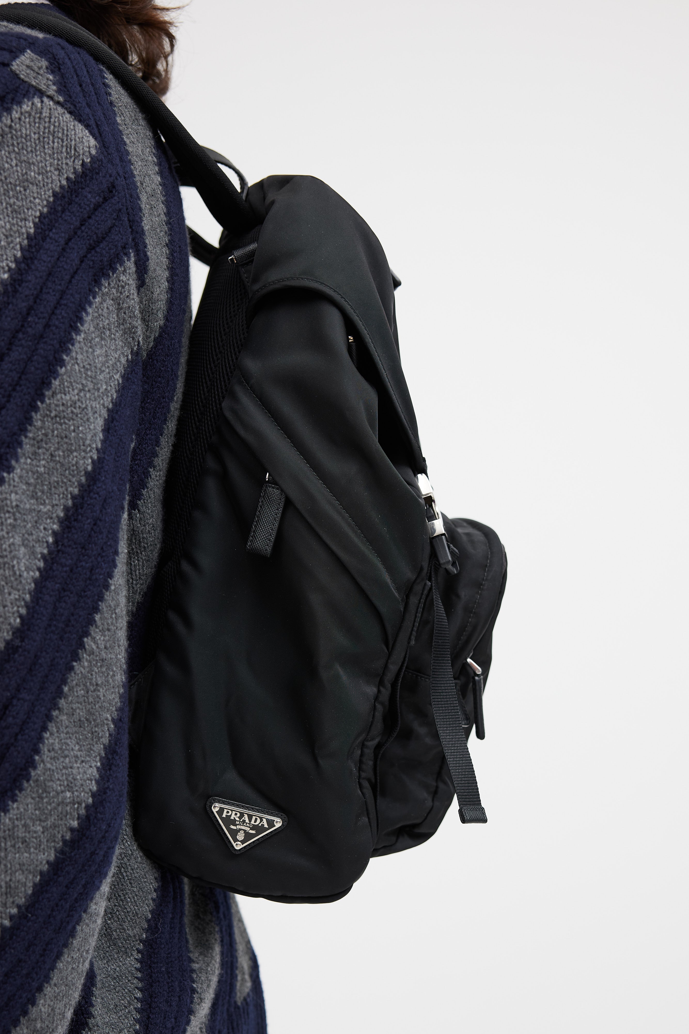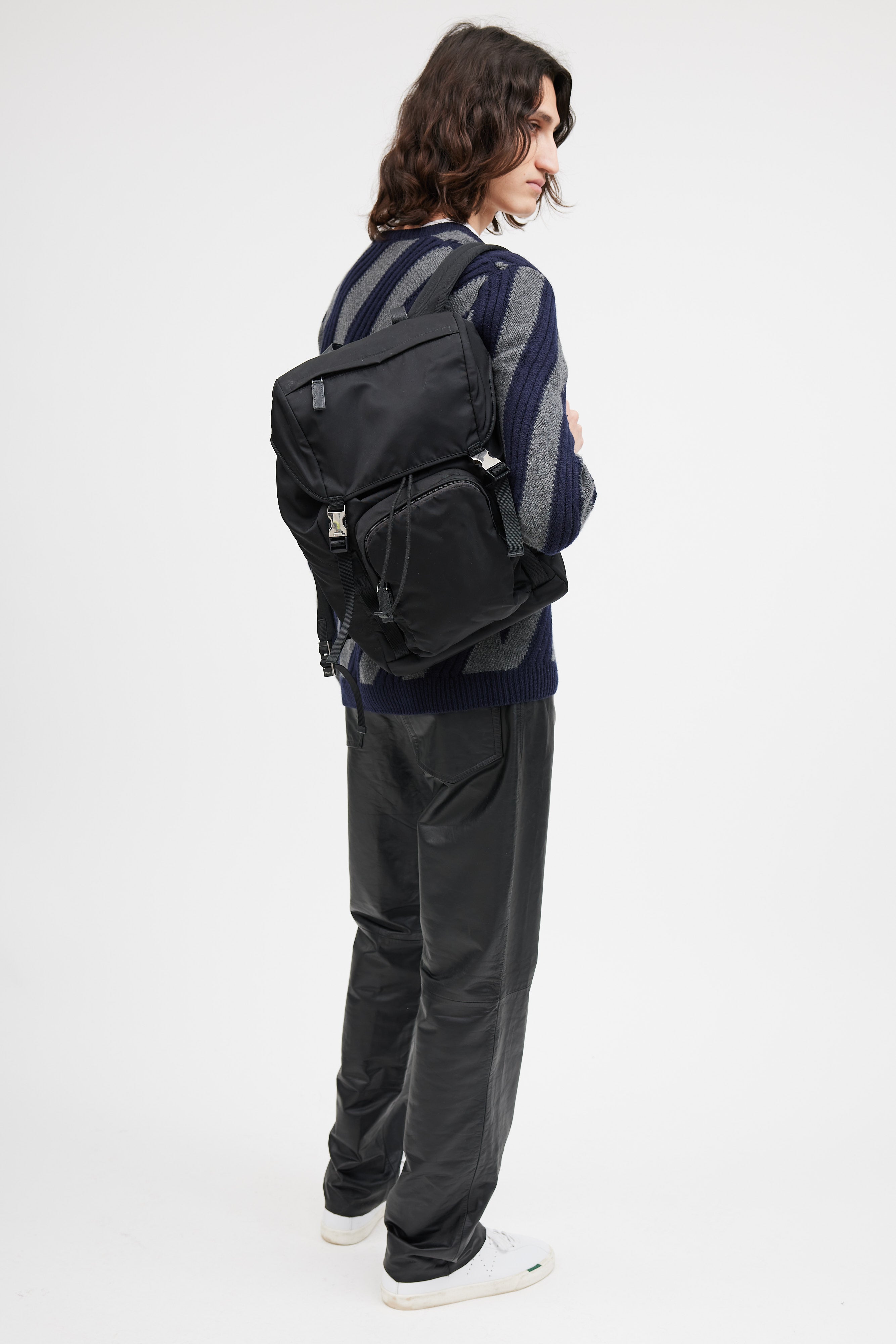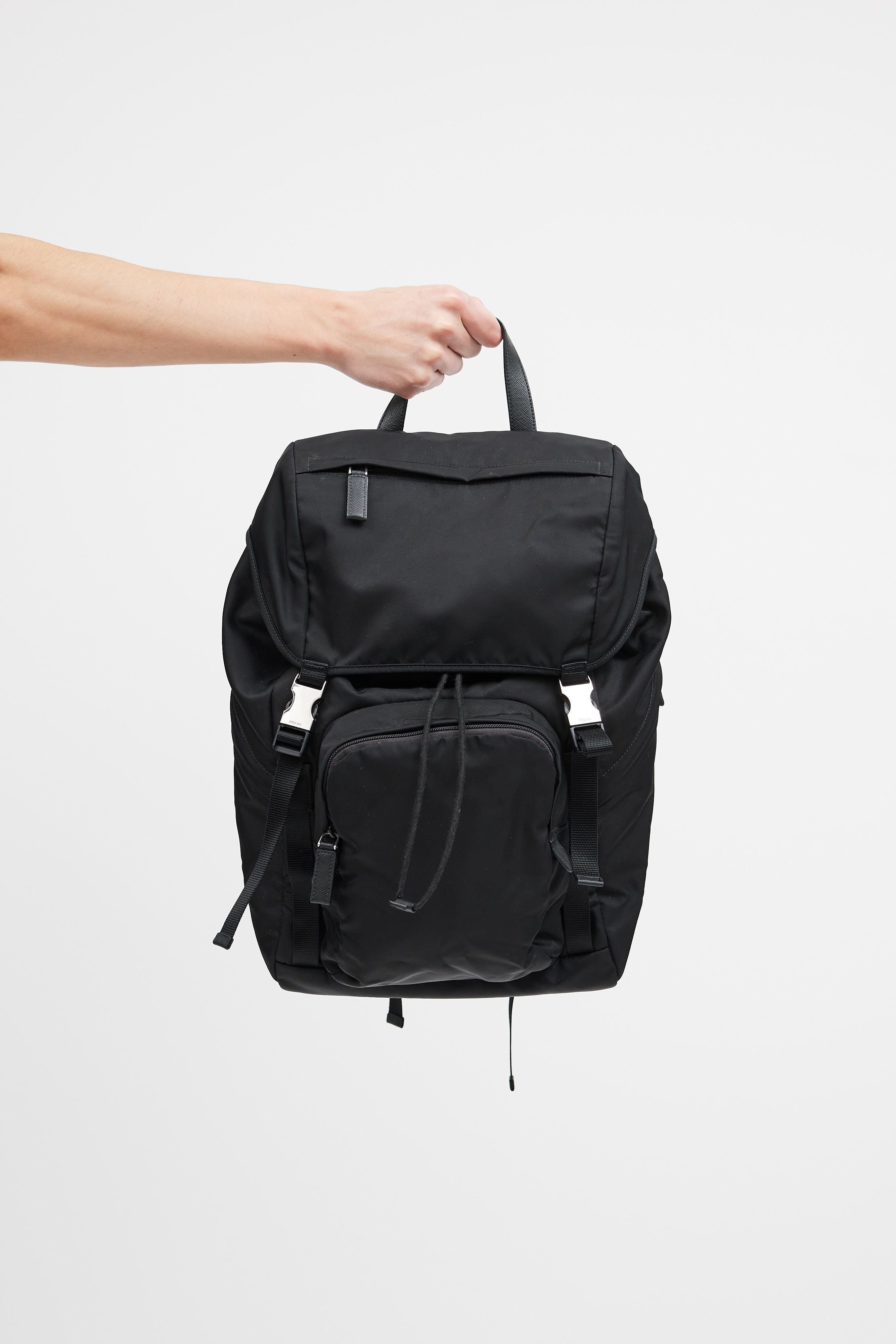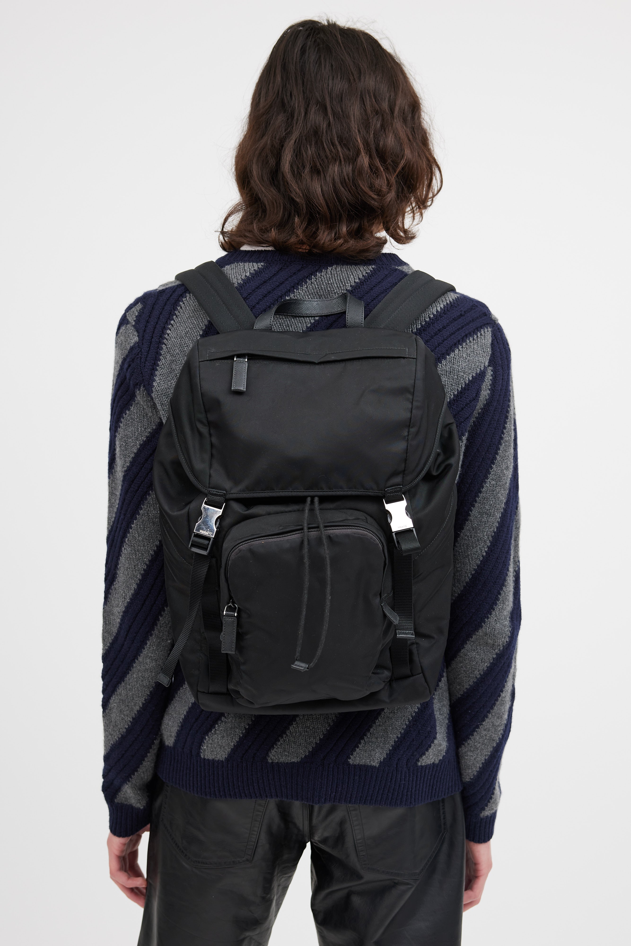 Pre-owned Prada black re-nylon tessuto backpack featuring silver tone hardware, triangle logo plaque at side, adjustable drawstring at collar, two logo engraved buckles at front and straps, four exterior zip pockets, and leather top handle.