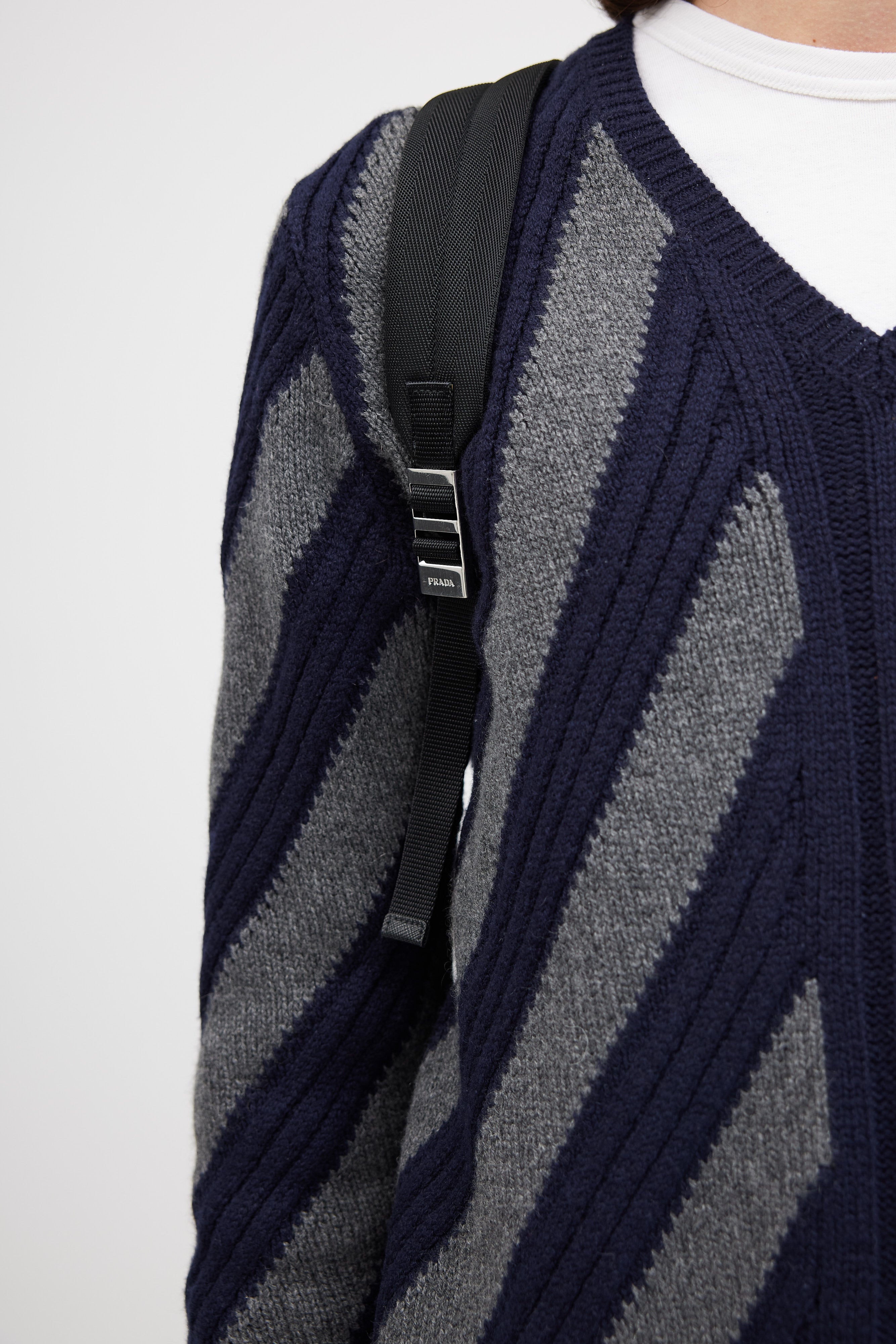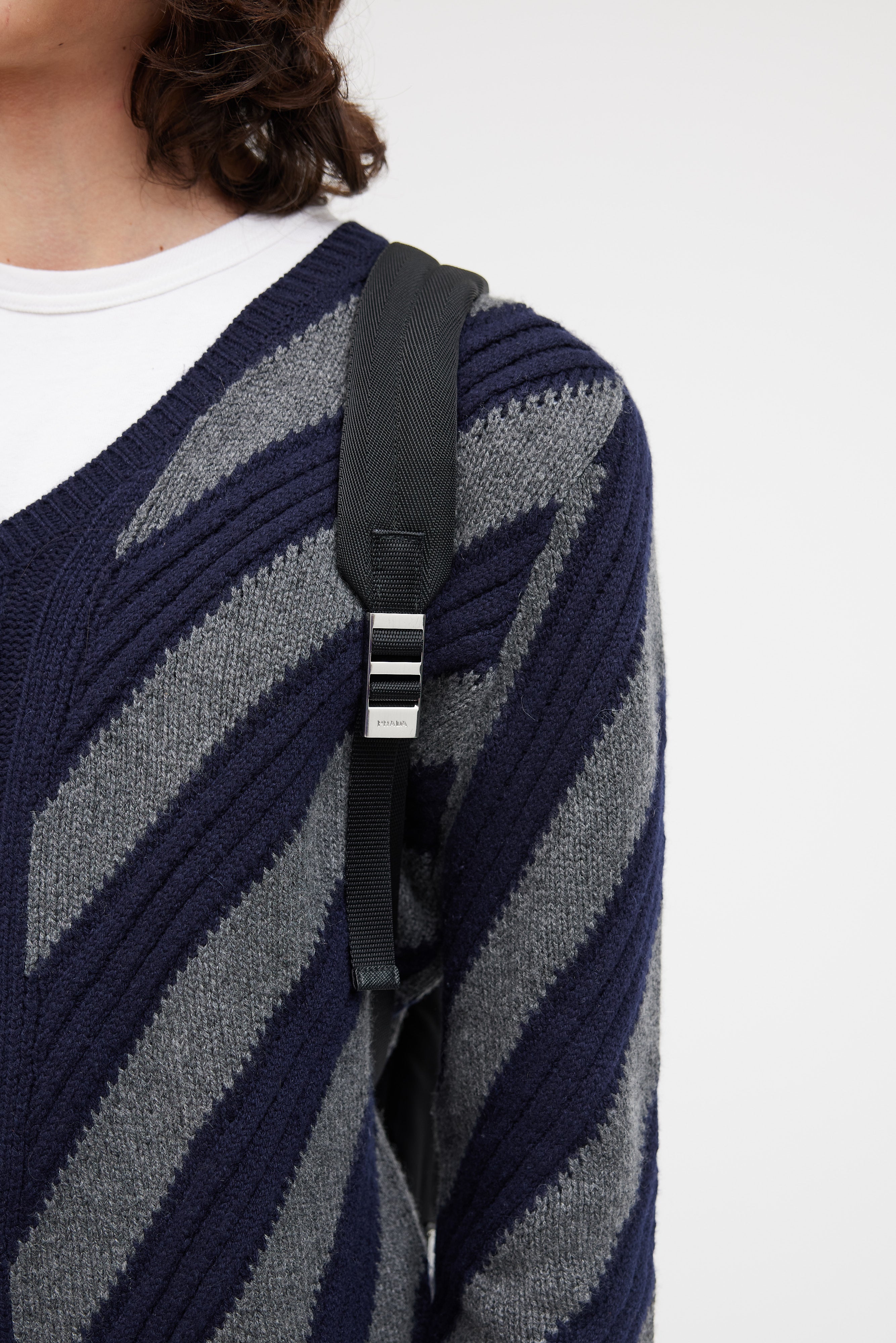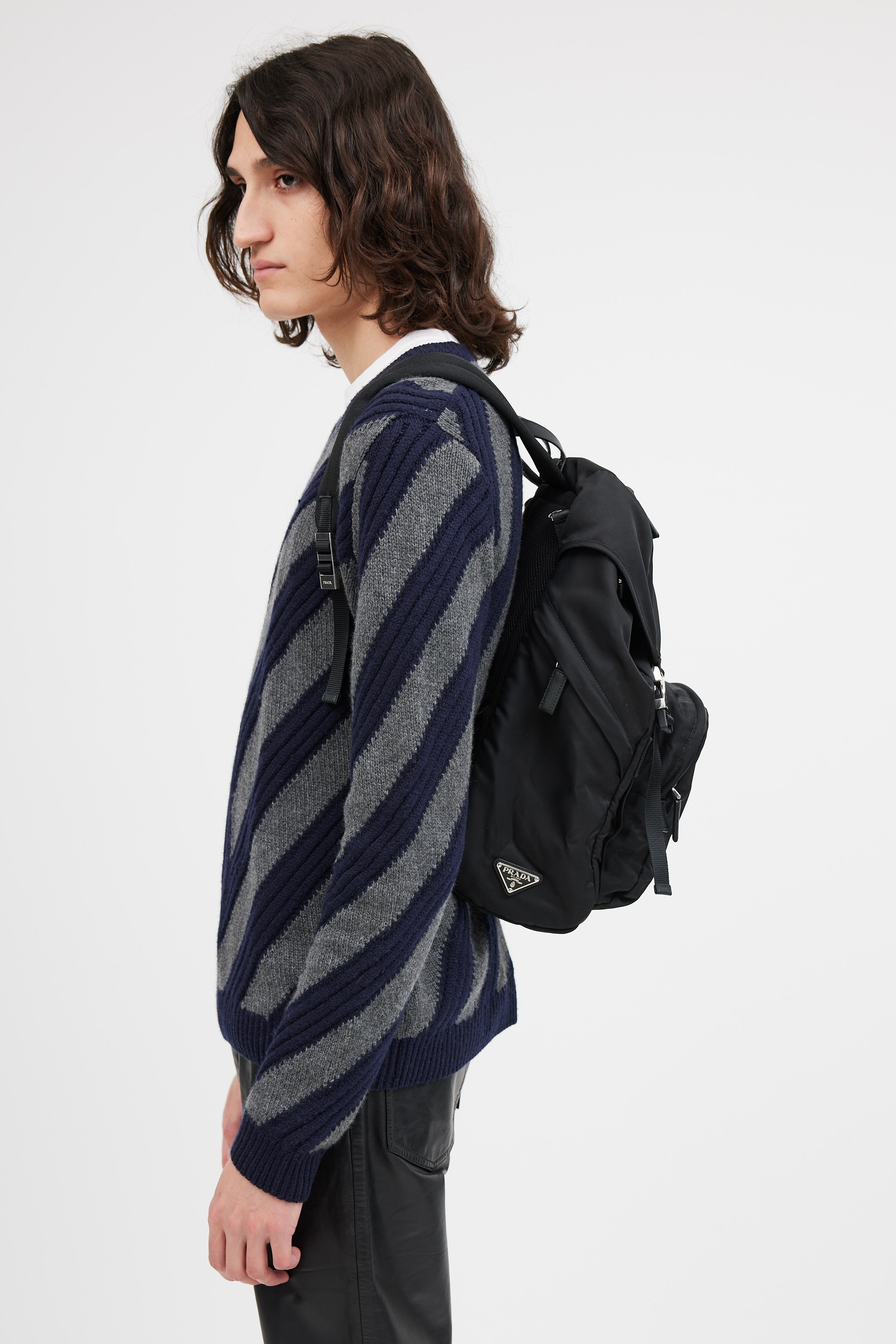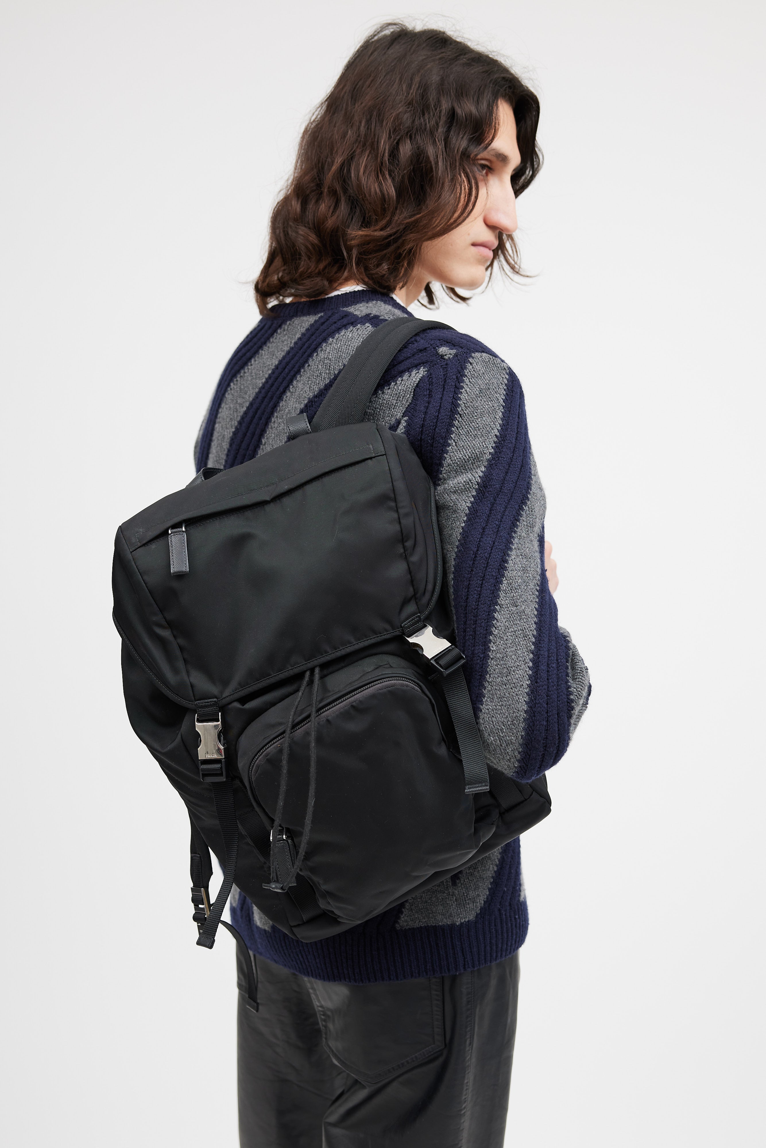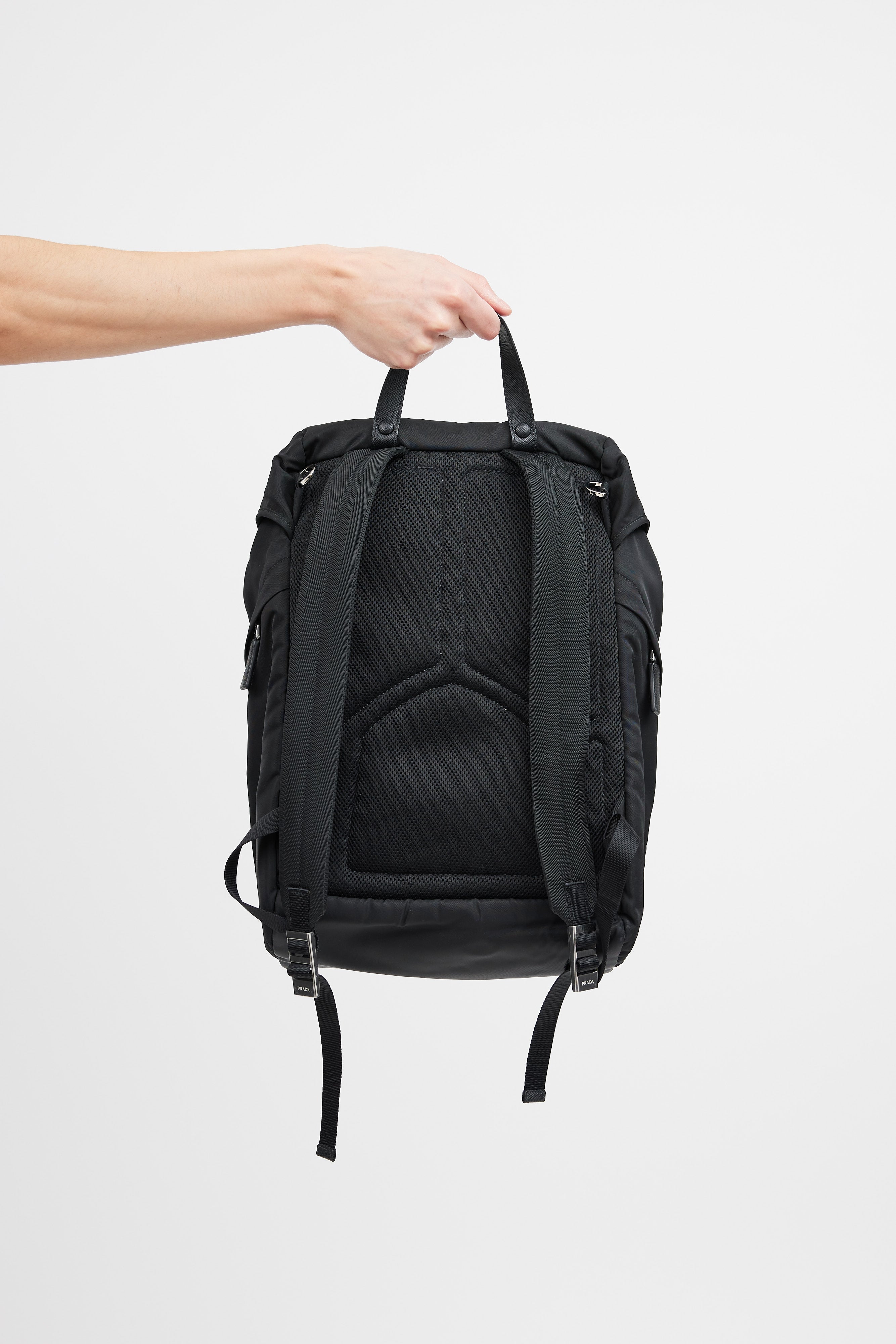 Pre-owned Prada black re-nylon tessuto backpack featuring silver tone hardware, triangle logo plaque at side, adjustable drawstring at collar, two logo engraved buckles at front and straps, four exterior zip pockets, and leather top handle.