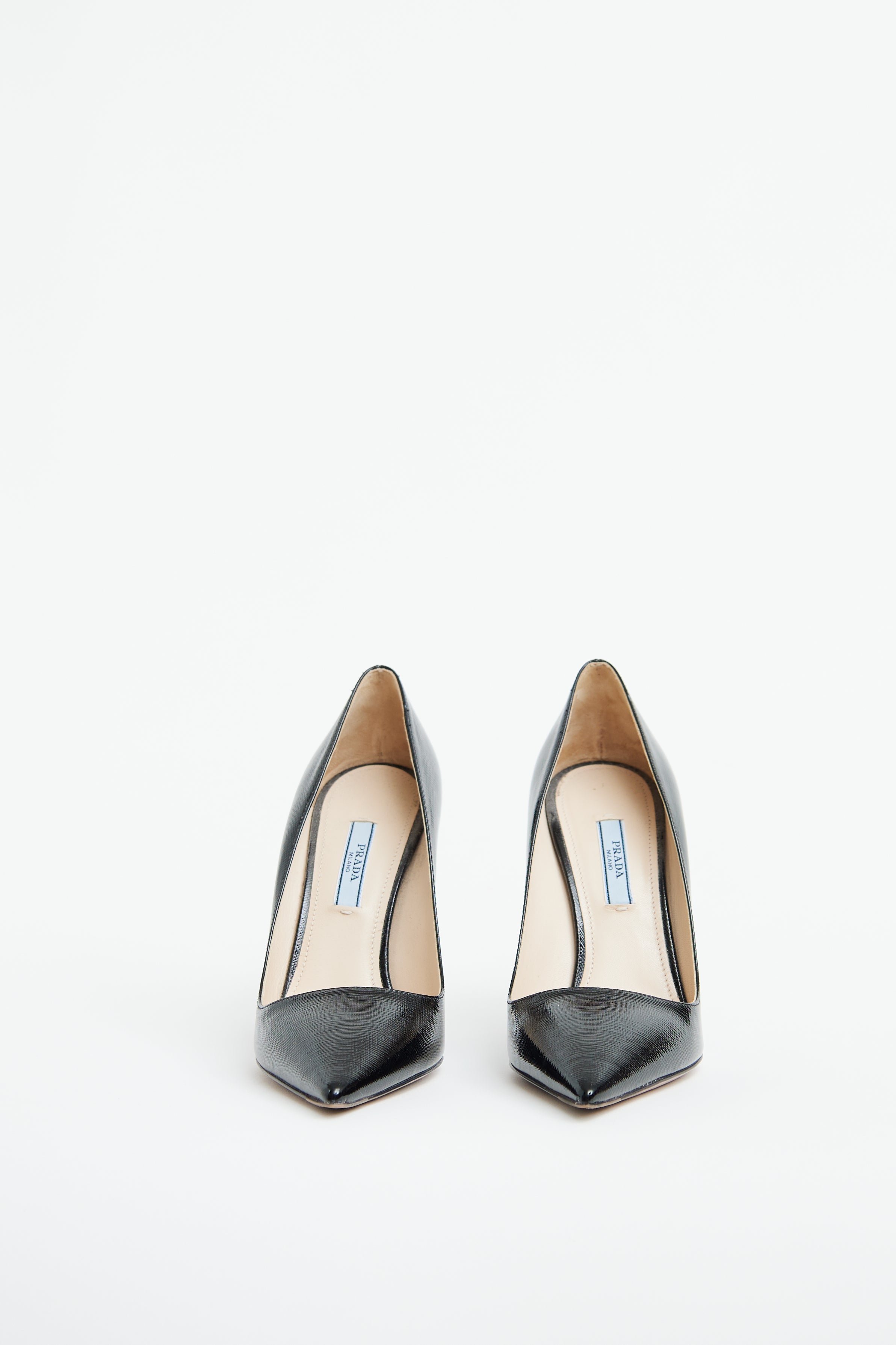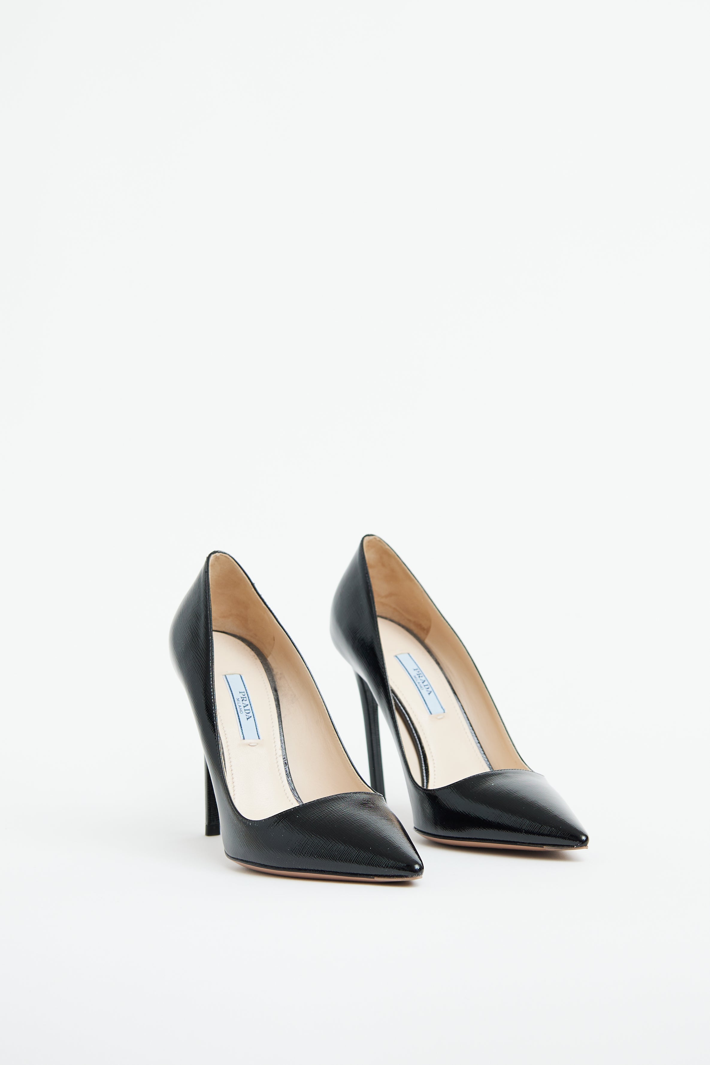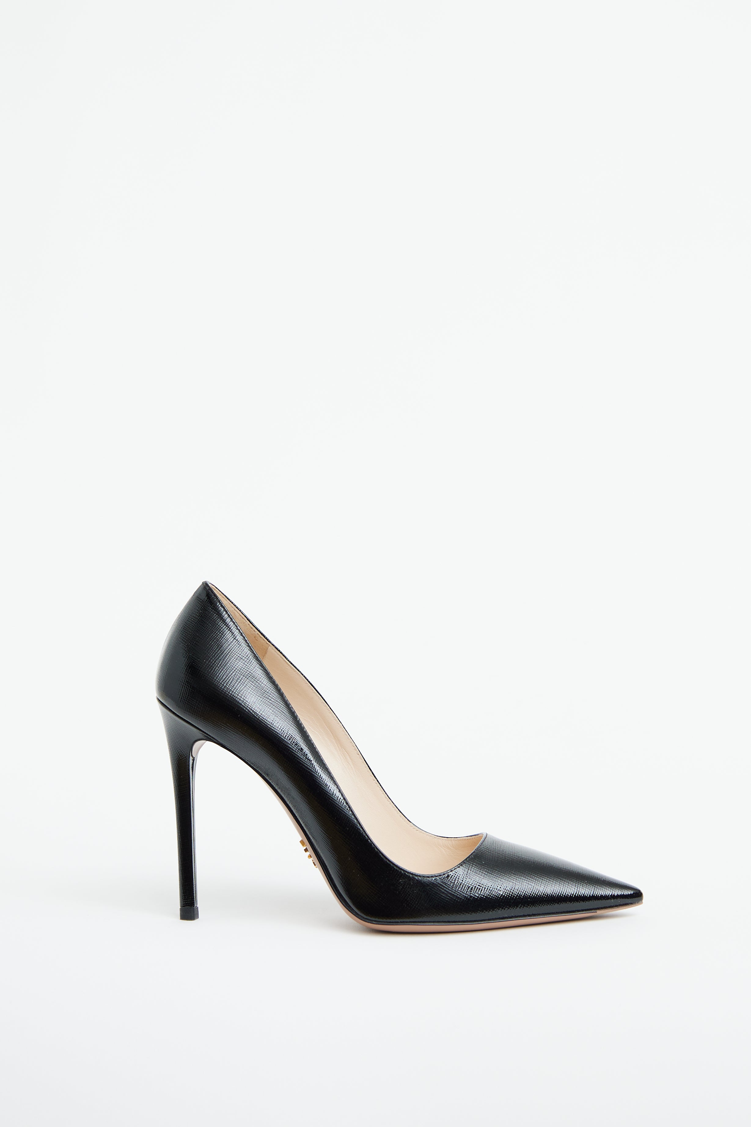Pre-owned Prada black Saffiano leather pump featuring pointed toe, slip on entry and wrapped stiletto heel.