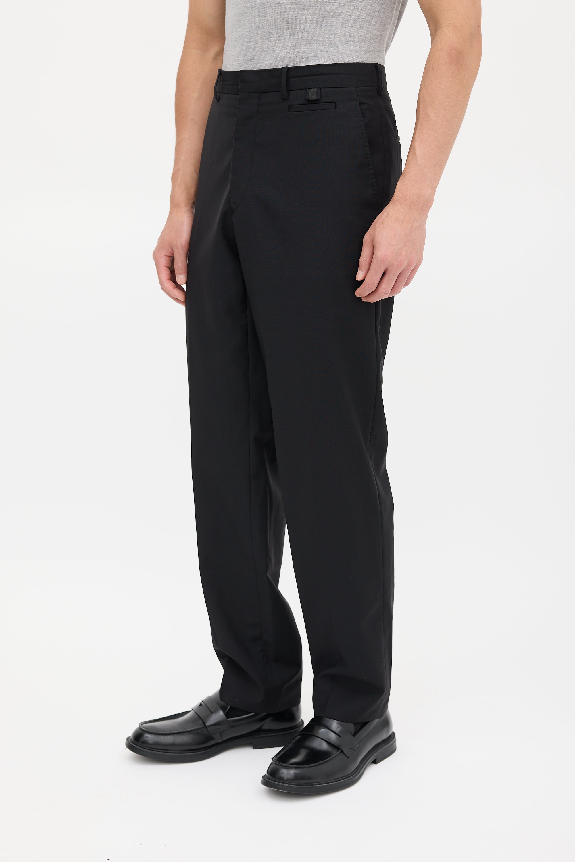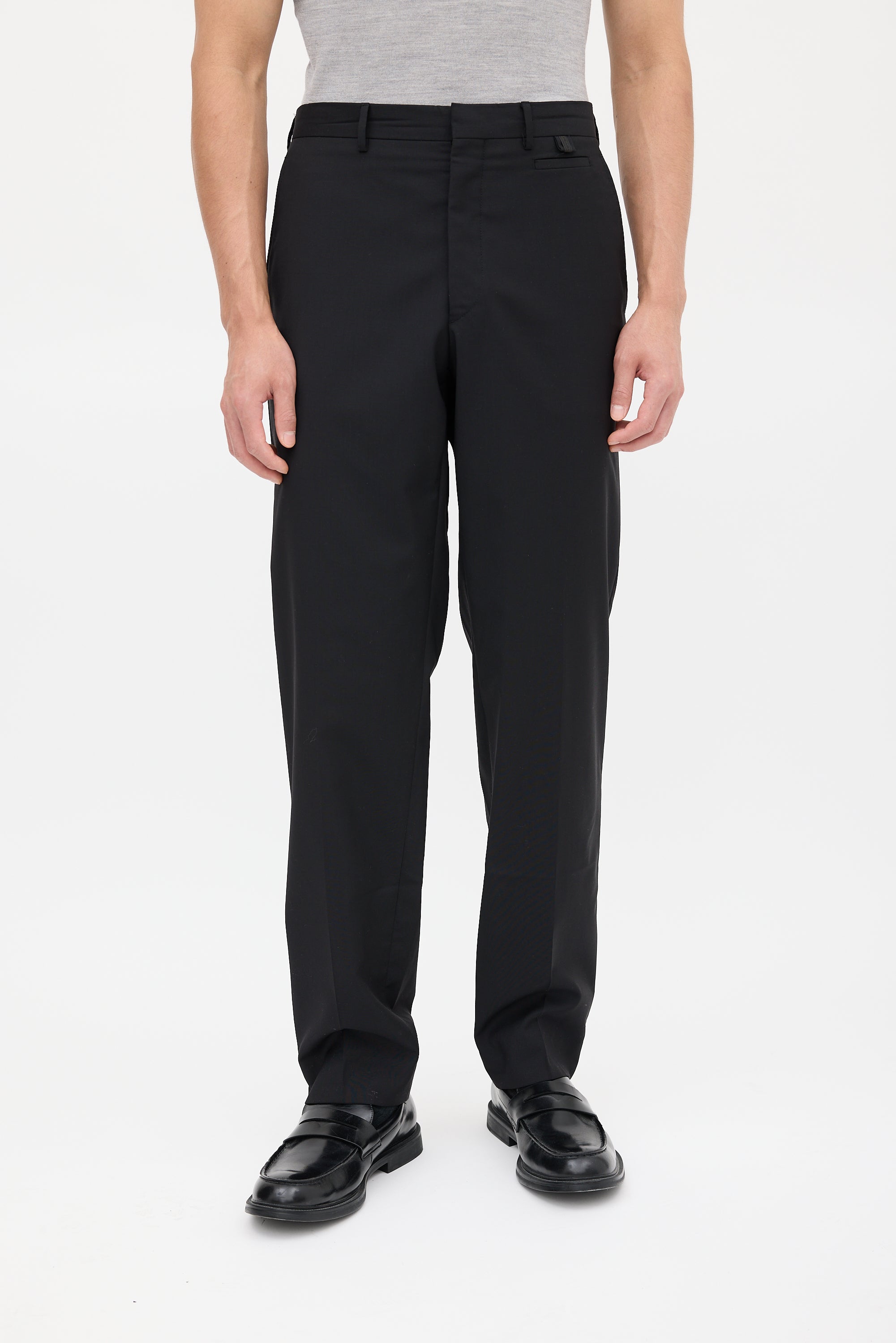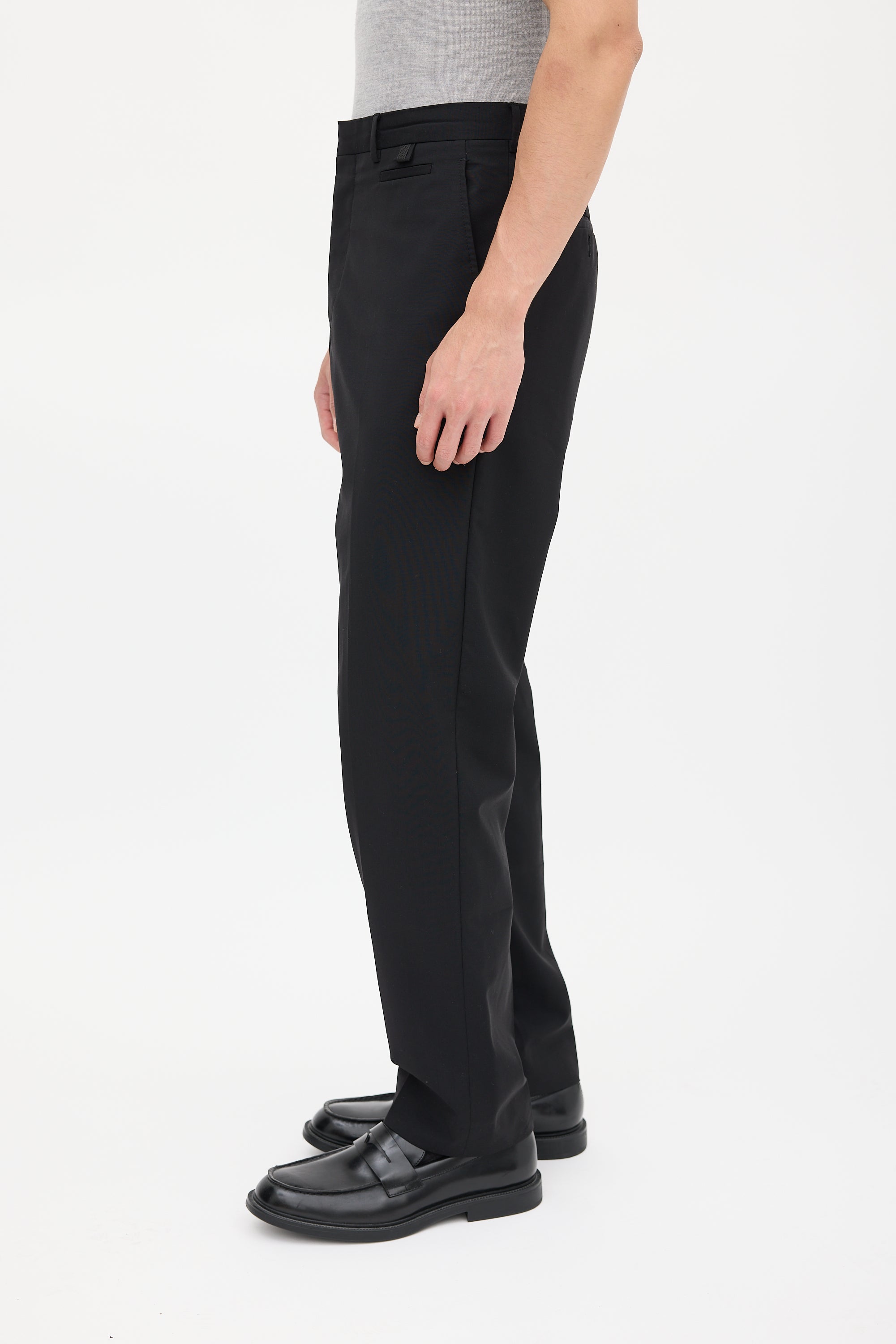 Pre-owned Prada black trousers featuring two slip pockets at hip, two welt pockets at back, webbed logo patch at waist, straight leg, and zip fly with hook and eye closure. Lined.
