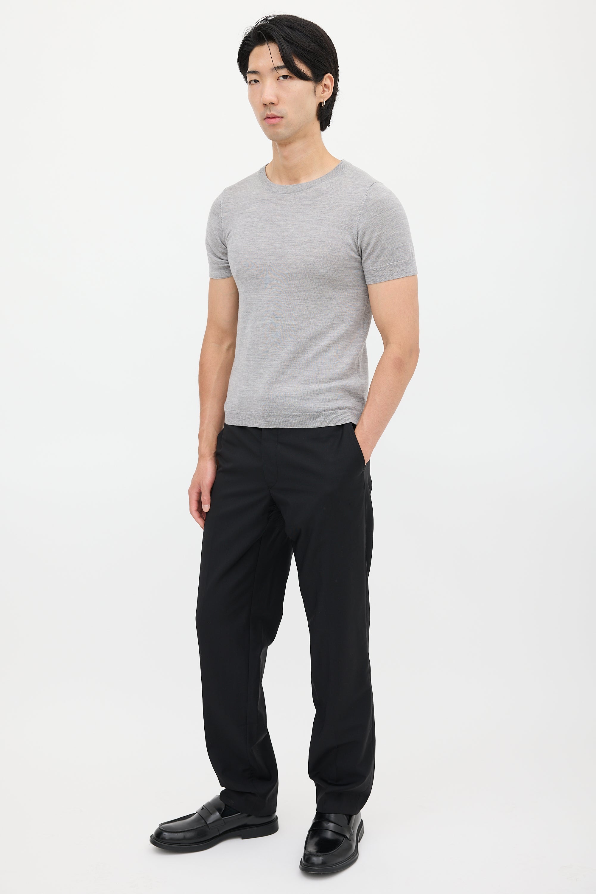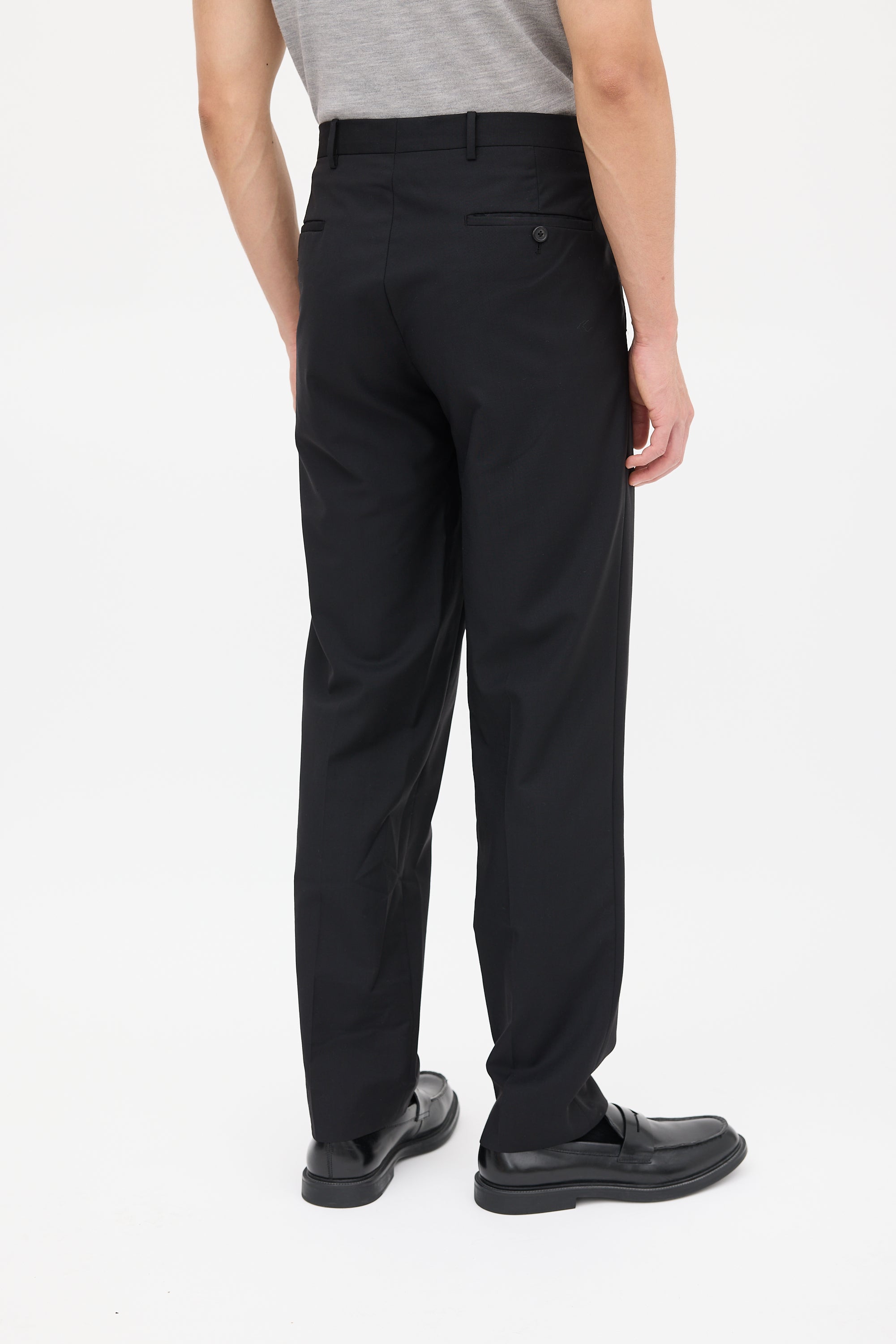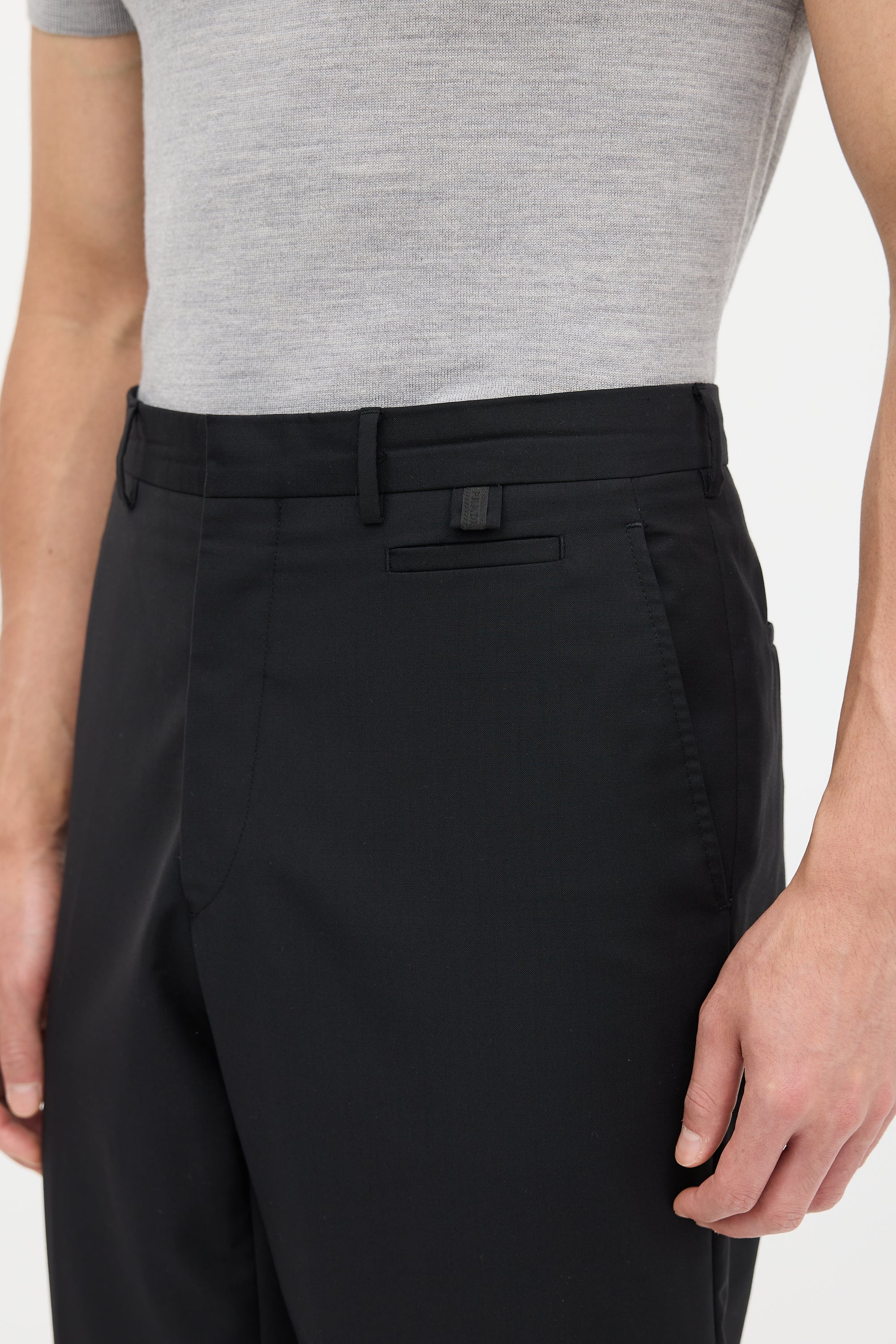 Pre-owned Prada black trousers featuring two slip pockets at hip, two welt pockets at back, webbed logo patch at waist, straight leg, and zip fly with hook and eye closure. Lined.
