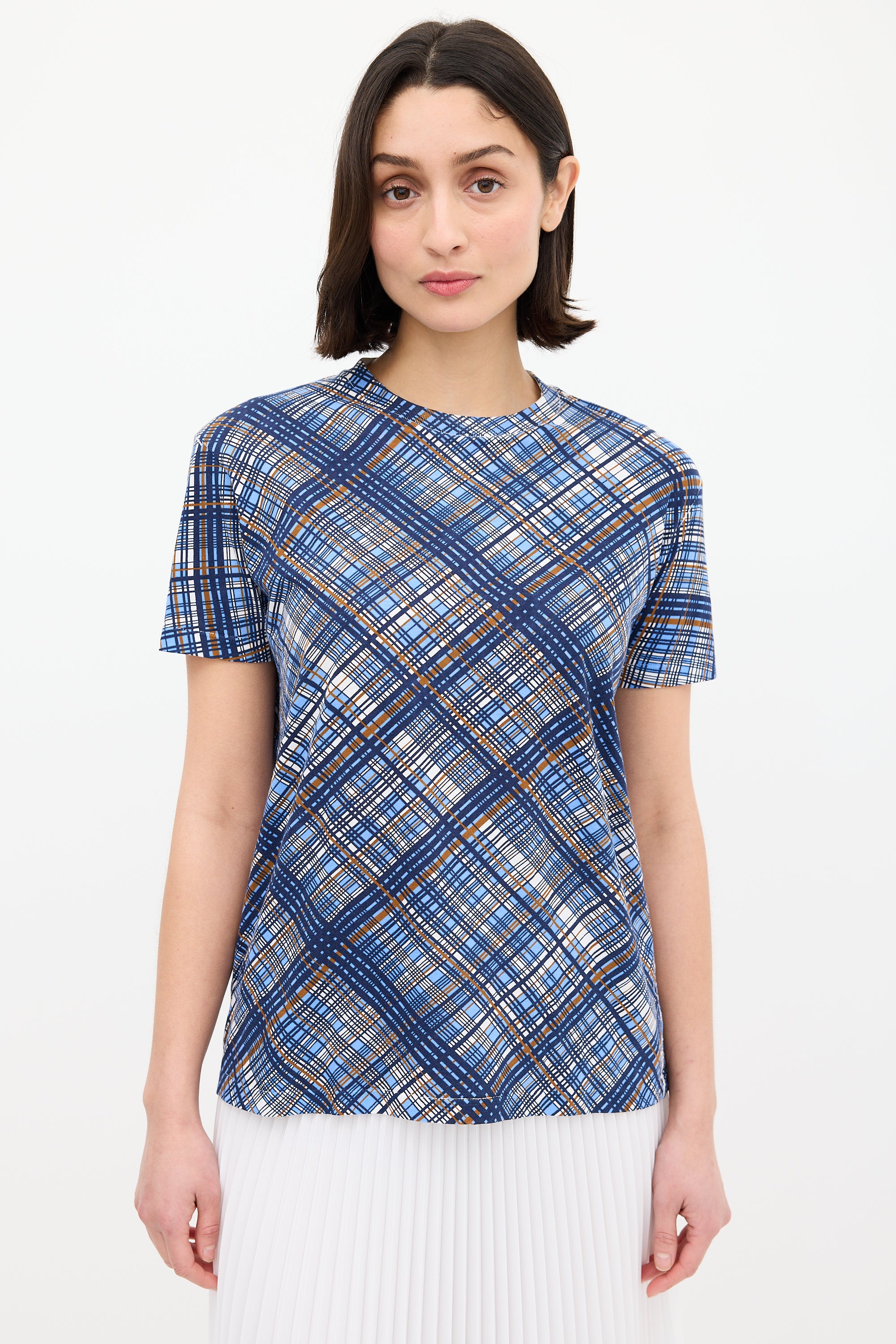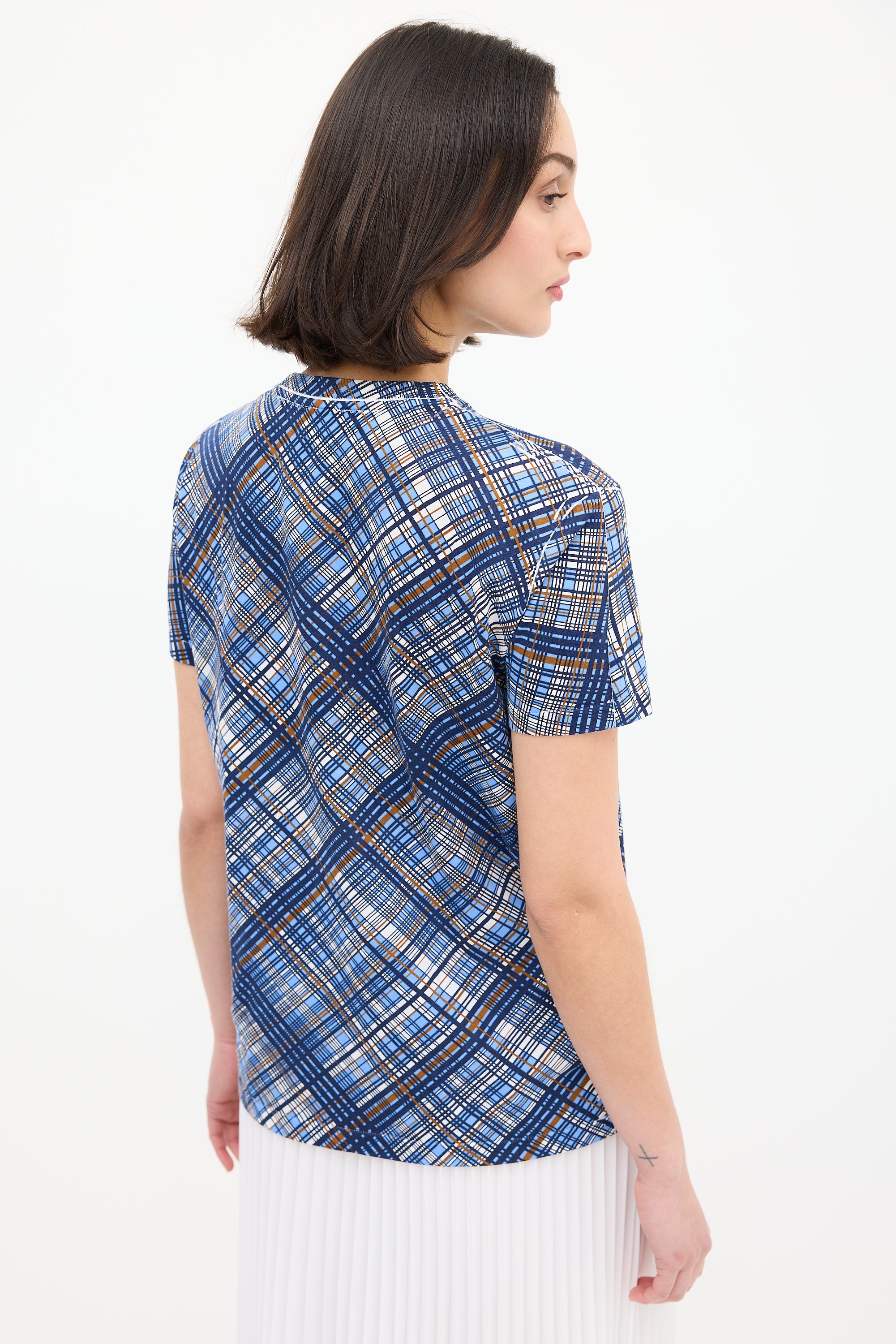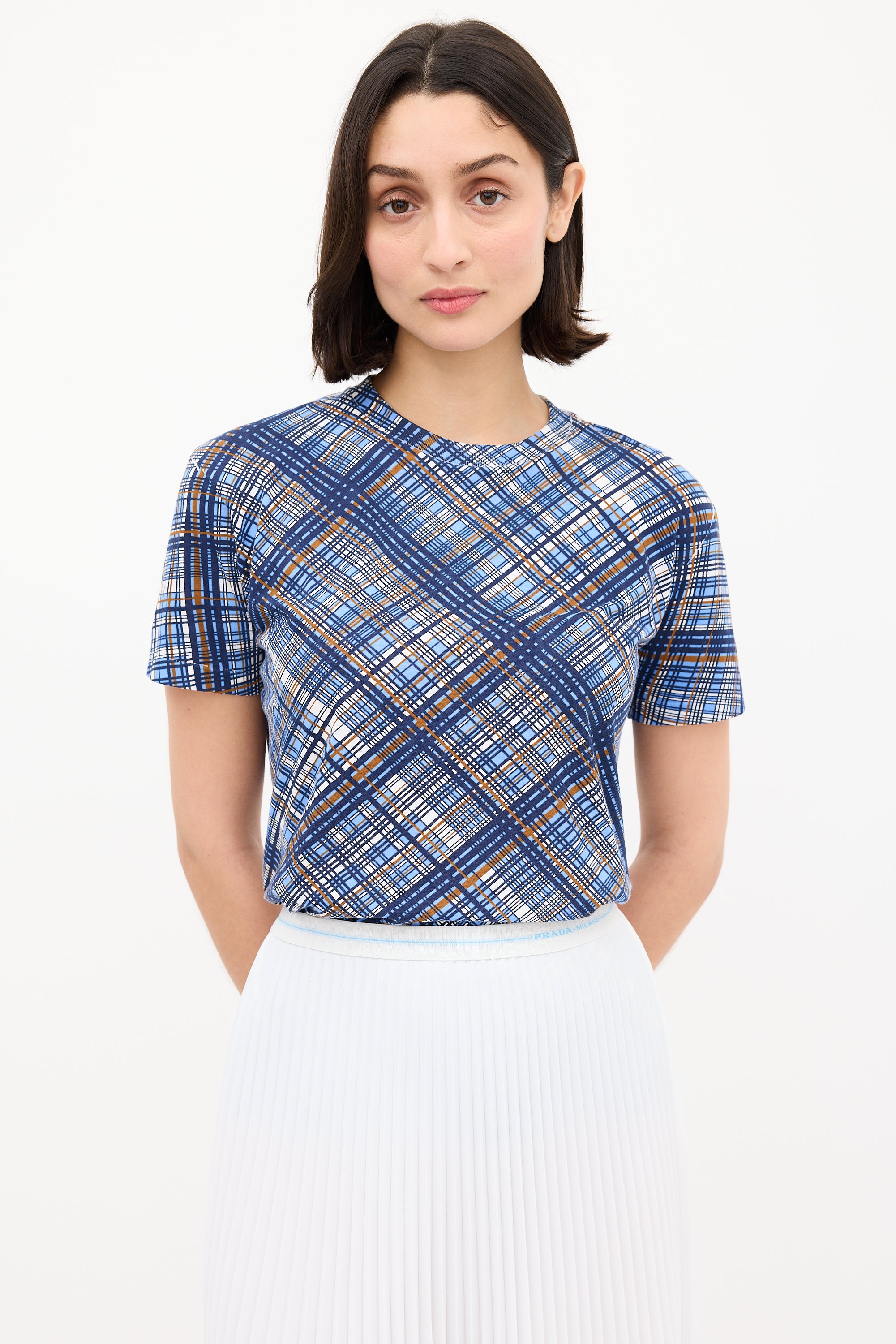 Pre-owned Prada blue and multicolour T-shirt featuring a round neckline, short sleeves, and check print throughout.