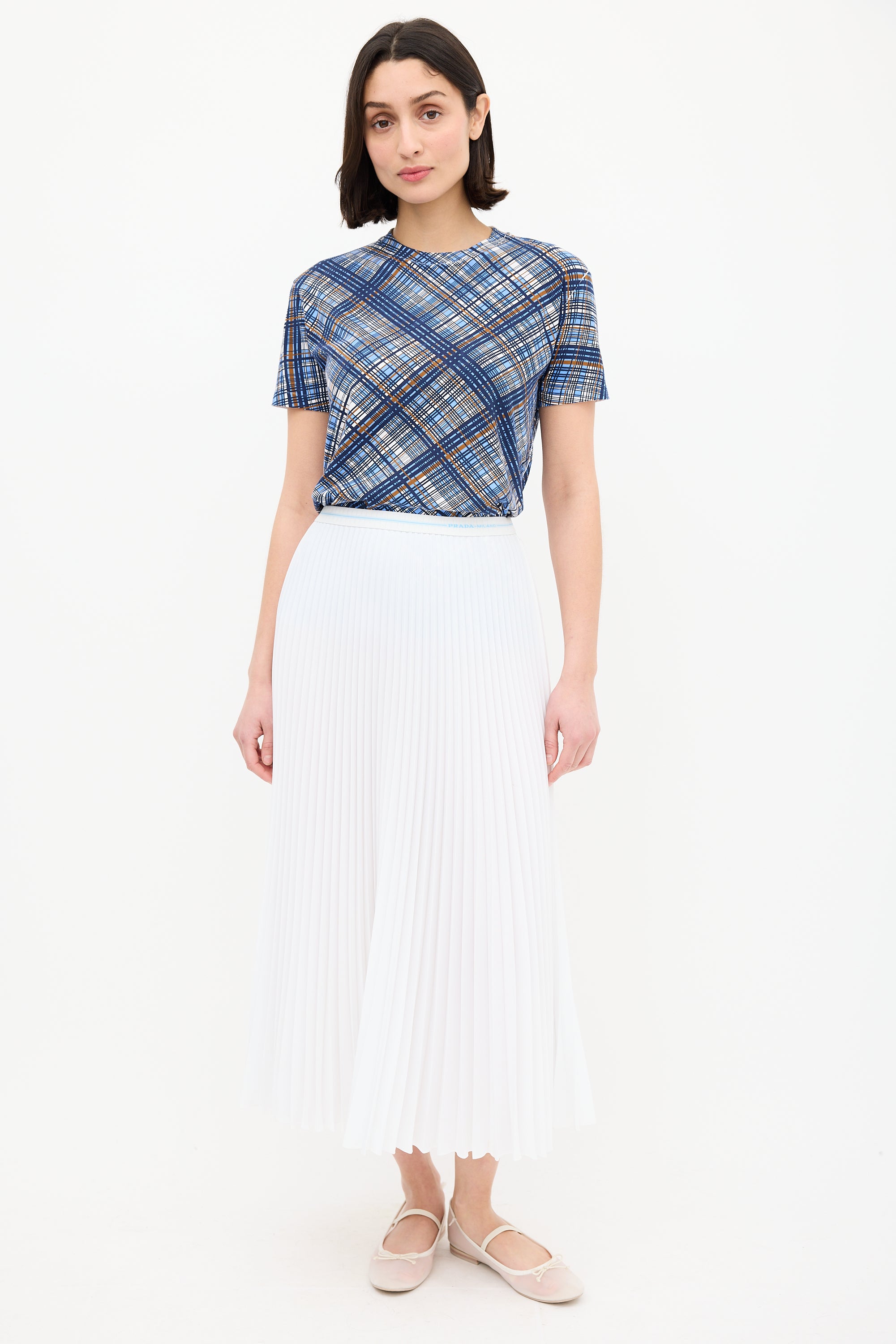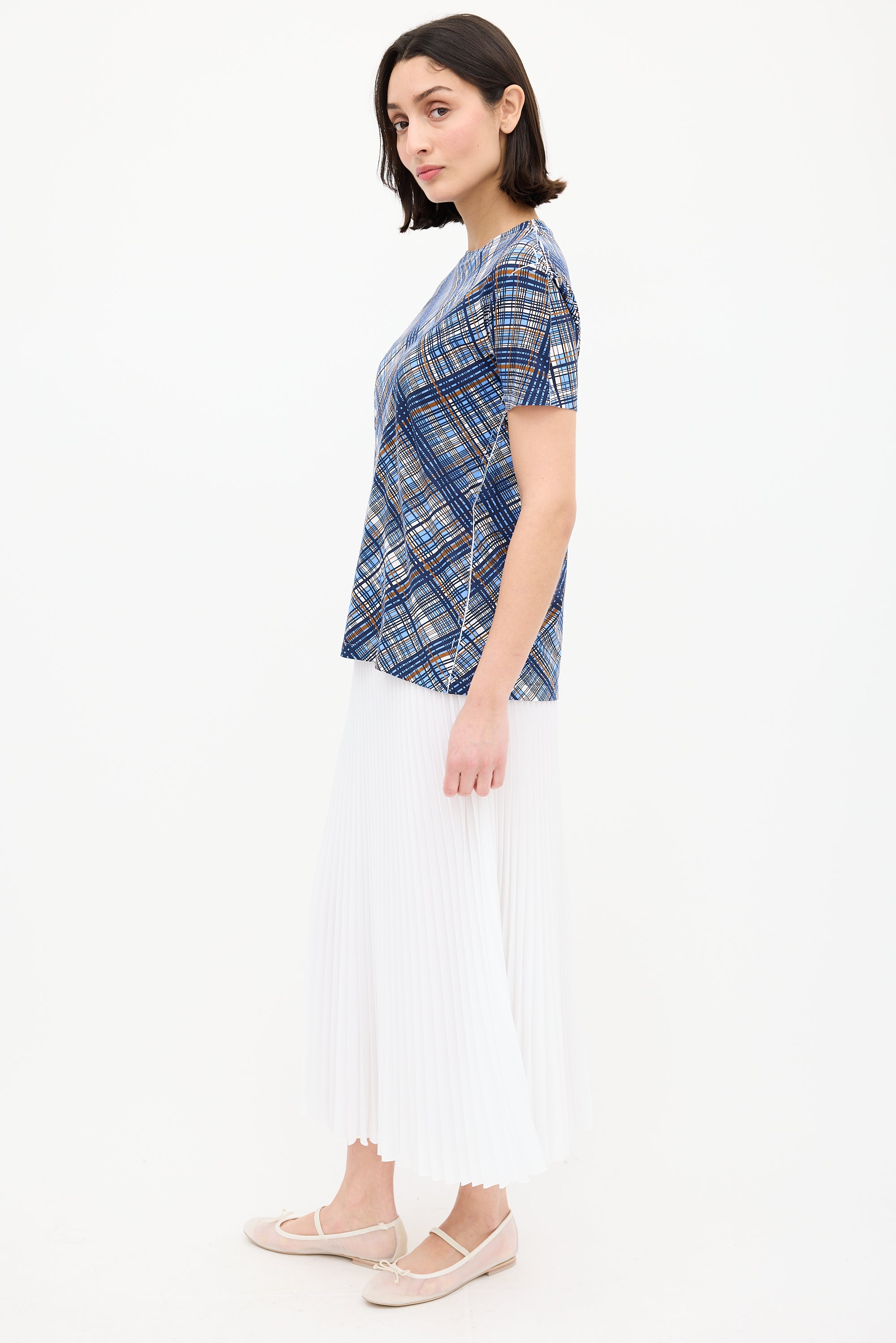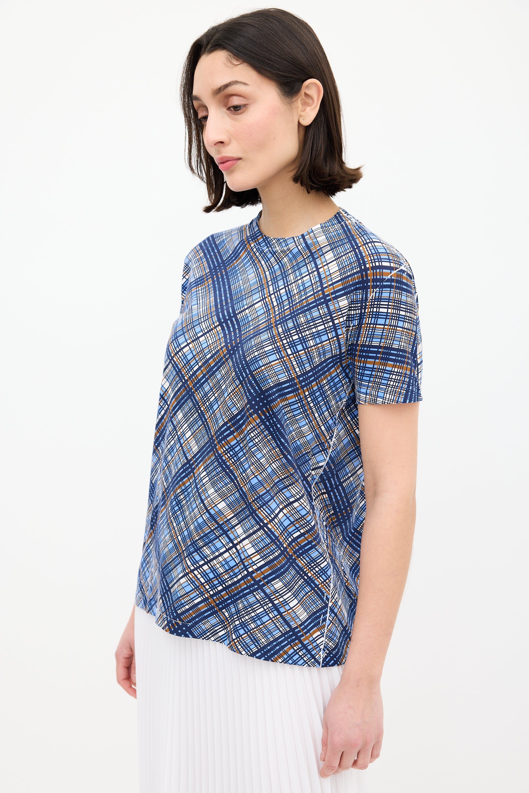 Pre-owned Prada blue and multicolour T-shirt featuring a round neckline, short sleeves, and check print throughout.