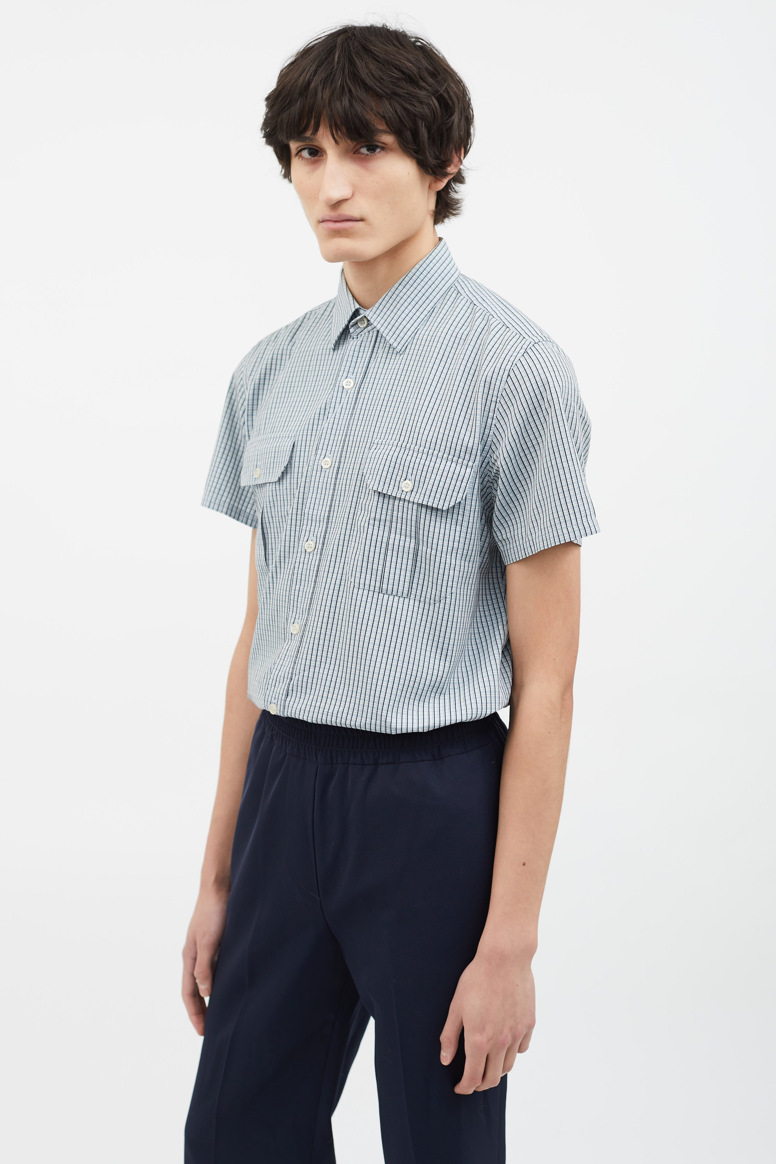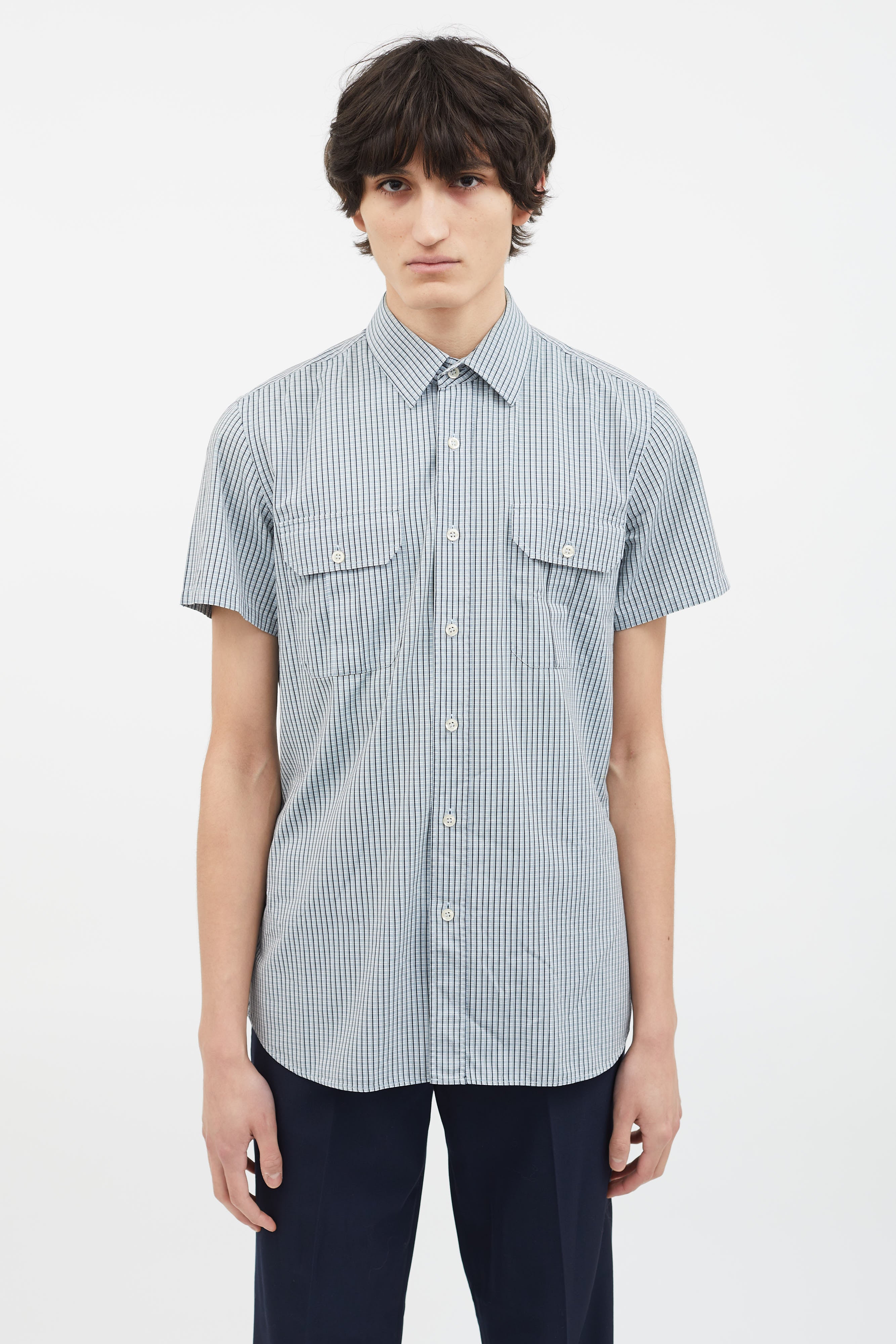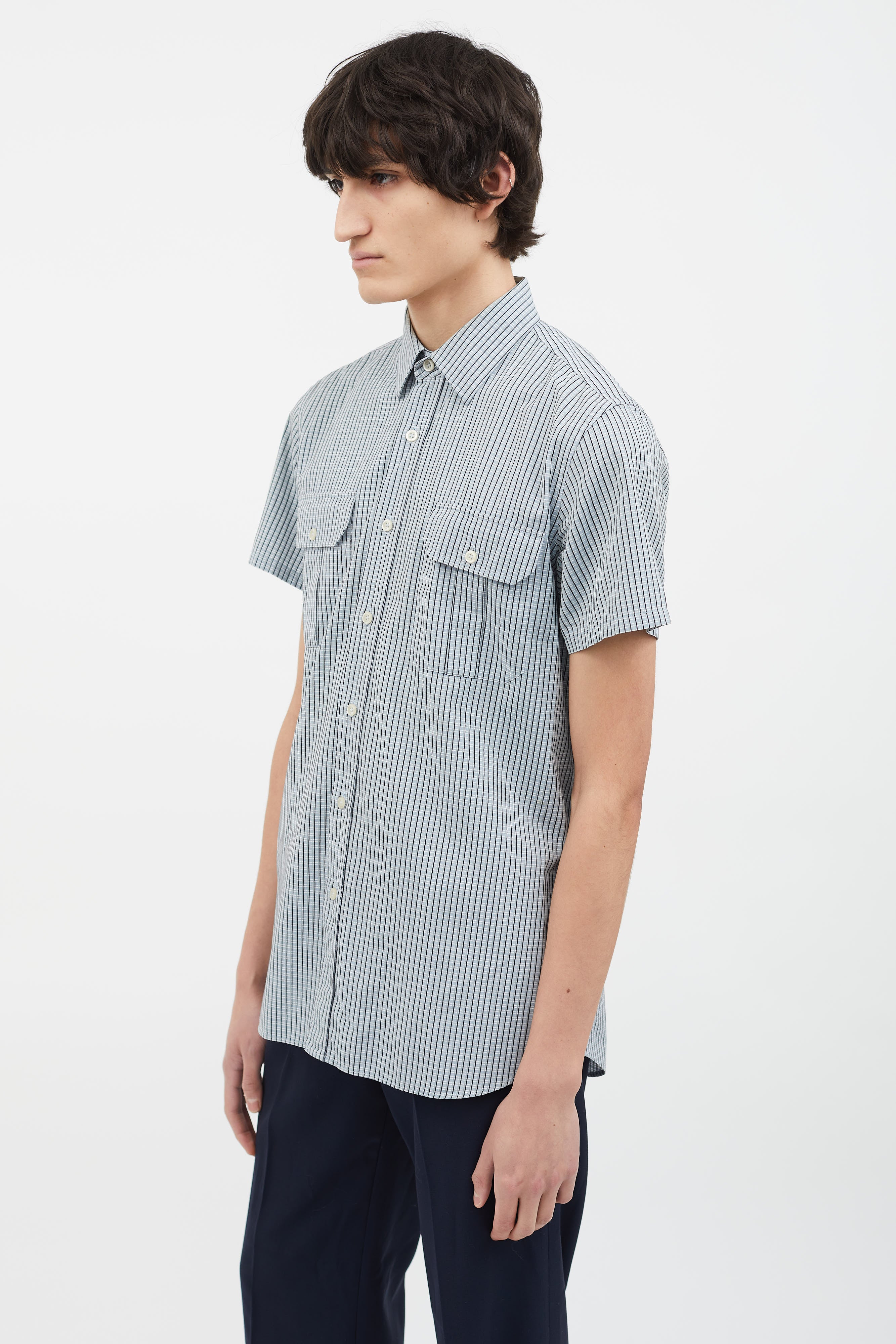 Pre-owned Prada blue, black and grey shirt featuring a spread collar, short sleeves, seven button-down closure, two flap pockets with button closure at front chest, multicolor striped pattern throughout and round hem.