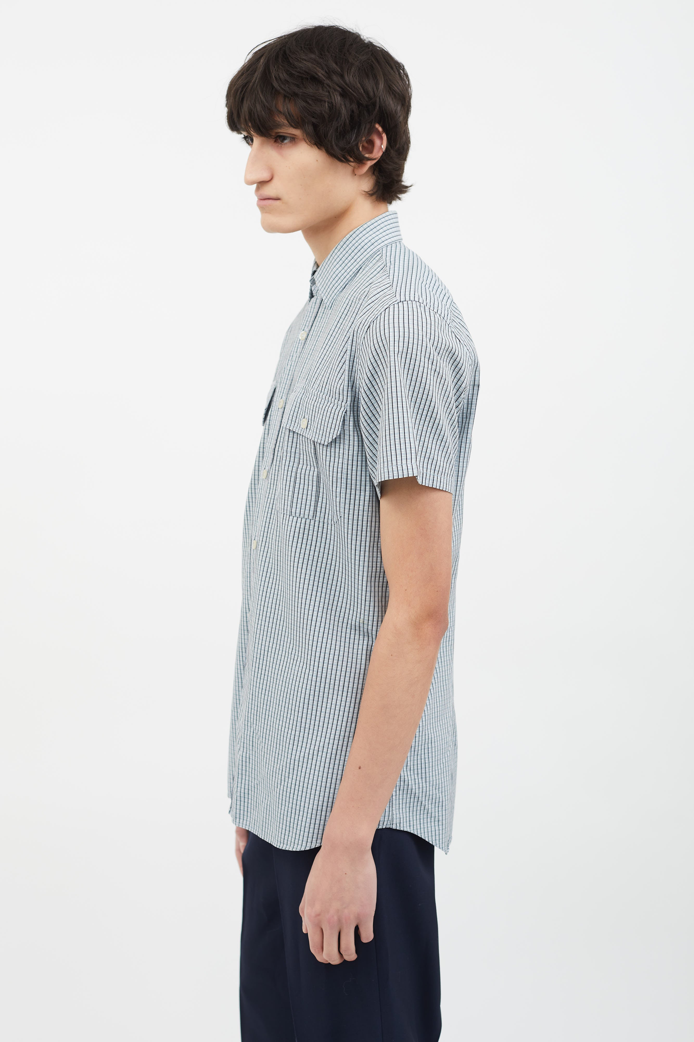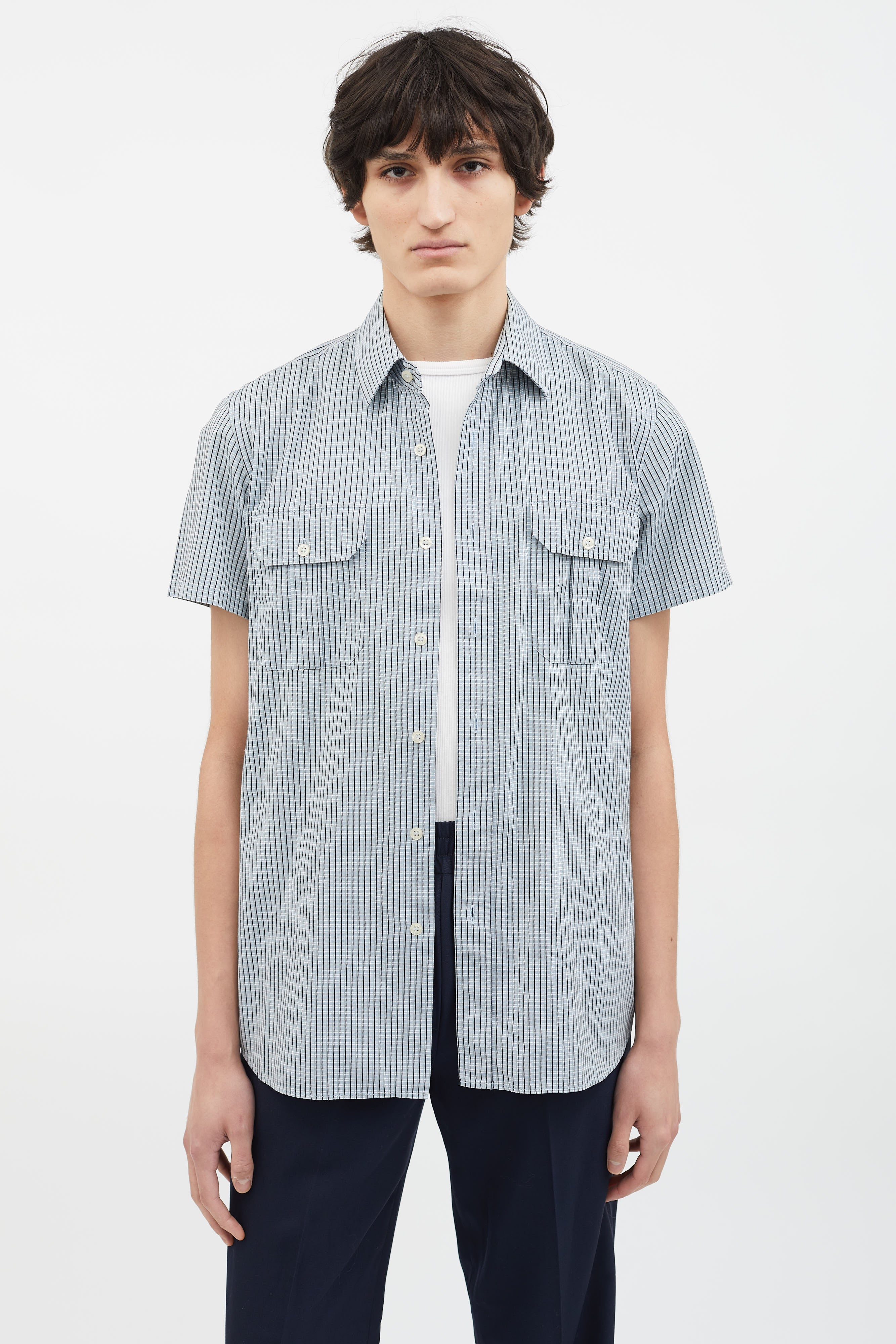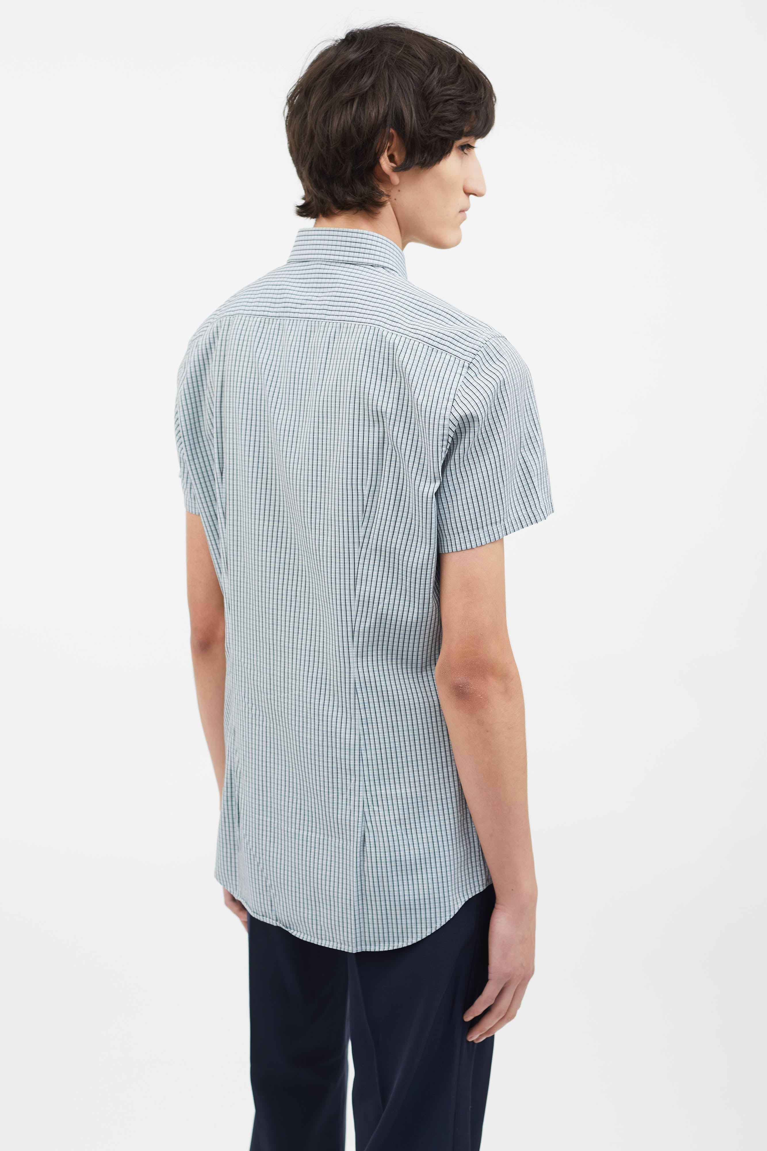 Pre-owned Prada blue, black and grey shirt featuring a spread collar, short sleeves, seven button-down closure, two flap pockets with button closure at front chest, multicolor striped pattern throughout and round hem.