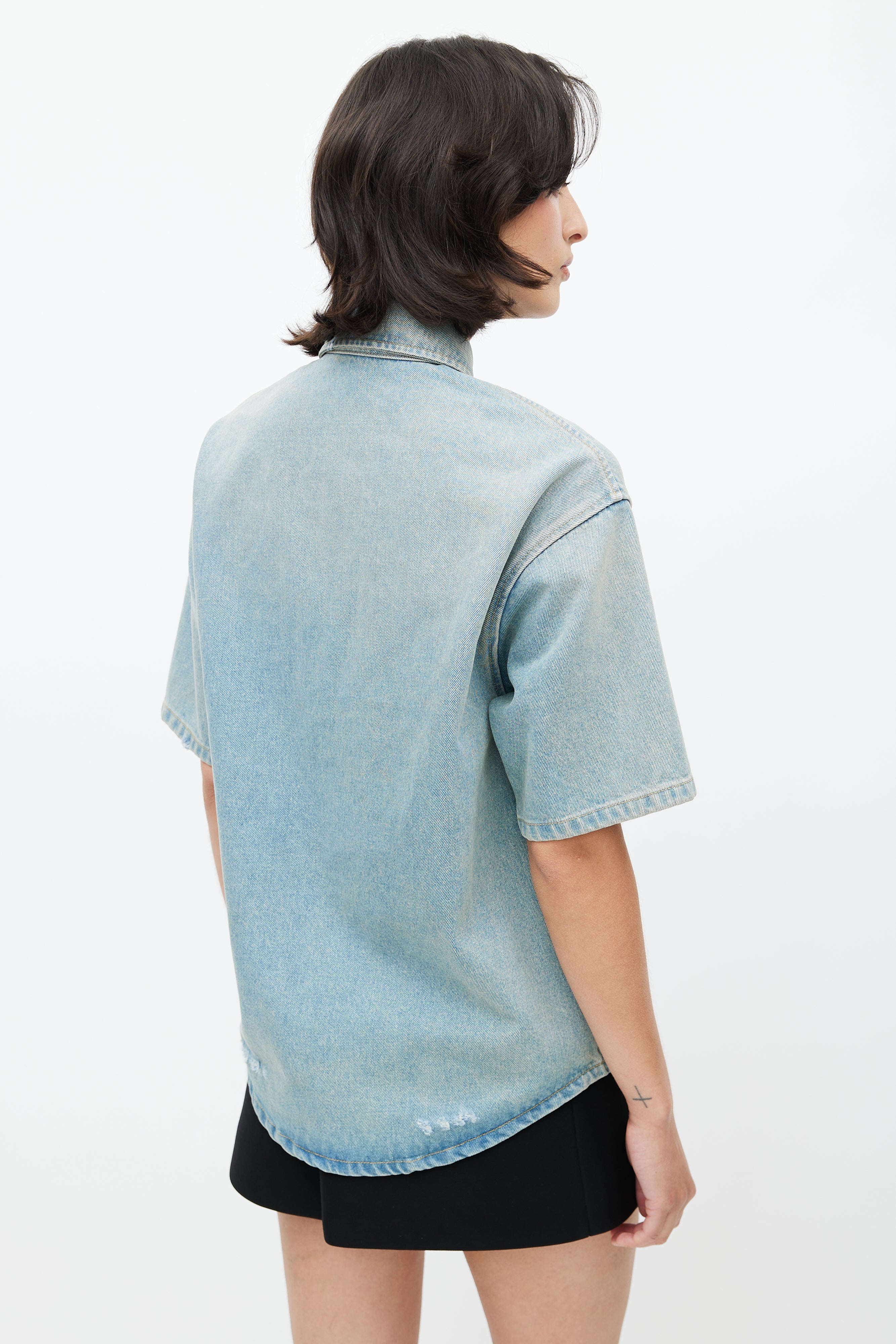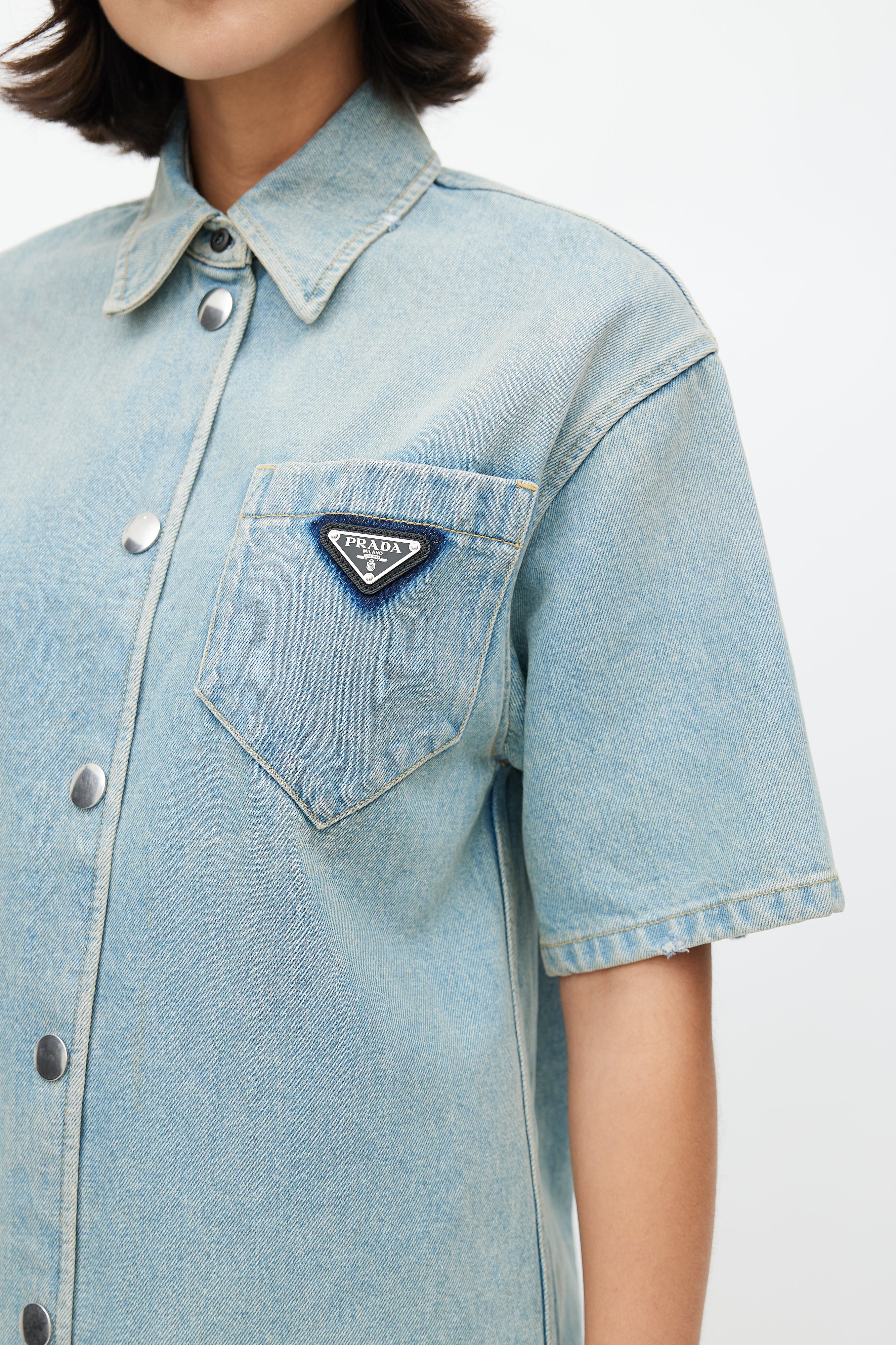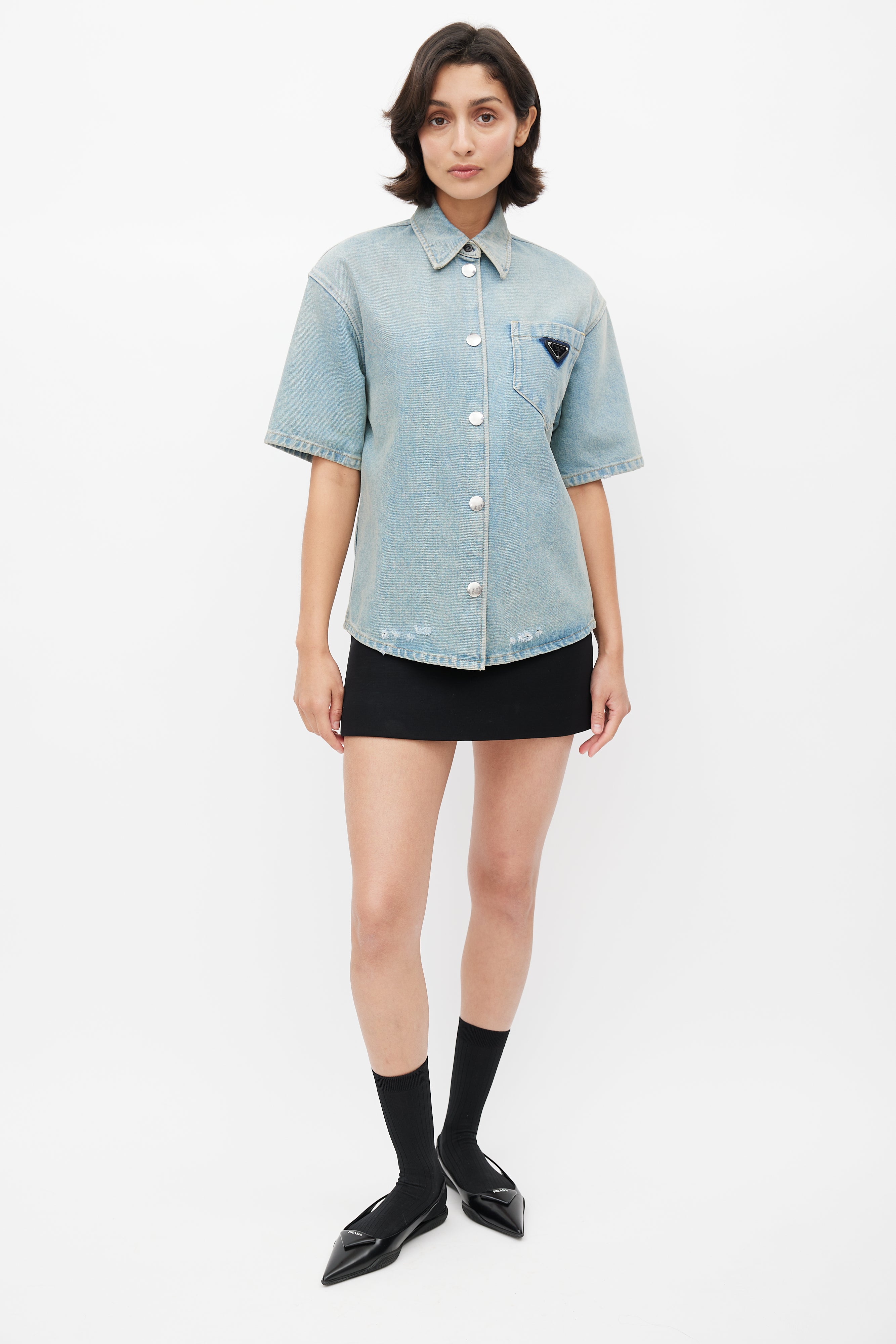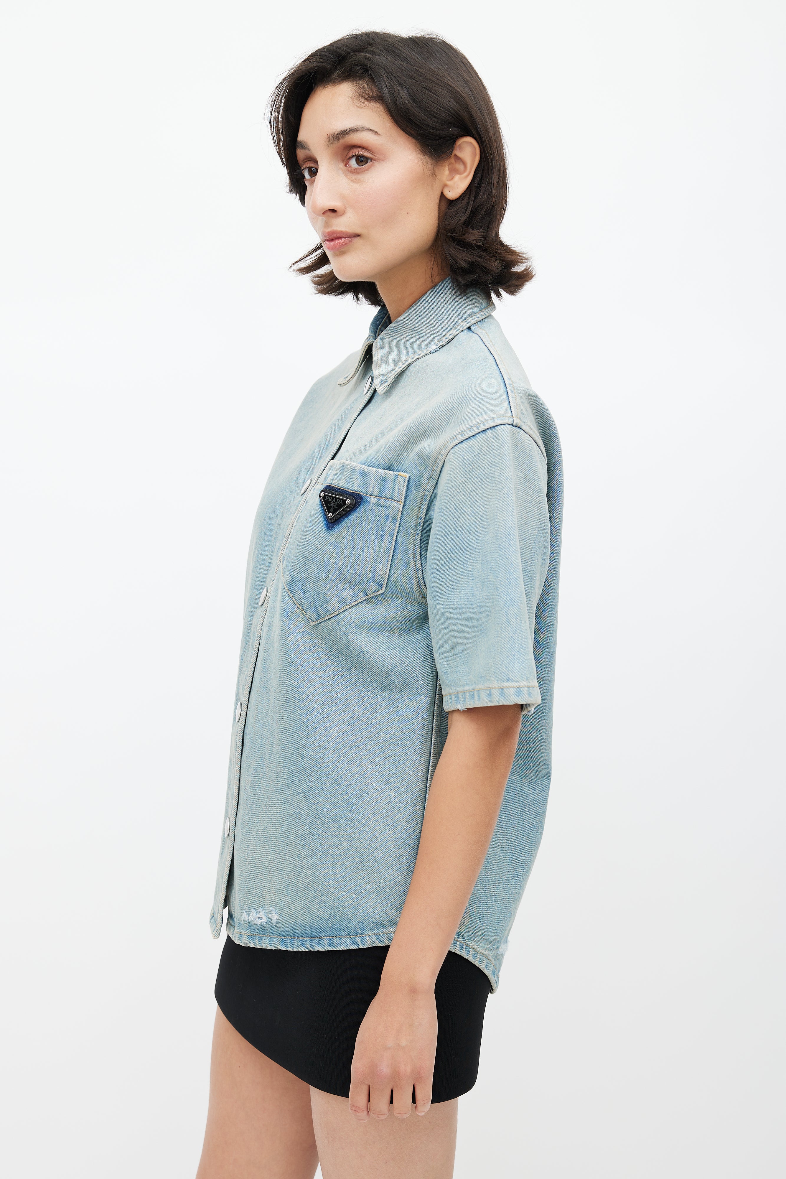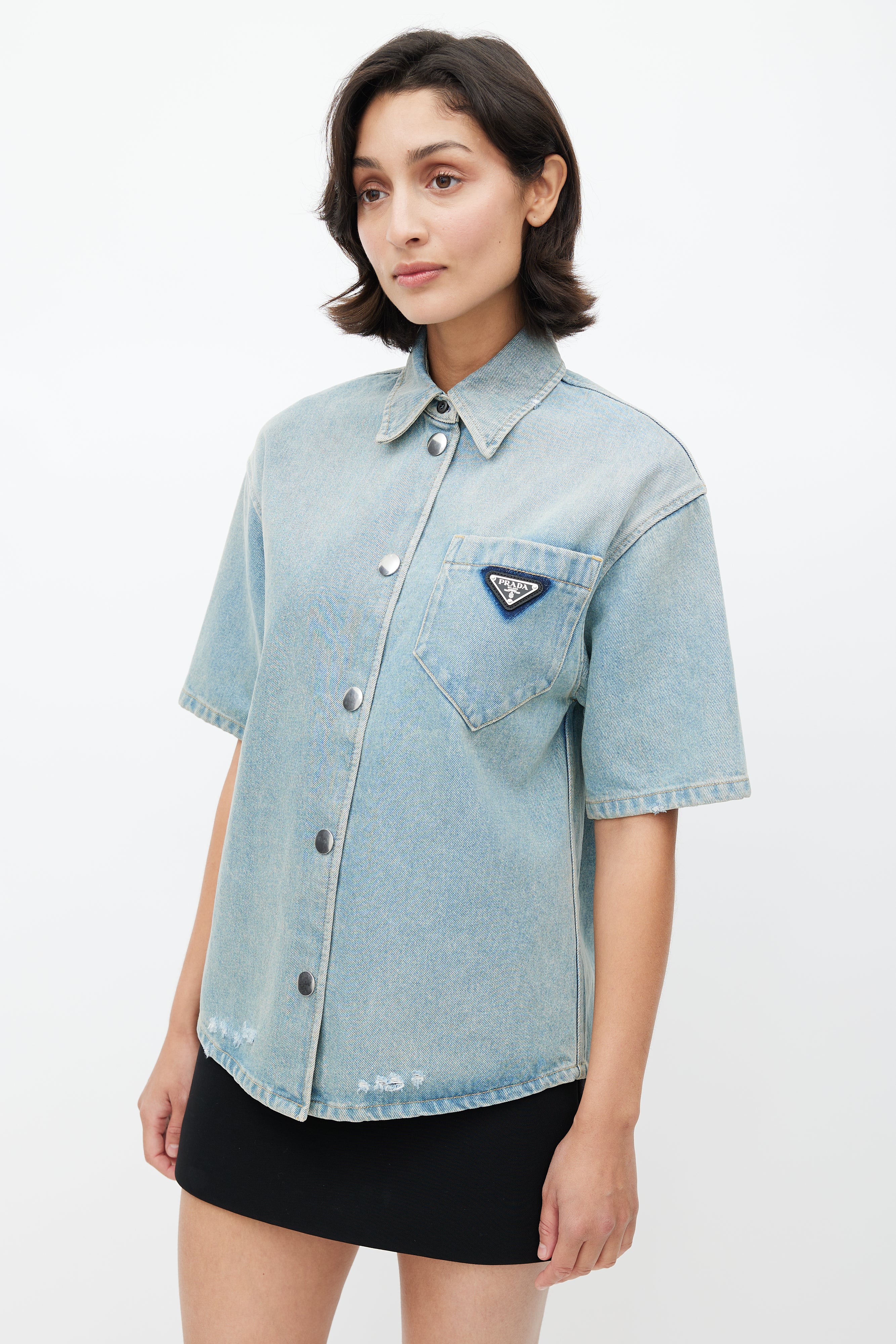 Pre-owned Prada blue denim washed shirt featuring a pointed collar, one slip pocket at chest with logo hardware, short sleeves, intentional distressing at hem, and button up front.