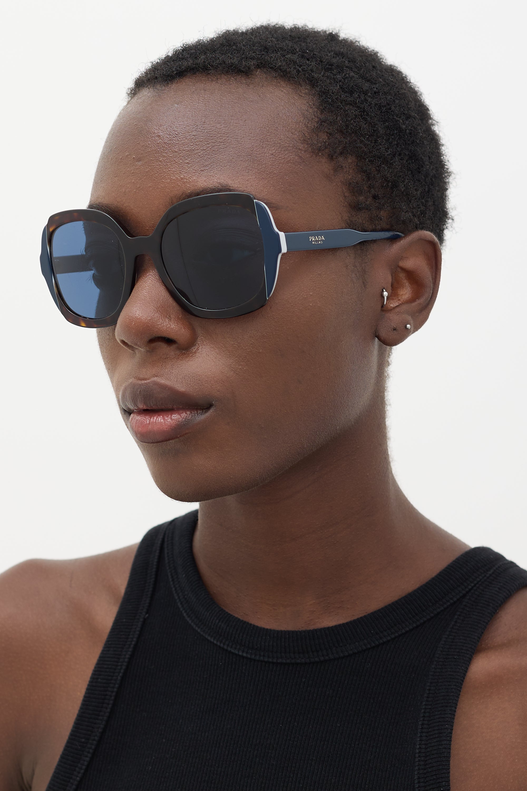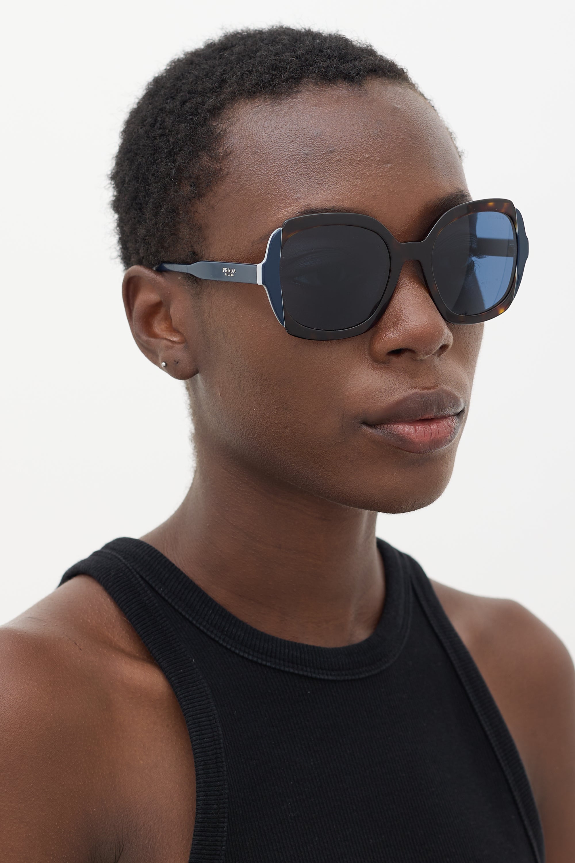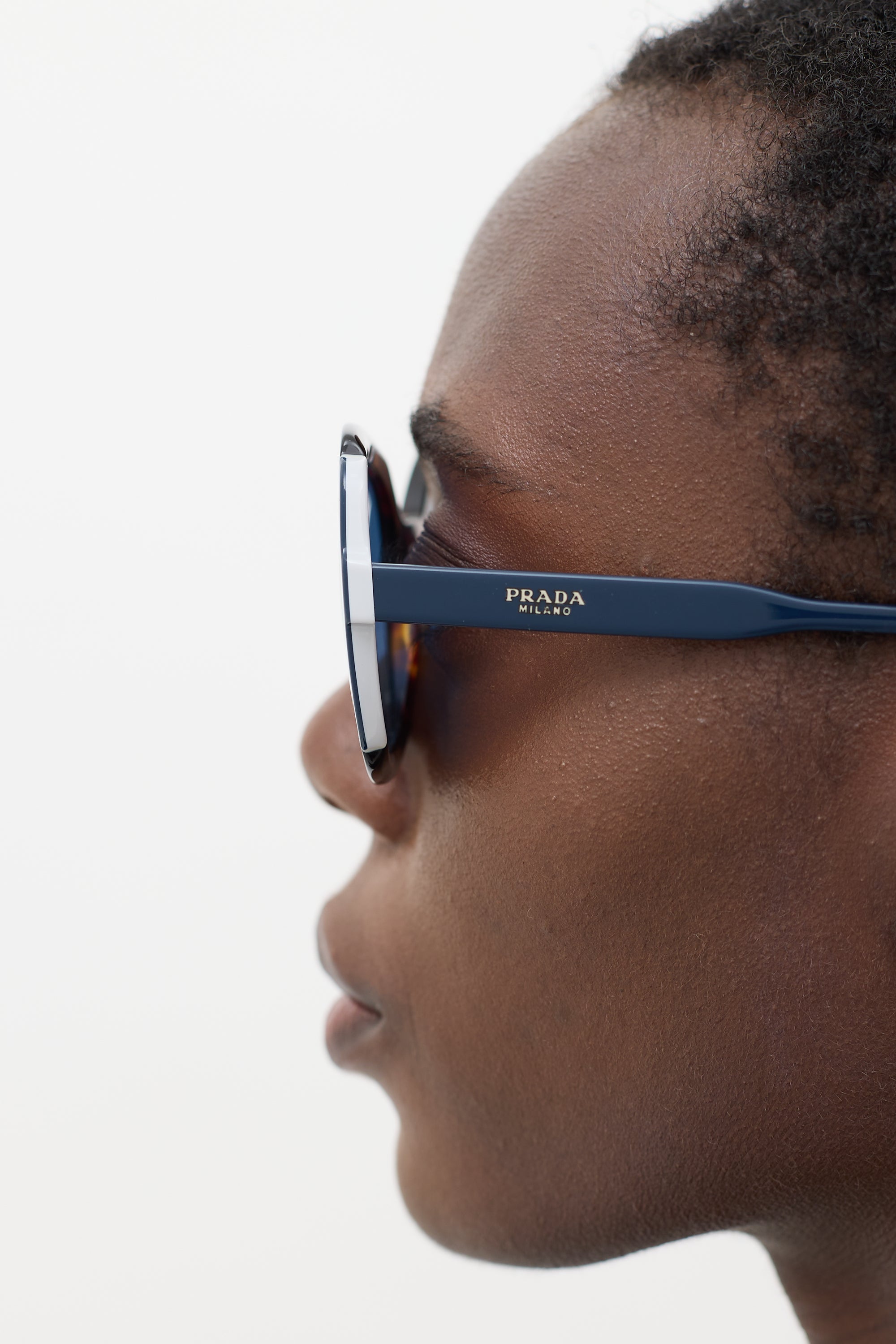 Pre-owned Prada brown SPR16U sunglasses featuring a circular tortoise shell frame, tinted lenses, nose pads, blue tone arms, and logo hardware at temples. Comes with original case and box.