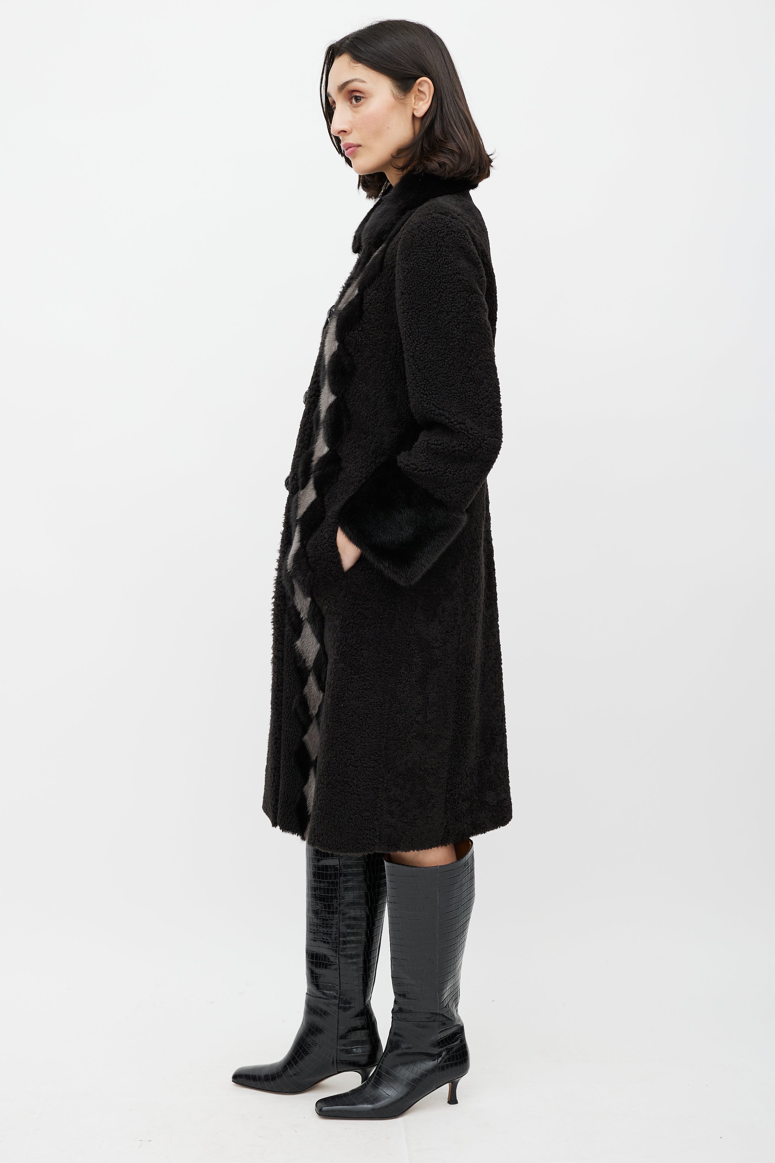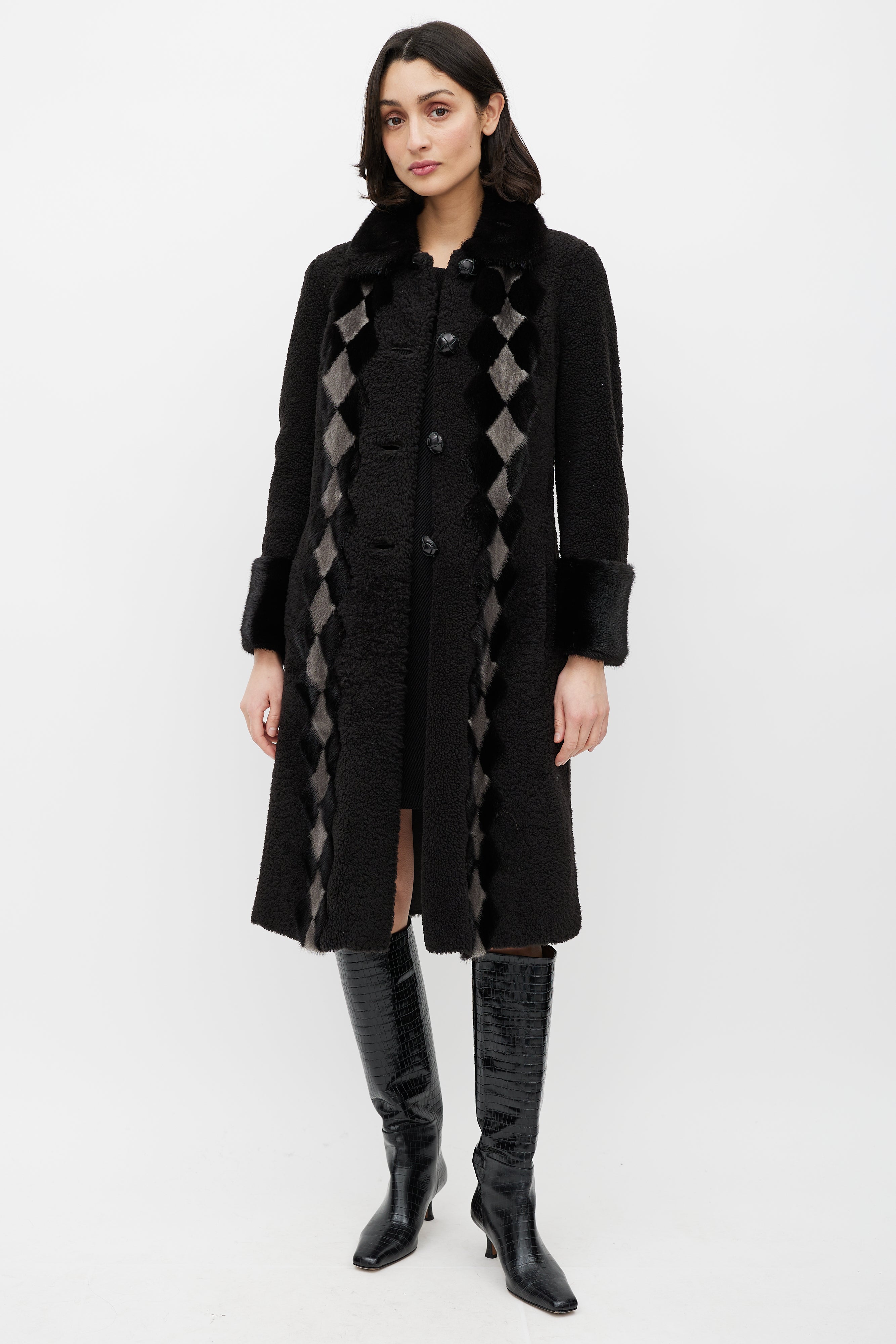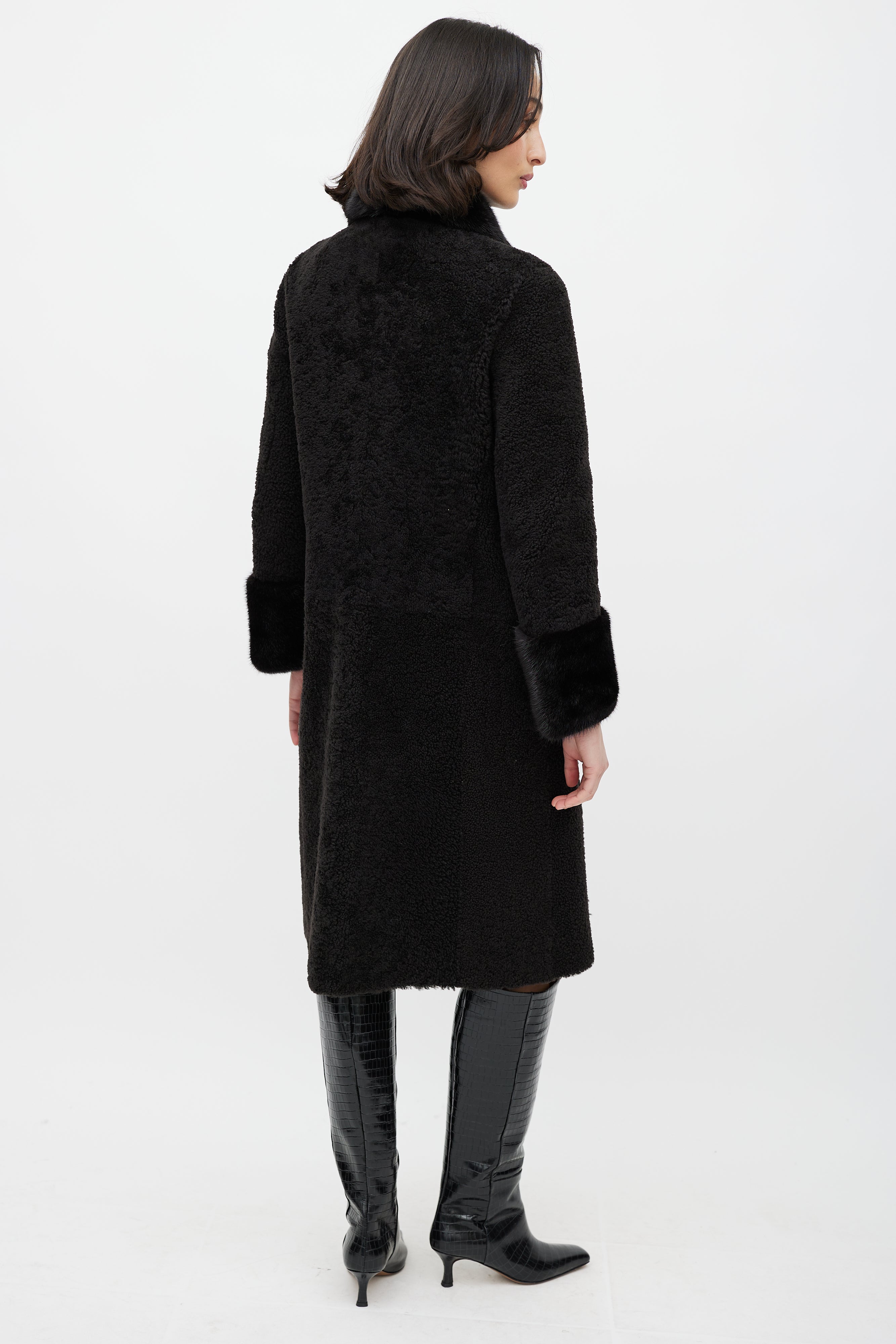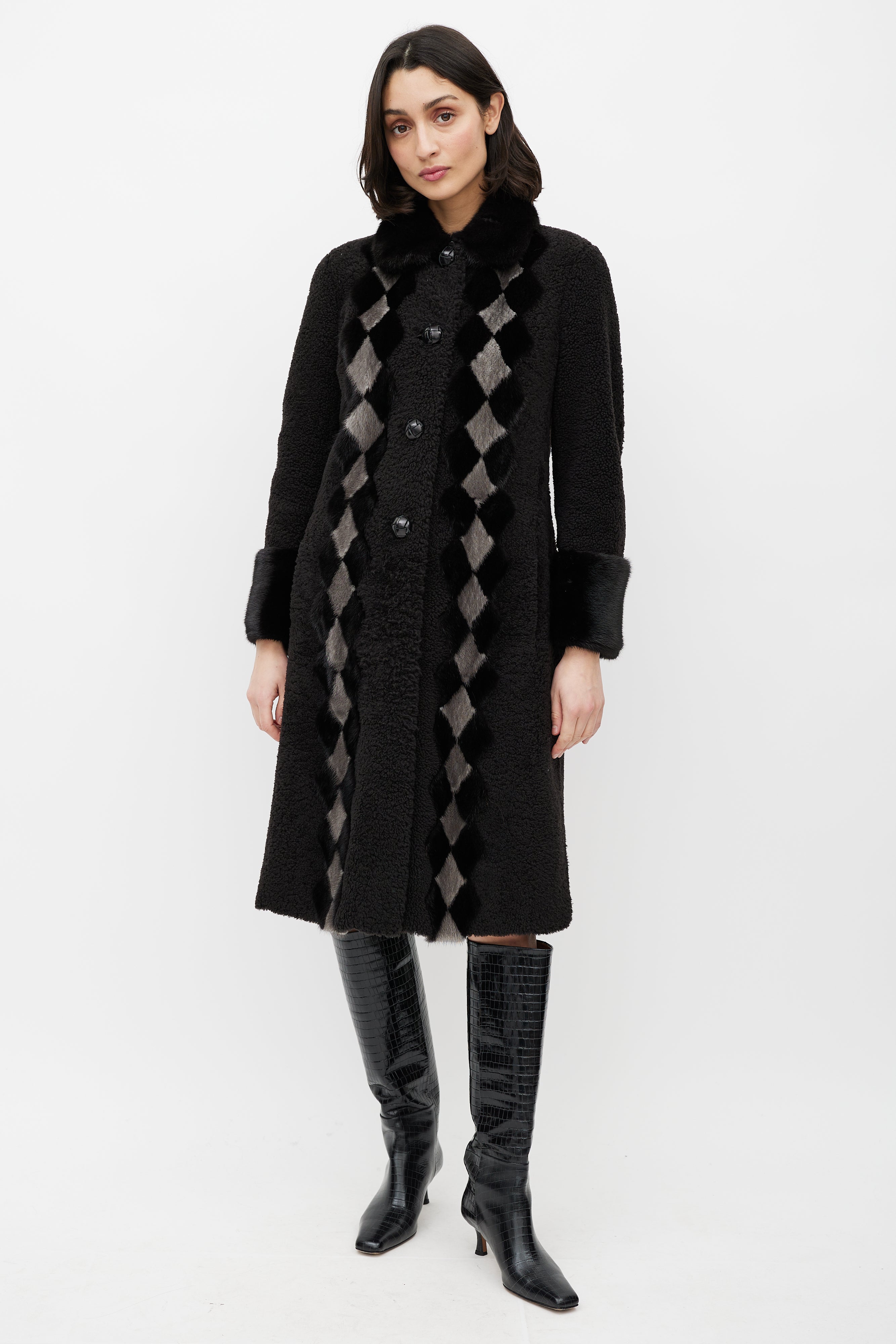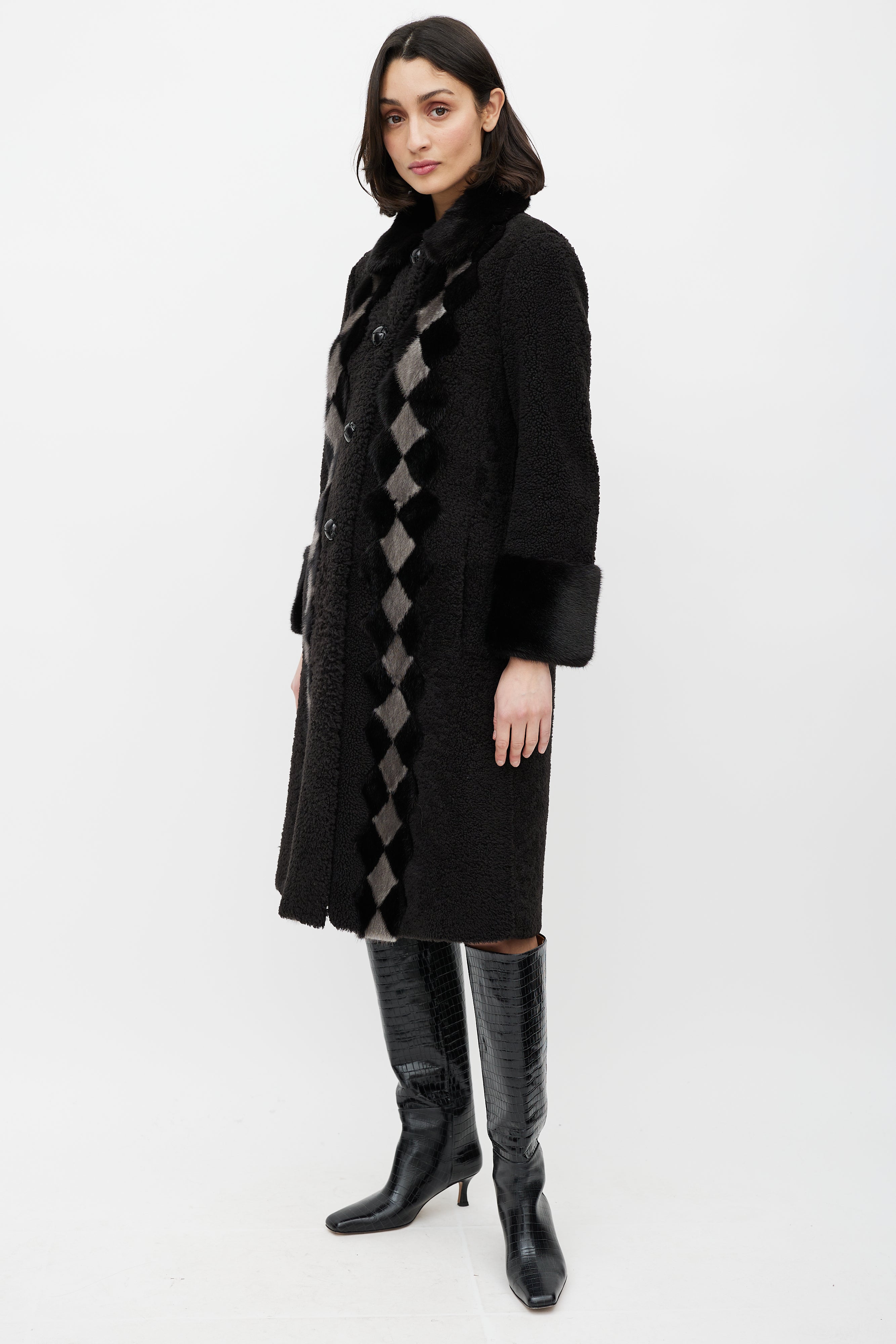 Pre-owned Prada brown shearling coat featuring a pointed mink fur collar, cream diamond trim at front, long sleeves with fur trim cuffs, two slip pockets at hip, and button up closure.
