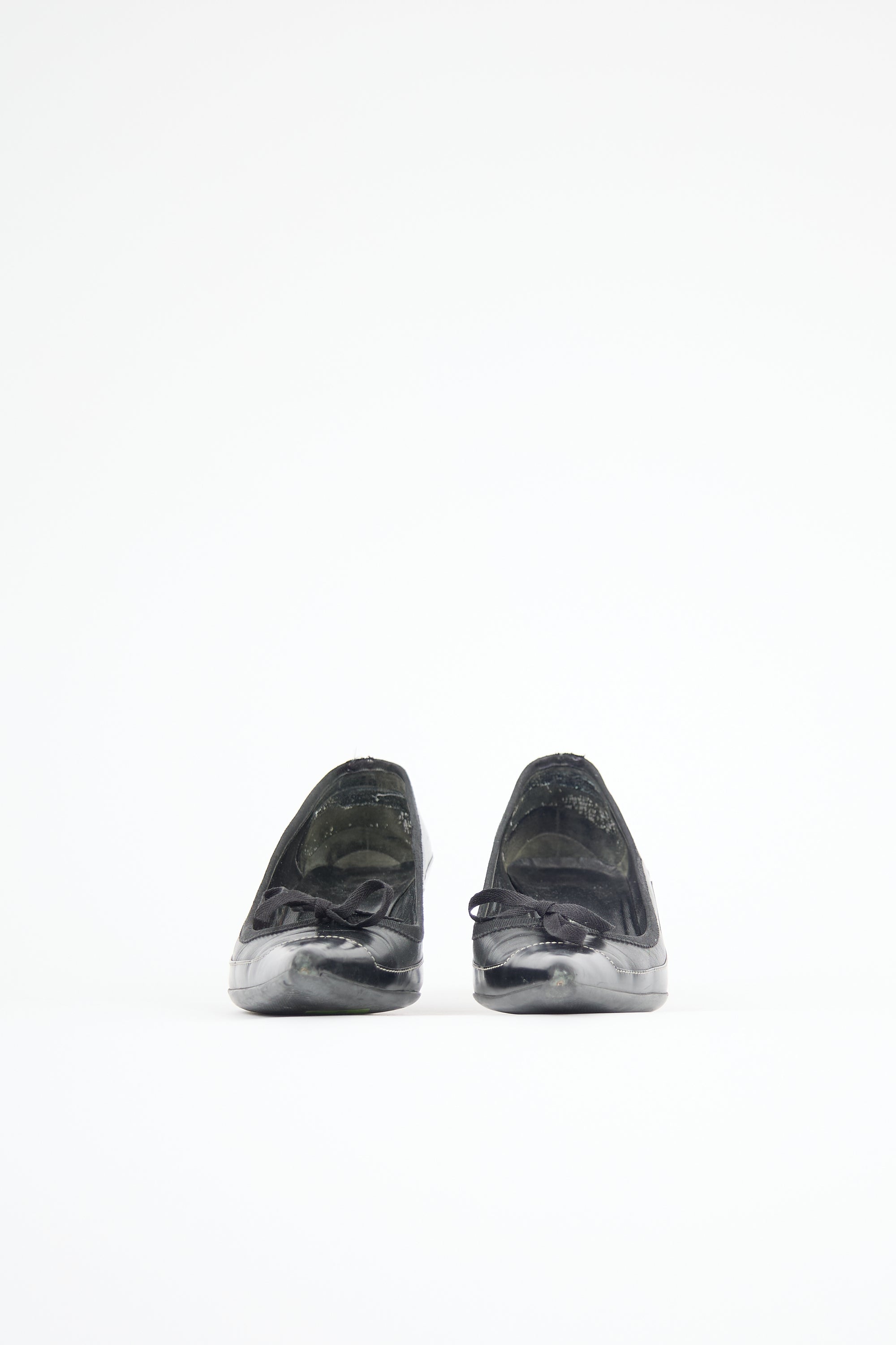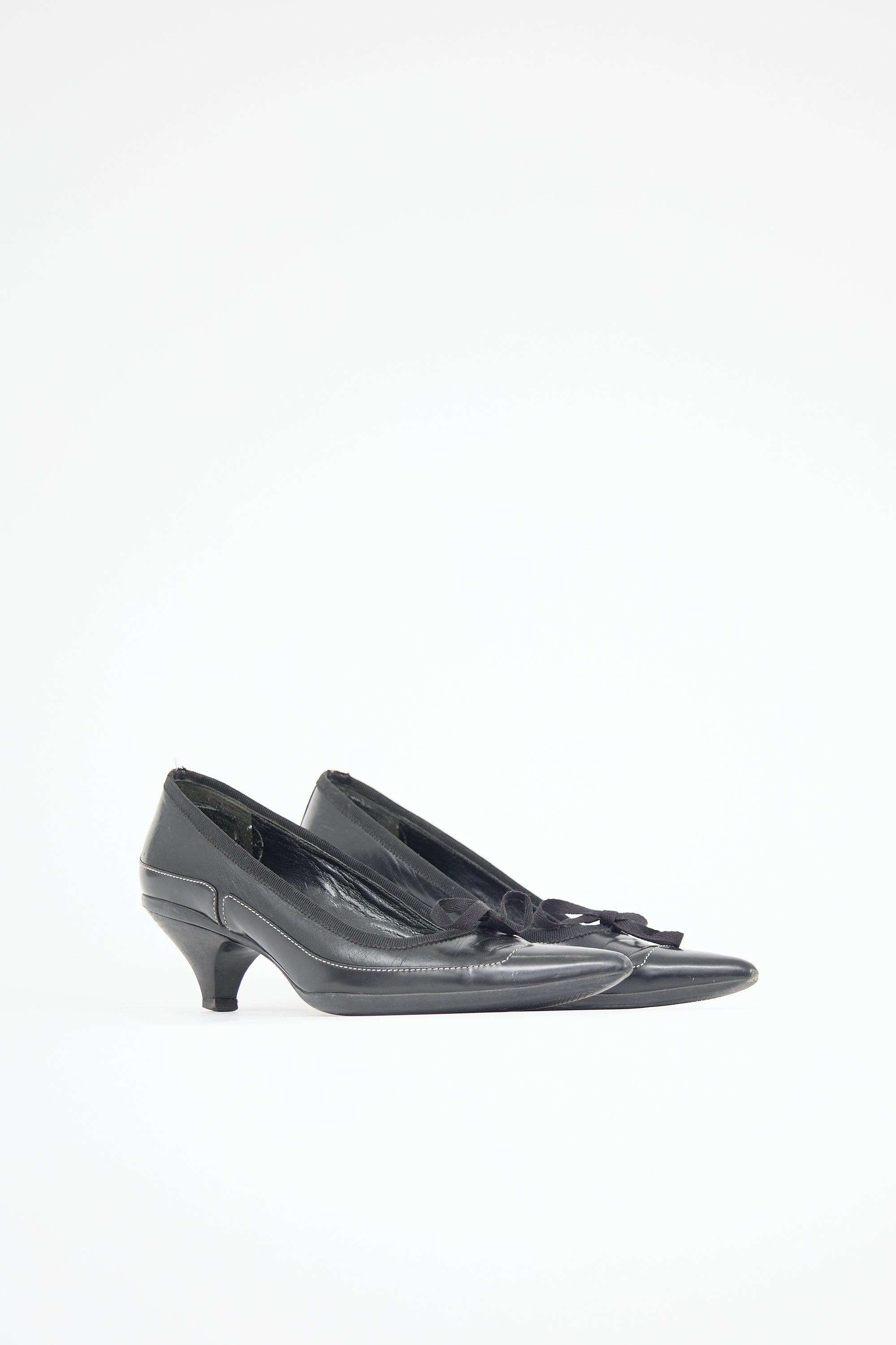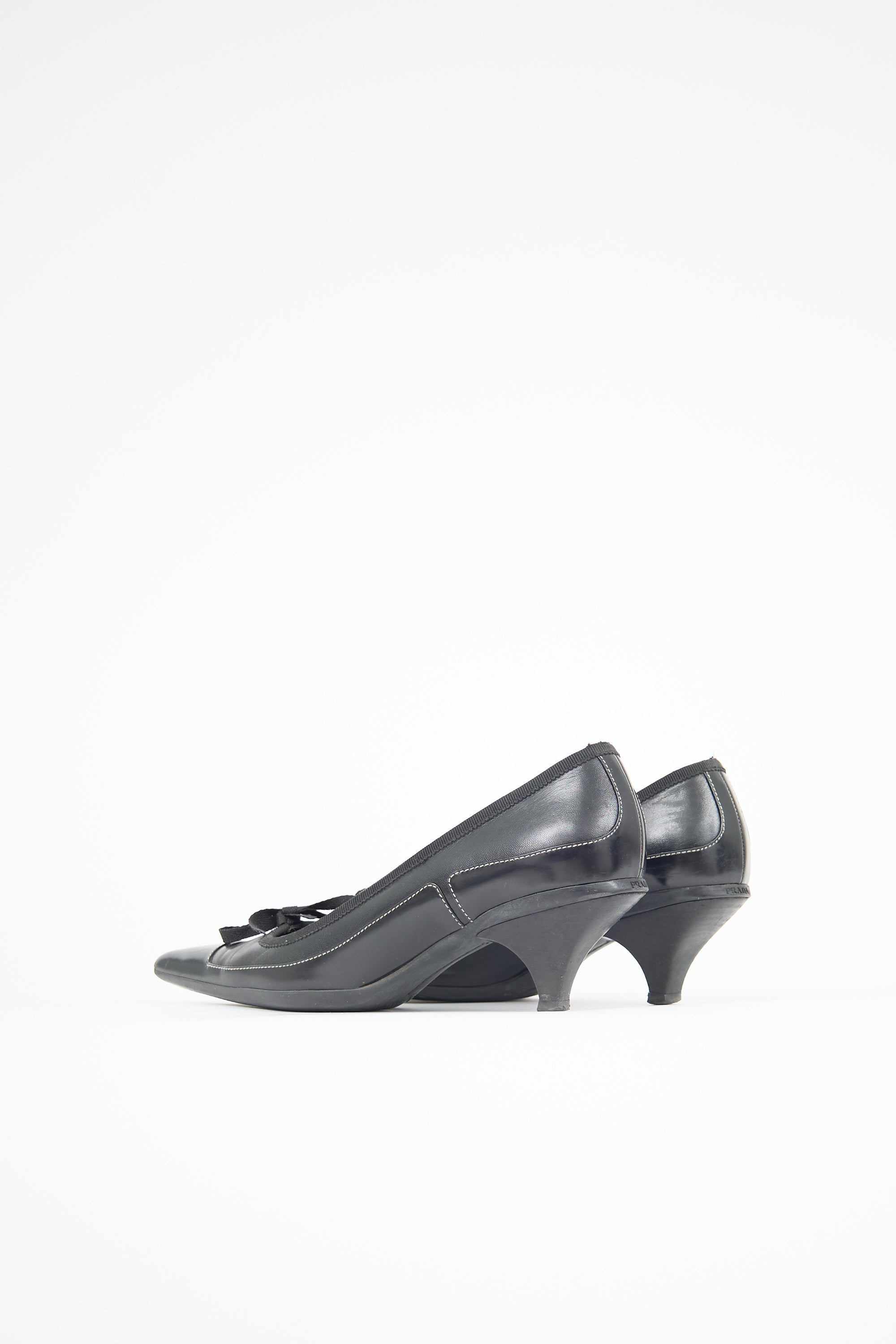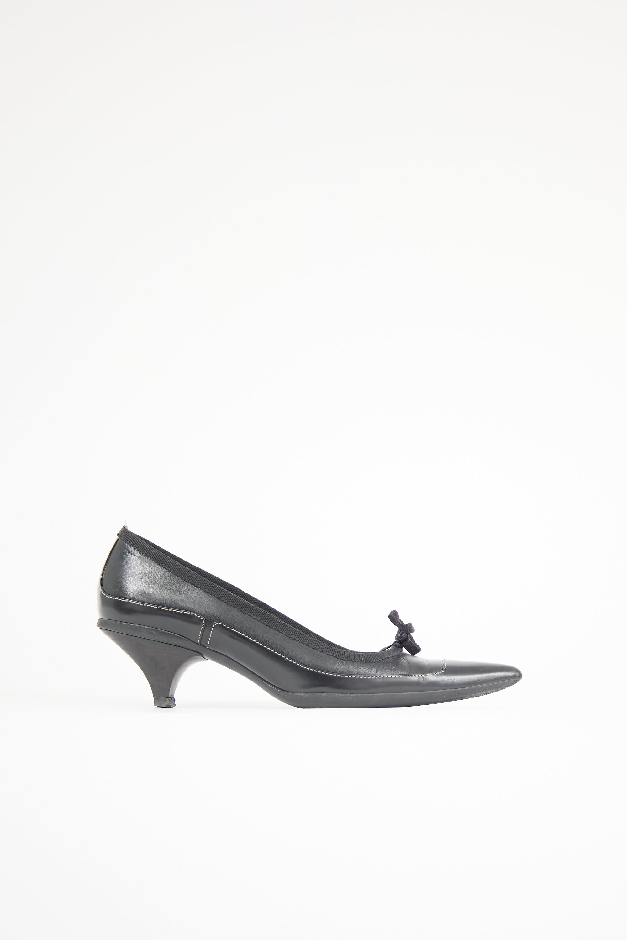 Pre-owned Prada black leather pumps featuring pointed toe, panelled upper with white contrast stitching, grosgrain topline trim, bow at vamp, debossed logo at counter, and kitten heel.