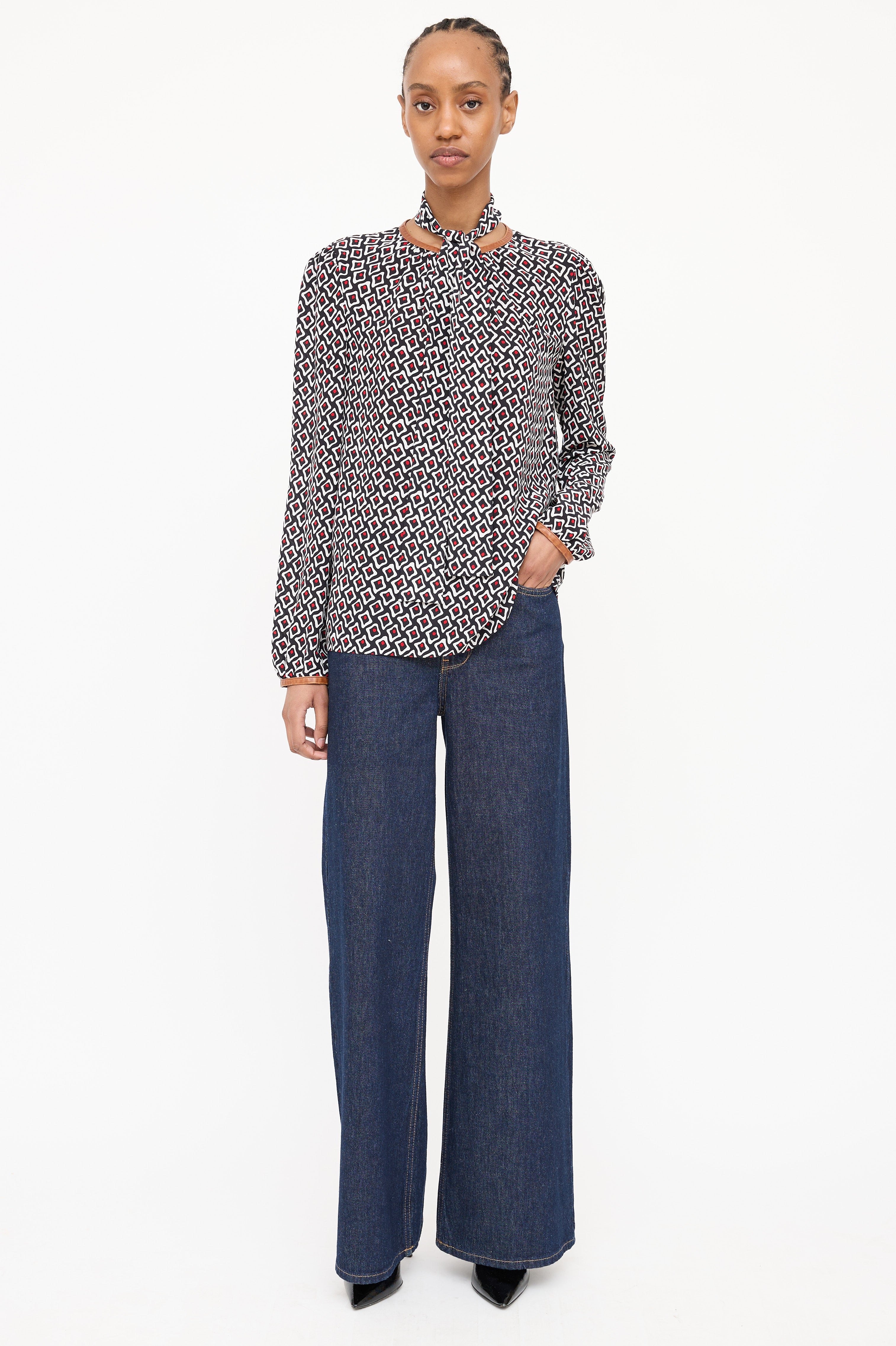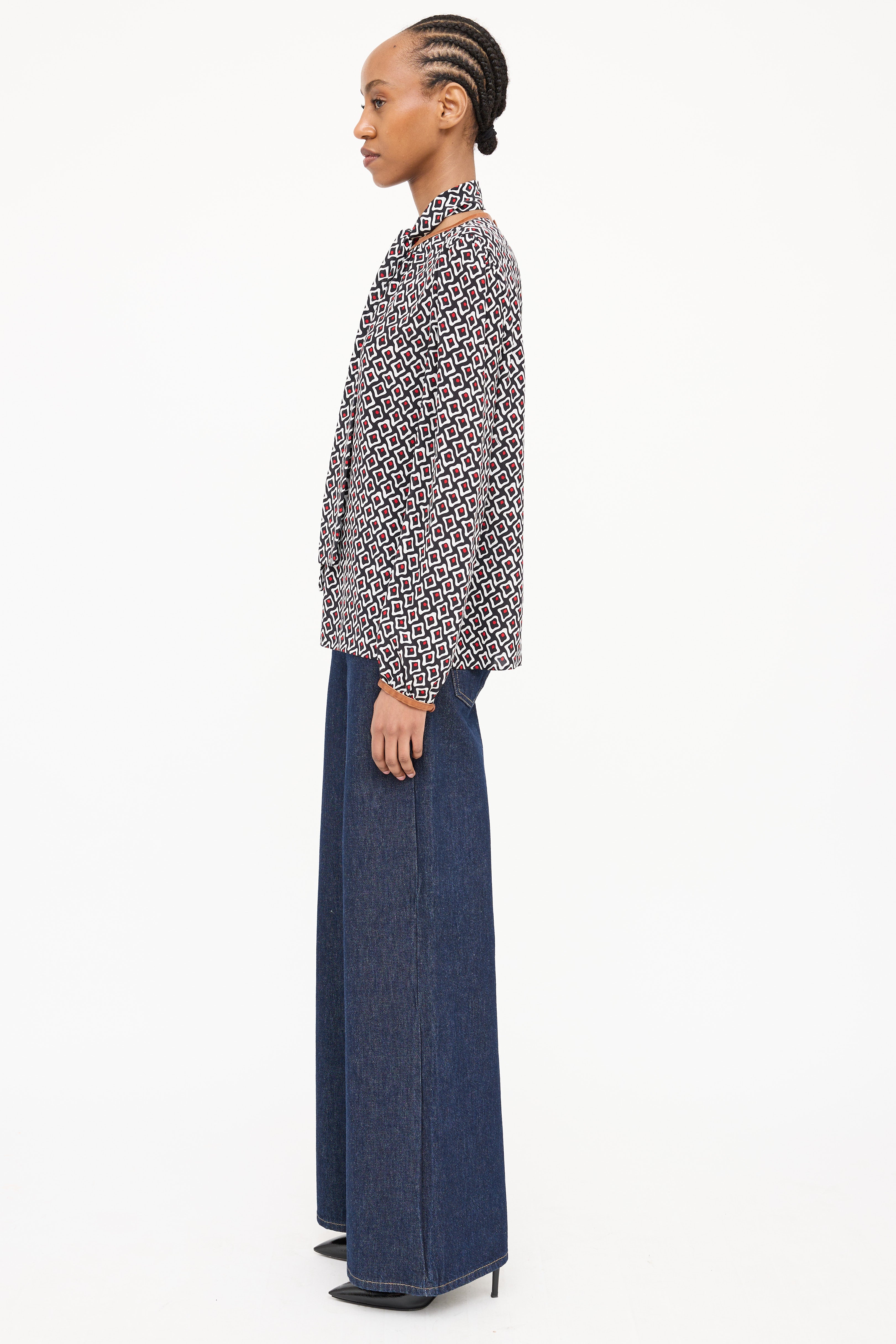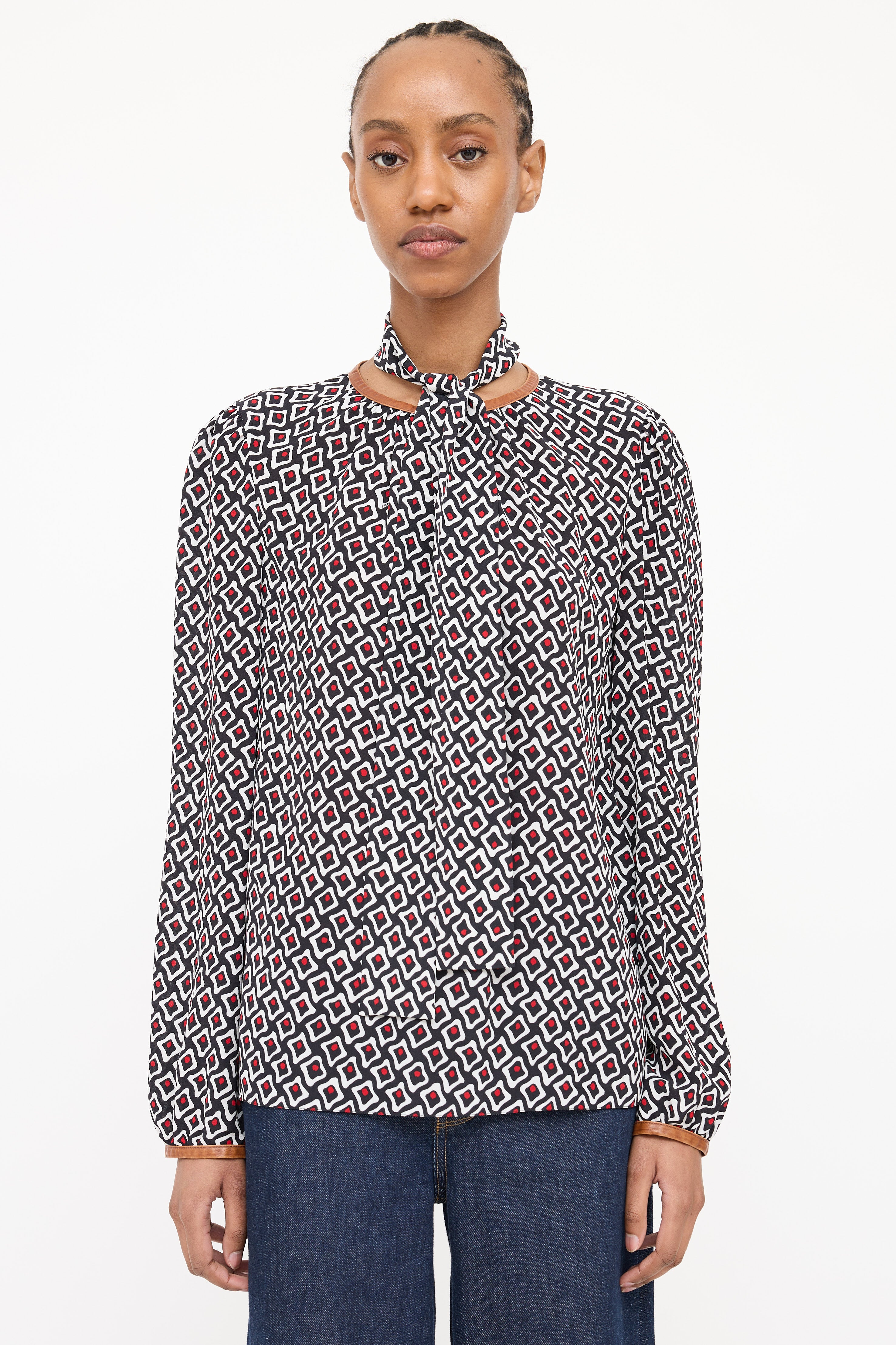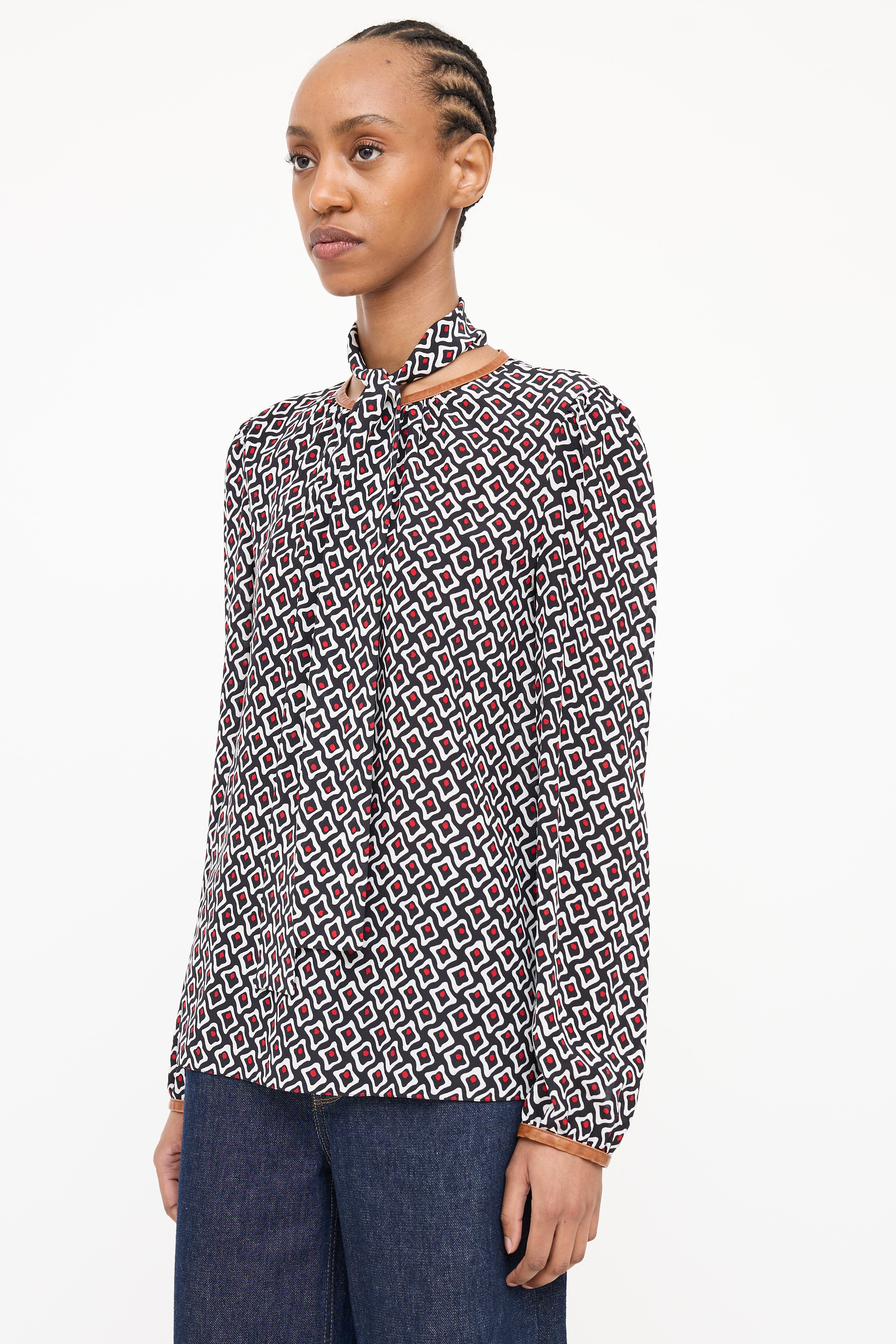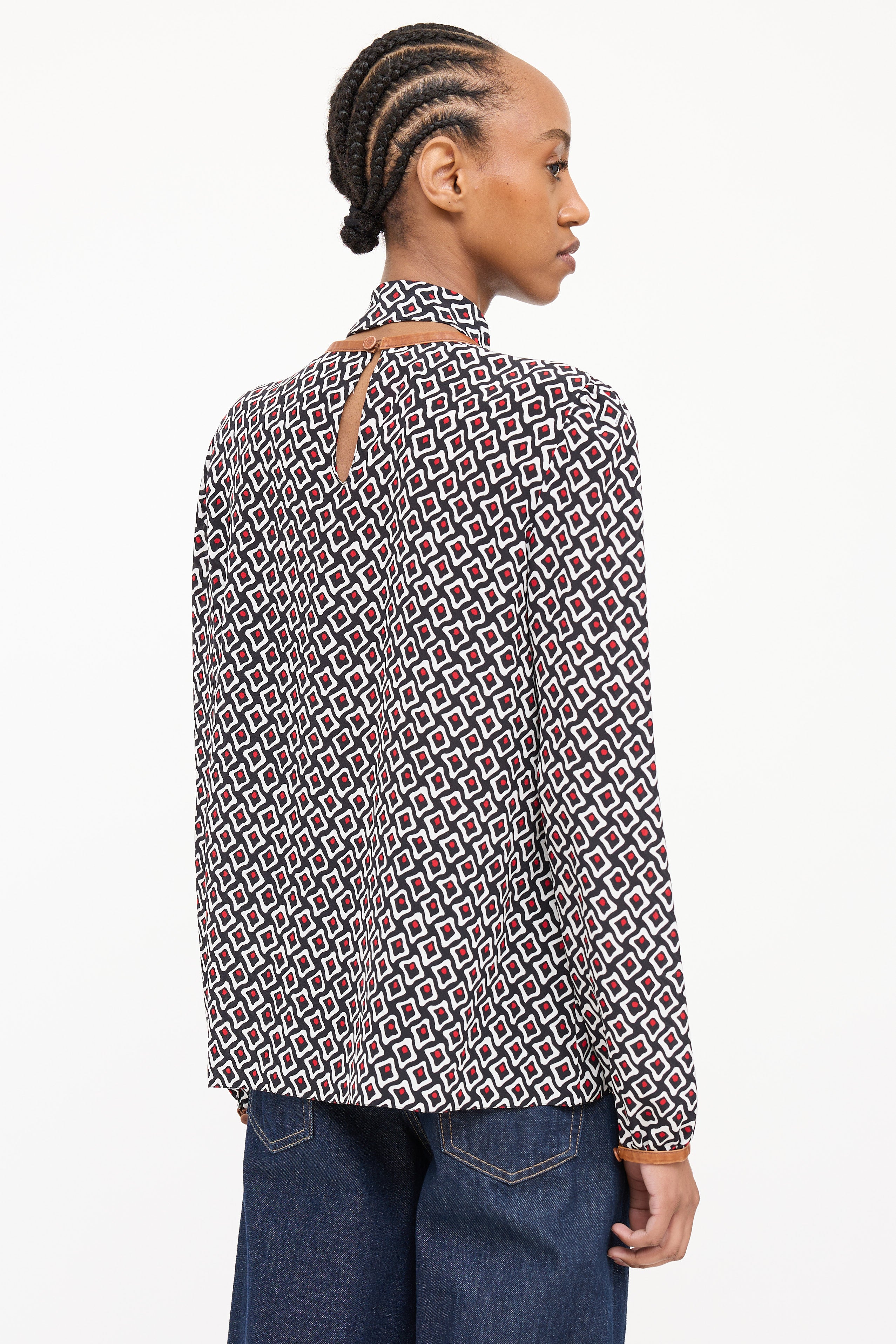 Pre-owned Prada black silk top featuring a white geometric pattern throughout, round neckline with brown leather trim, long sleeves, tie detail at neck, and button closure at back.