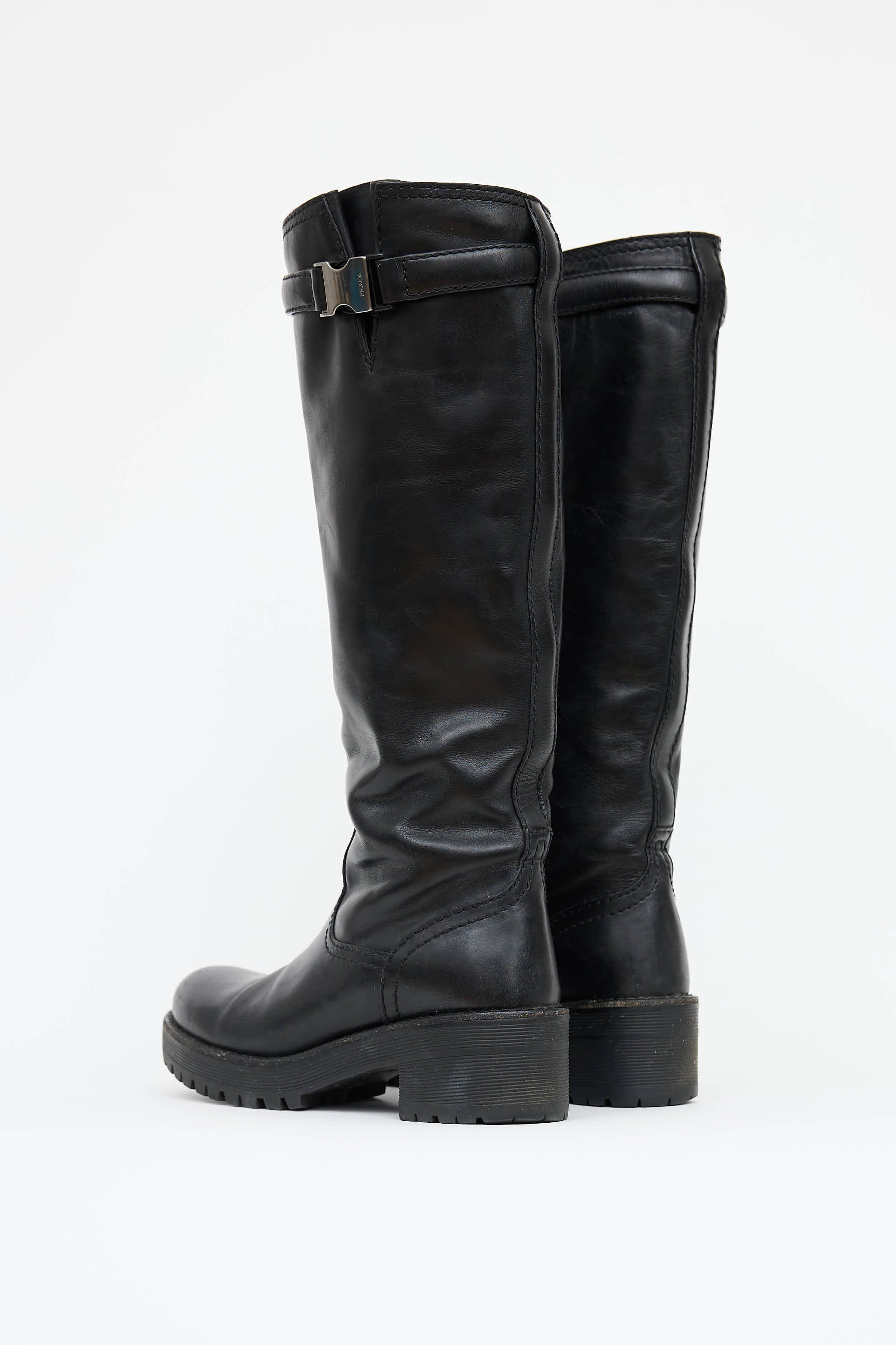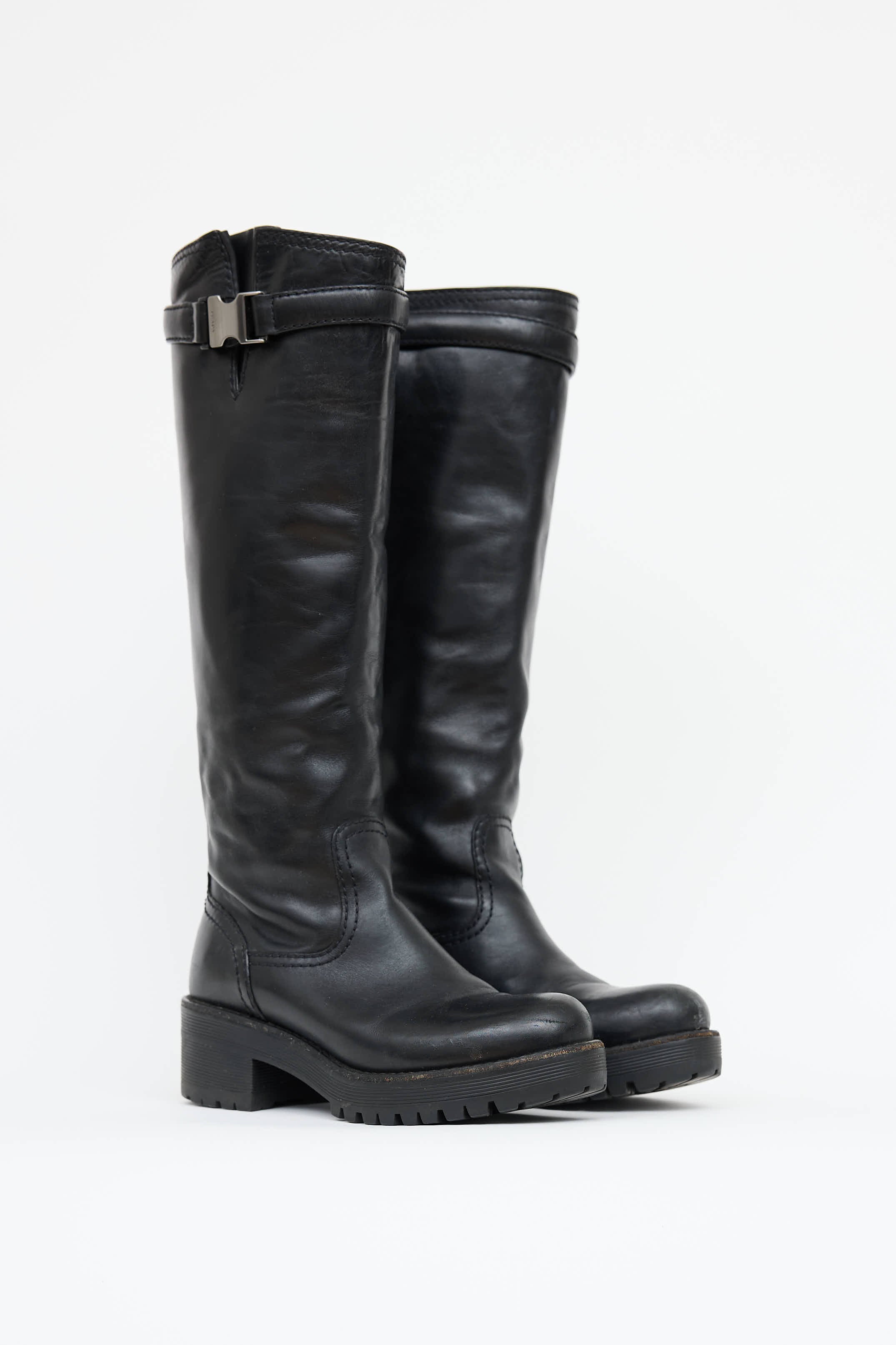 Pre-owned Prada Sport black boots featuring round toe, treaded outsole, platform midsole, block heel, slip on entry, strap with silver tone logo stamped buckle on entry and expandable side gusset.