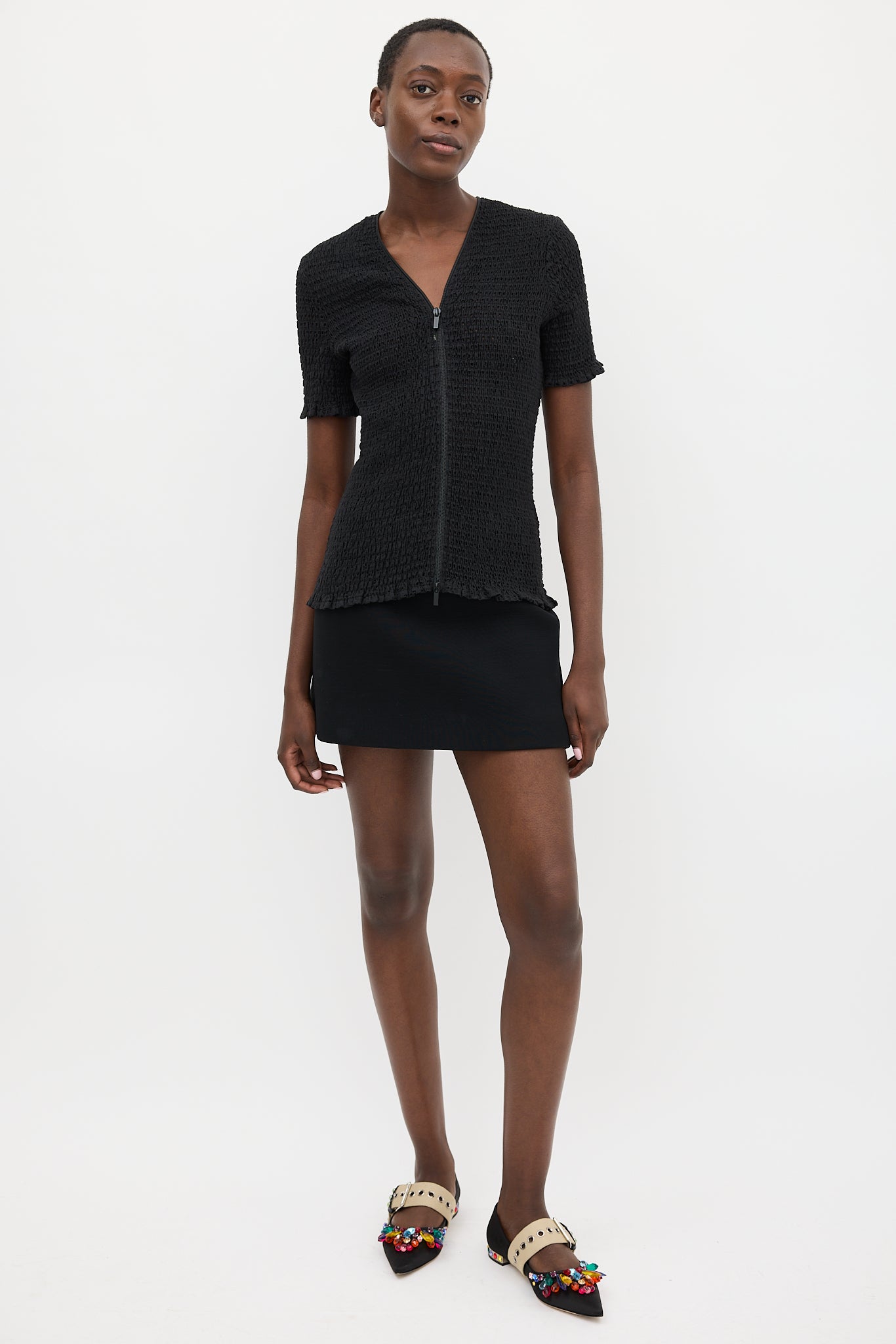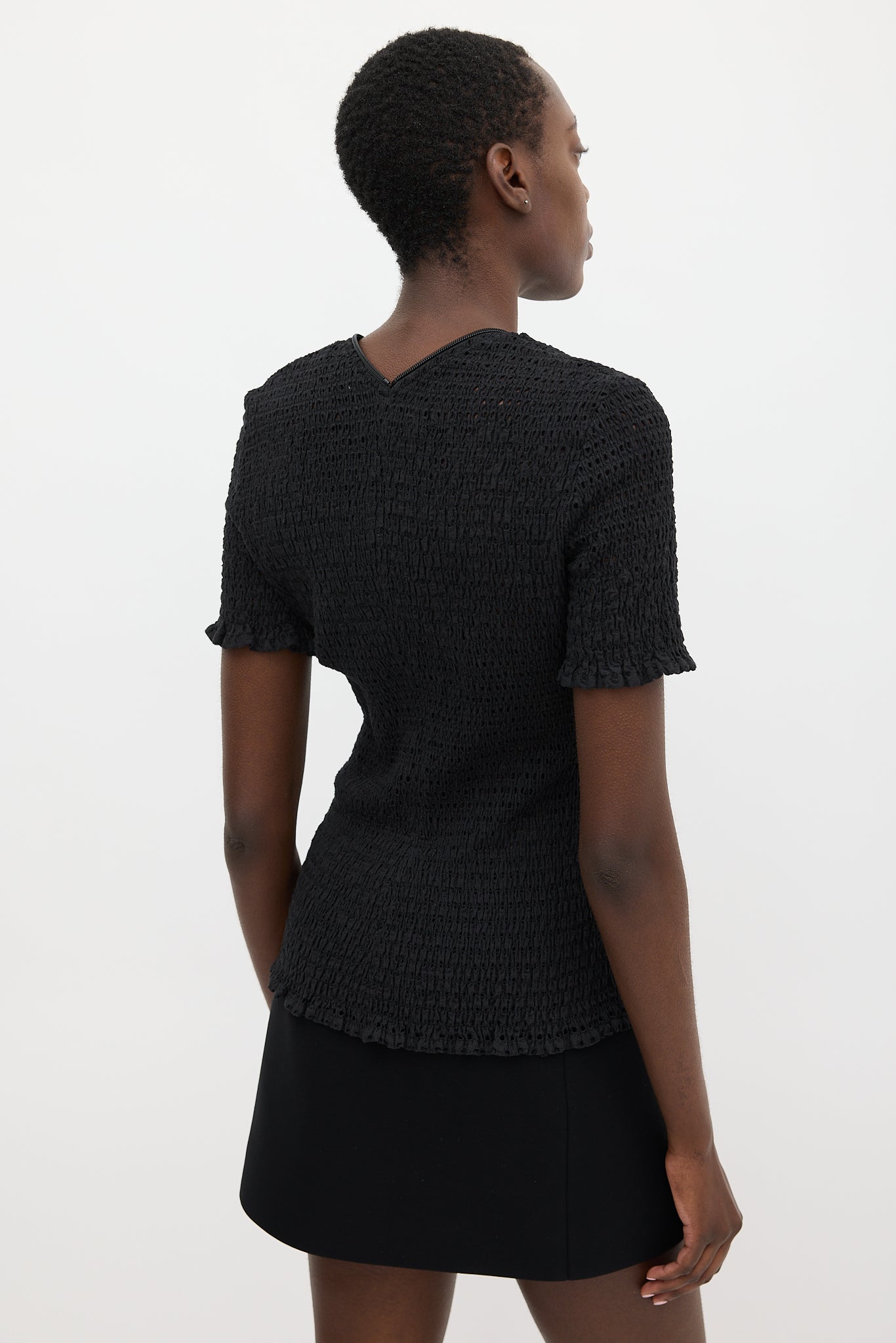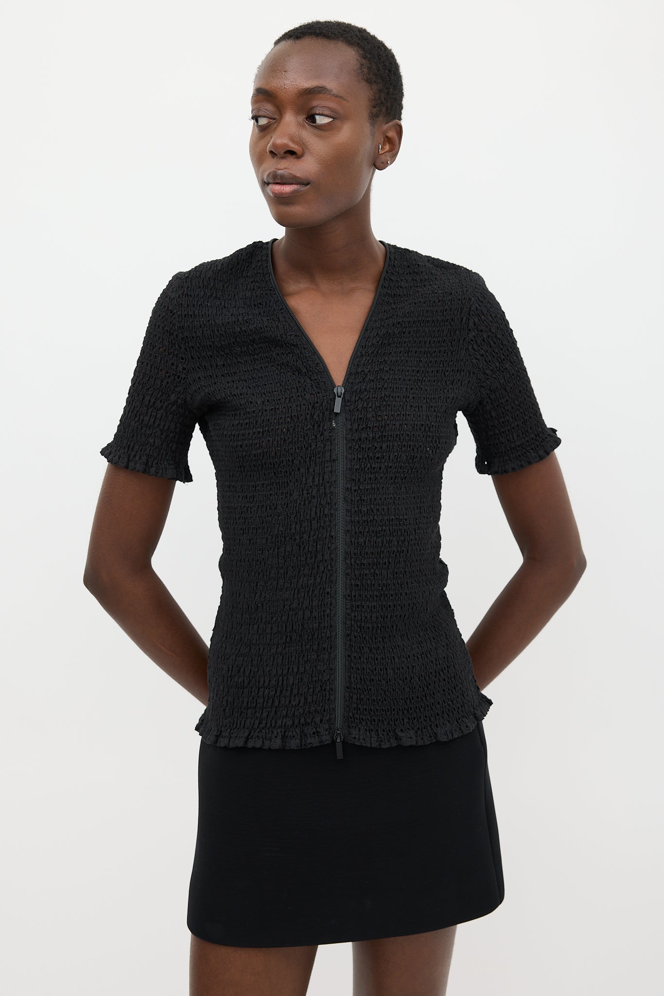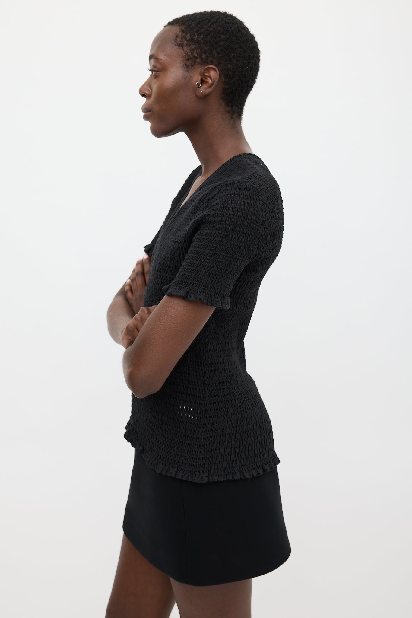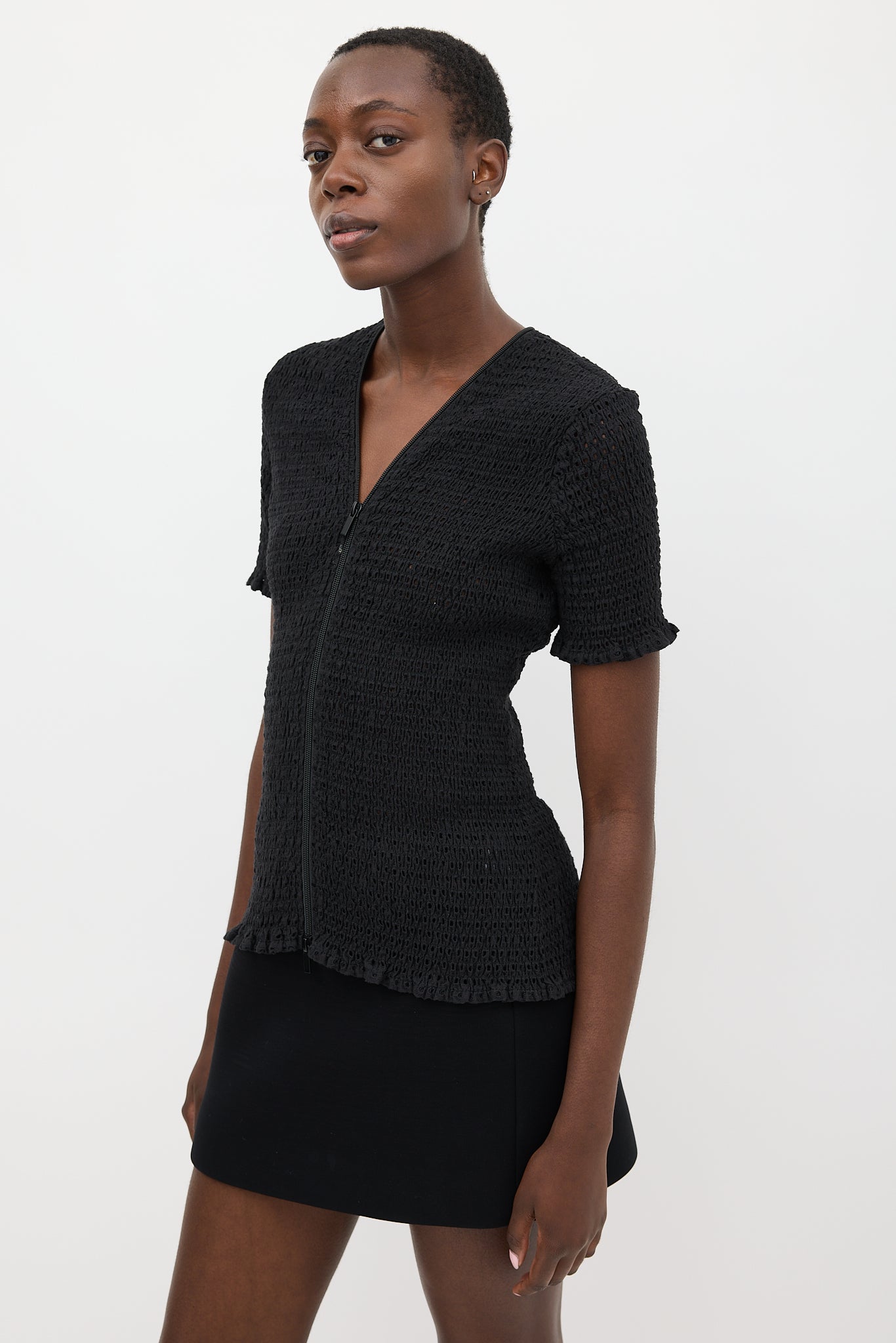 Pre-owned Proenza Schouler black top featuring a V-neckline, short sleeves, ruffled trim throughout, eyelet detailing, and front zip closure.