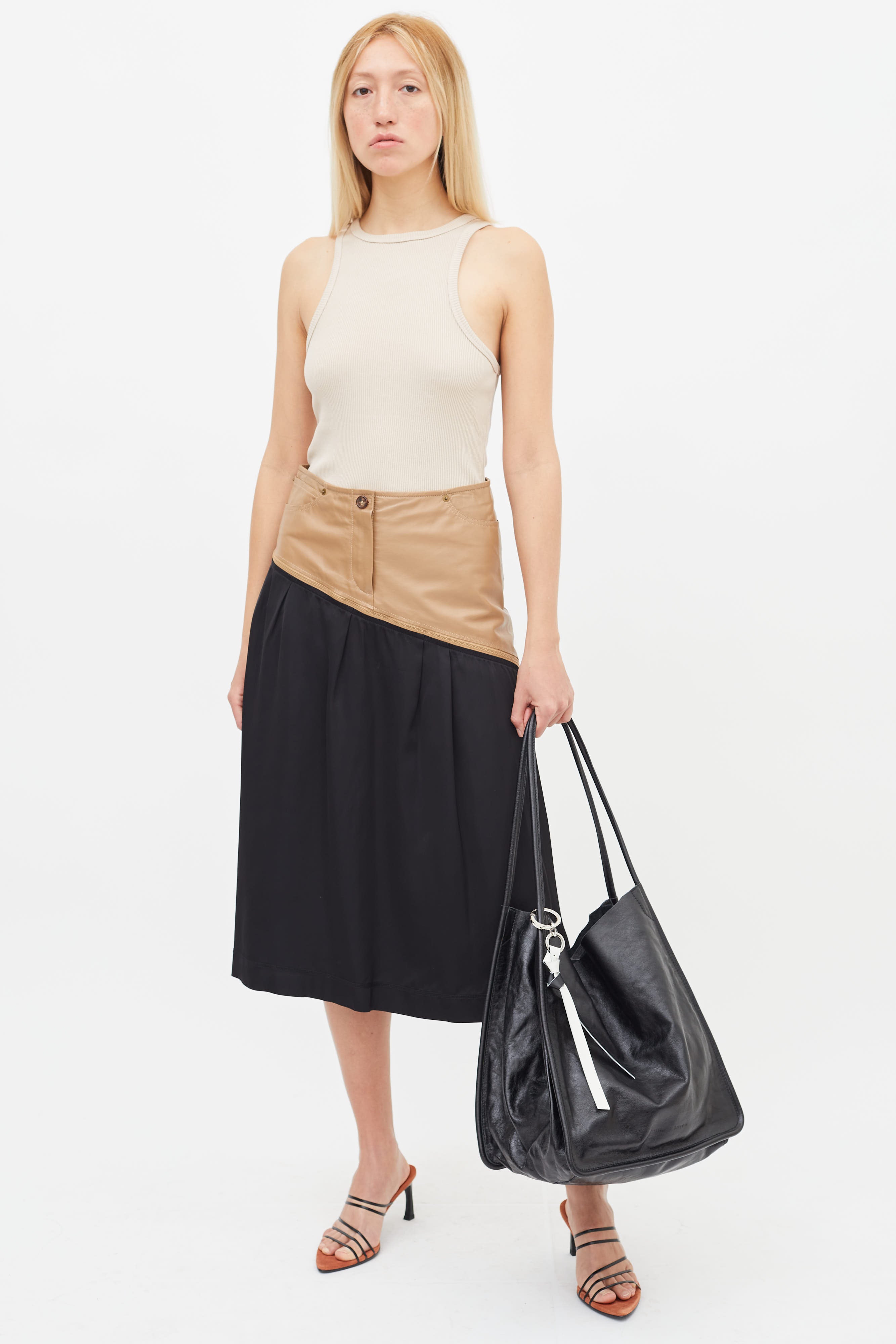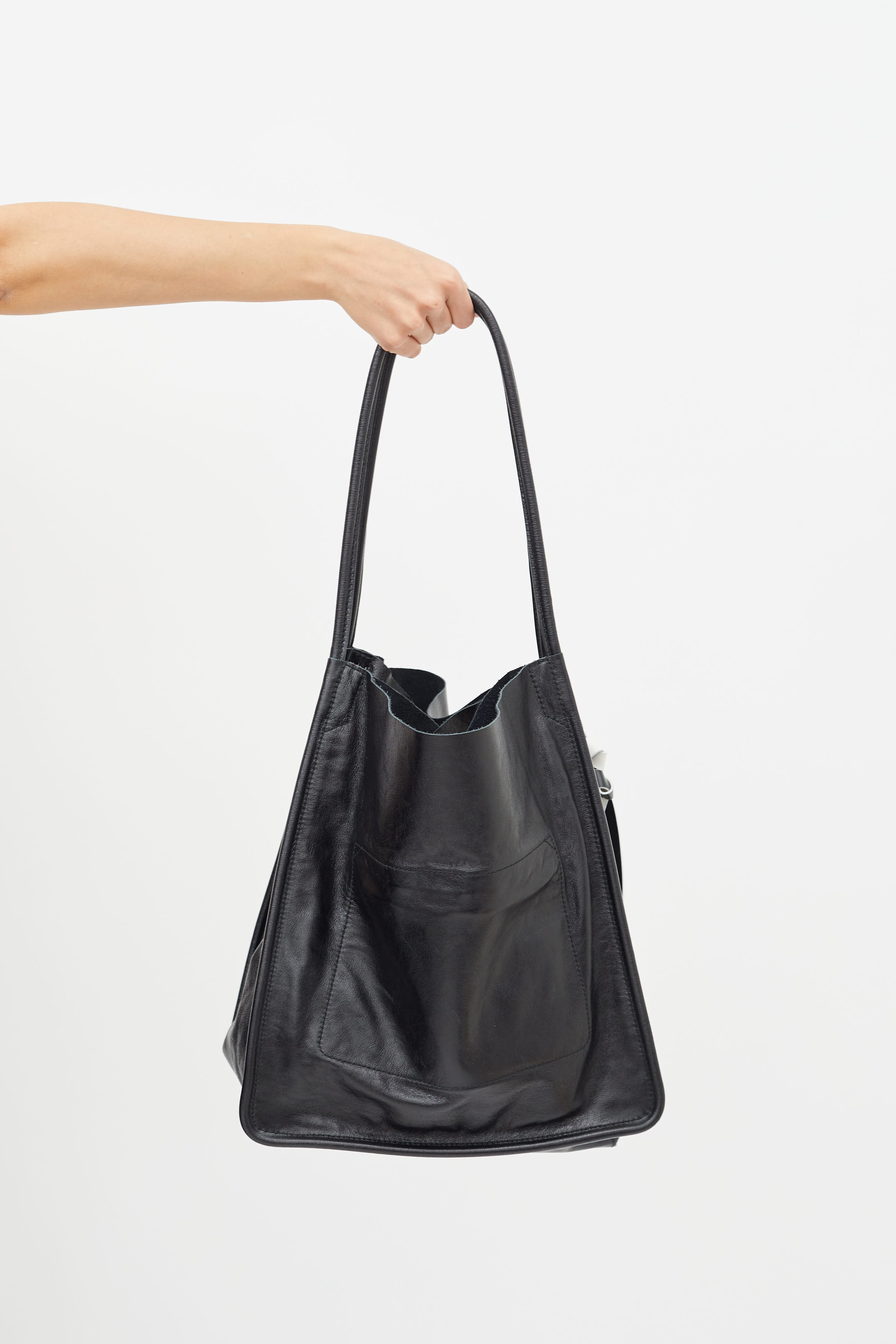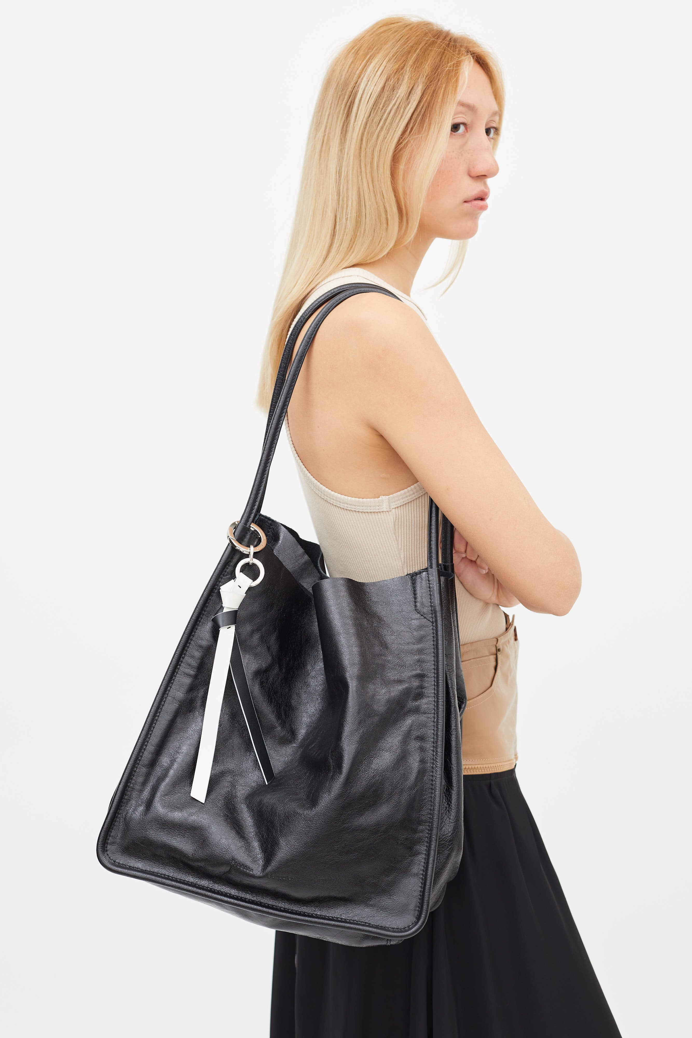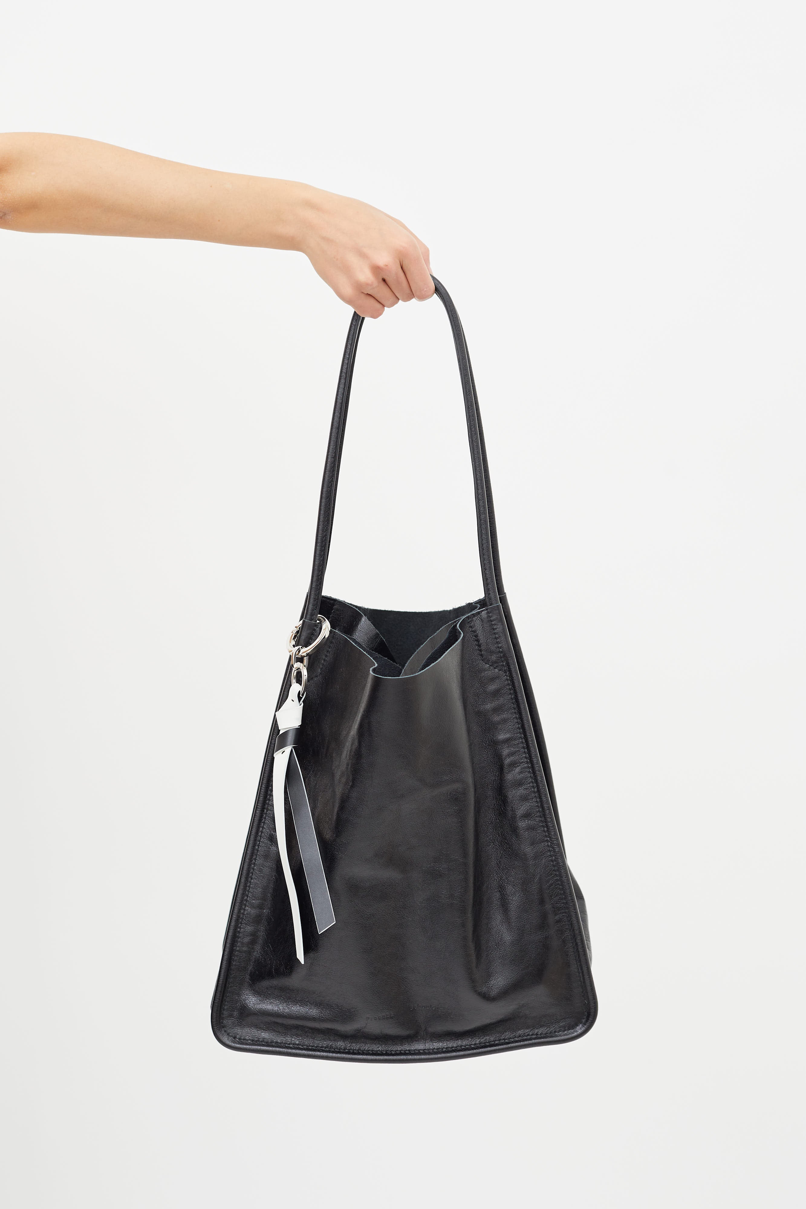 Pre-owned Proenza Schouler XL tote bag in black leather featuring dual rolled top handles, slouchy design, open compartment, interior zip pocket with silver-tone logo stamp, and black and white leather tassel key chain with silver-tone O-ring. Original dust bag included.