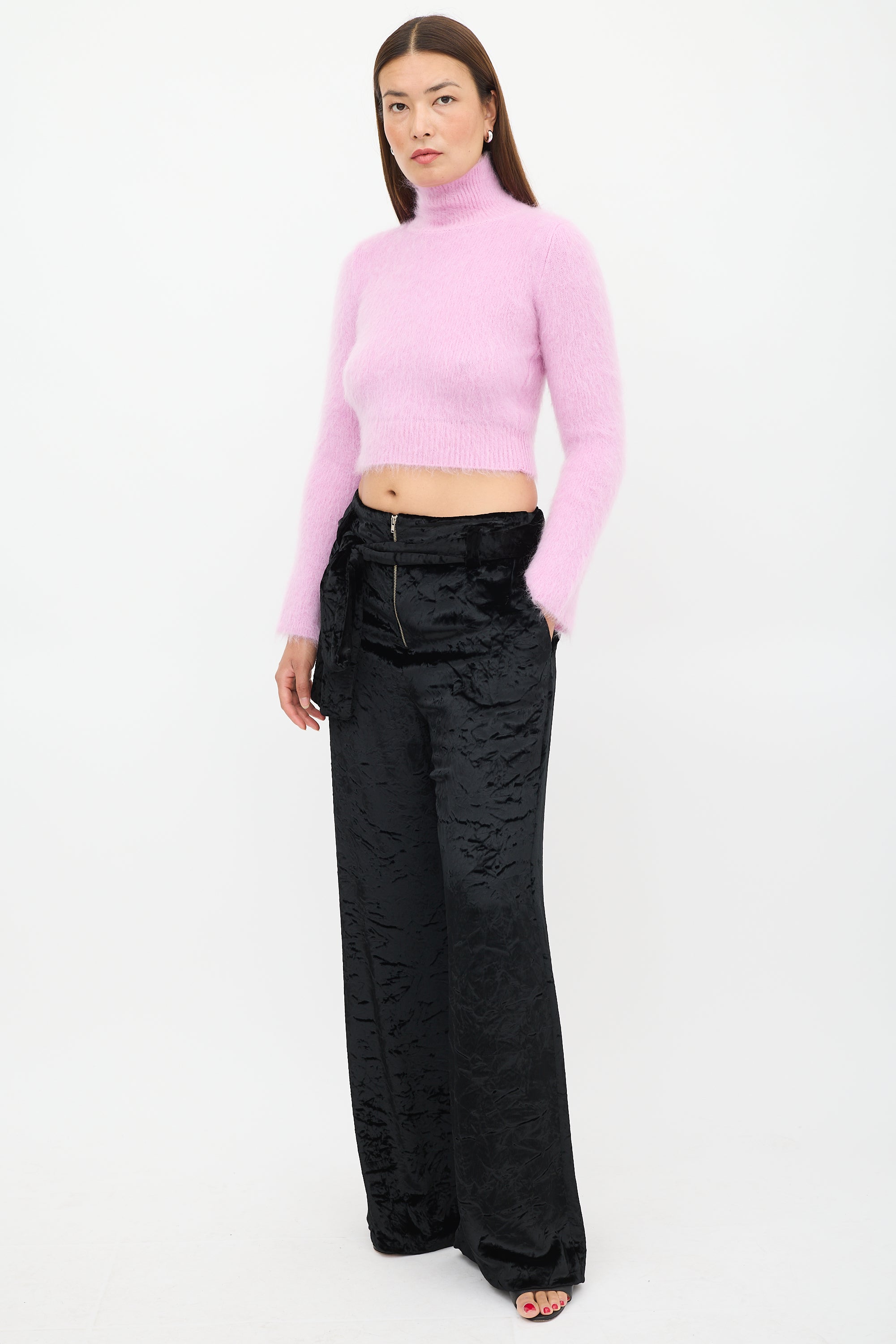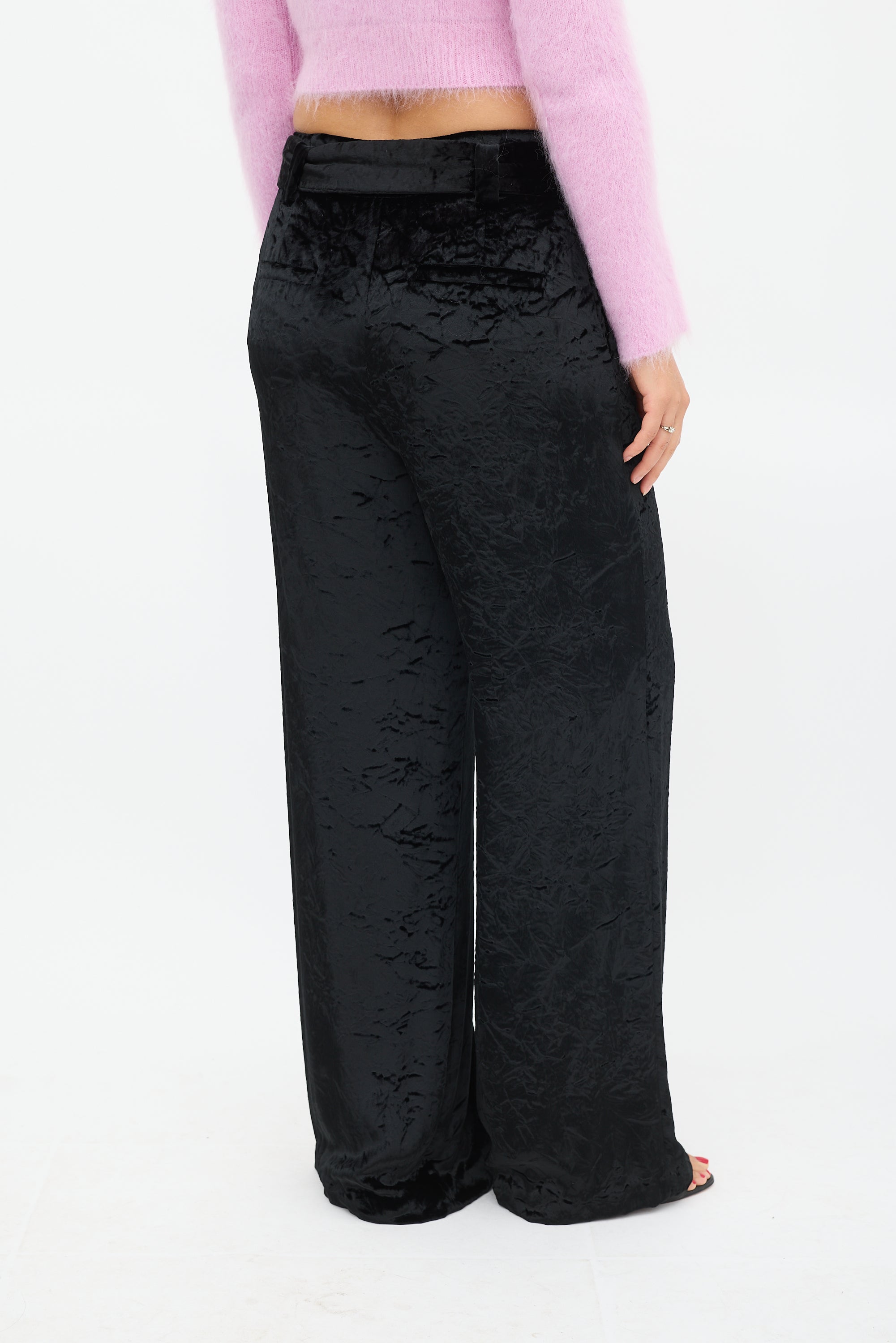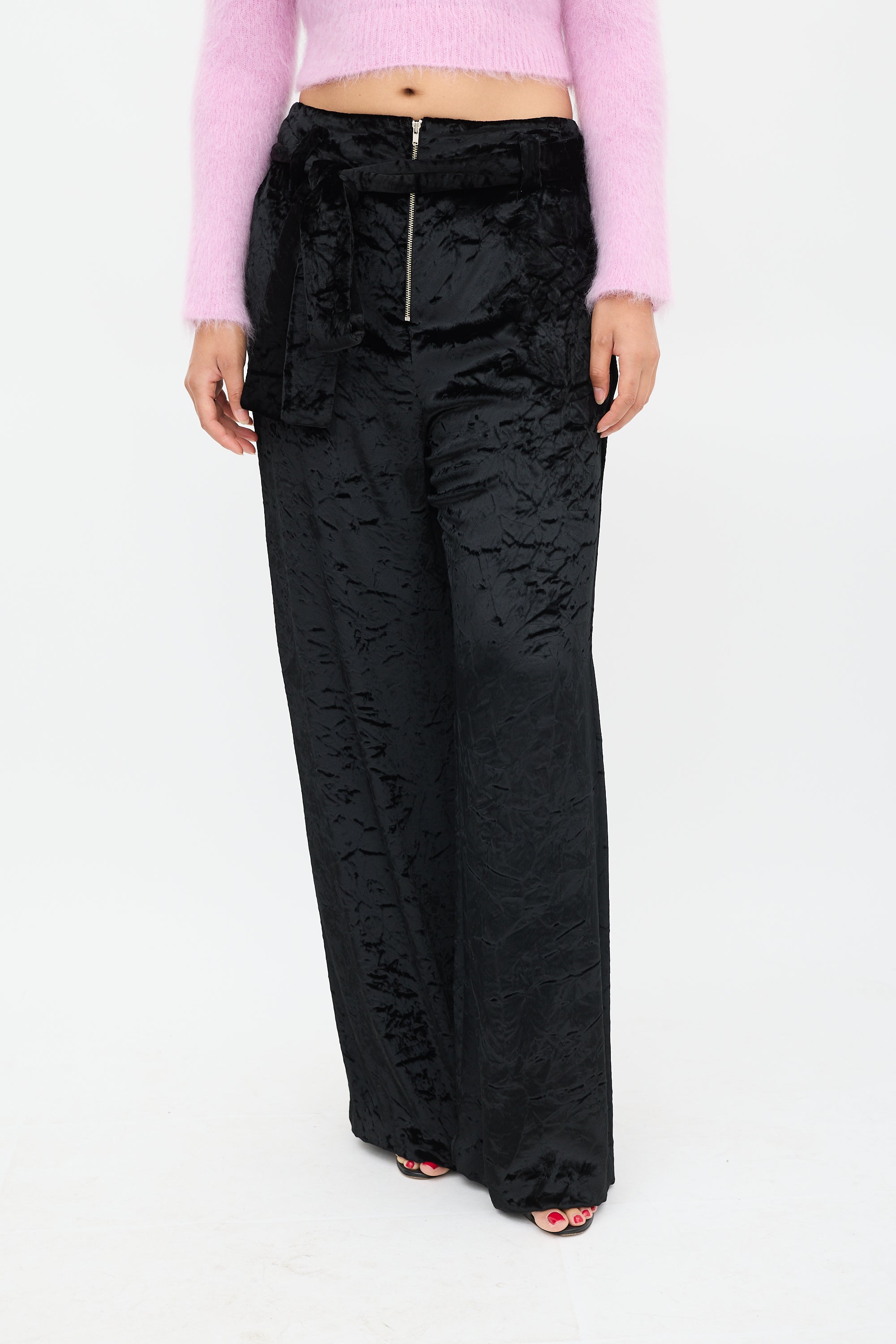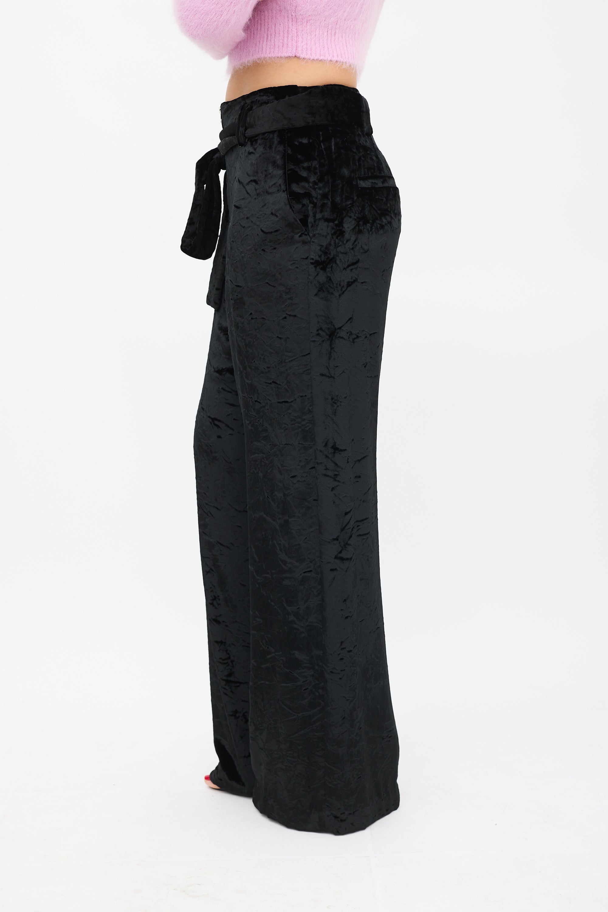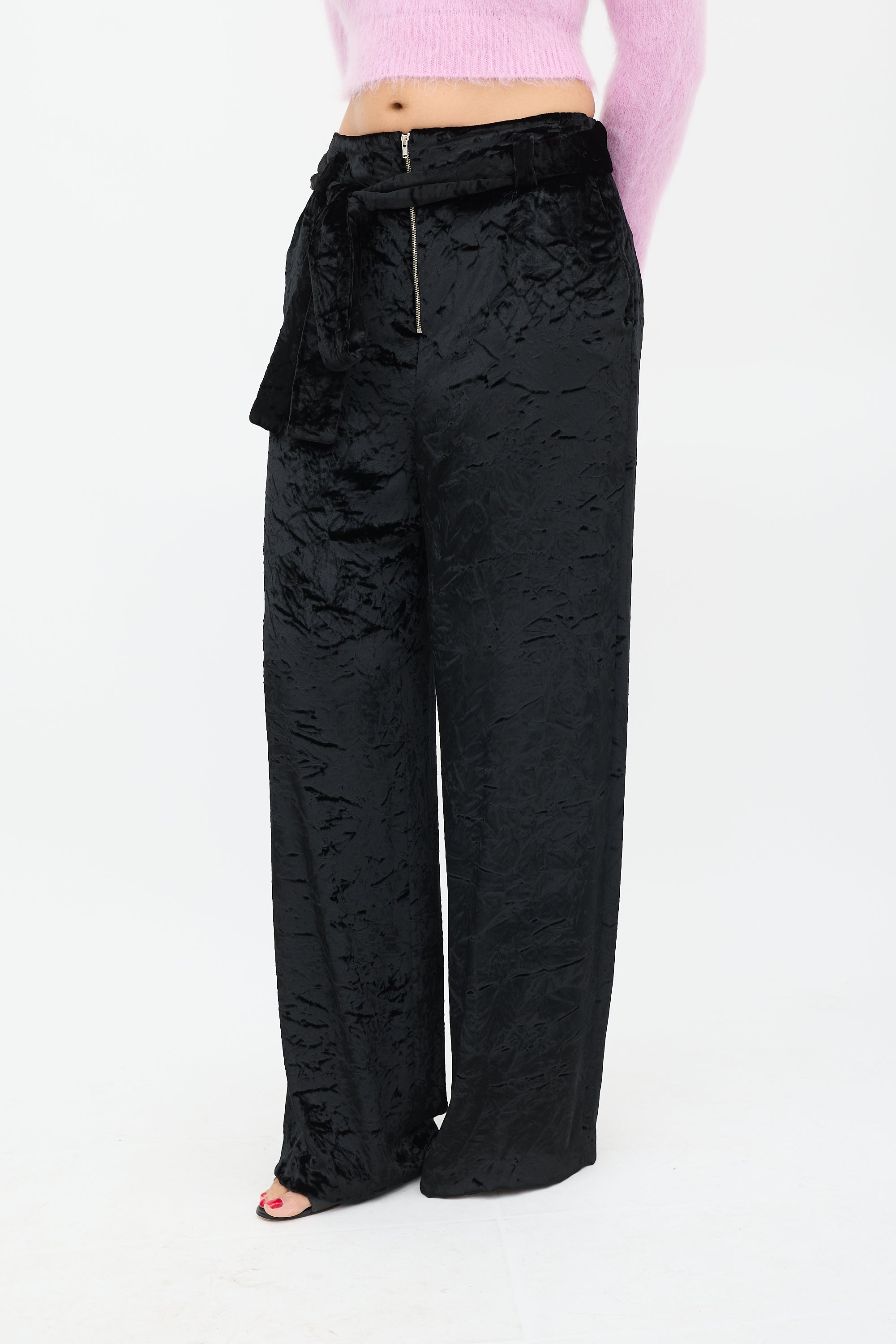 Proenza Schouler black velvet trousers featuring two slip pockets at hip, two welt pockets at back, wide leg, tie belt at waist, and zip fly closure. Lined.