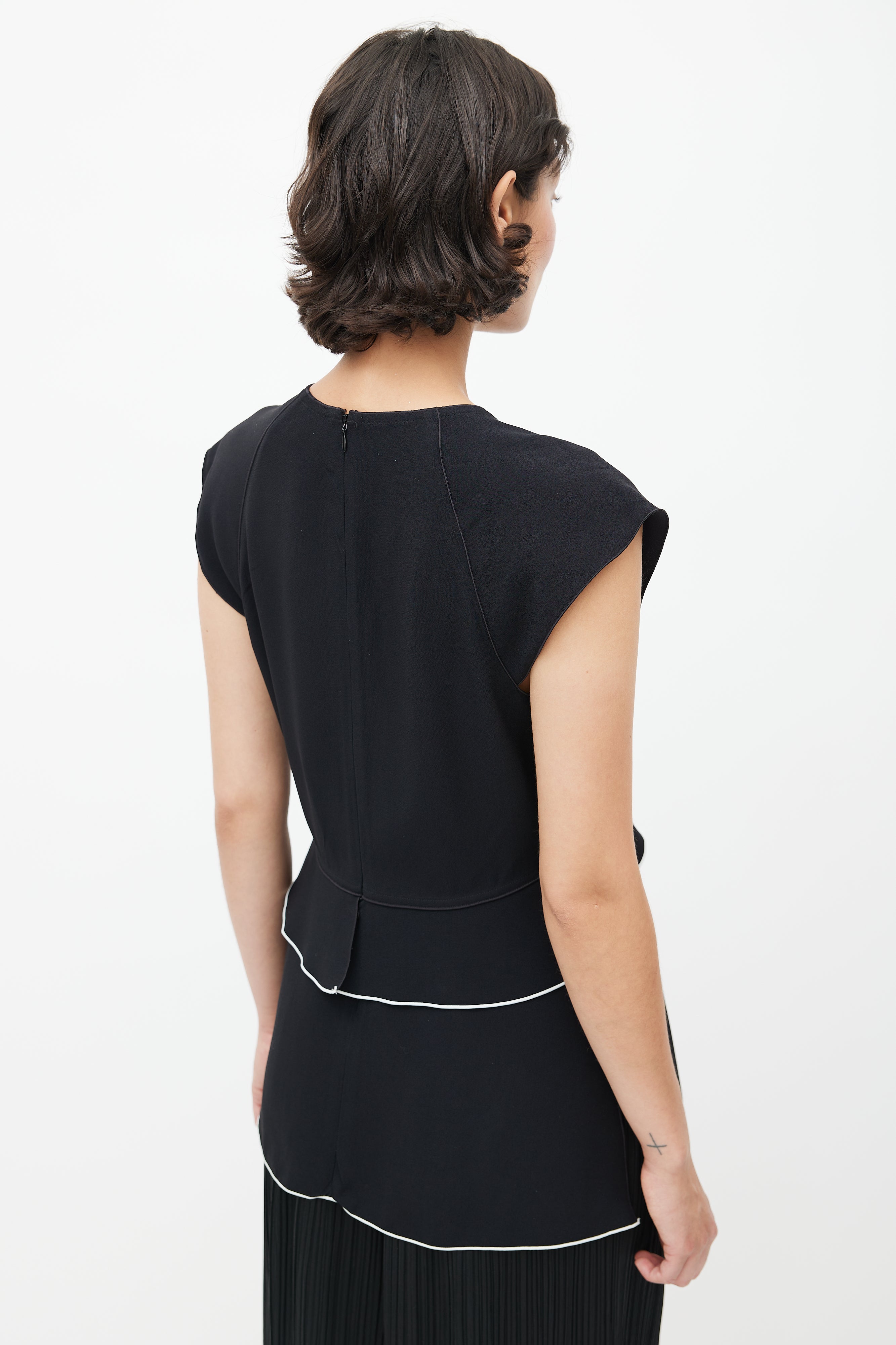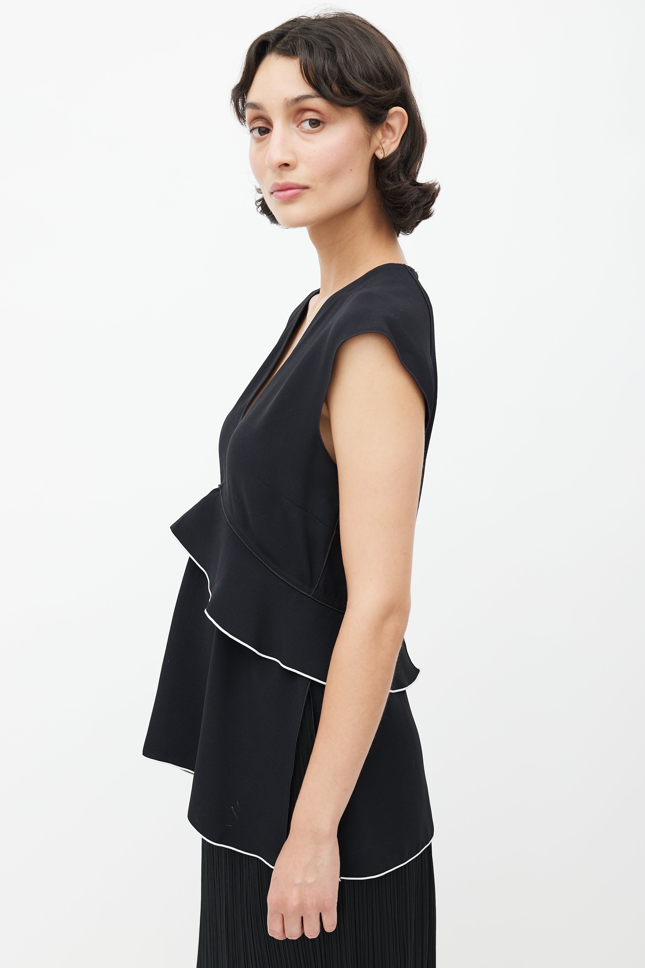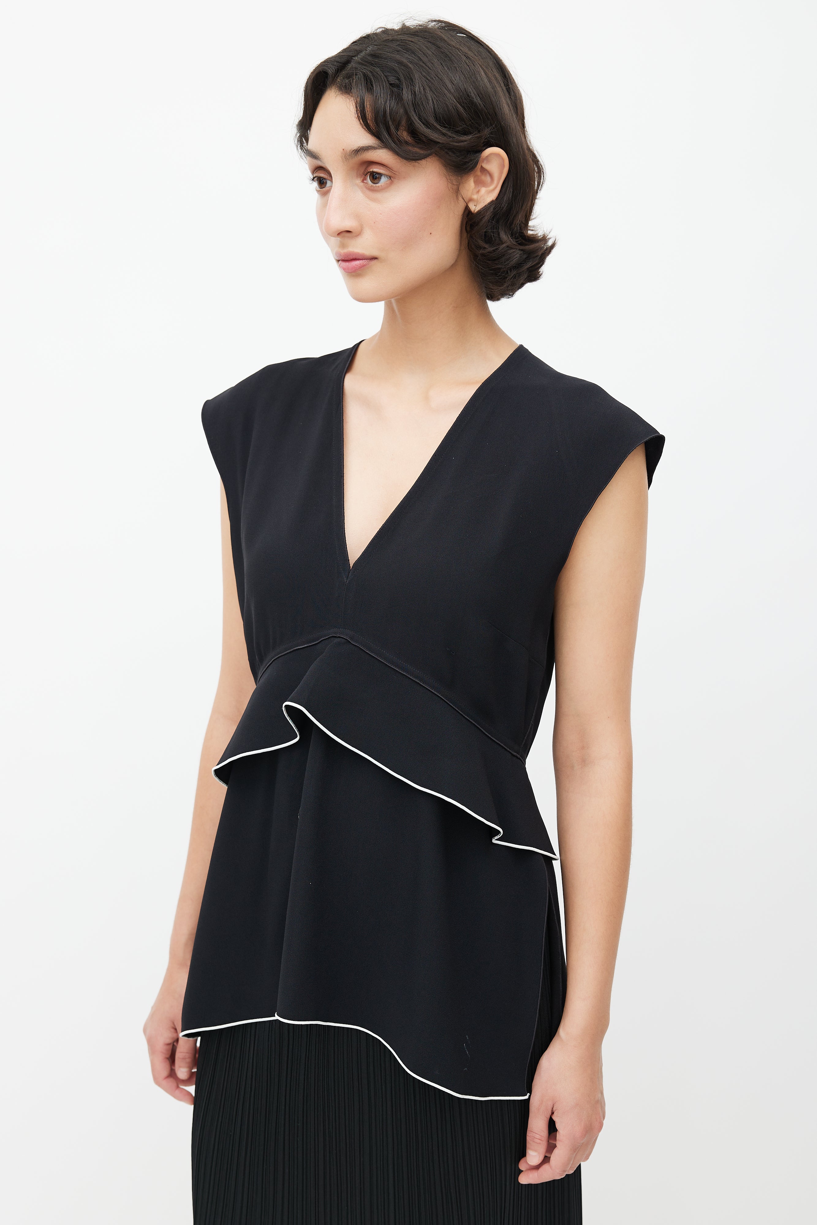 Pre-owned Proenza Schouler black top featuring a V-neckline, ruffled detail with white trim, and zip at back with hook and eye closure.