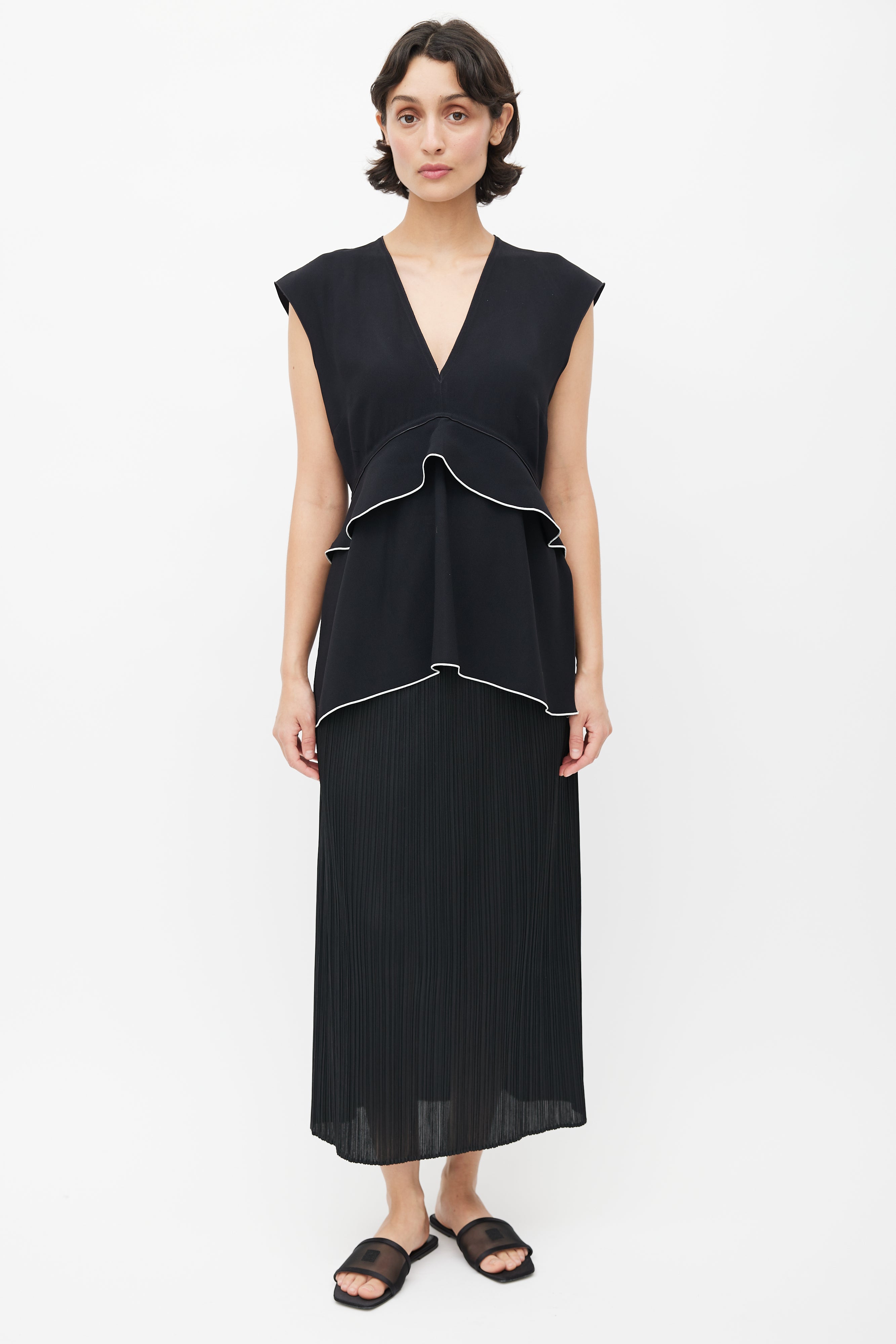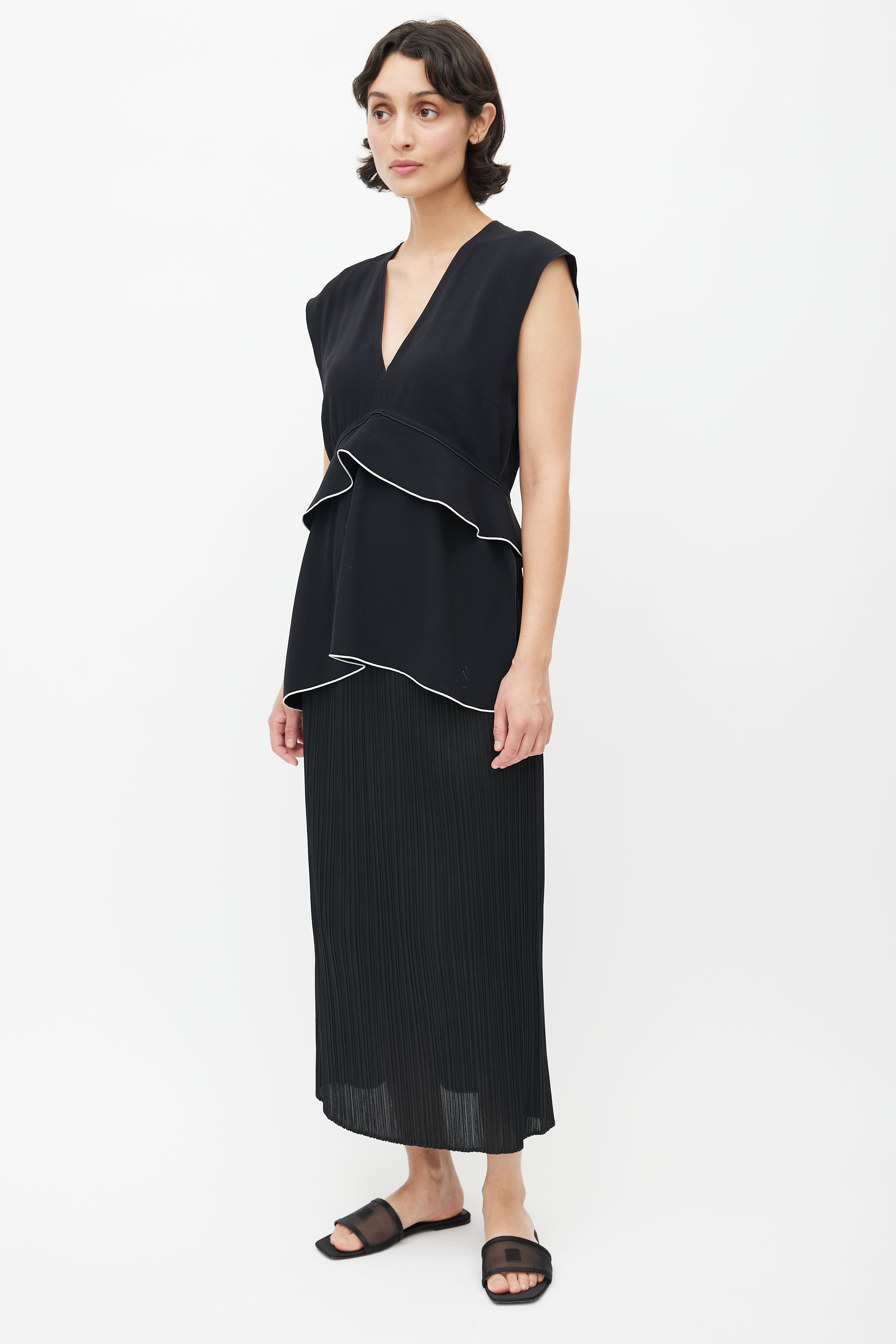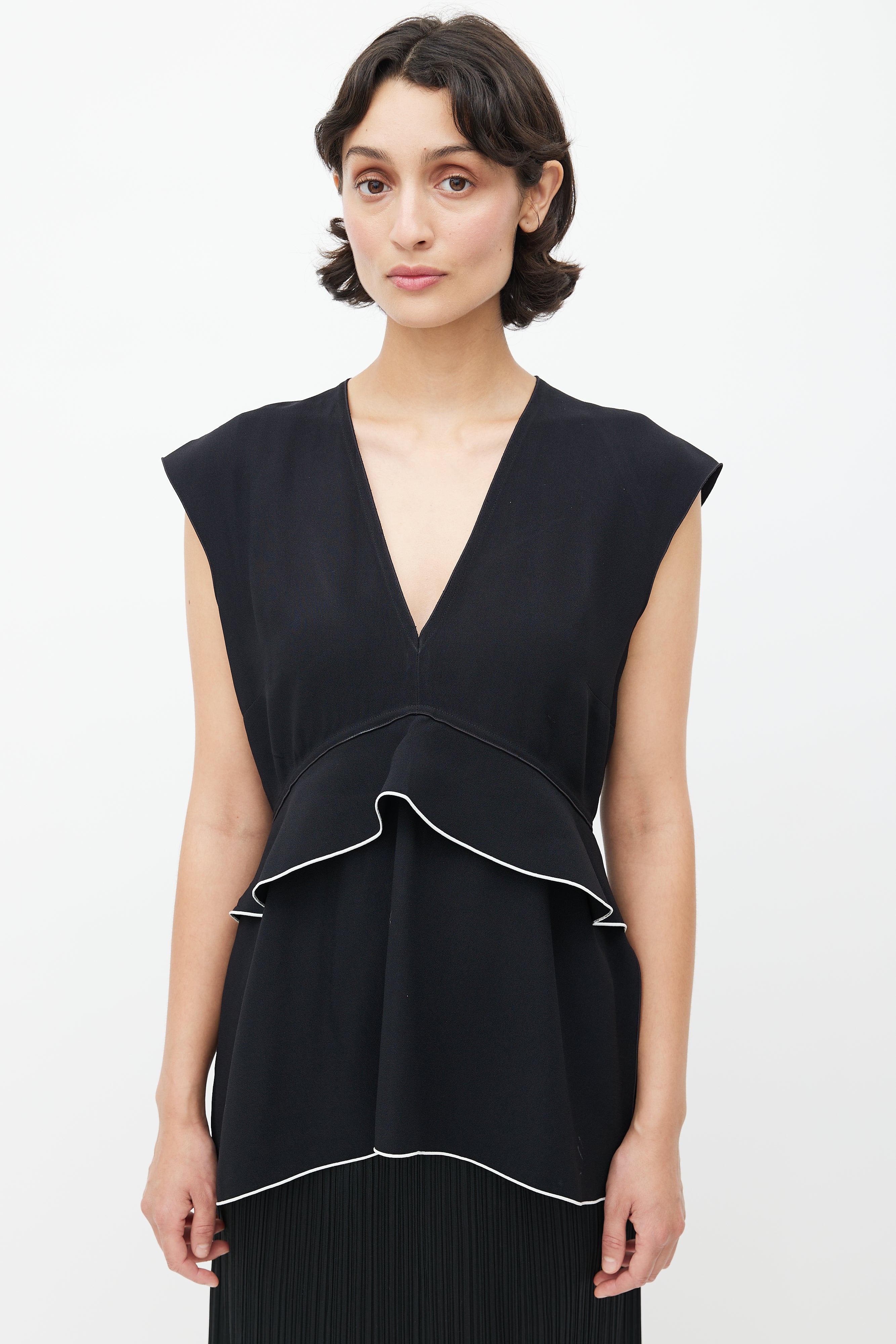 Pre-owned Proenza Schouler black top featuring a V-neckline, ruffled detail with white trim, and zip at back with hook and eye closure.
