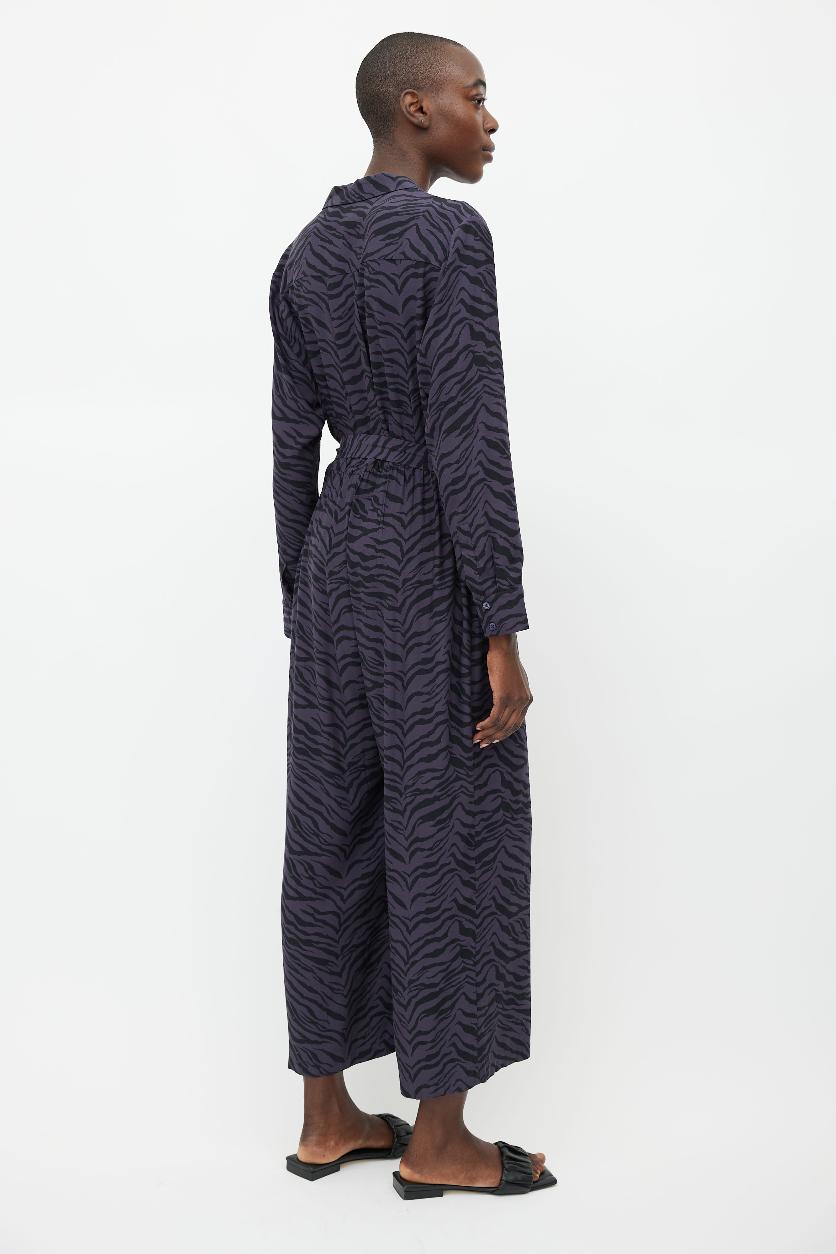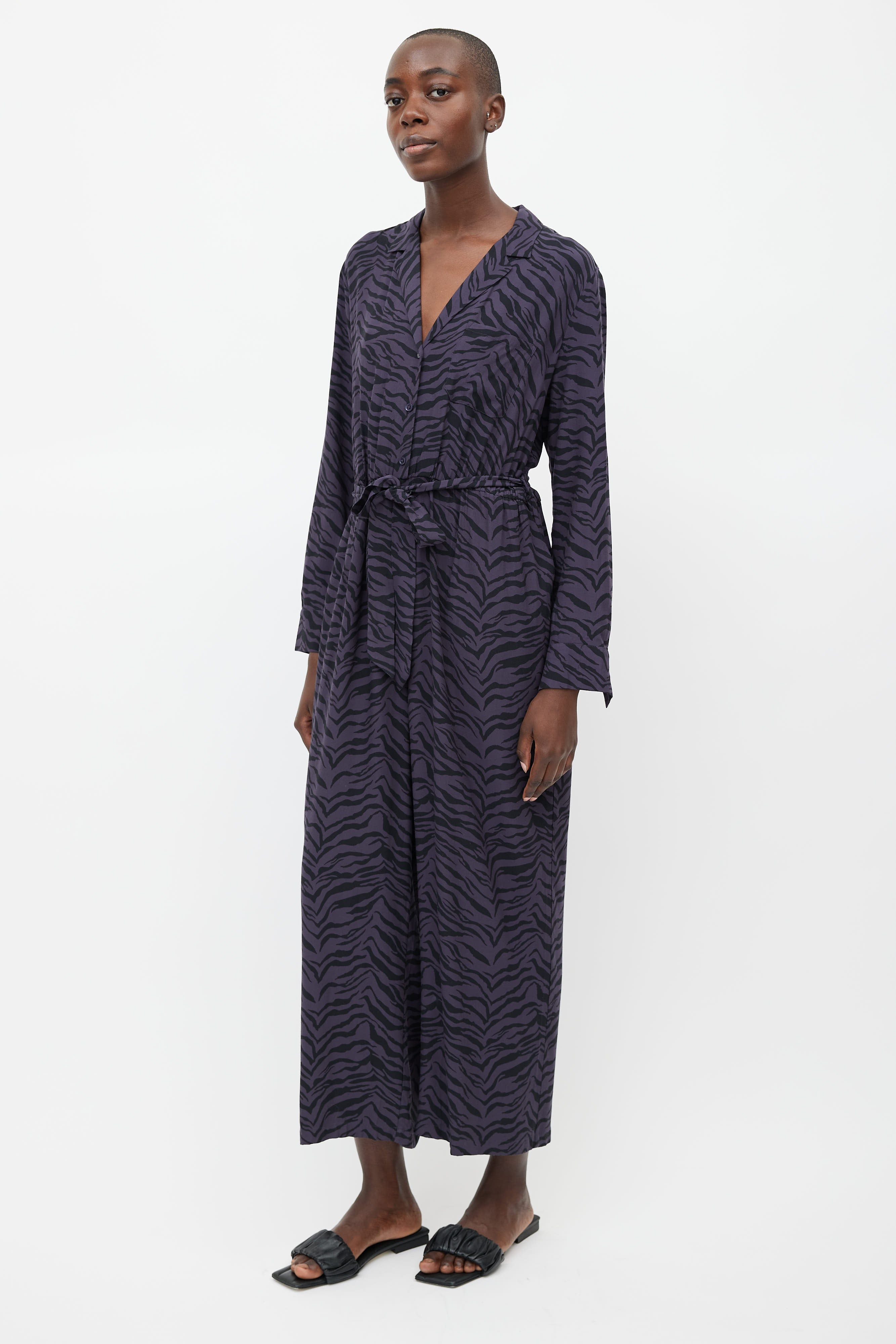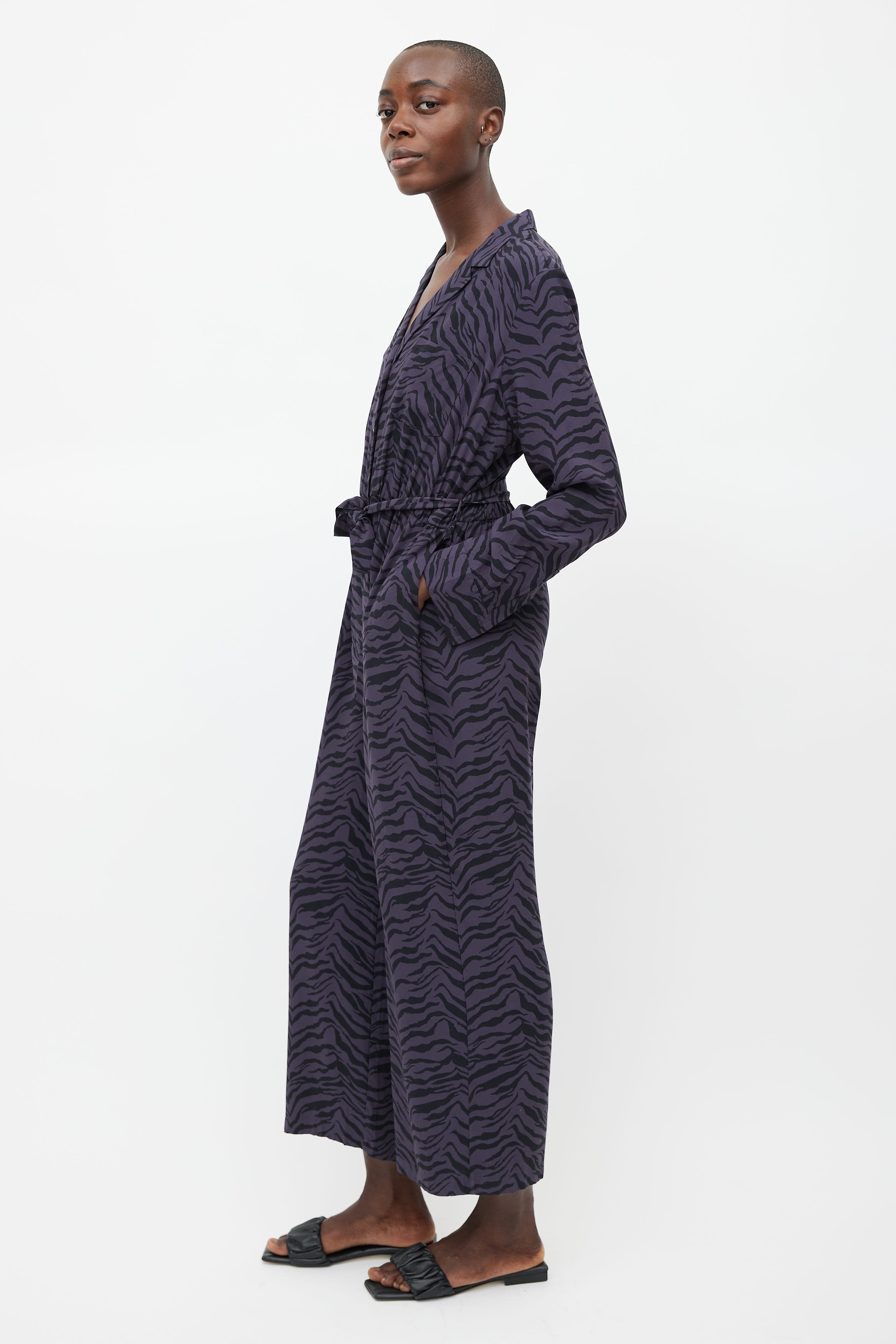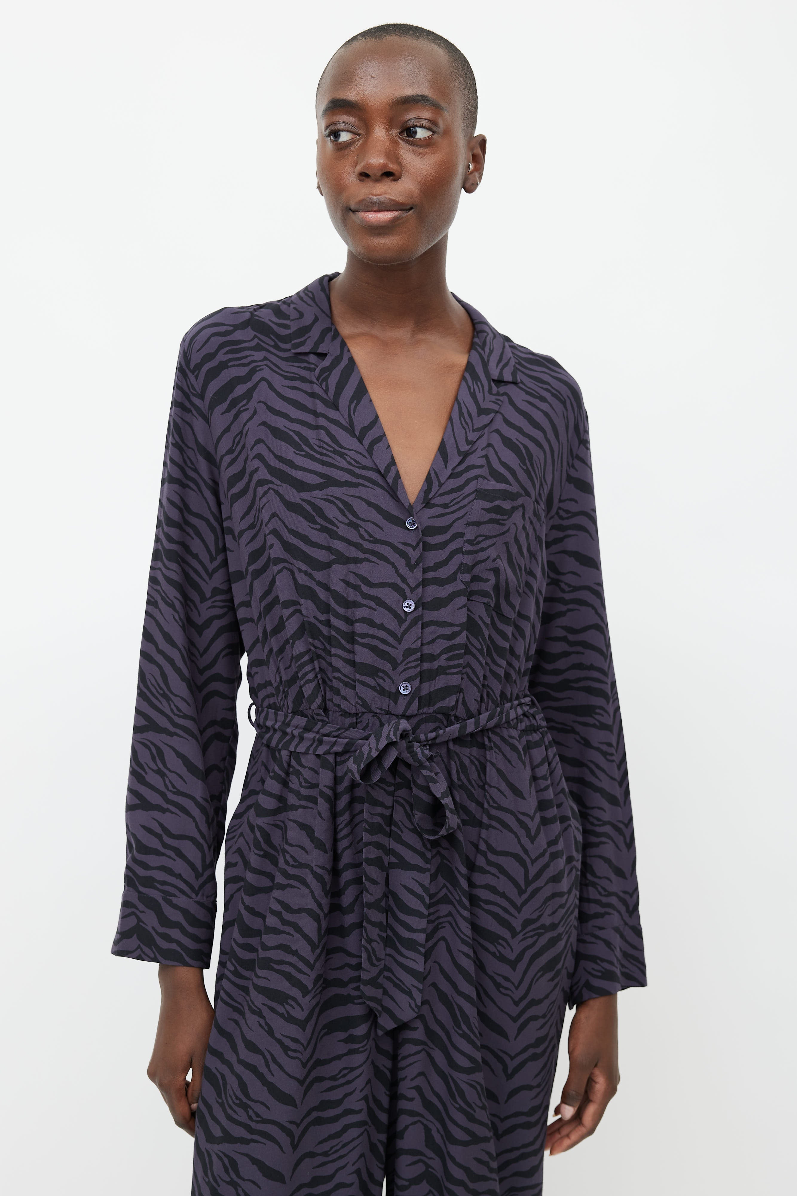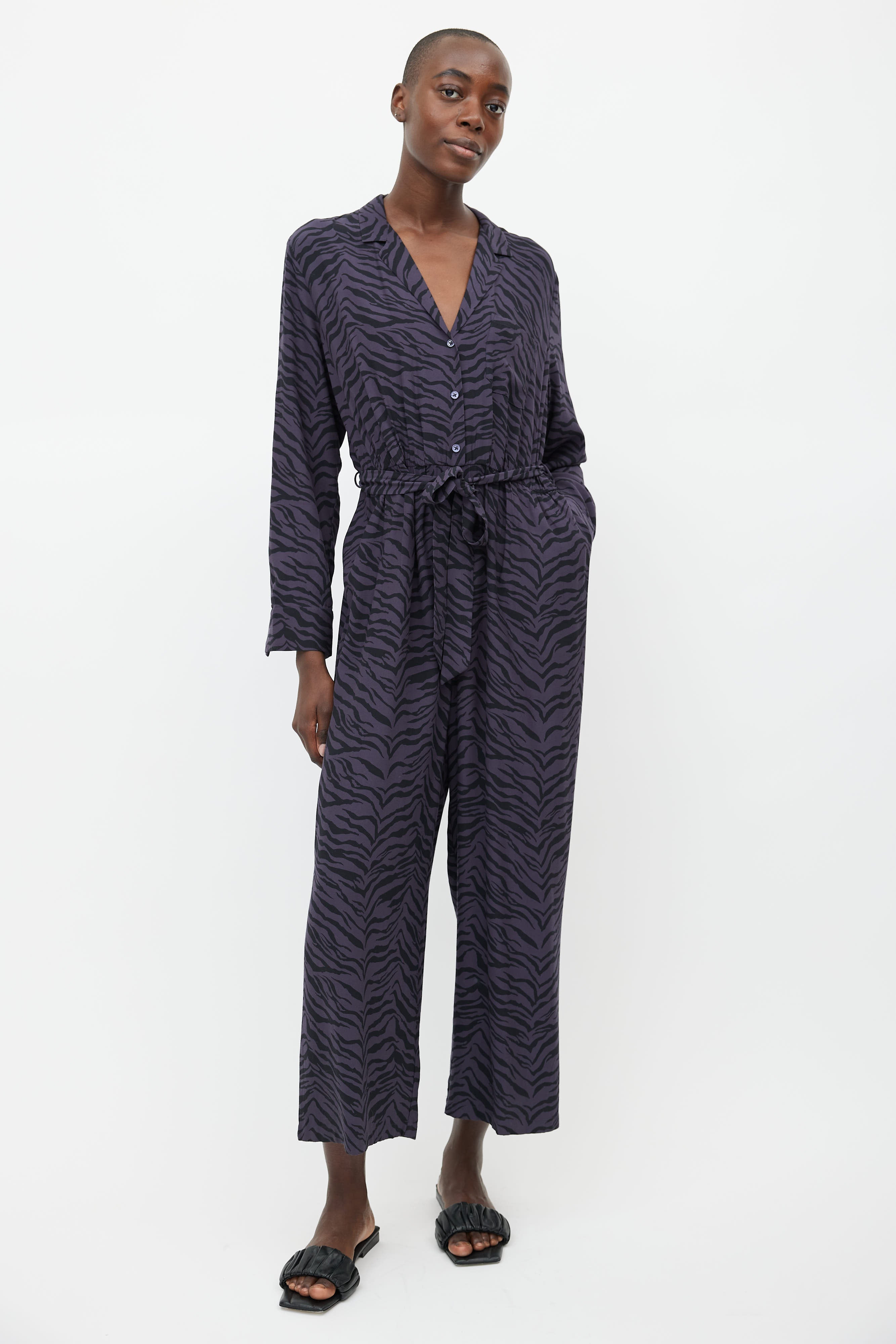Pre-owned Rails dark grey Callan jumpsuit featuring tiger print throughout, button up front, chest pocket, two side hip pockets, buttoned cuffs, elasticized waist with belt, and wide leg. Lined.